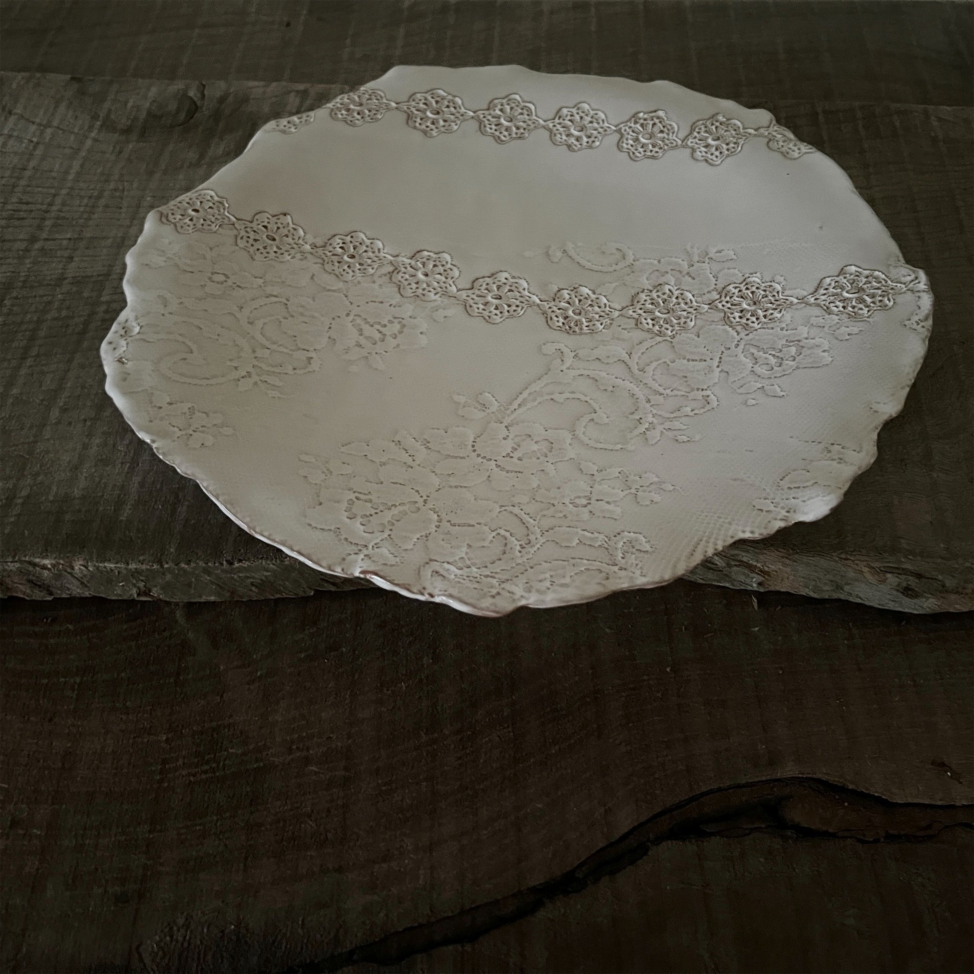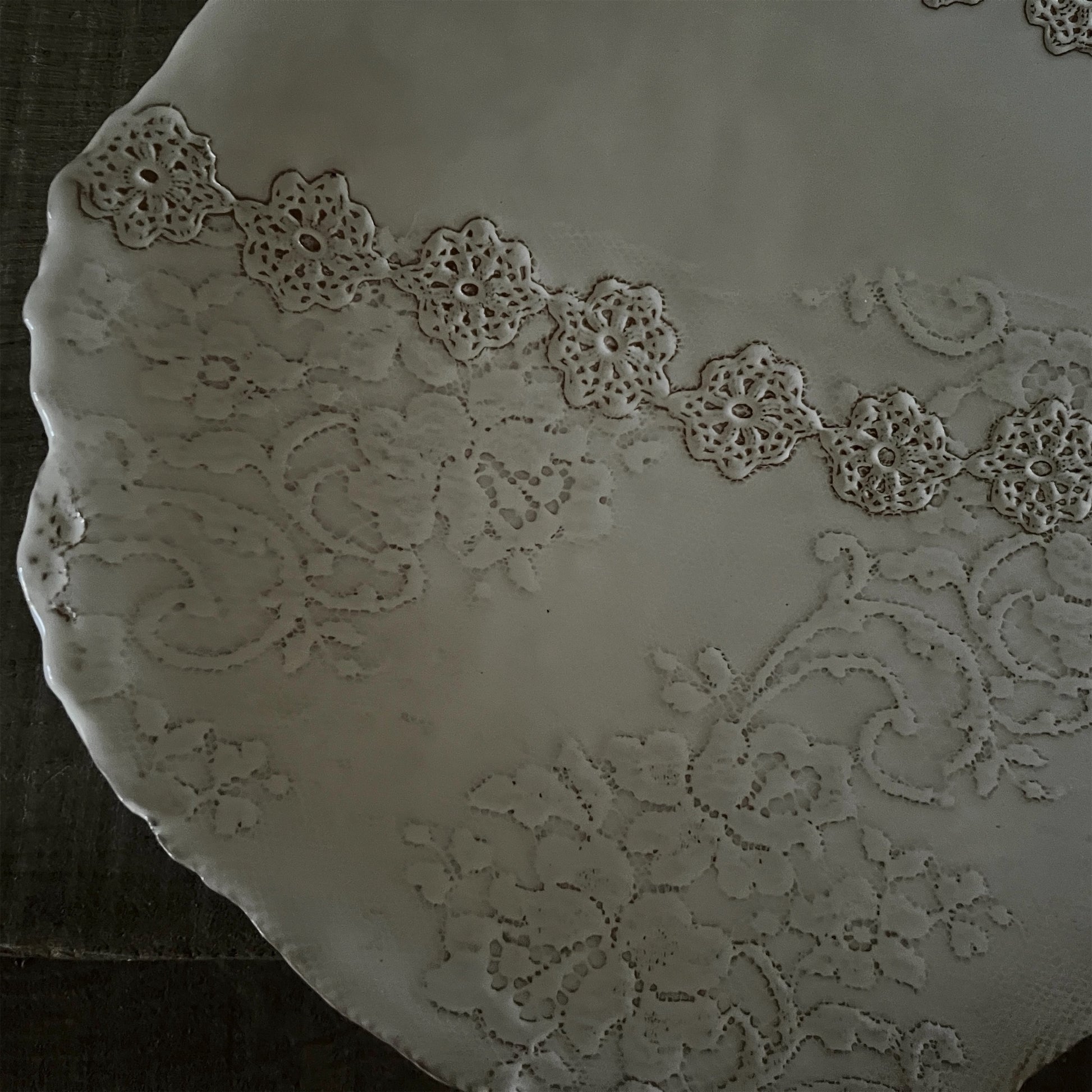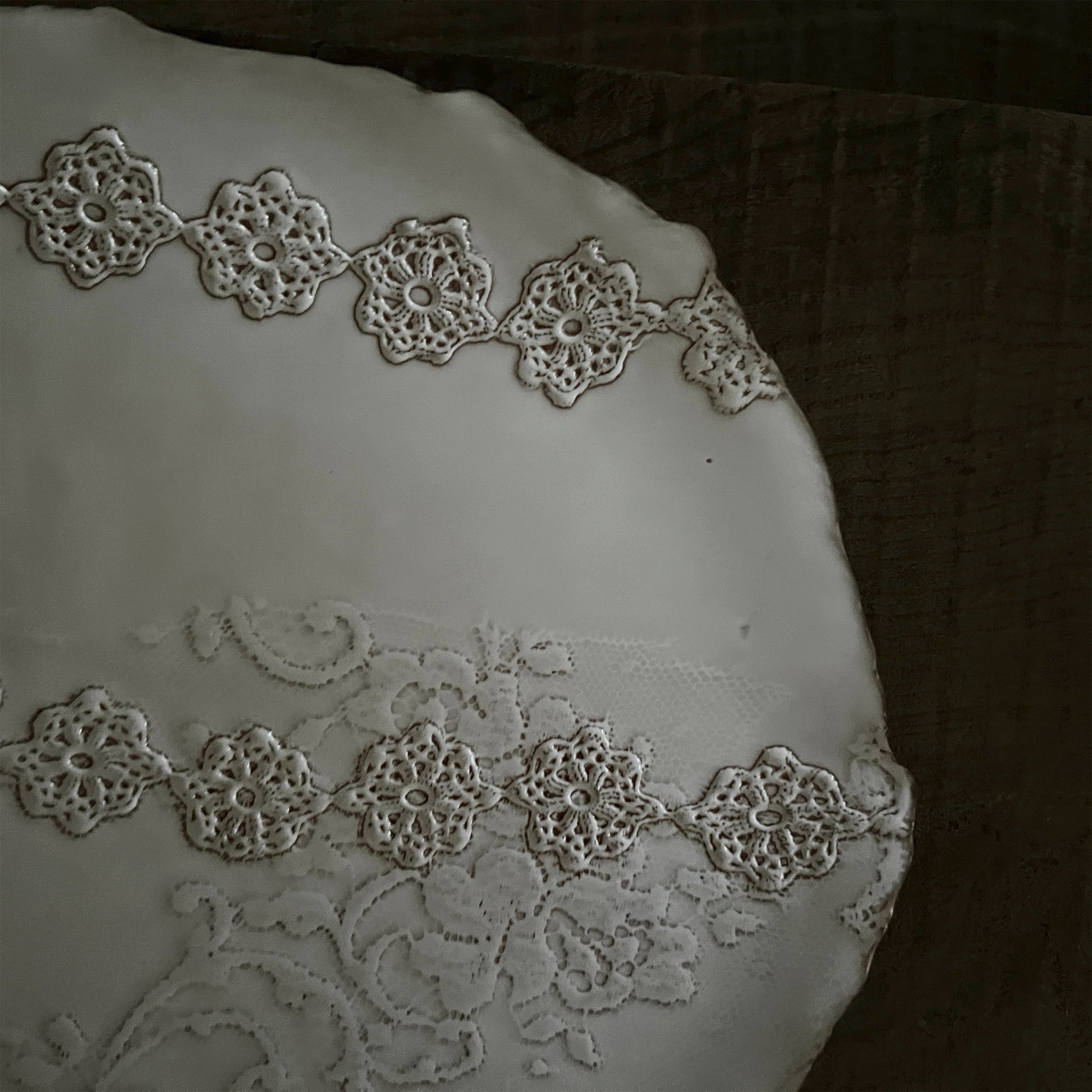 フランス人アーティストのヴァレリー・カサドが独自の手法で制作するセラミック作品。南仏ソルグ島のヴォクリューズに工房を構え、感性の赴くままに手を動かして造形しています。布地のように薄く柔らかなフォルムで、粉砂糖をまとったお菓子のような表情があります。古いものに関心の深い彼女が集めたアンティークのレースやボタンで表現された美しいレリーフが魅力。作家の優しさが伝わってくるような、ひとつとして同じものがない作品です。*手作りのため、形や風合いには個体差があります。