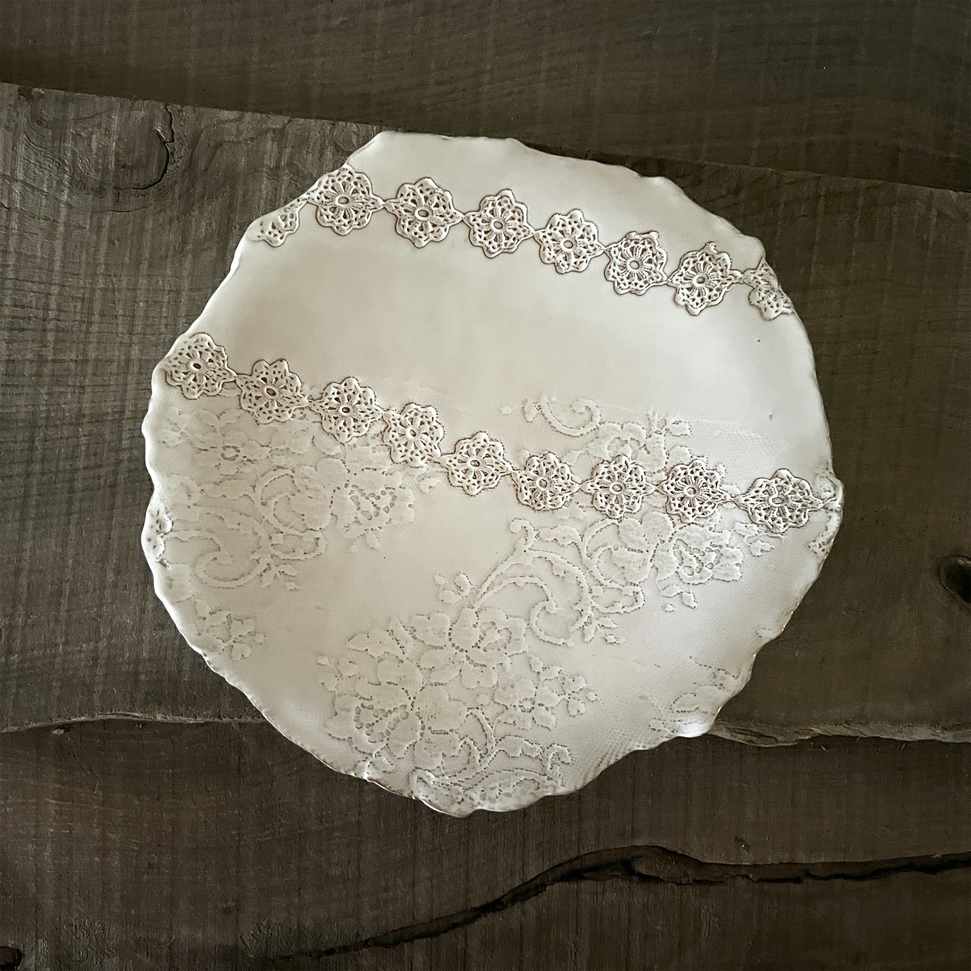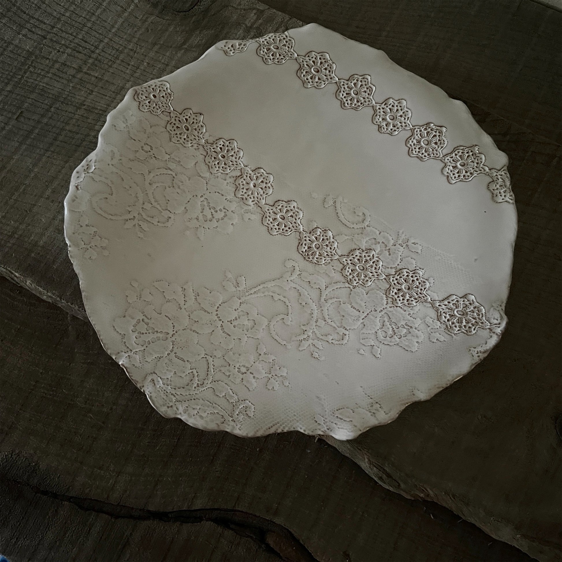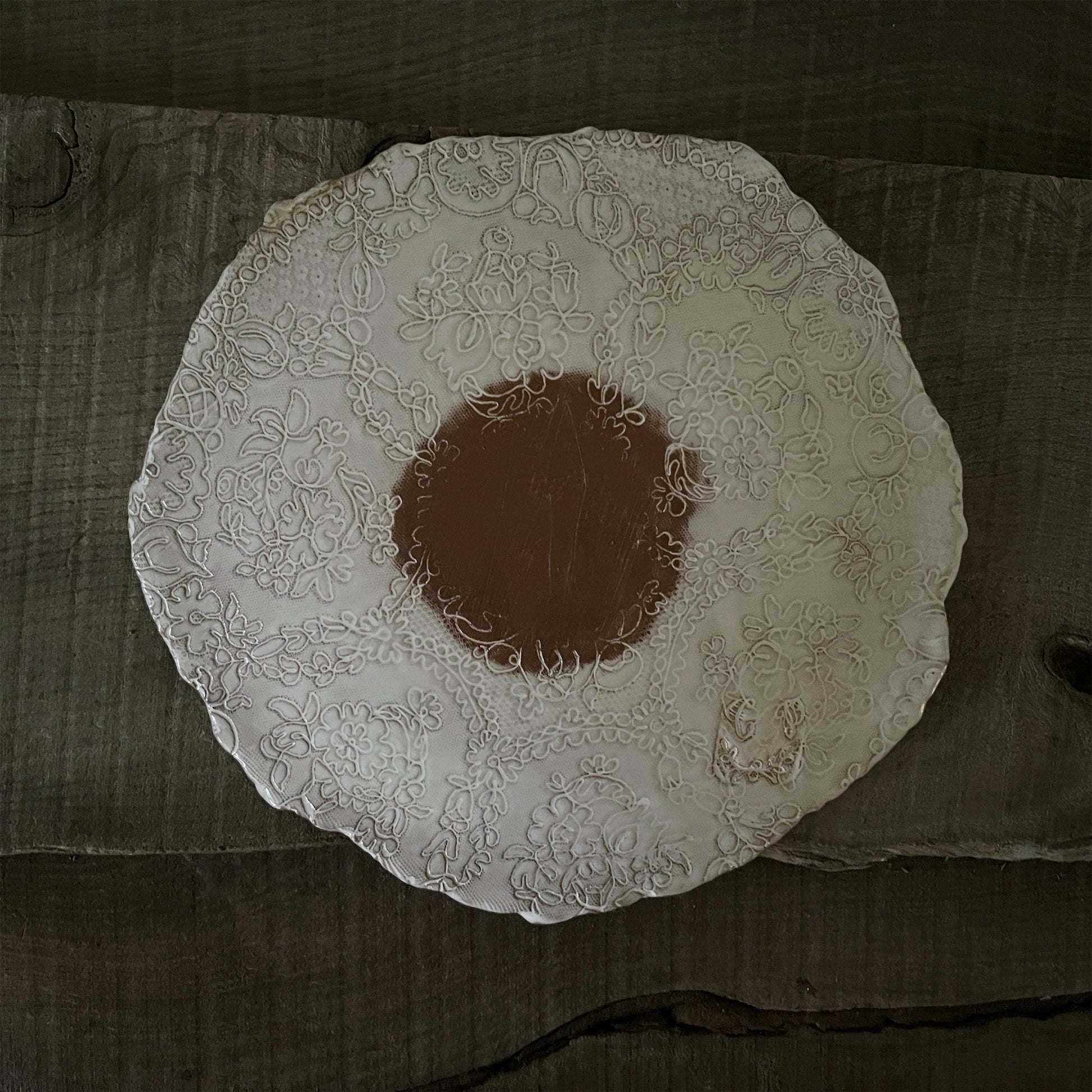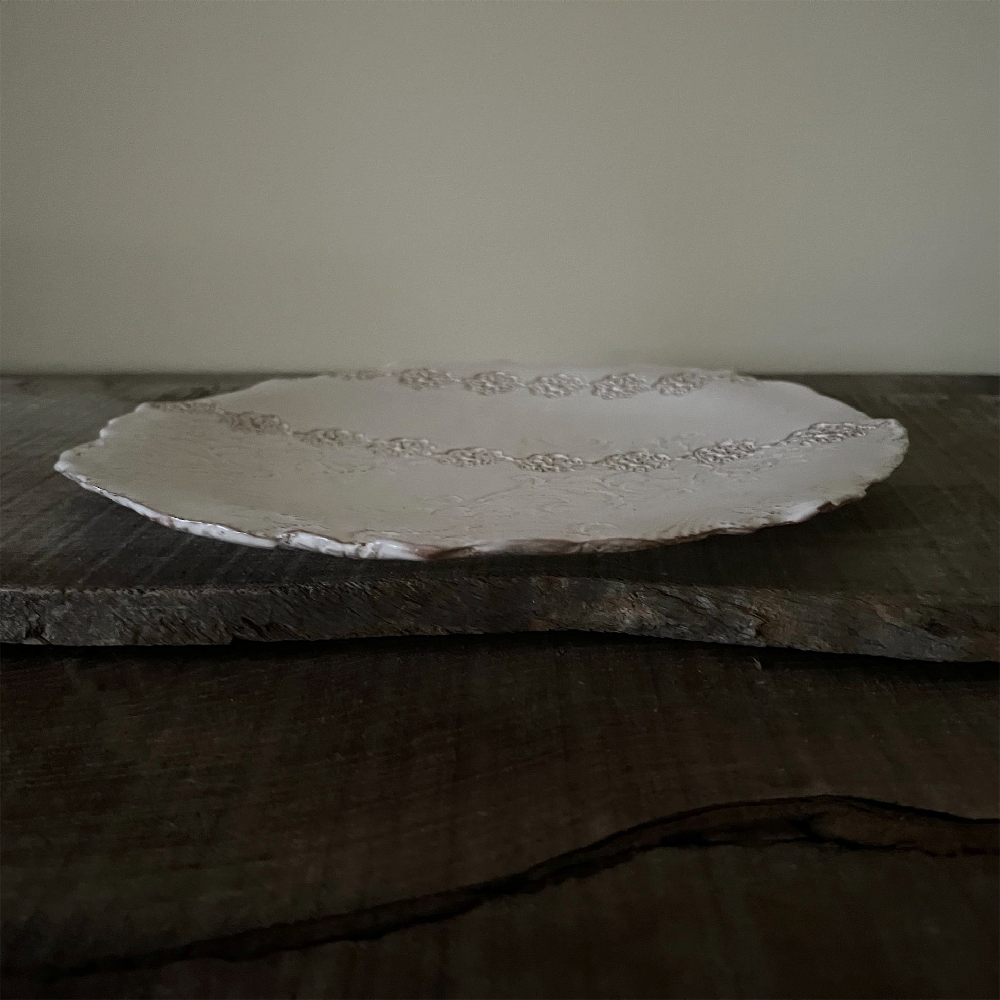 フランス人アーティストのヴァレリー・カサドが独自の手法で制作するセラミック作品。南仏ソルグ島のヴォクリューズに工房を構え、感性の赴くままに手を動かして造形しています。布地のように薄く柔らかなフォルムで、粉砂糖をまとったお菓子のような表情があります。古いものに関心の深い彼女が集めたアンティークのレースやボタンで表現された美しいレリーフが魅力。作家の優しさが伝わってくるような、ひとつとして同じものがない作品です。*手作りのため、形や風合いには個体差があります。