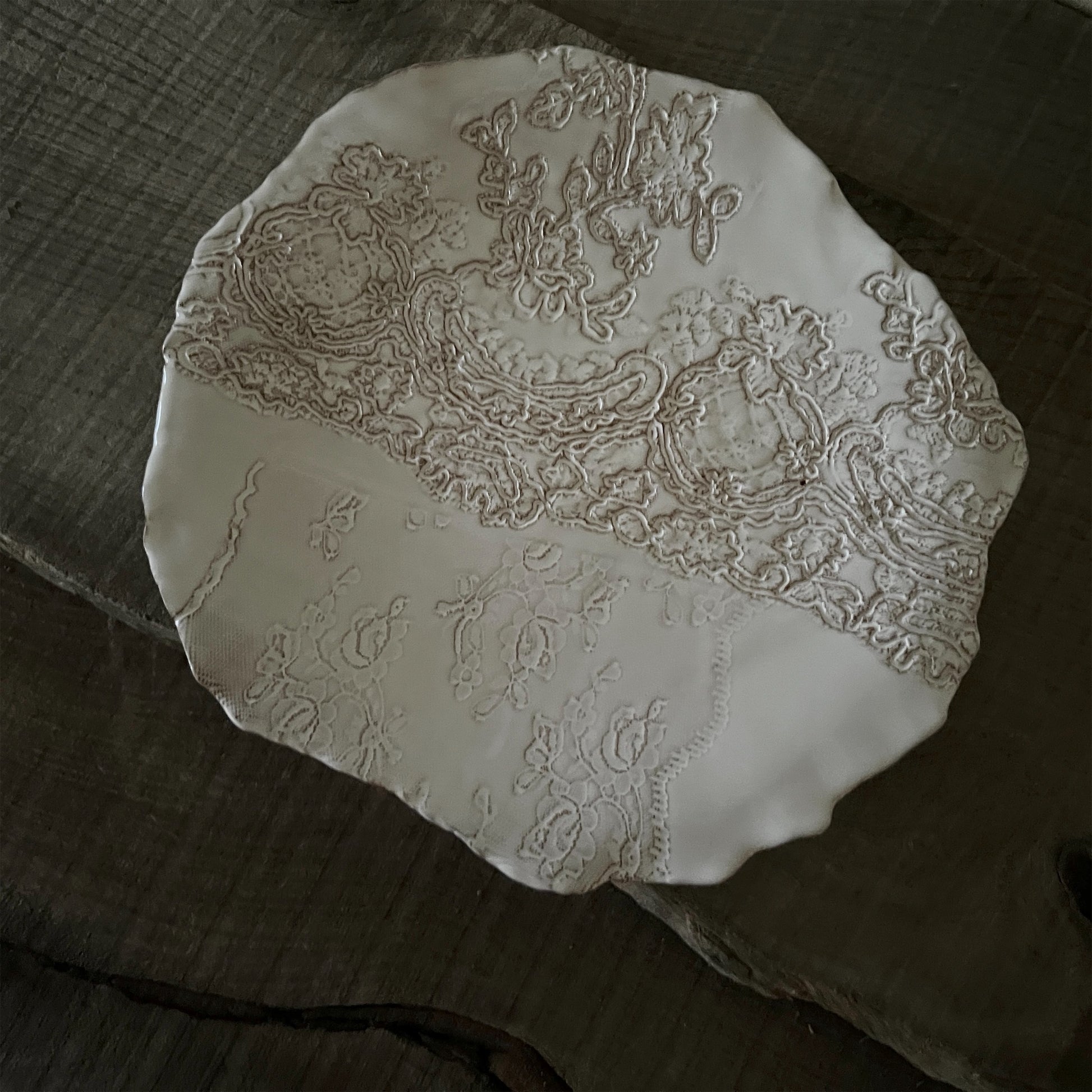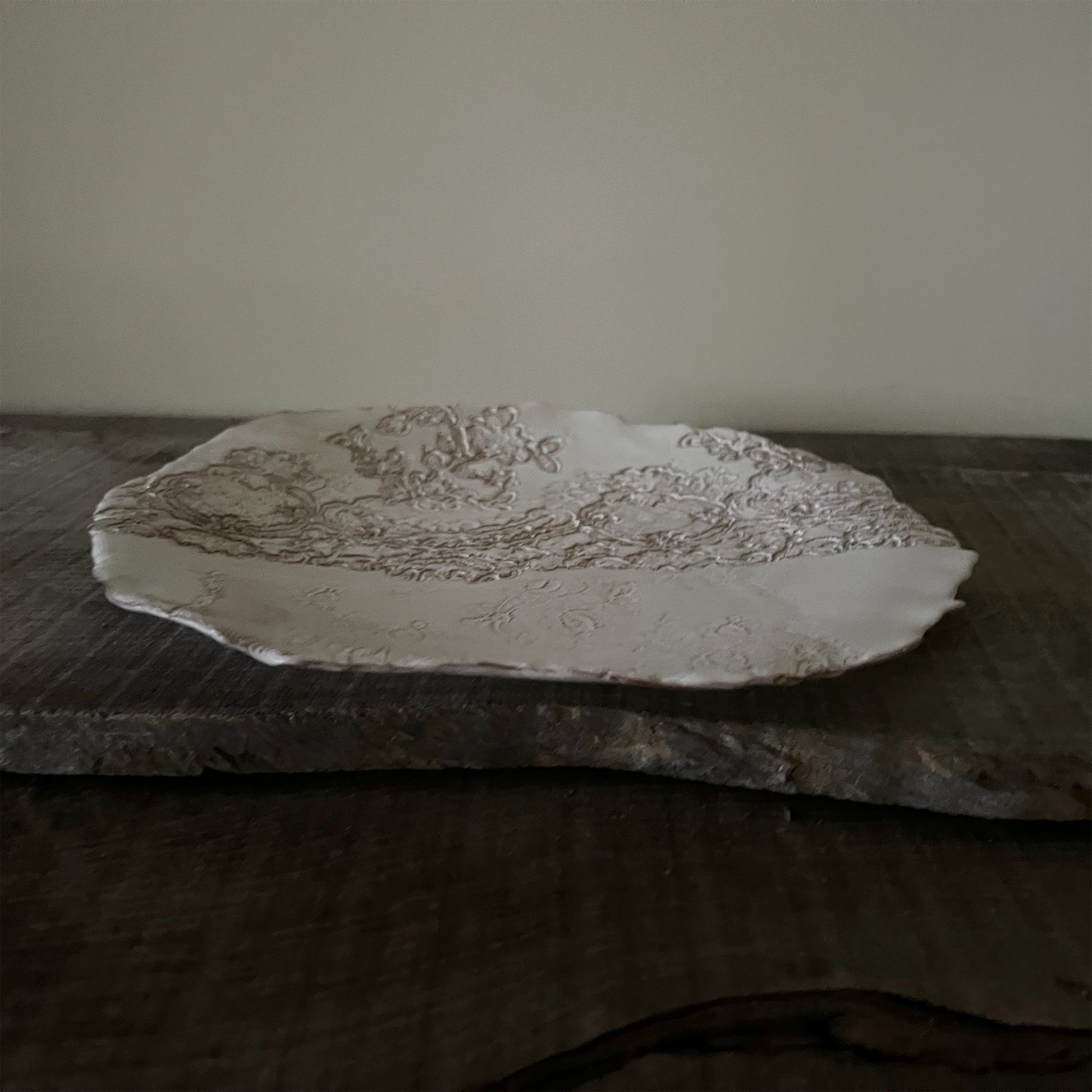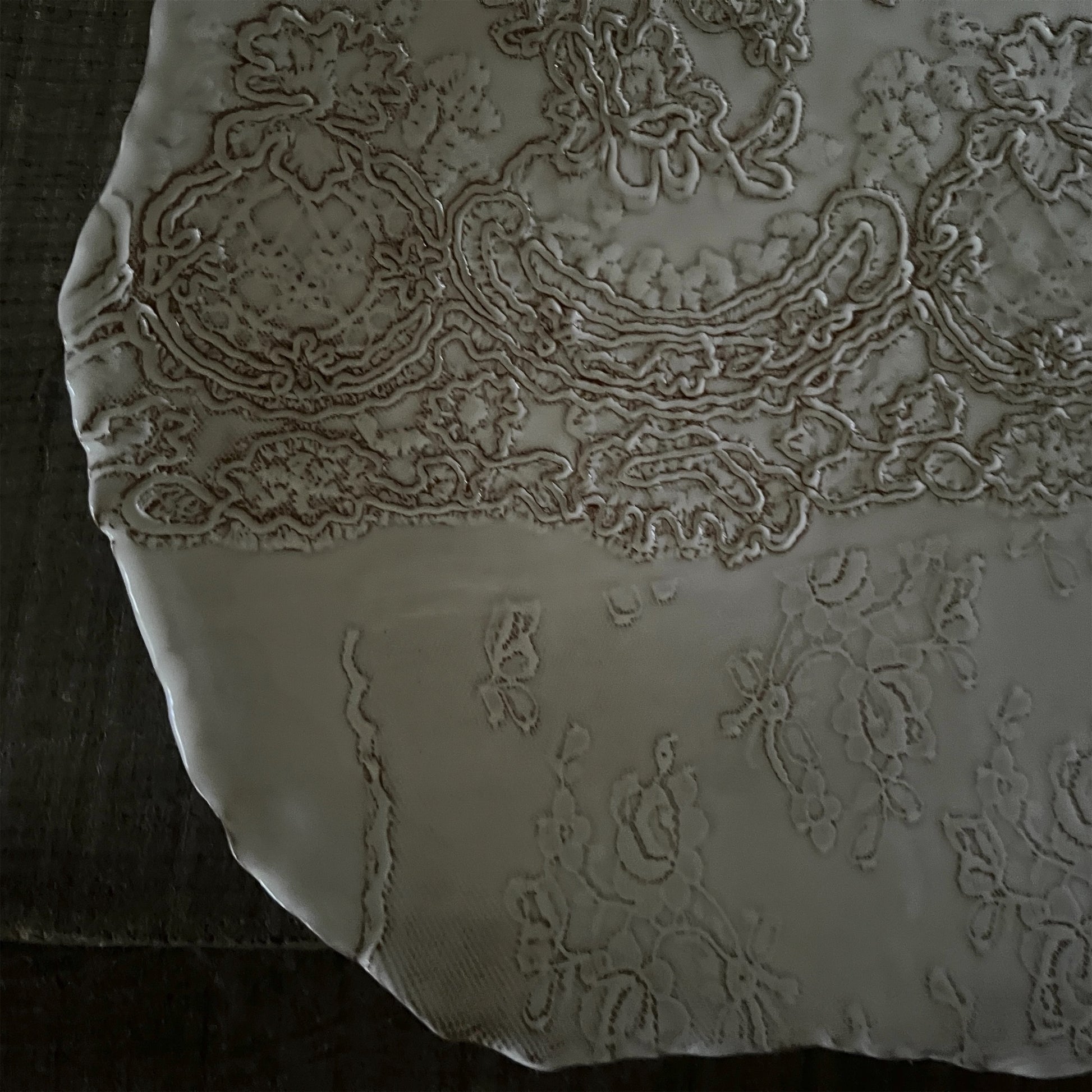 フランス人アーティストのヴァレリー・カサドが独自の手法で制作するセラミック作品。南仏ソルグ島のヴォクリューズに工房を構え、感性の赴くままに手を動かして造形しています。布地のように薄く柔らかなフォルムで、粉砂糖をまとったお菓子のような表情があります。古いものに関心の深い彼女が集めたアンティークのレースやボタンで表現された美しいレリーフが魅力。作家の優しさが伝わってくるような、ひとつとして同じものがない作品です。*手作りのため、形や風合いには個体差があります。