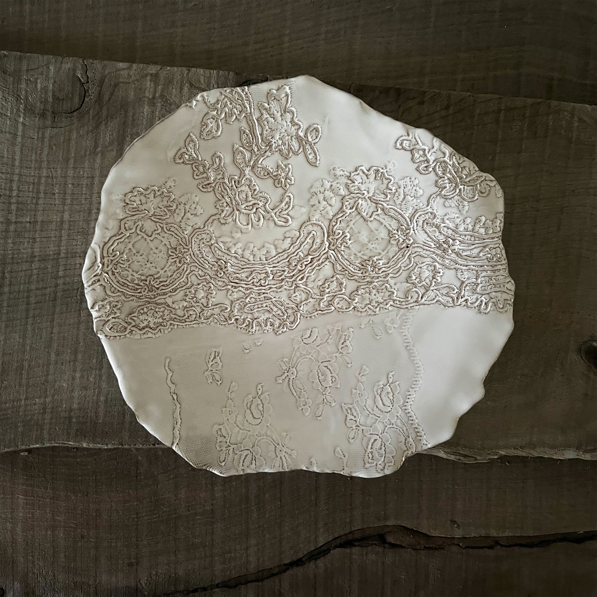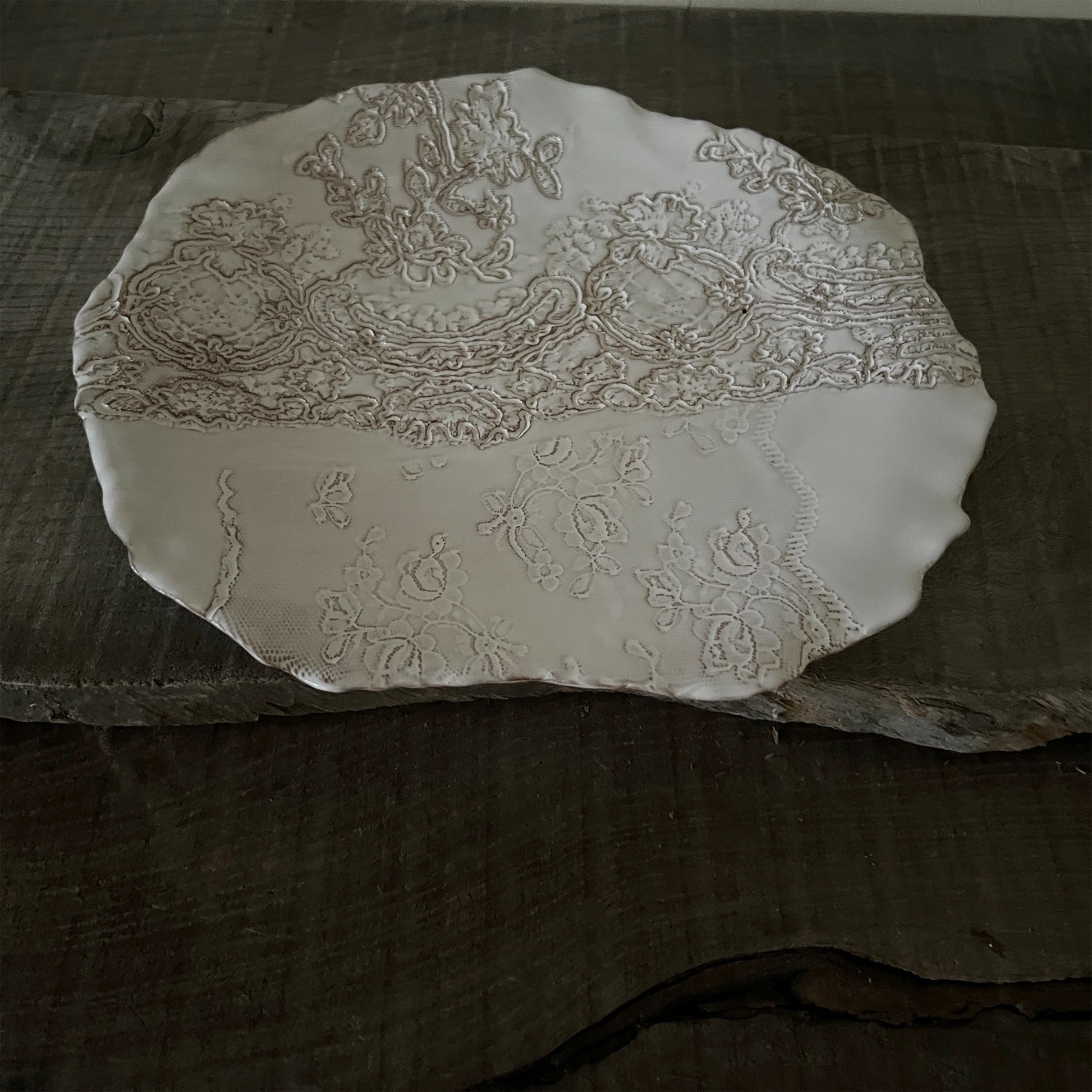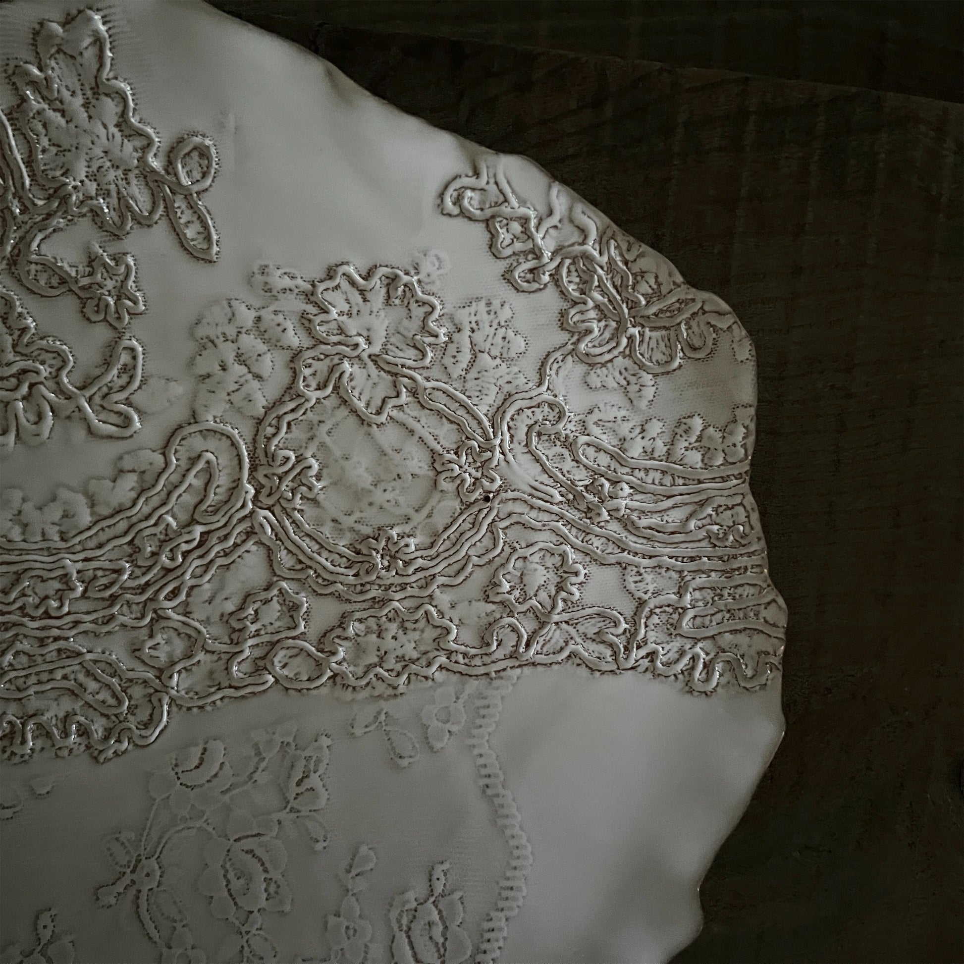 フランス人アーティストのヴァレリー・カサドが独自の手法で制作するセラミック作品。南仏ソルグ島のヴォクリューズに工房を構え、感性の赴くままに手を動かして造形しています。布地のように薄く柔らかなフォルムで、粉砂糖をまとったお菓子のような表情があります。古いものに関心の深い彼女が集めたアンティークのレースやボタンで表現された美しいレリーフが魅力。作家の優しさが伝わってくるような、ひとつとして同じものがない作品です。*手作りのため、形や風合いには個体差があります。