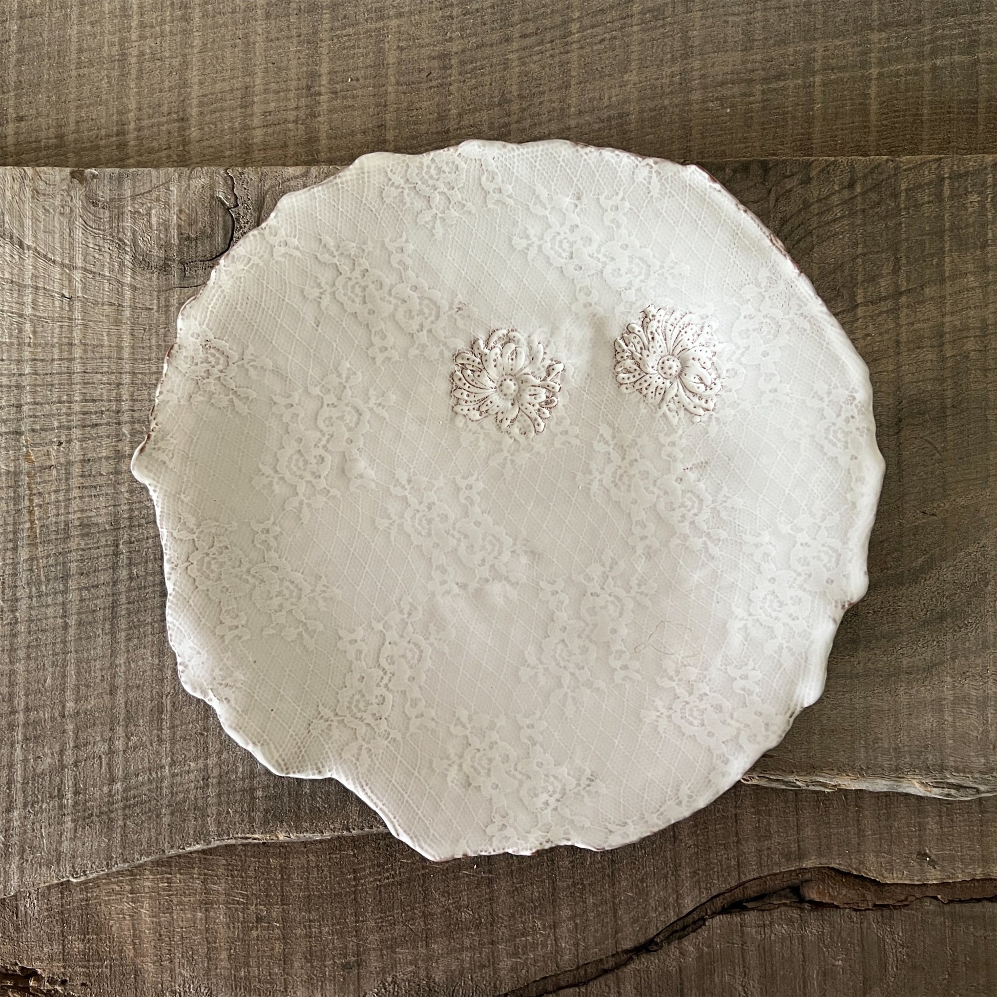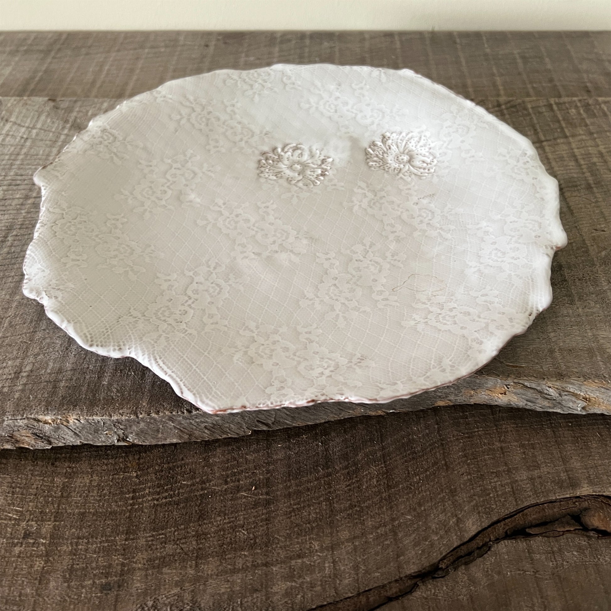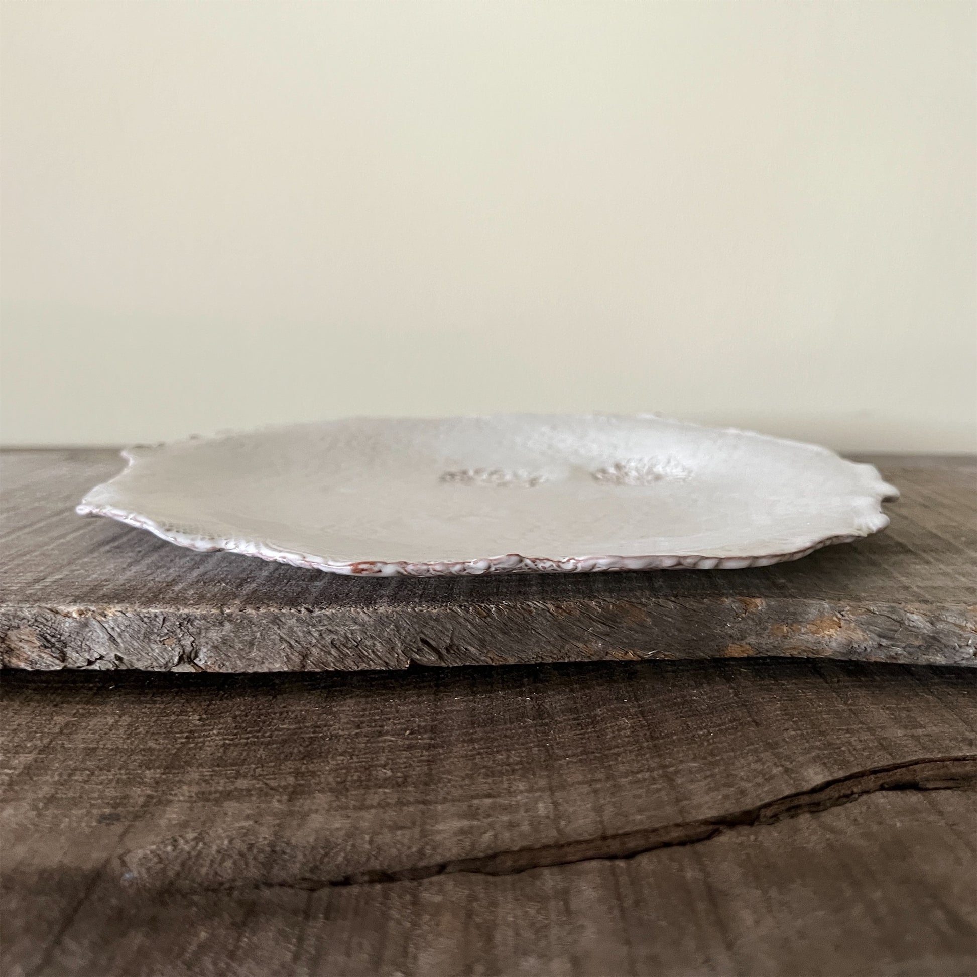 フランス人アーティストのヴァレリー・カサドが独自の手法で制作するセラミック作品。南仏ソルグ島のヴォクリューズに工房を構え、感性の赴くままに手を動かして造形しています。布地のように薄く柔らかなフォルムで、粉砂糖をまとったお菓子のような表情があります。古いものに関心の深い彼女が集めたアンティークのレースやボタンで表現された美しいレリーフが魅力。作家の優しさが伝わってくるような、ひとつとして同じものがない作品です。*手作りのため、形や風合いには個体差があります。