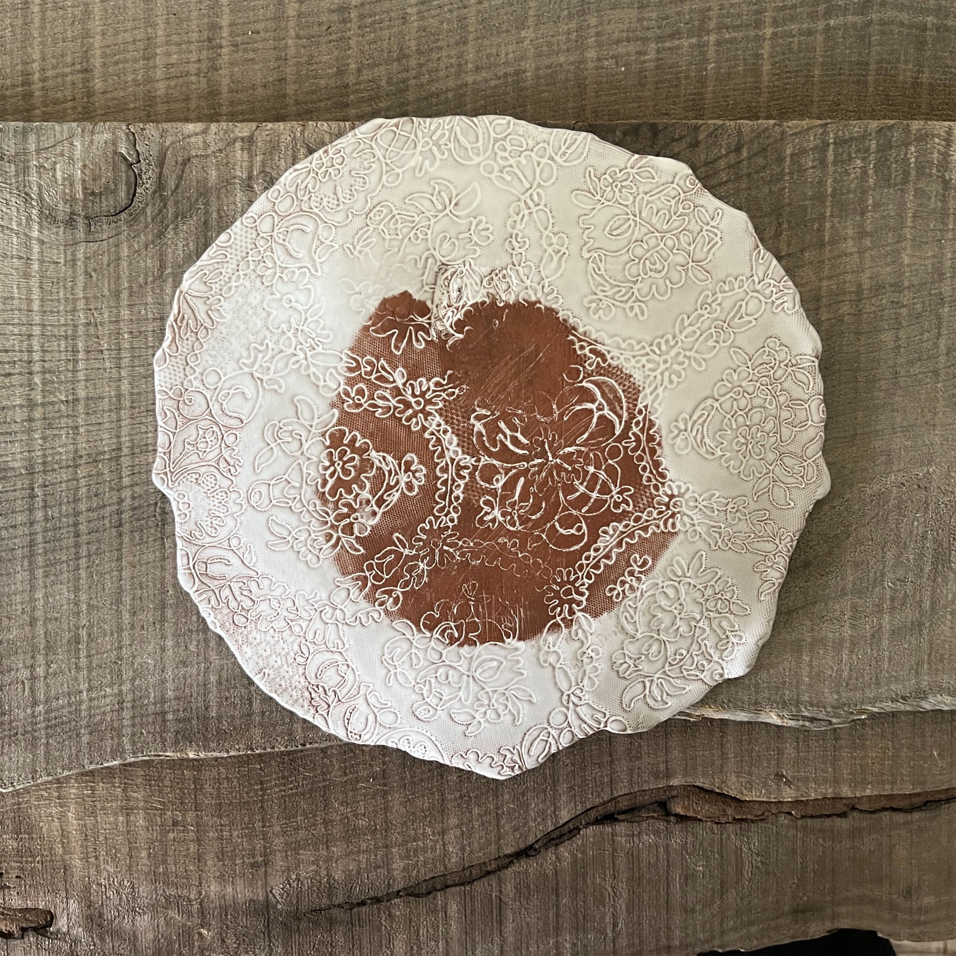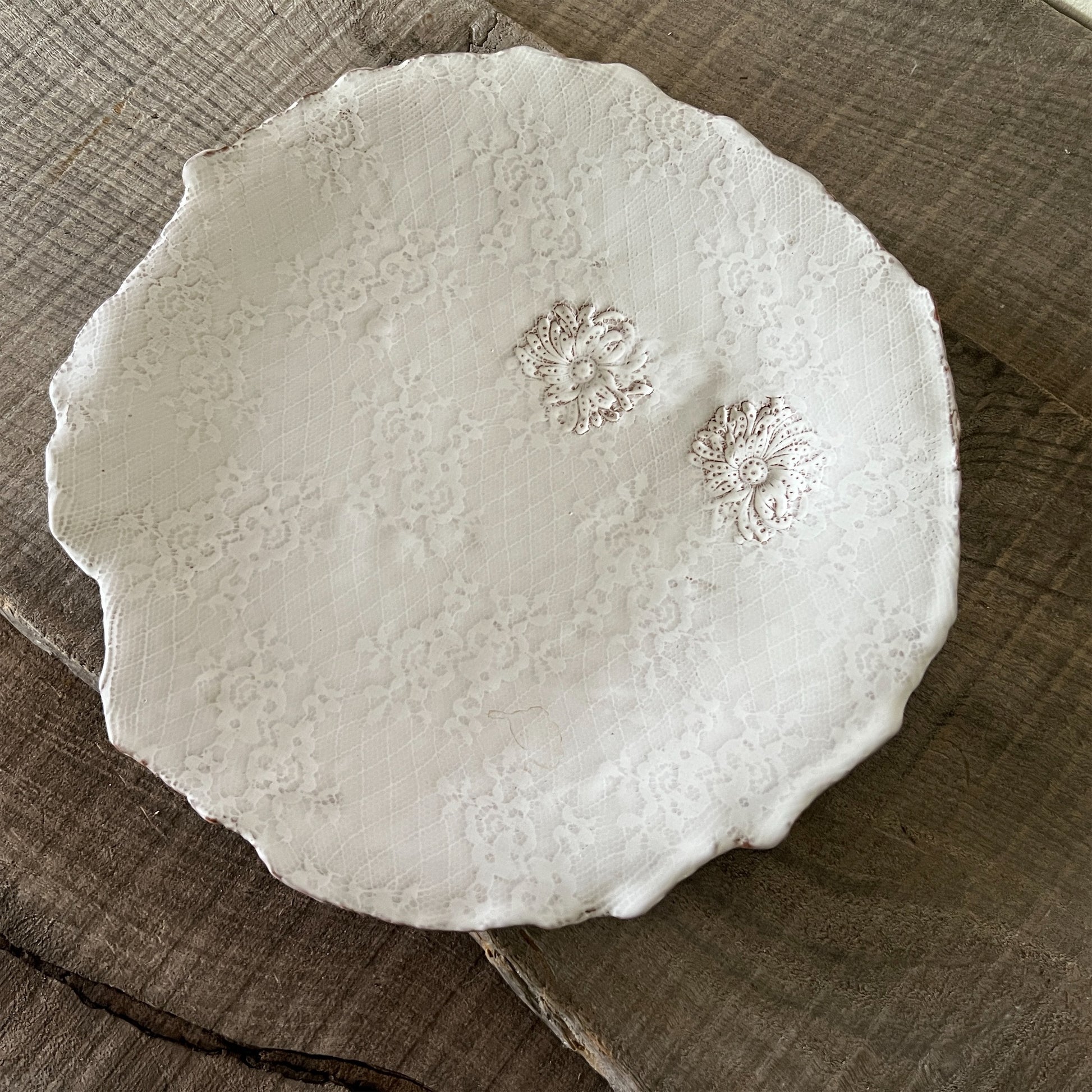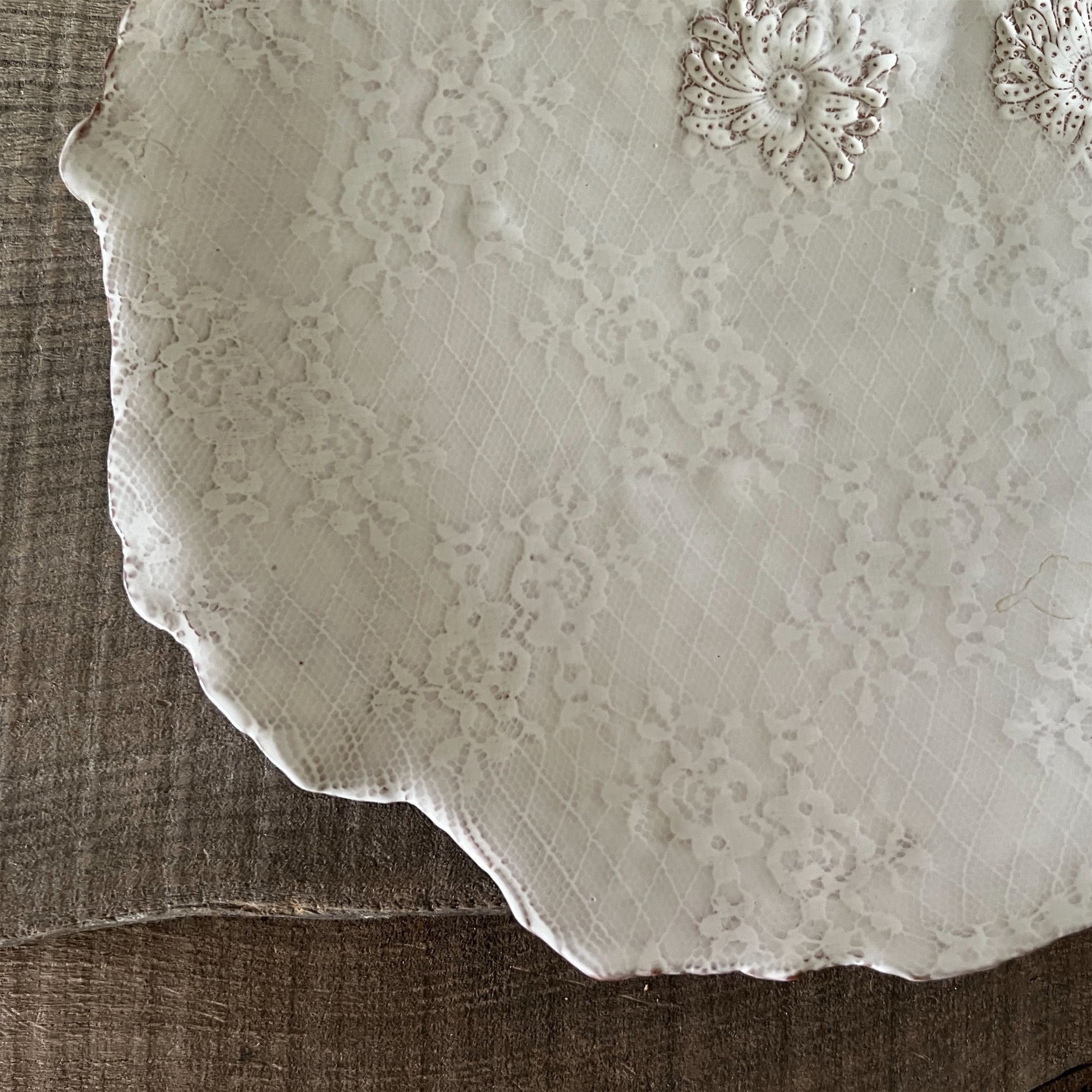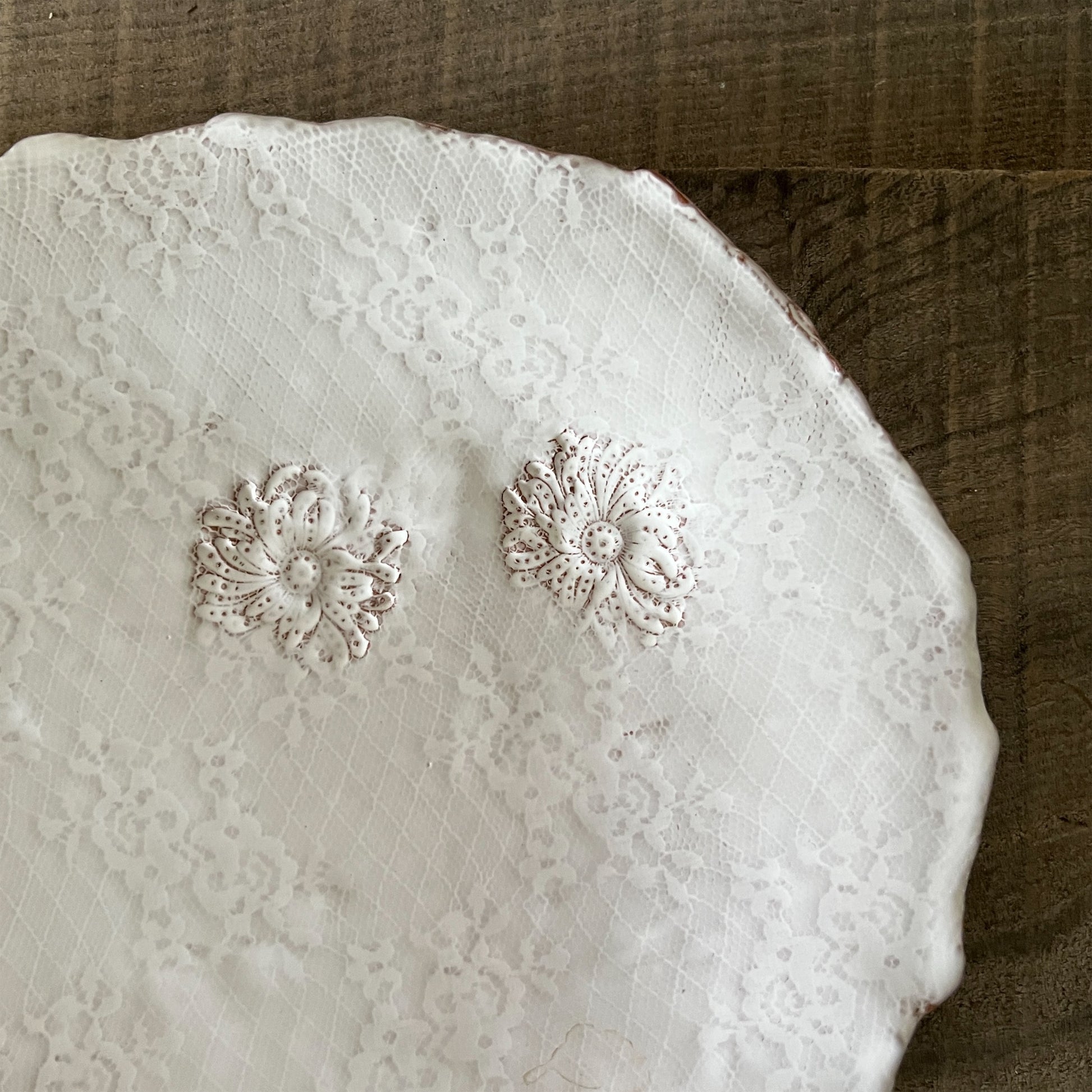 フランス人アーティストのヴァレリー・カサドが独自の手法で制作するセラミック作品。南仏ソルグ島のヴォクリューズに工房を構え、感性の赴くままに手を動かして造形しています。布地のように薄く柔らかなフォルムで、粉砂糖をまとったお菓子のような表情があります。古いものに関心の深い彼女が集めたアンティークのレースやボタンで表現された美しいレリーフが魅力。作家の優しさが伝わってくるような、ひとつとして同じものがない作品です。*手作りのため、形や風合いには個体差があります。