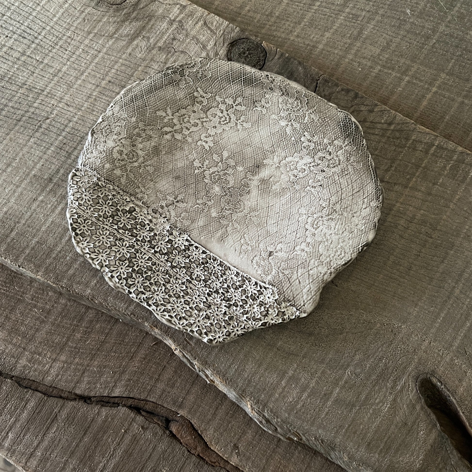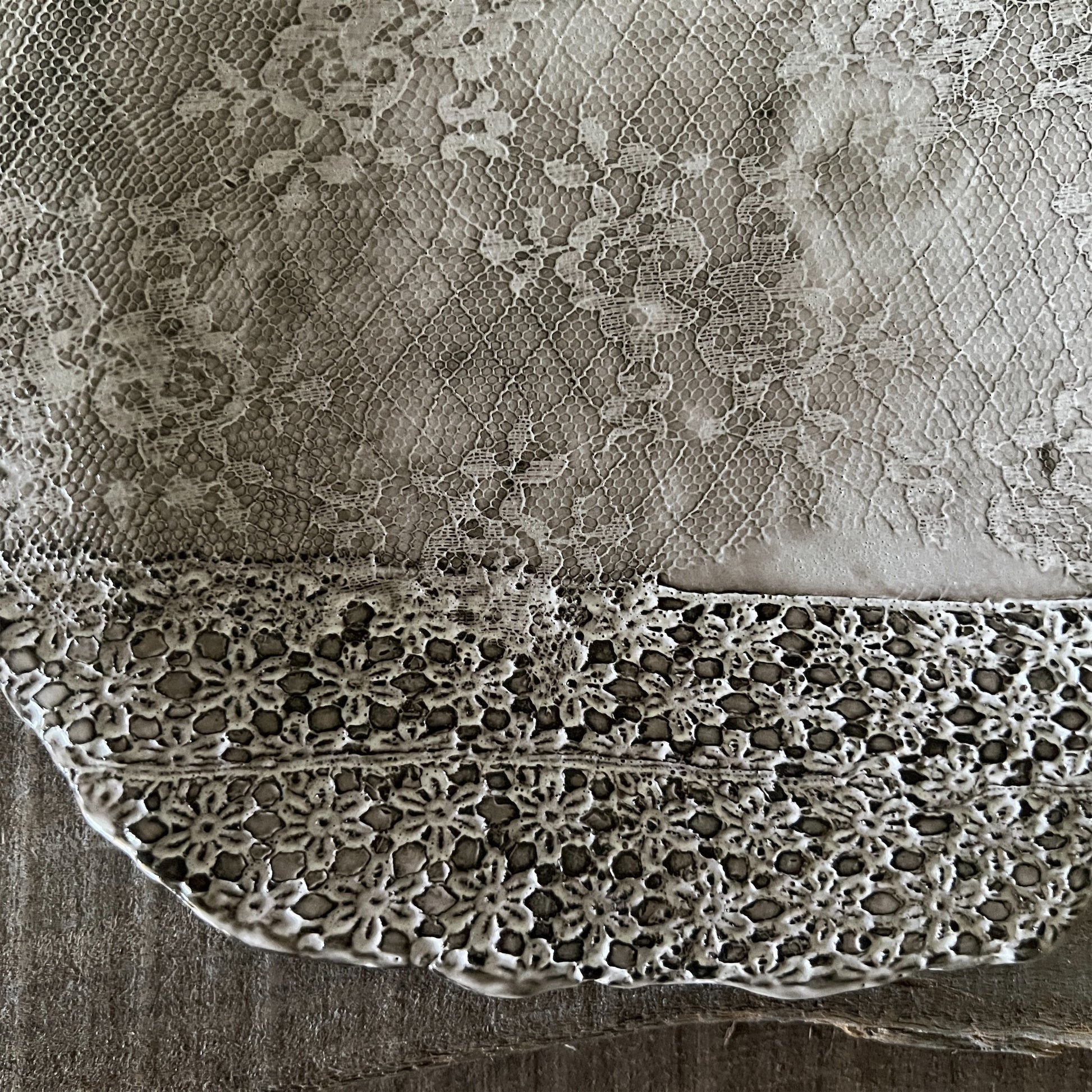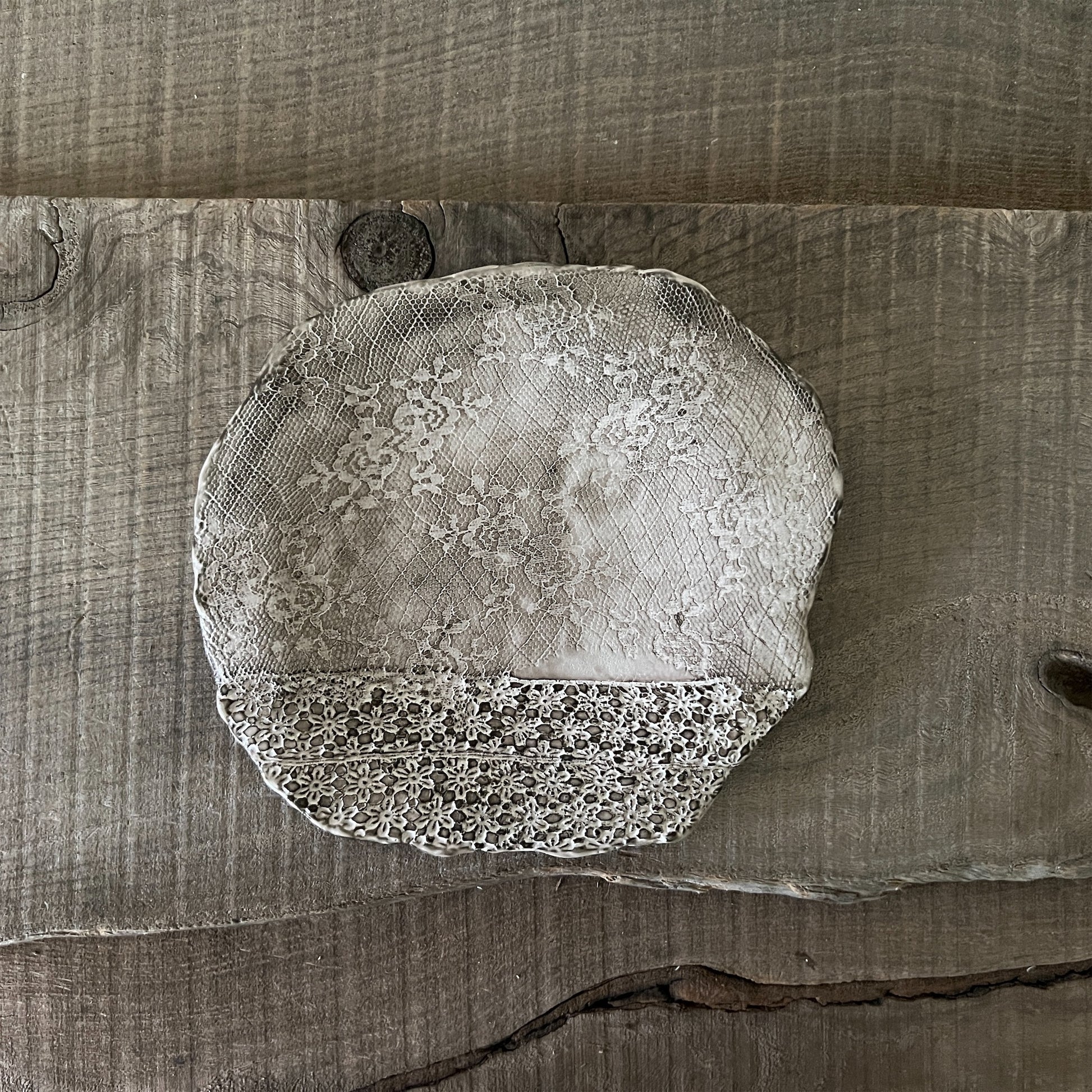 フランス人アーティストのヴァレリー・カサドが独自の手法で制作するセラミック作品。南仏ソルグ島のヴォクリューズに工房を構え、感性の赴くままに手を動かして造形しています。布地のように薄く柔らかなフォルムで、粉砂糖をまとったお菓子のような表情があります。古いものに関心の深い彼女が集めたアンティークのレースやボタンで表現された美しいレリーフが魅力。作家の優しさが伝わってくるような、ひとつとして同じものがない作品です。*手作りのため、形や風合いには個体差があります。