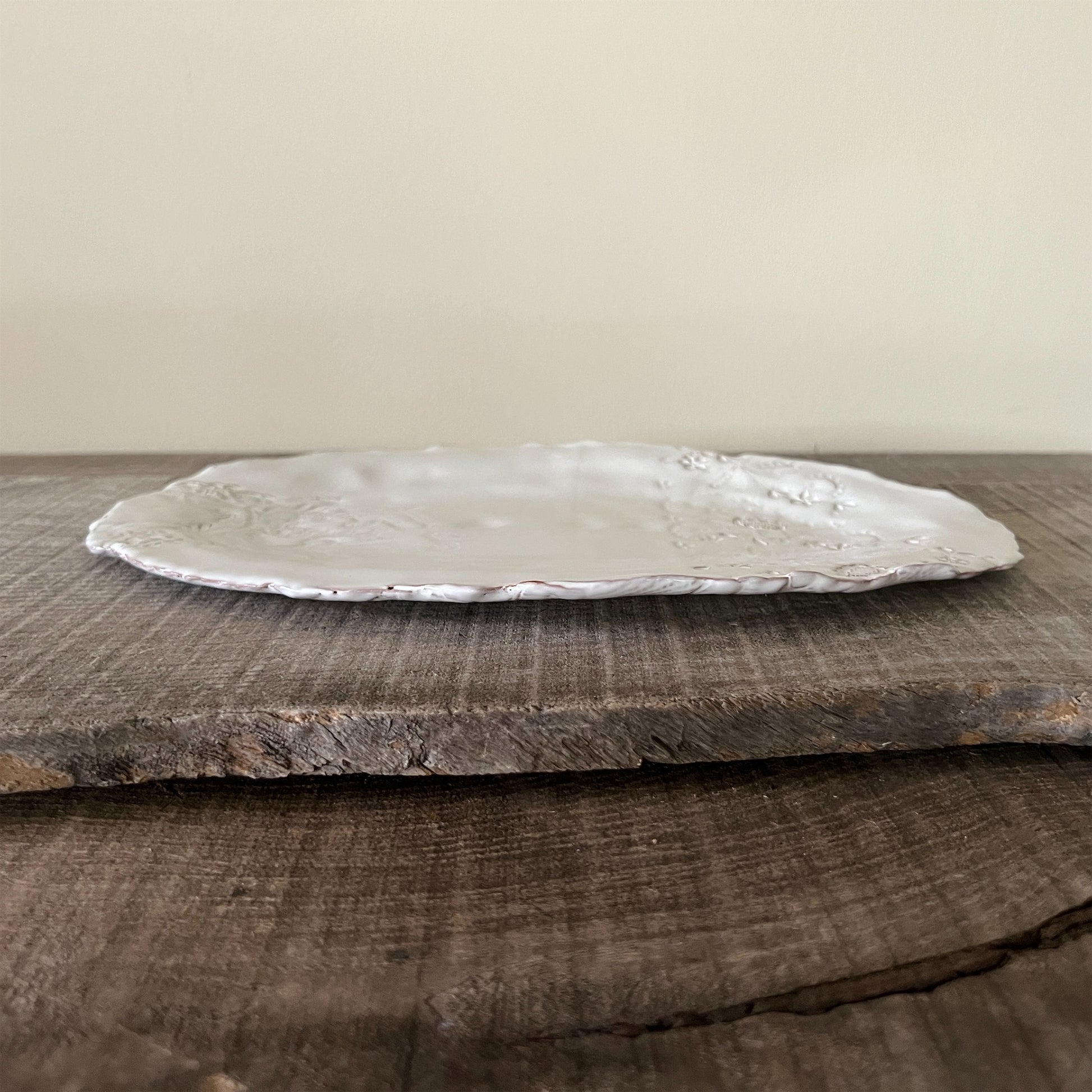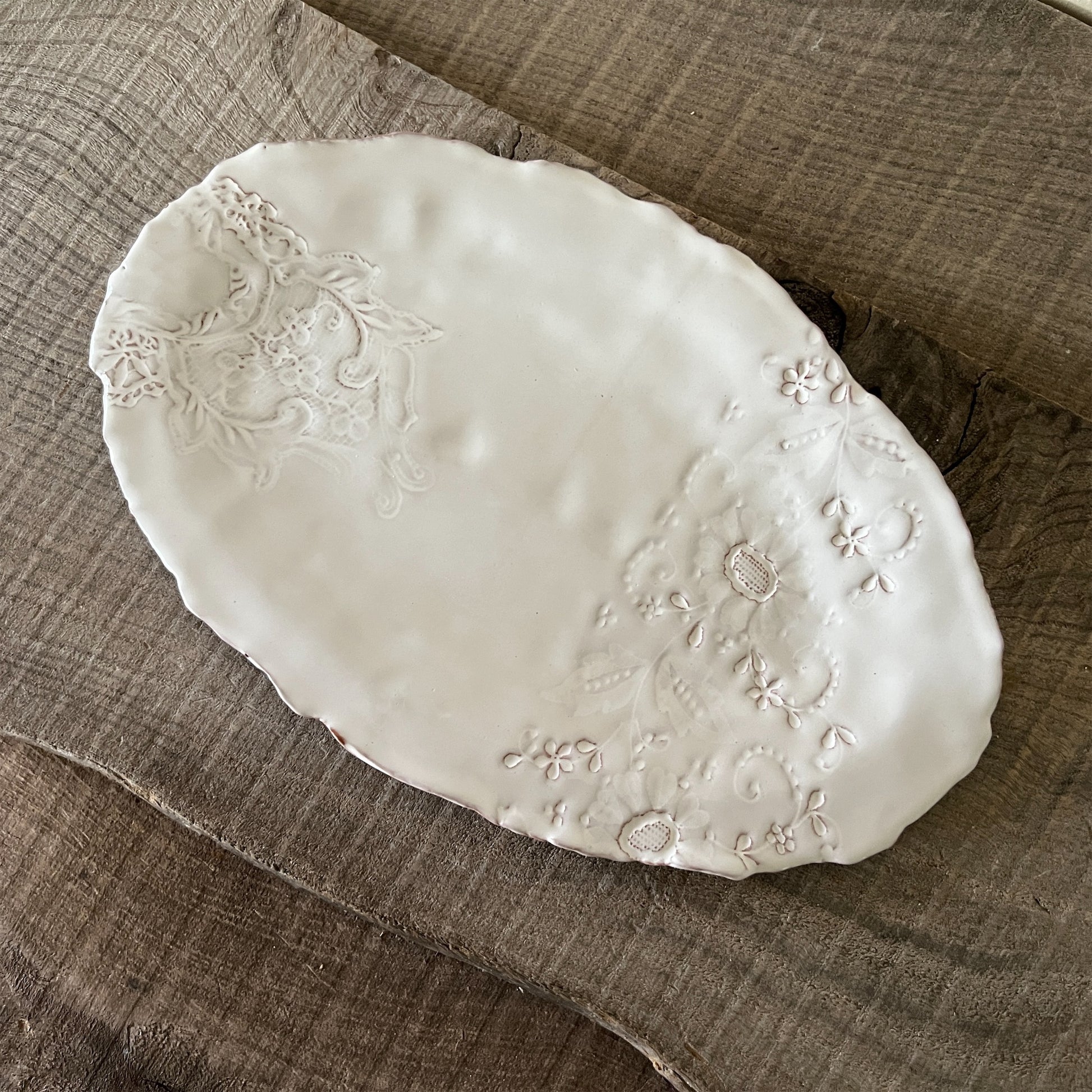 フランス人アーティストのヴァレリー・カサドが独自の手法で制作するセラミック作品。南仏ソルグ島のヴォクリューズに工房を構え、感性の赴くままに手を動かして造形しています。布地のように薄く柔らかなフォルムで、粉砂糖をまとったお菓子のような表情があります。古いものに関心の深い彼女が集めたアンティークのレースやボタンで表現された美しいレリーフが魅力。作家の優しさが伝わってくるような、ひとつとして同じものがない作品です。*手作りのため、形や風合いには個体差があります。
