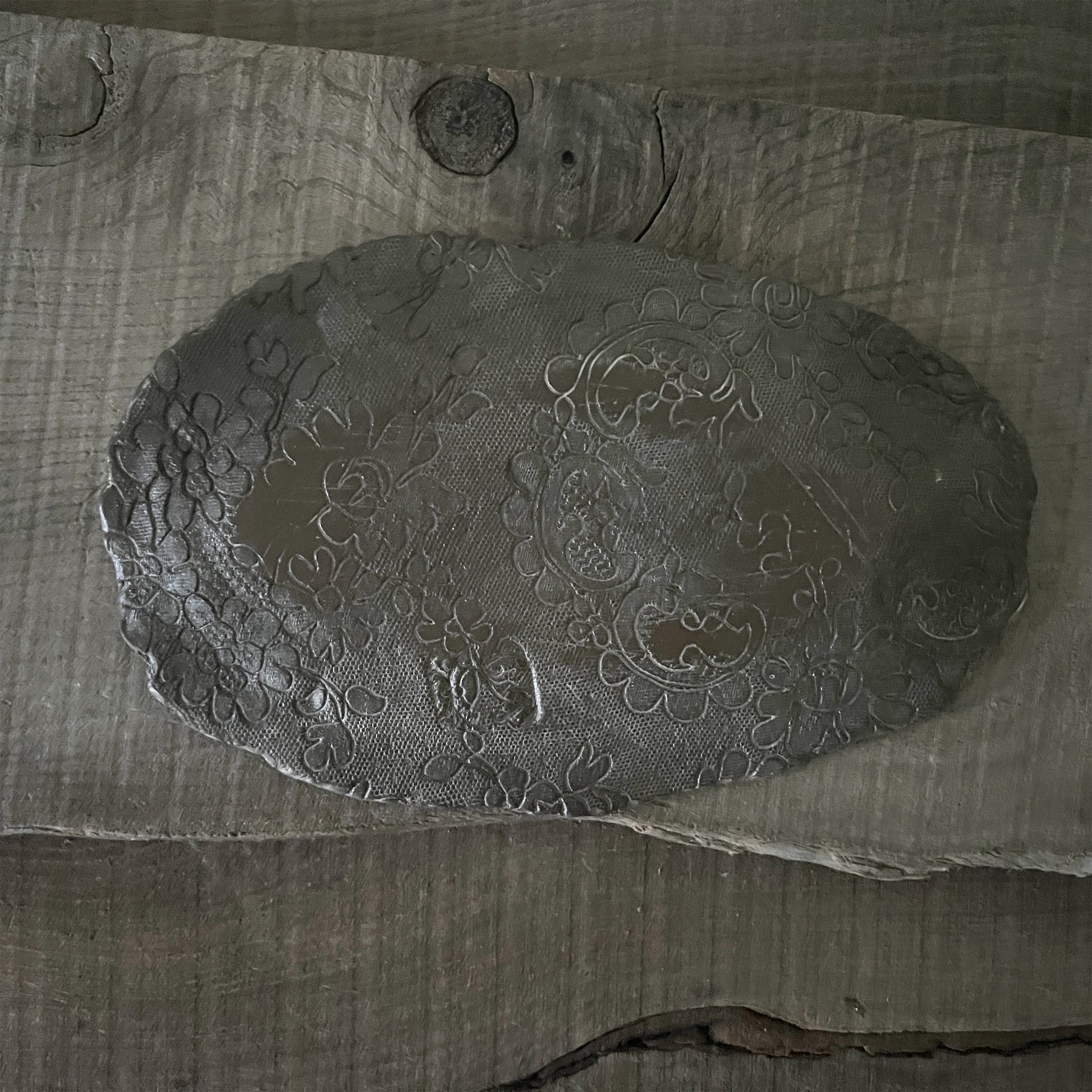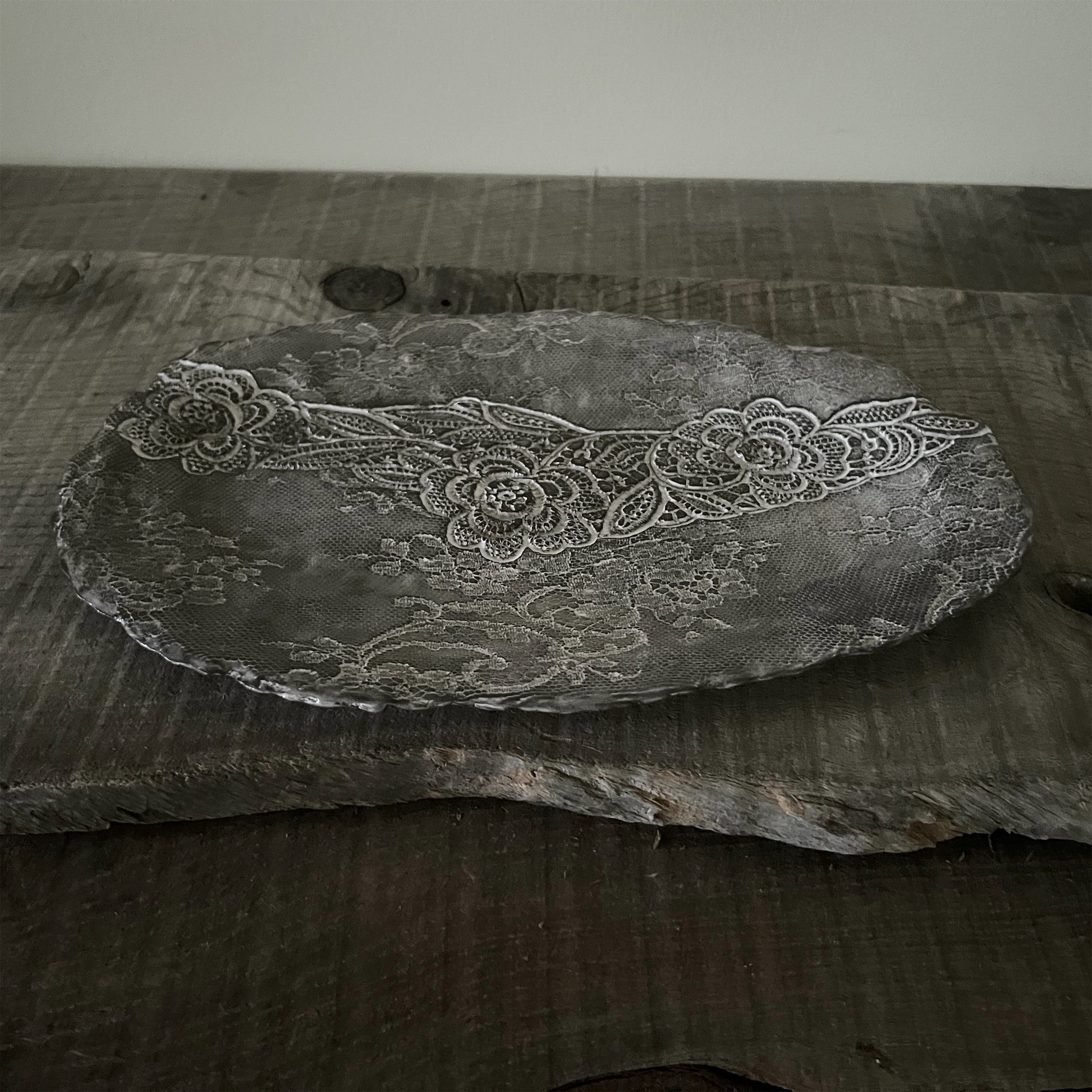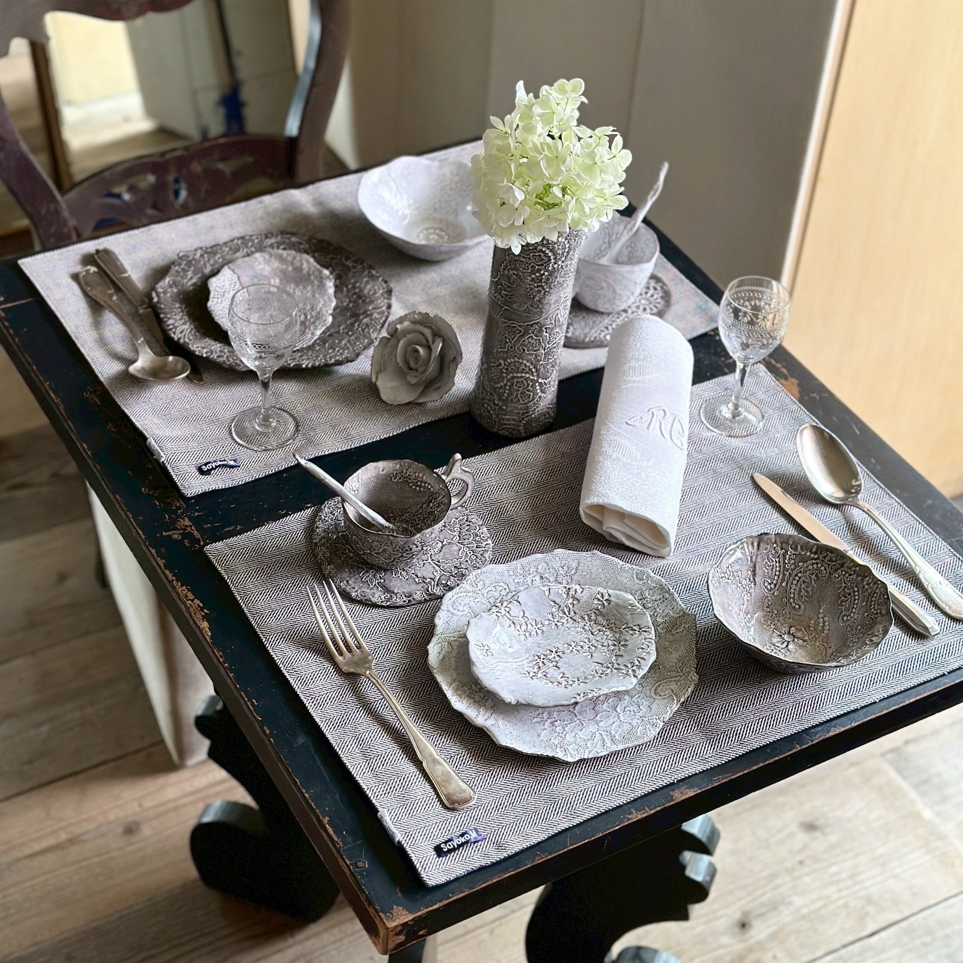 フランス人アーティストのヴァレリー・カサドが独自の手法で制作するセラミック作品。南仏ソルグ島のヴォクリューズに工房を構え、感性の赴くままに手を動かして造形しています。布地のように薄く柔らかなフォルムで、粉砂糖をまとったお菓子のような表情があります。古いものに関心の深い彼女が集めたアンティークのレースやボタンで表現された美しいレリーフが魅力。作家の優しさが伝わってくるような、ひとつとして同じものがない作品です。*手作りのため、形や風合いには個体差があります。