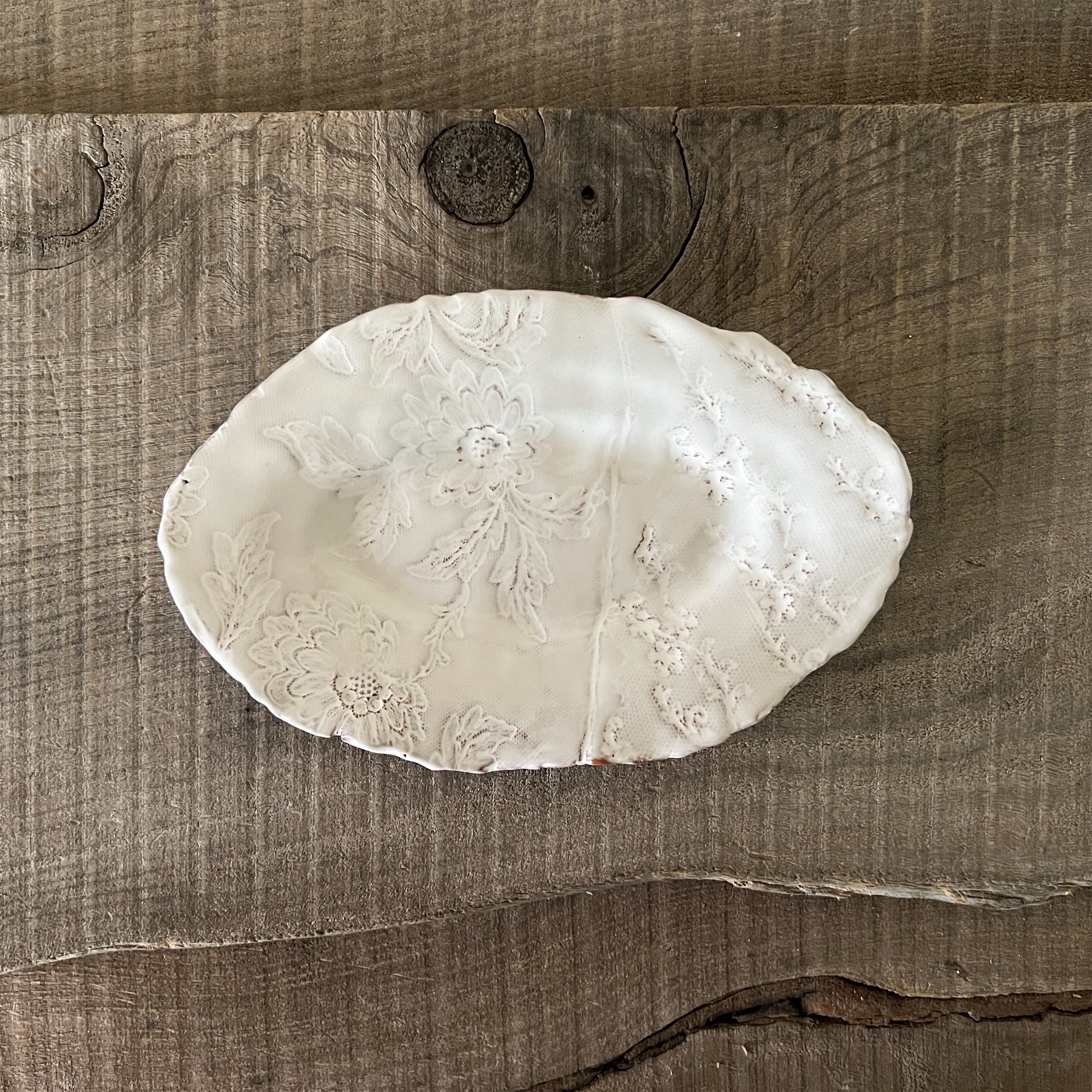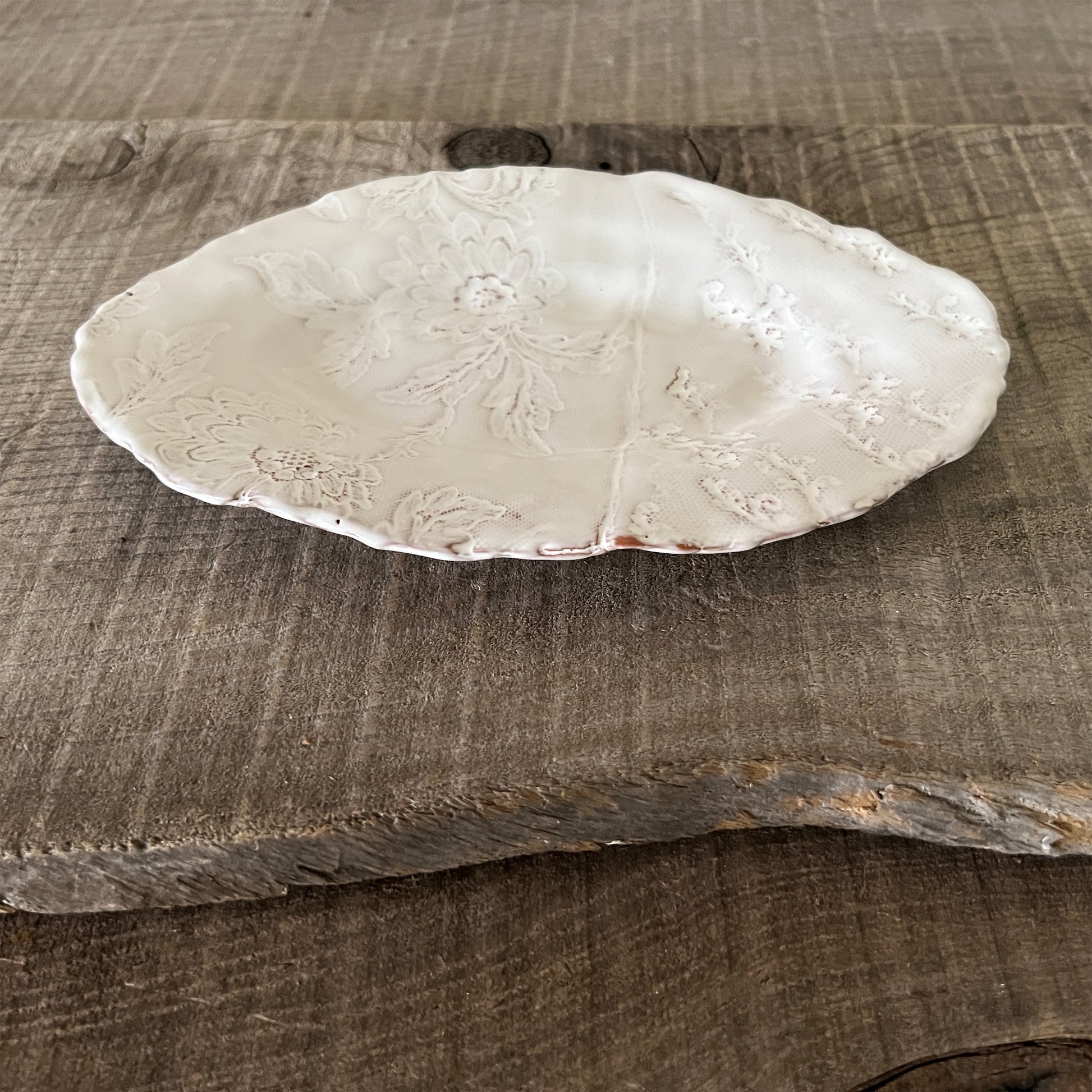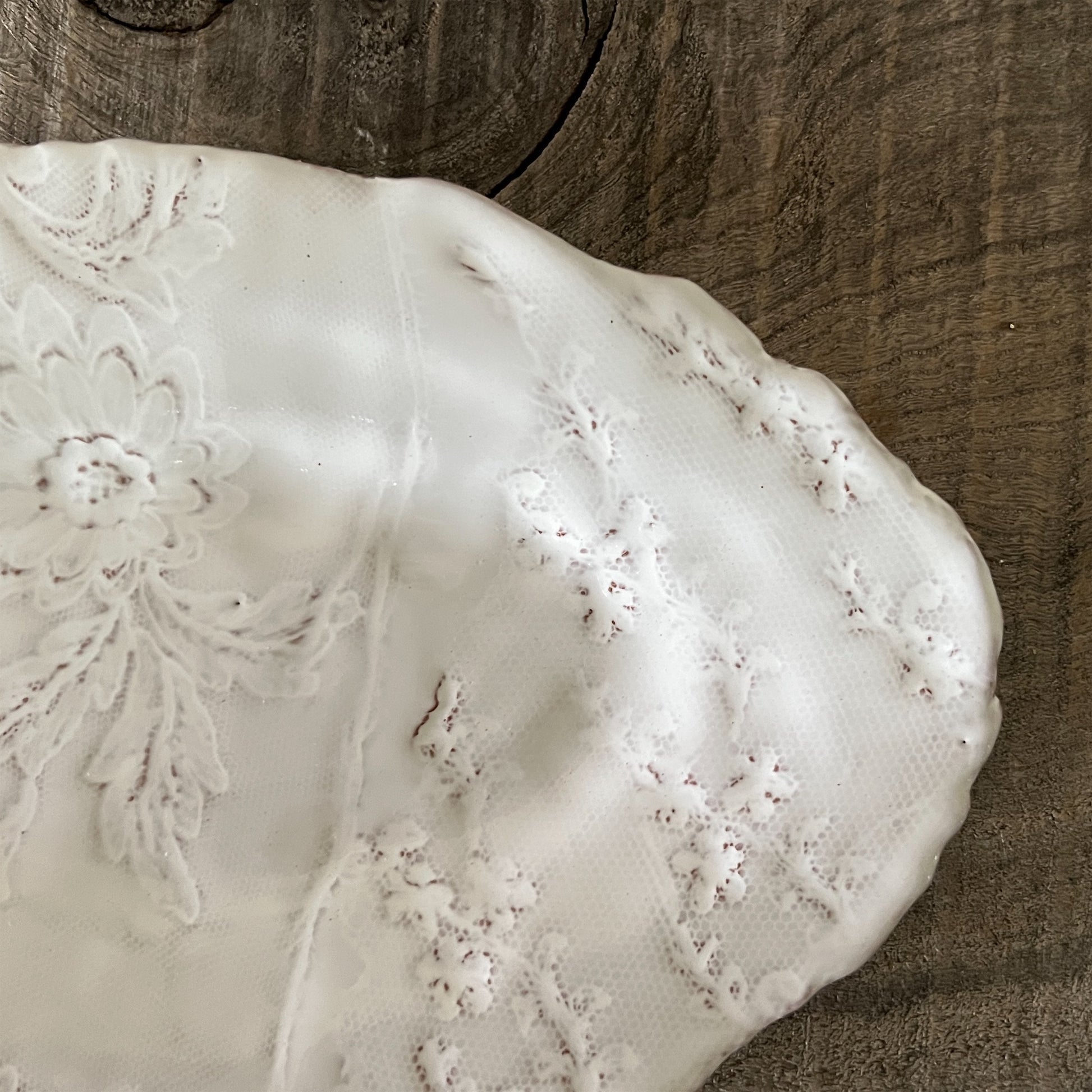 フランス人アーティストのヴァレリー・カサドが独自の手法で制作するセラミック作品。南仏ソルグ島のヴォクリューズに工房を構え、感性の赴くままに手を動かして造形しています。布地のように薄く柔らかなフォルムで、粉砂糖をまとったお菓子のような表情があります。古いものに関心の深い彼女が集めたアンティークのレースやボタンで表現された美しいレリーフが魅力。作家の優しさが伝わってくるような、ひとつとして同じものがない作品です。*手作りのため、形や風合いには個体差があります。
