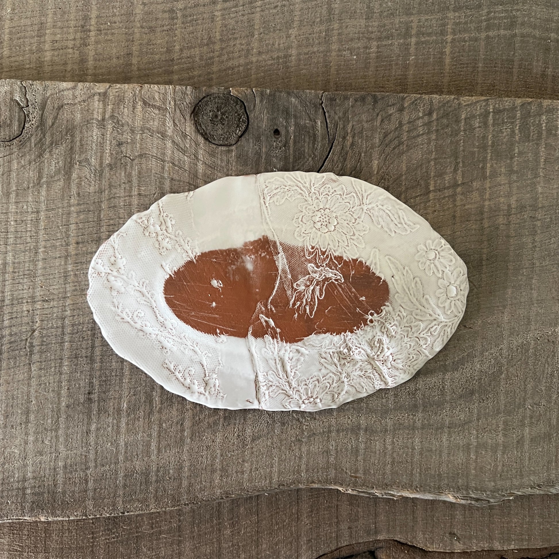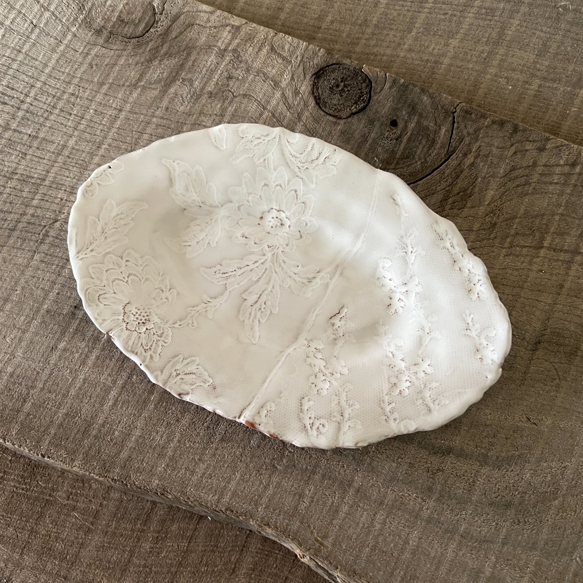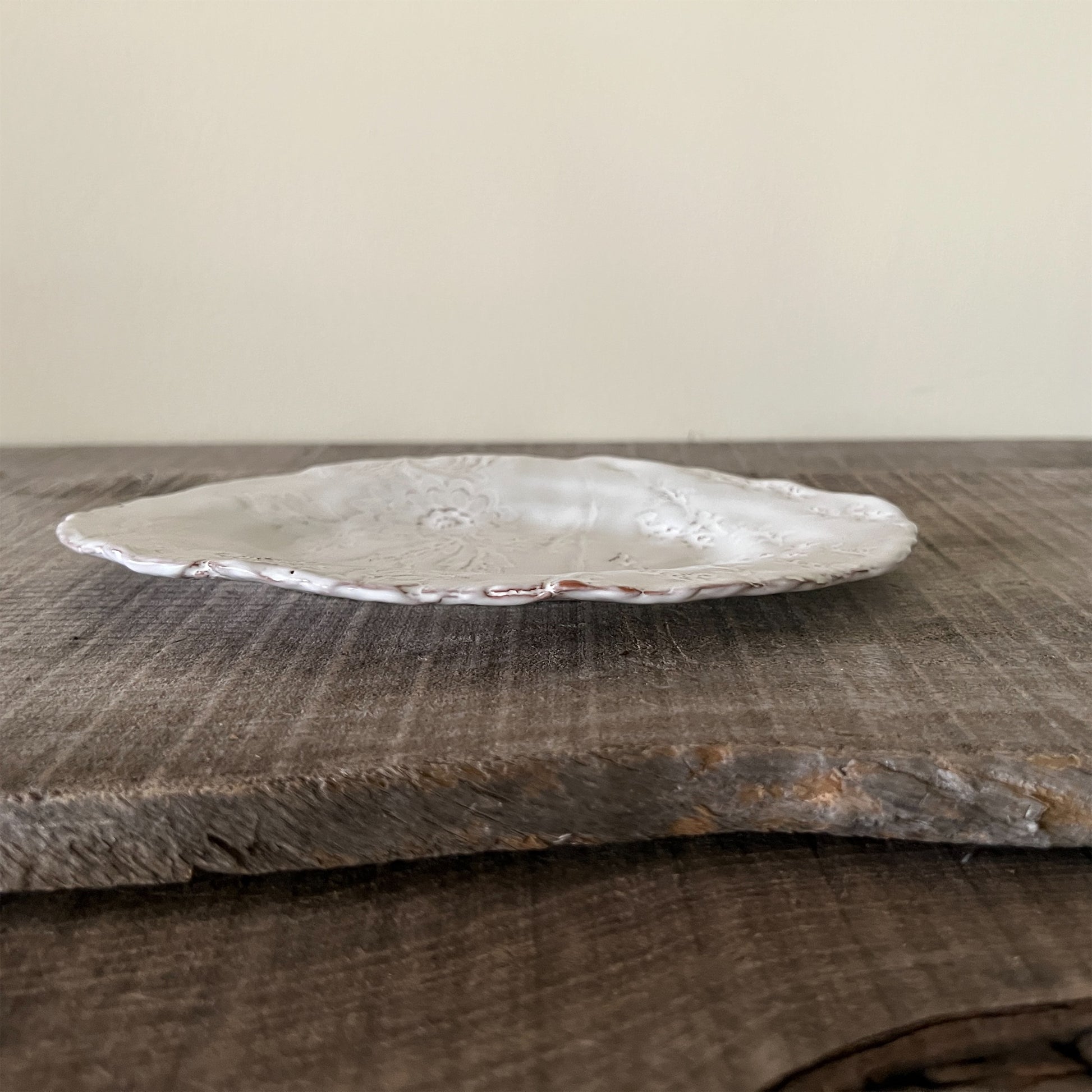 フランス人アーティストのヴァレリー・カサドが独自の手法で制作するセラミック作品。南仏ソルグ島のヴォクリューズに工房を構え、感性の赴くままに手を動かして造形しています。布地のように薄く柔らかなフォルムで、粉砂糖をまとったお菓子のような表情があります。古いものに関心の深い彼女が集めたアンティークのレースやボタンで表現された美しいレリーフが魅力。作家の優しさが伝わってくるような、ひとつとして同じものがない作品です。*手作りのため、形や風合いには個体差があります。