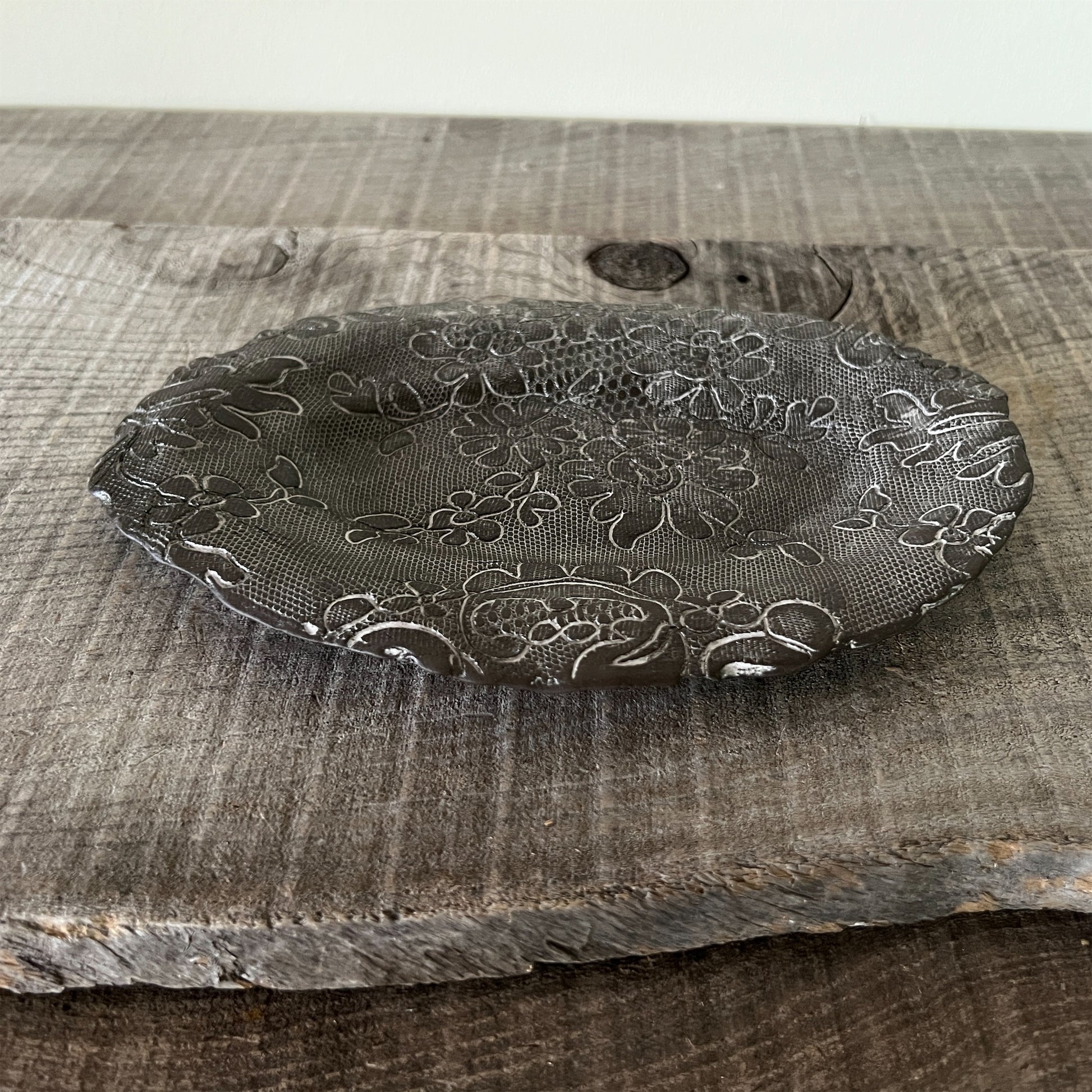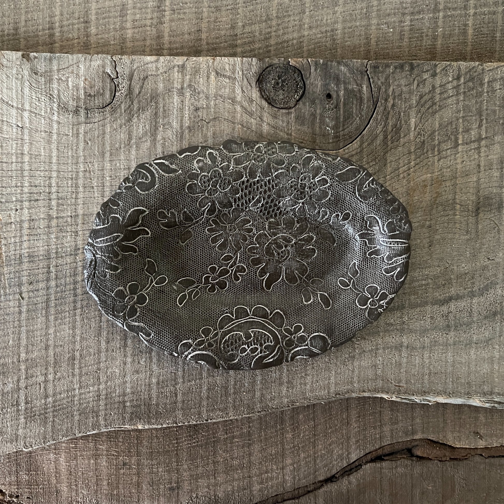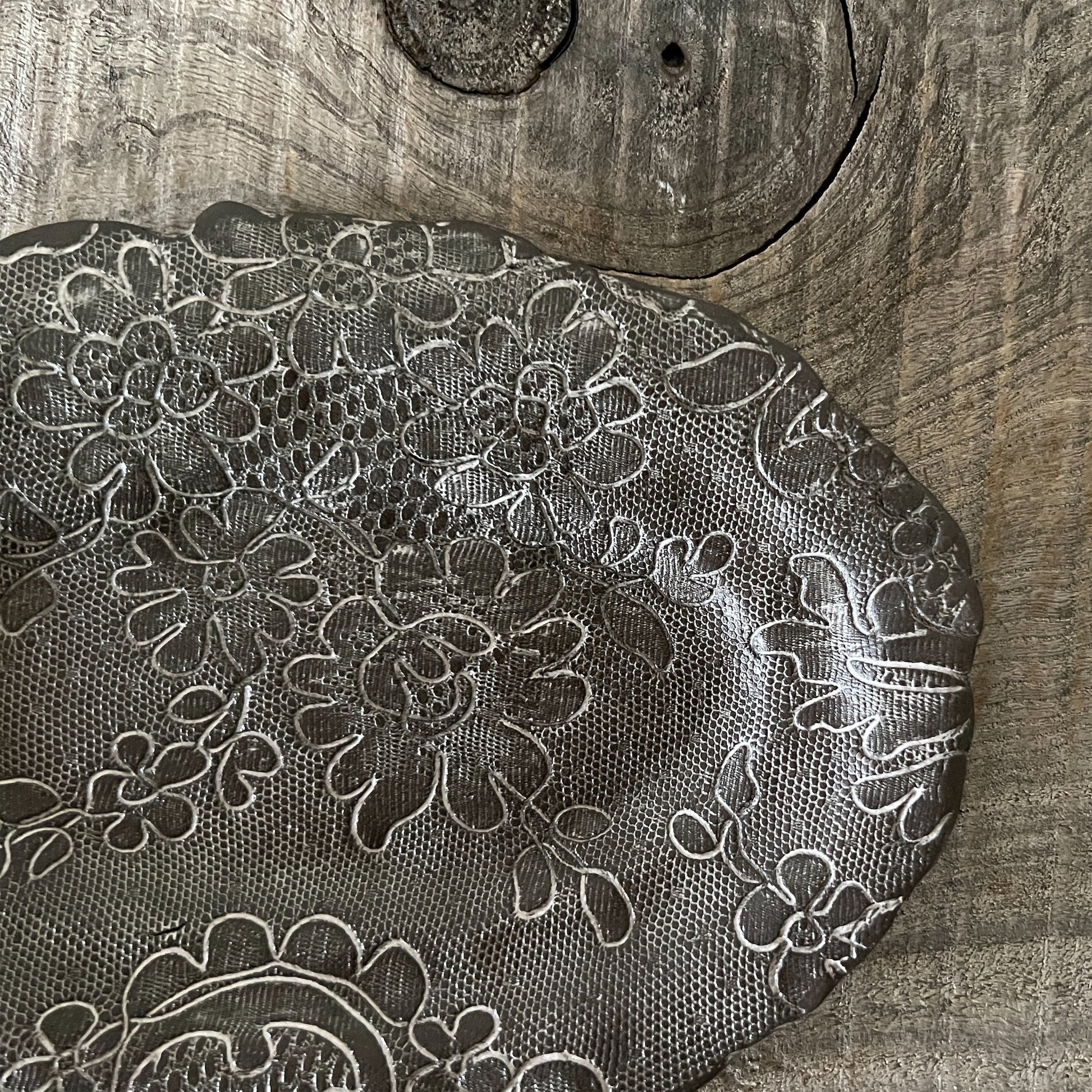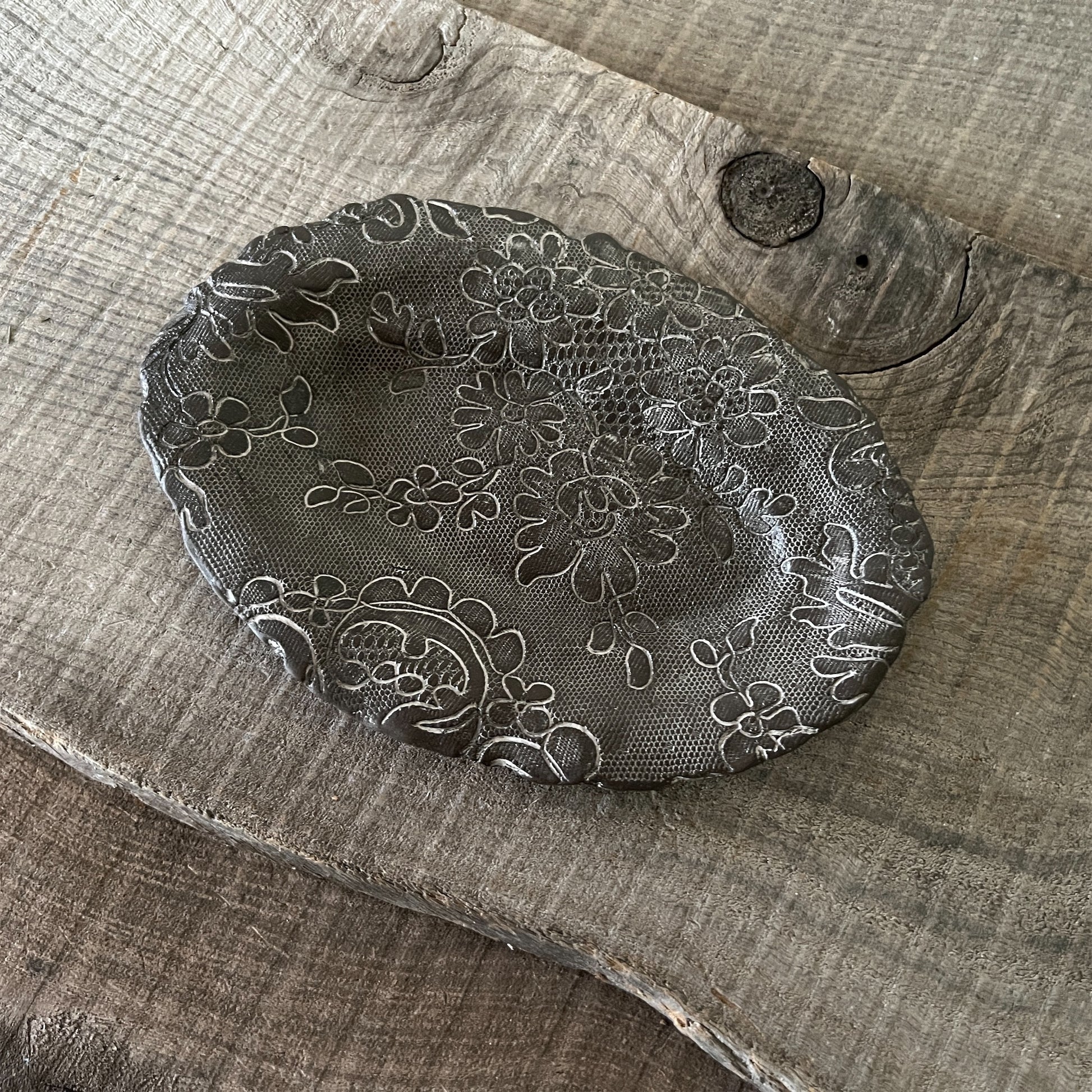 フランス人アーティストのヴァレリー・カサドが独自の手法で制作するセラミック作品。南仏ソルグ島のヴォクリューズに工房を構え、感性の赴くままに手を動かして造形しています。布地のように薄く柔らかなフォルムで、粉砂糖をまとったお菓子のような表情があります。古いものに関心の深い彼女が集めたアンティークのレースやボタンで表現された美しいレリーフが魅力。作家の優しさが伝わってくるような、ひとつとして同じものがない作品です。*手作りのため、形や風合いには個体差があります。