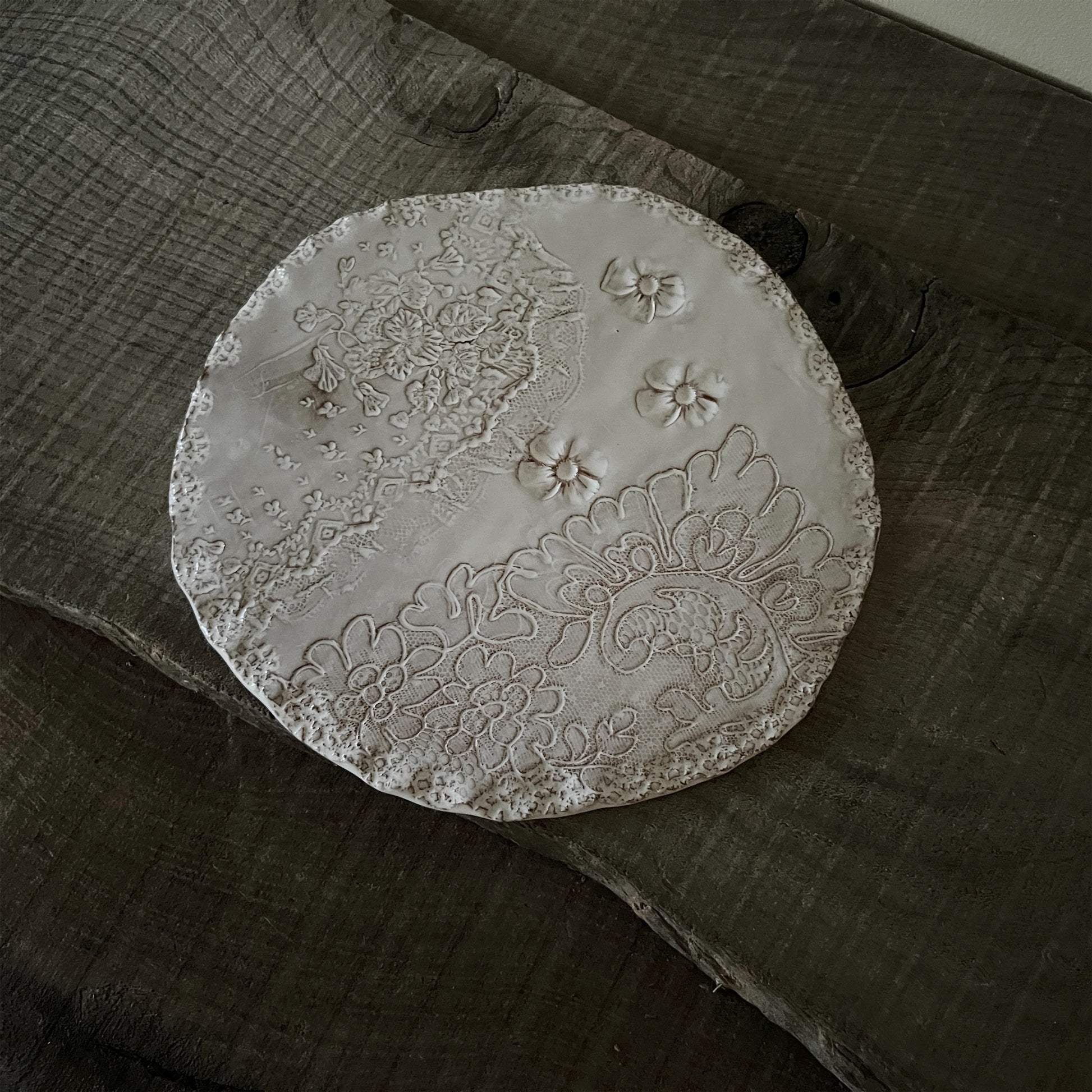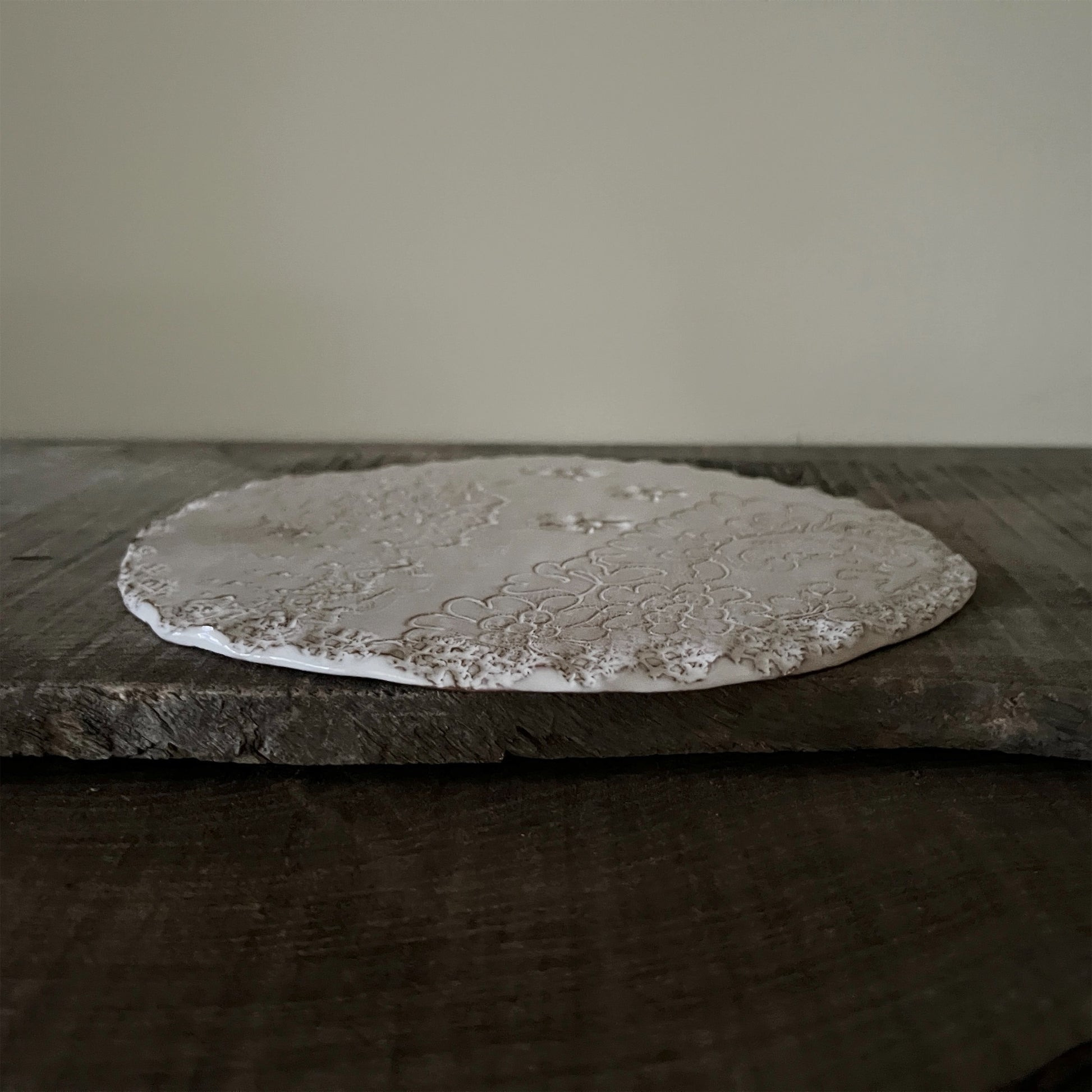 フランス人アーティストのヴァレリー・カサドが独自の手法で制作するセラミック作品。南仏ソルグ島のヴォクリューズに工房を構え、感性の赴くままに手を動かして造形しています。布地のように薄く柔らかなフォルムで、粉砂糖をまとったお菓子のような表情があります。古いものに関心の深い彼女が集めたアンティークのレースやボタンで表現された美しいレリーフが魅力。作家の優しさが伝わってくるような、ひとつとして同じものがない作品です。*手作りのため、形や風合いには個体差があります。