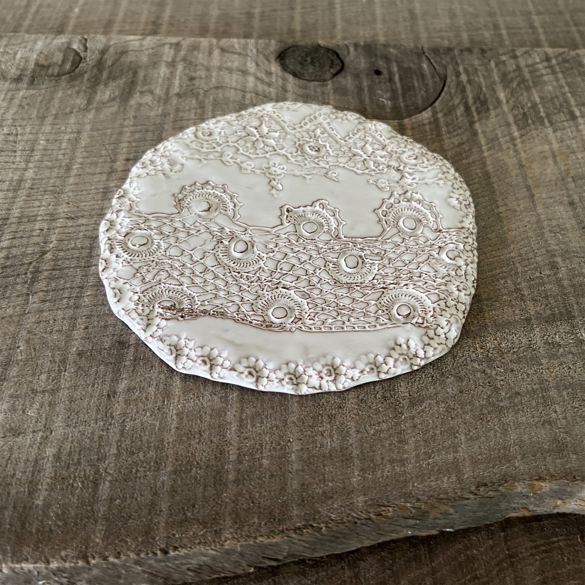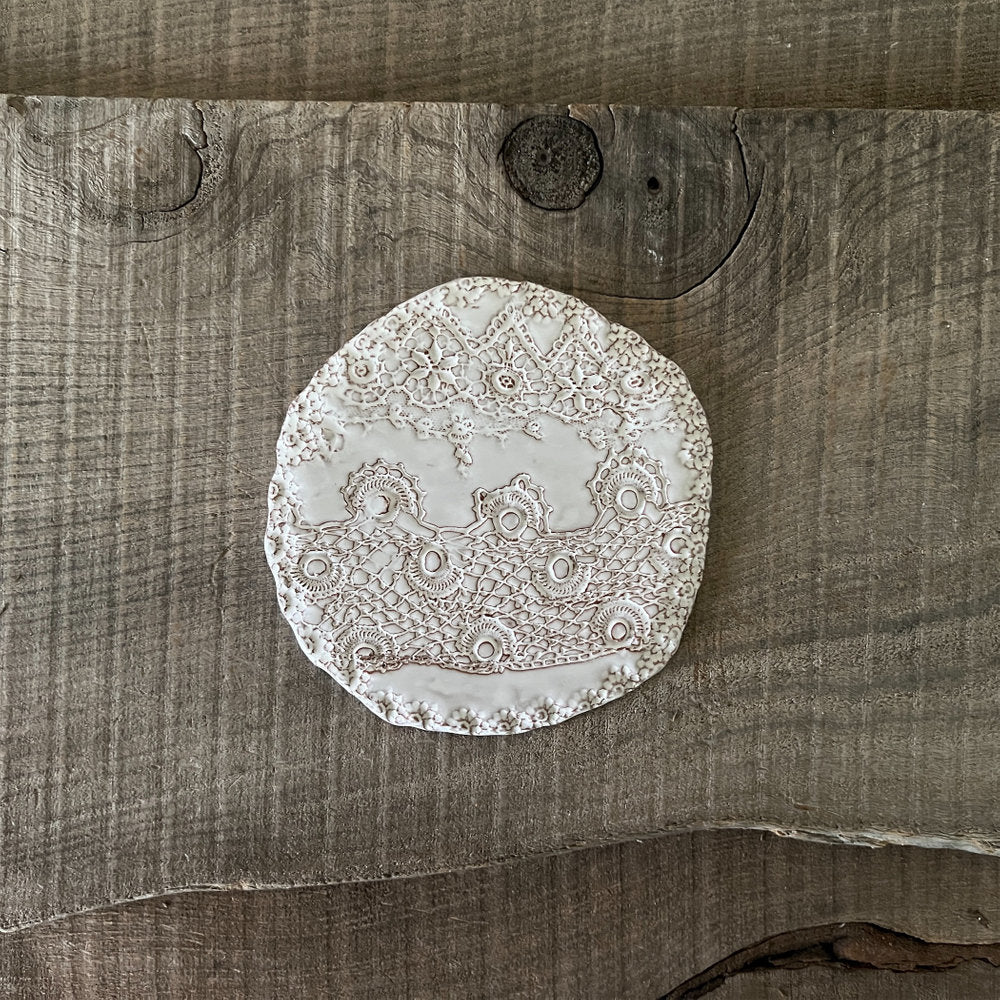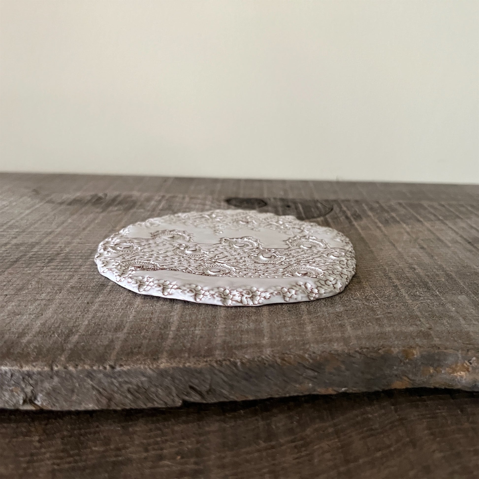 フランス人アーティストのヴァレリー・カサドが独自の手法で制作するセラミック作品。南仏ソルグ島のヴォクリューズに工房を構え、感性の赴くままに手を動かして造形しています。布地のように薄く柔らかなフォルムで、粉砂糖をまとったお菓子のような表情があります。古いものに関心の深い彼女が集めたアンティークのレースやボタンで表現された美しいレリーフが魅力。作家の優しさが伝わってくるような、ひとつとして同じものがない作品です。*手作りのため、形や風合いには個体差があります。