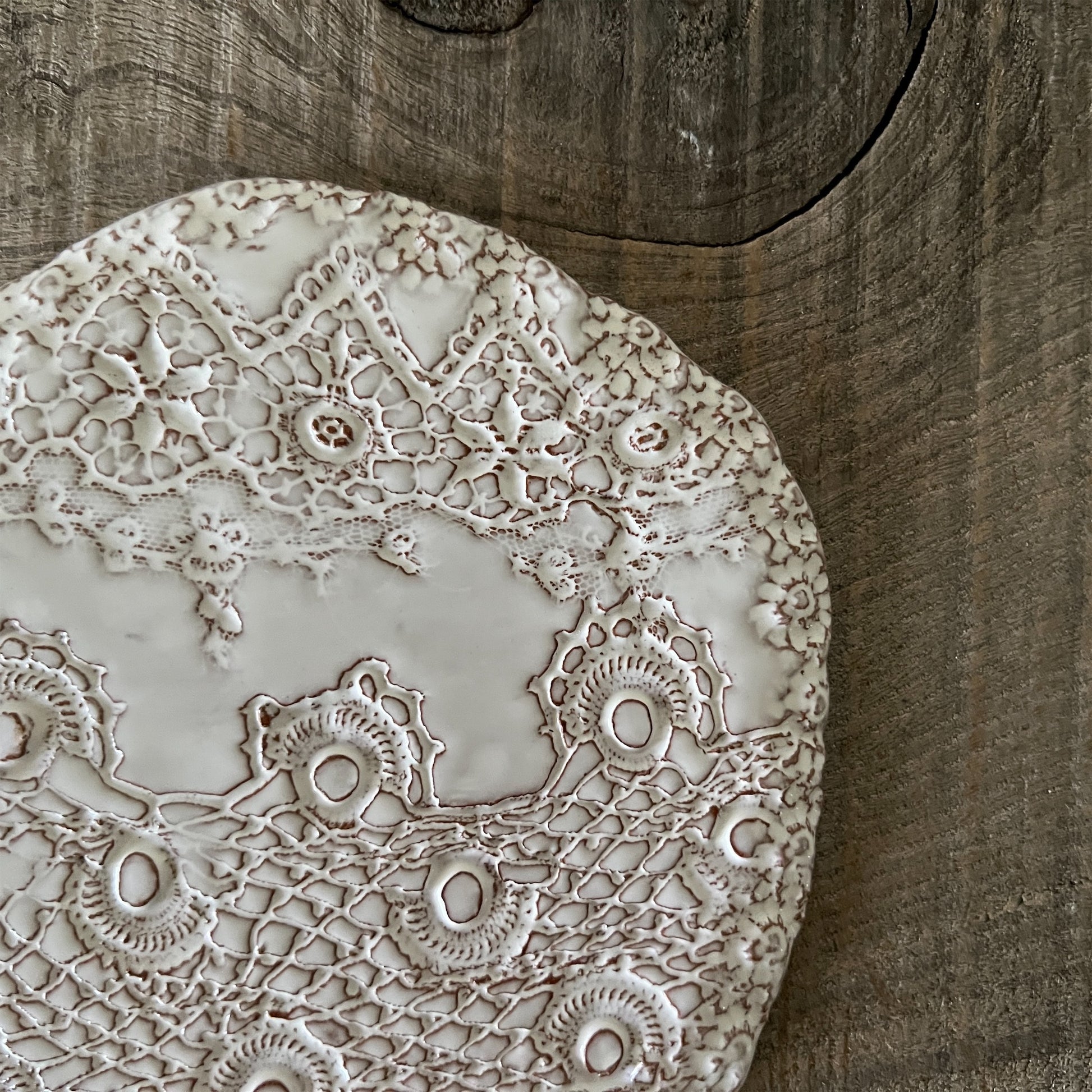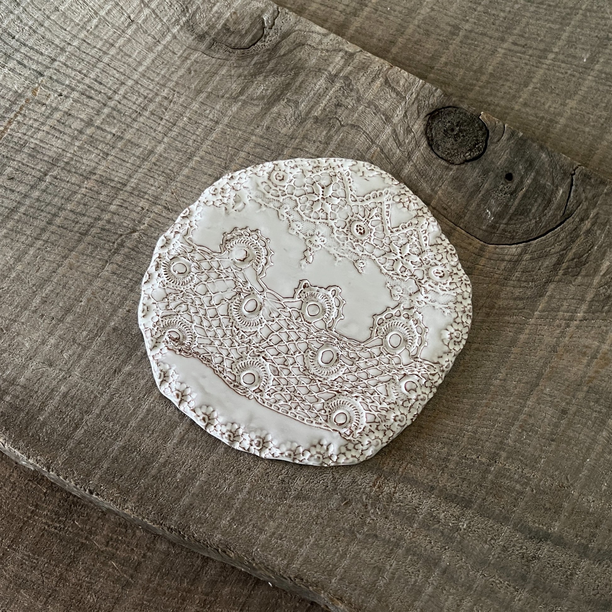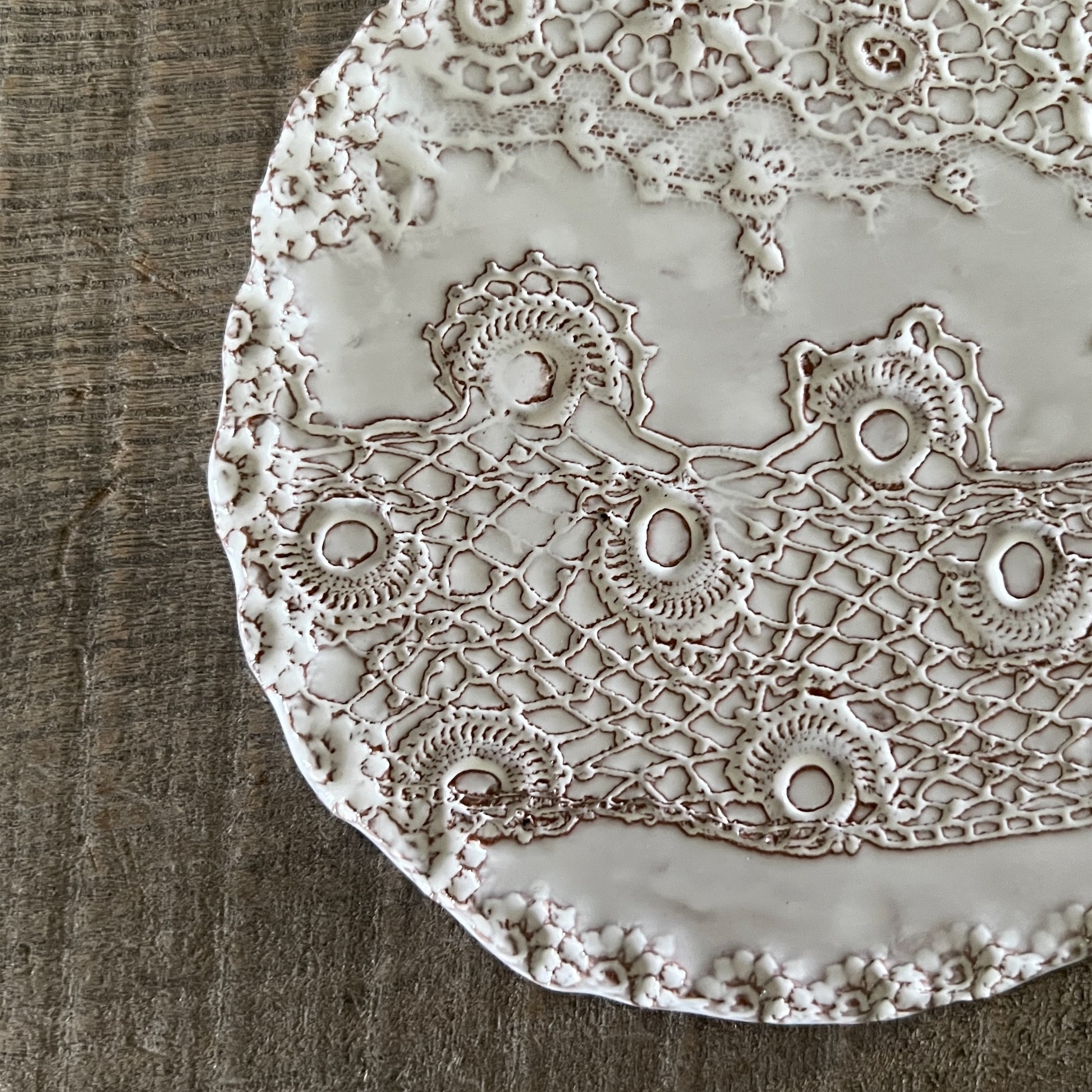 フランス人アーティストのヴァレリー・カサドが独自の手法で制作するセラミック作品。南仏ソルグ島のヴォクリューズに工房を構え、感性の赴くままに手を動かして造形しています。布地のように薄く柔らかなフォルムで、粉砂糖をまとったお菓子のような表情があります。古いものに関心の深い彼女が集めたアンティークのレースやボタンで表現された美しいレリーフが魅力。作家の優しさが伝わってくるような、ひとつとして同じものがない作品です。*手作りのため、形や風合いには個体差があります。