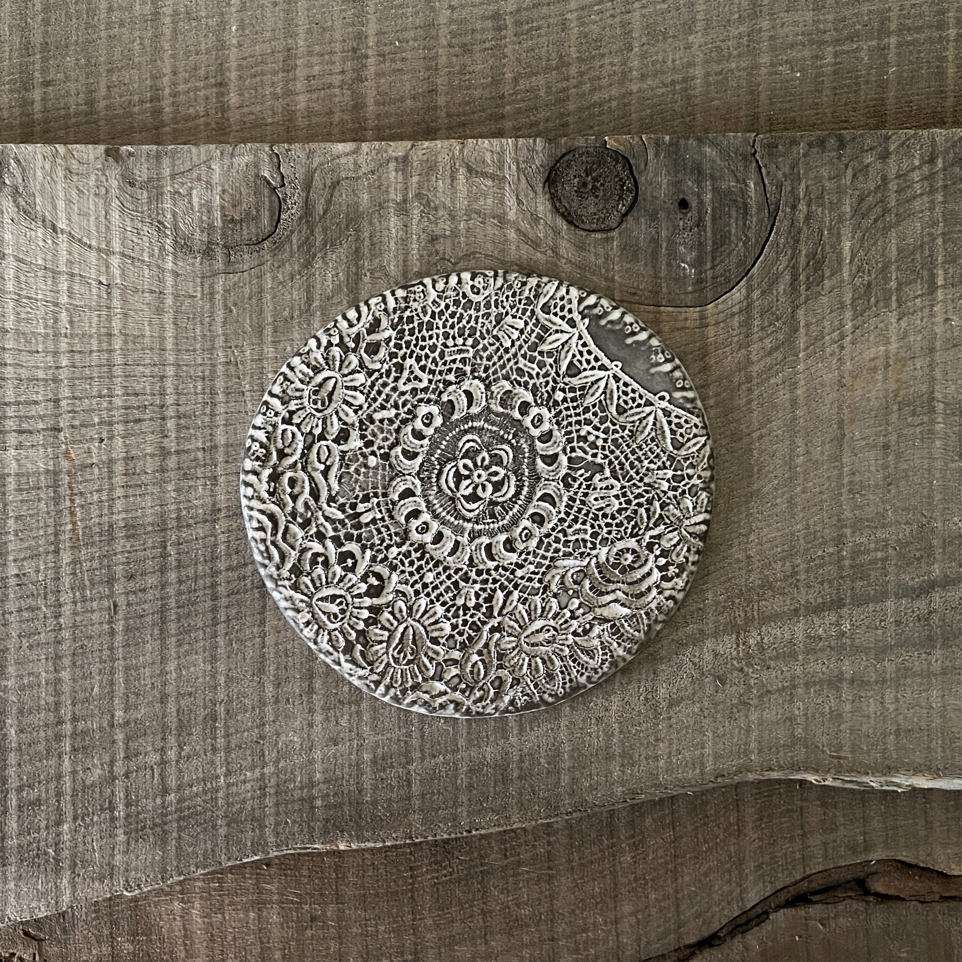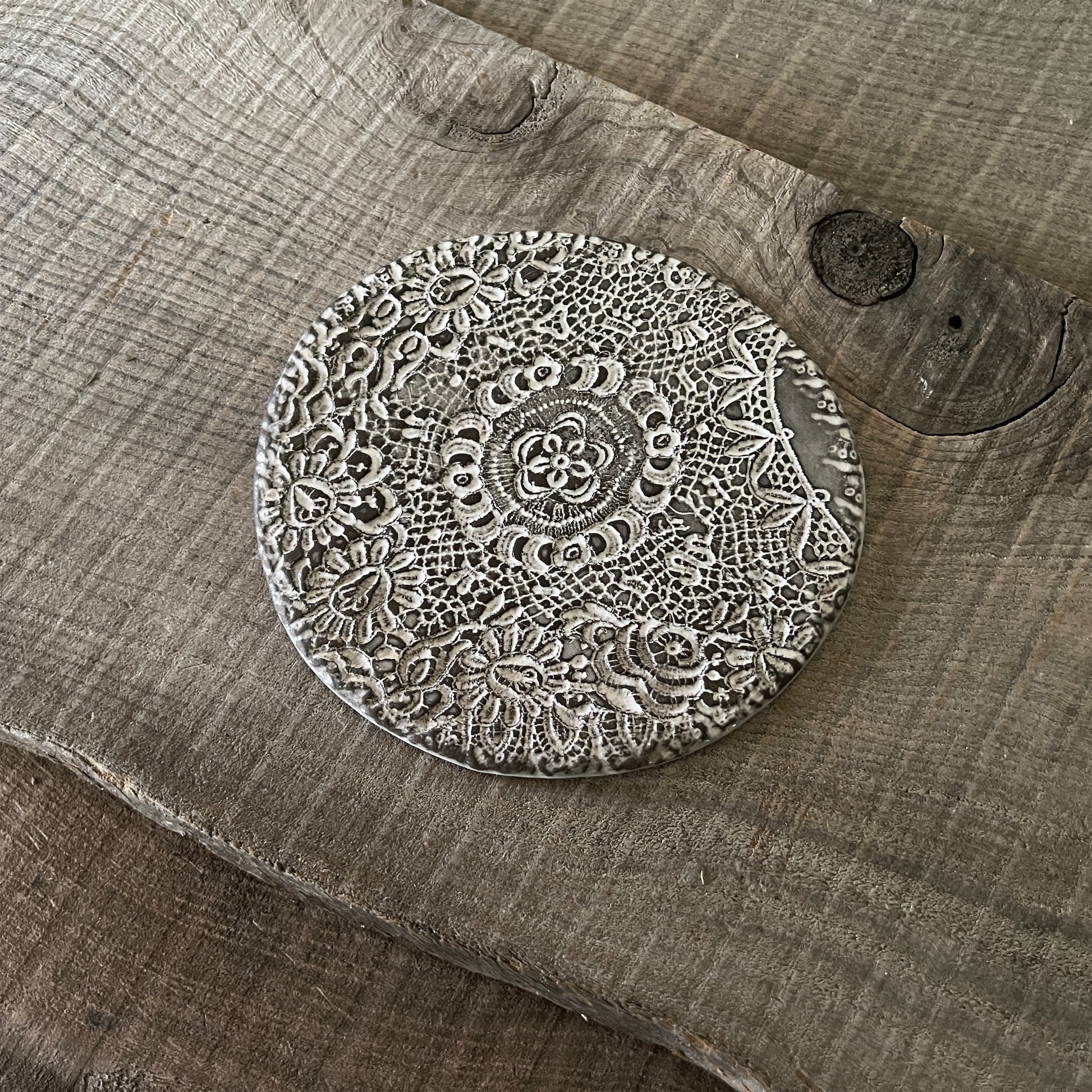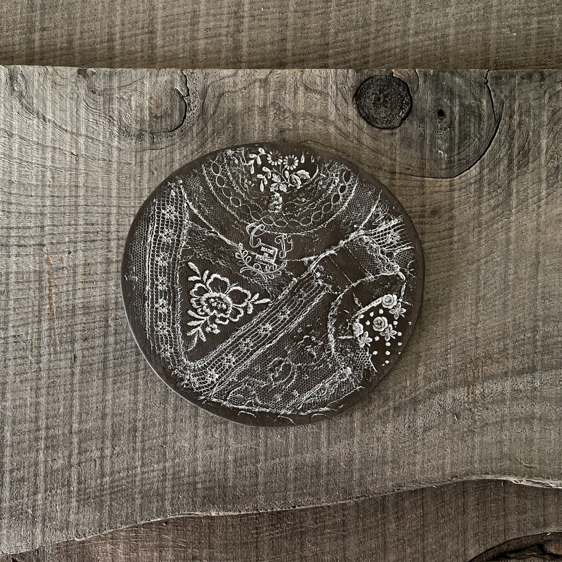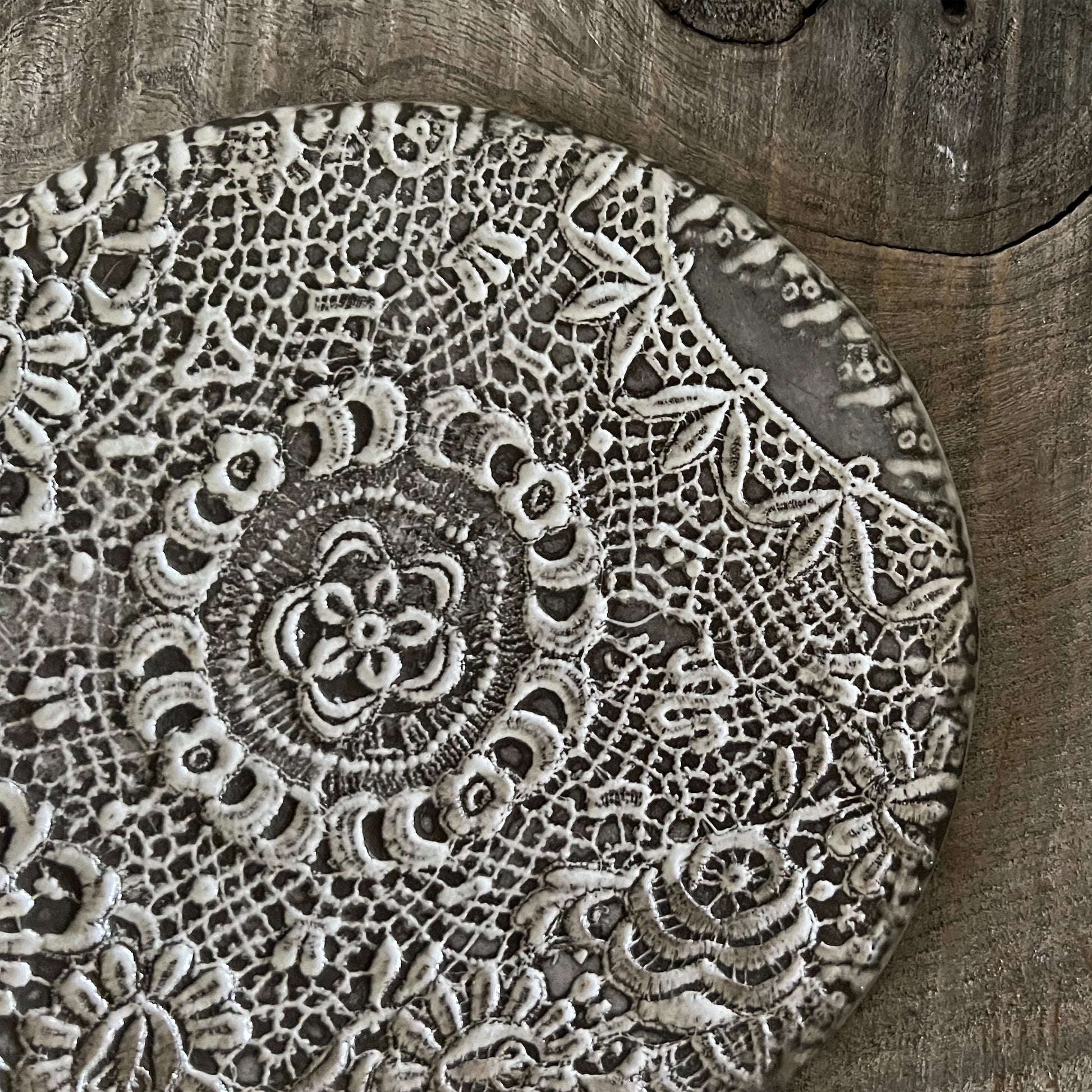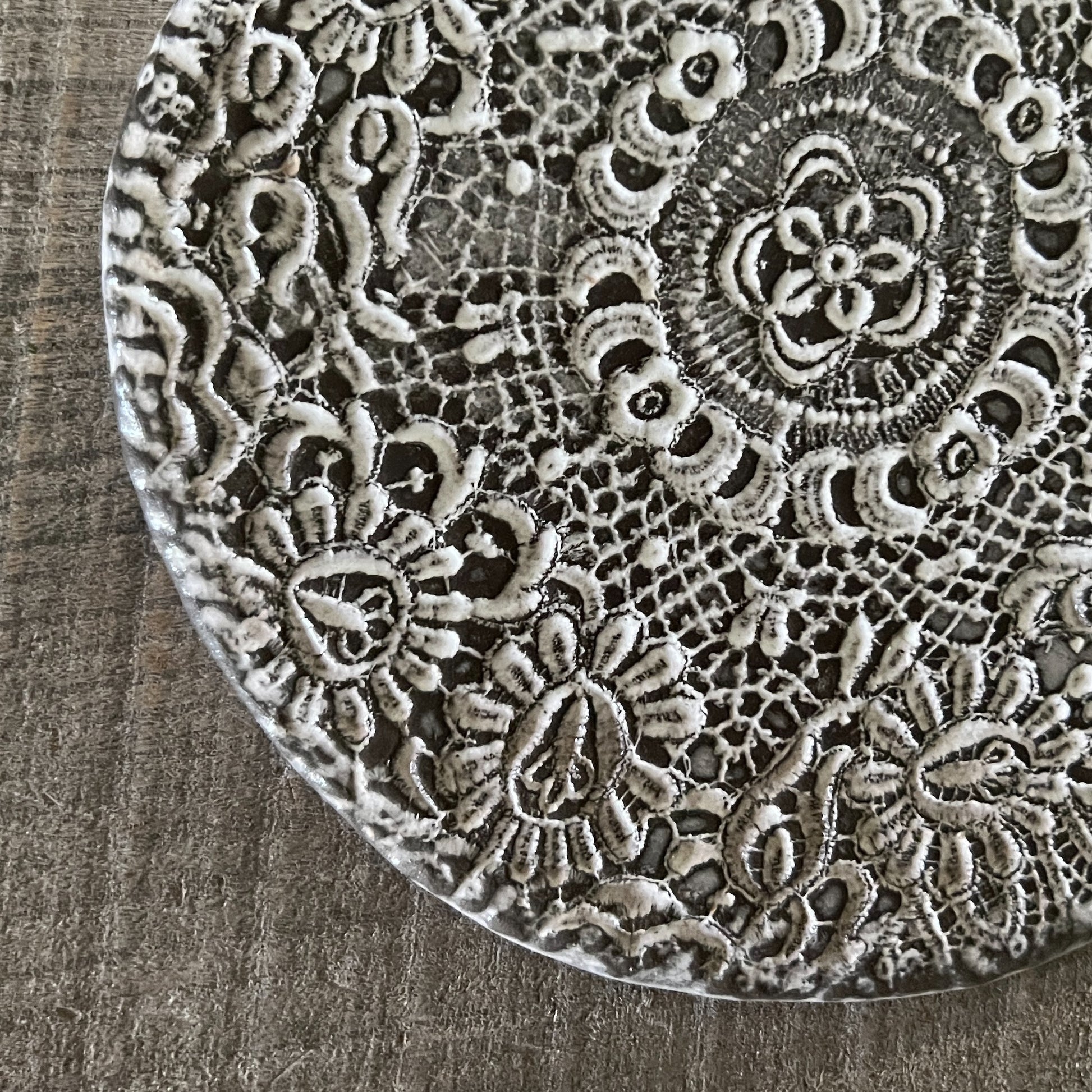 フランス人アーティストのヴァレリー・カサドが独自の手法で制作するセラミック作品。南仏ソルグ島のヴォクリューズに工房を構え、感性の赴くままに手を動かして造形しています。布地のように薄く柔らかなフォルムで、粉砂糖をまとったお菓子のような表情があります。古いものに関心の深い彼女が集めたアンティークのレースやボタンで表現された美しいレリーフが魅力。作家の優しさが伝わってくるような、ひとつとして同じものがない作品です。*手作りのため、形や風合いには個体差があります。