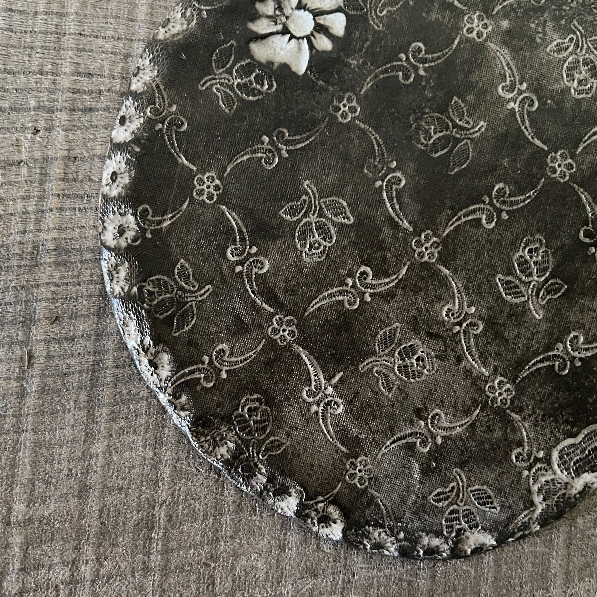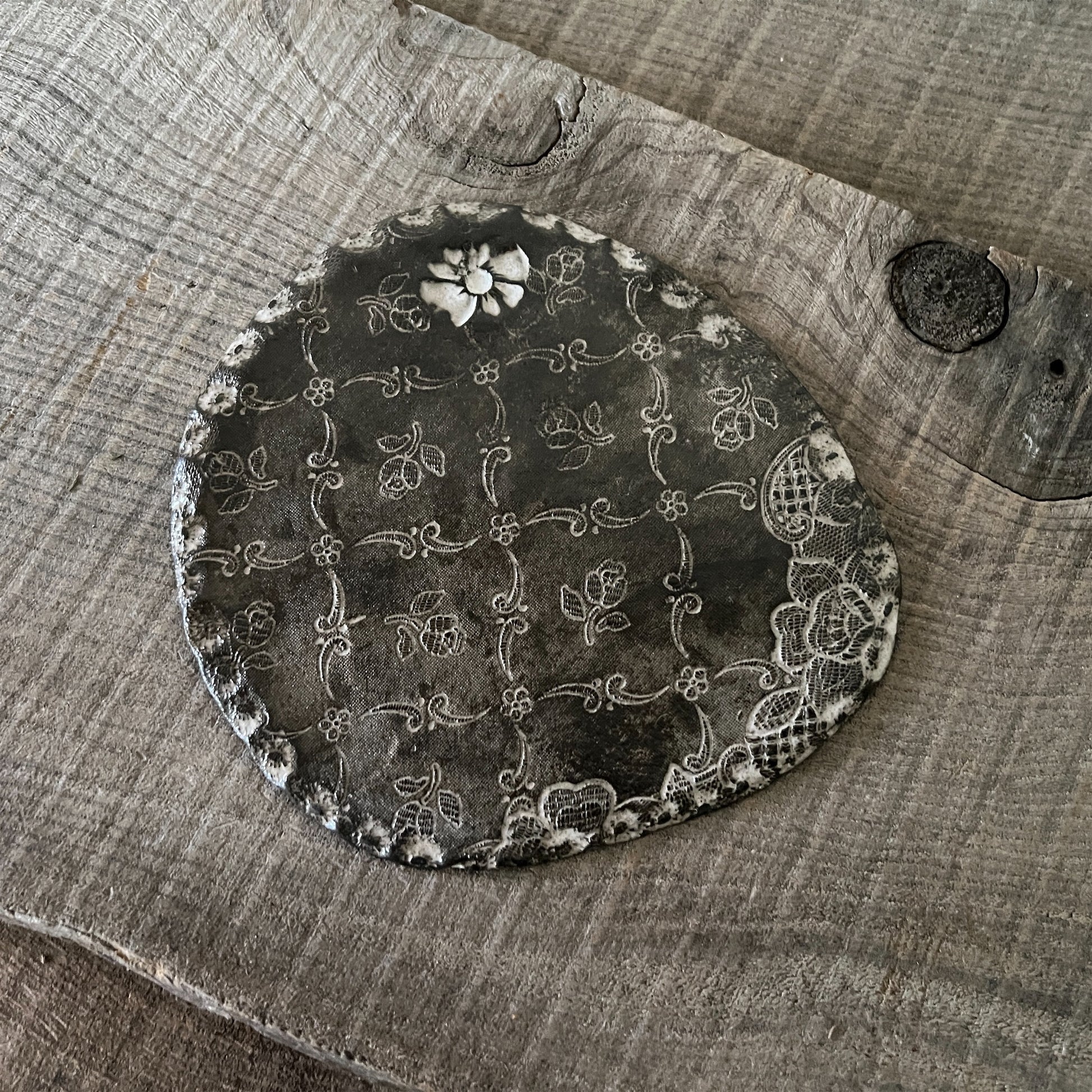 フランス人アーティストのヴァレリー・カサドが独自の手法で制作するセラミック作品。南仏ソルグ島のヴォクリューズに工房を構え、感性の赴くままに手を動かして造形しています。布地のように薄く柔らかなフォルムで、粉砂糖をまとったお菓子のような表情があります。古いものに関心の深い彼女が集めたアンティークのレースやボタンで表現された美しいレリーフが魅力。作家の優しさが伝わってくるような、ひとつとして同じものがない作品です。*手作りのため、形や風合いには個体差があります。