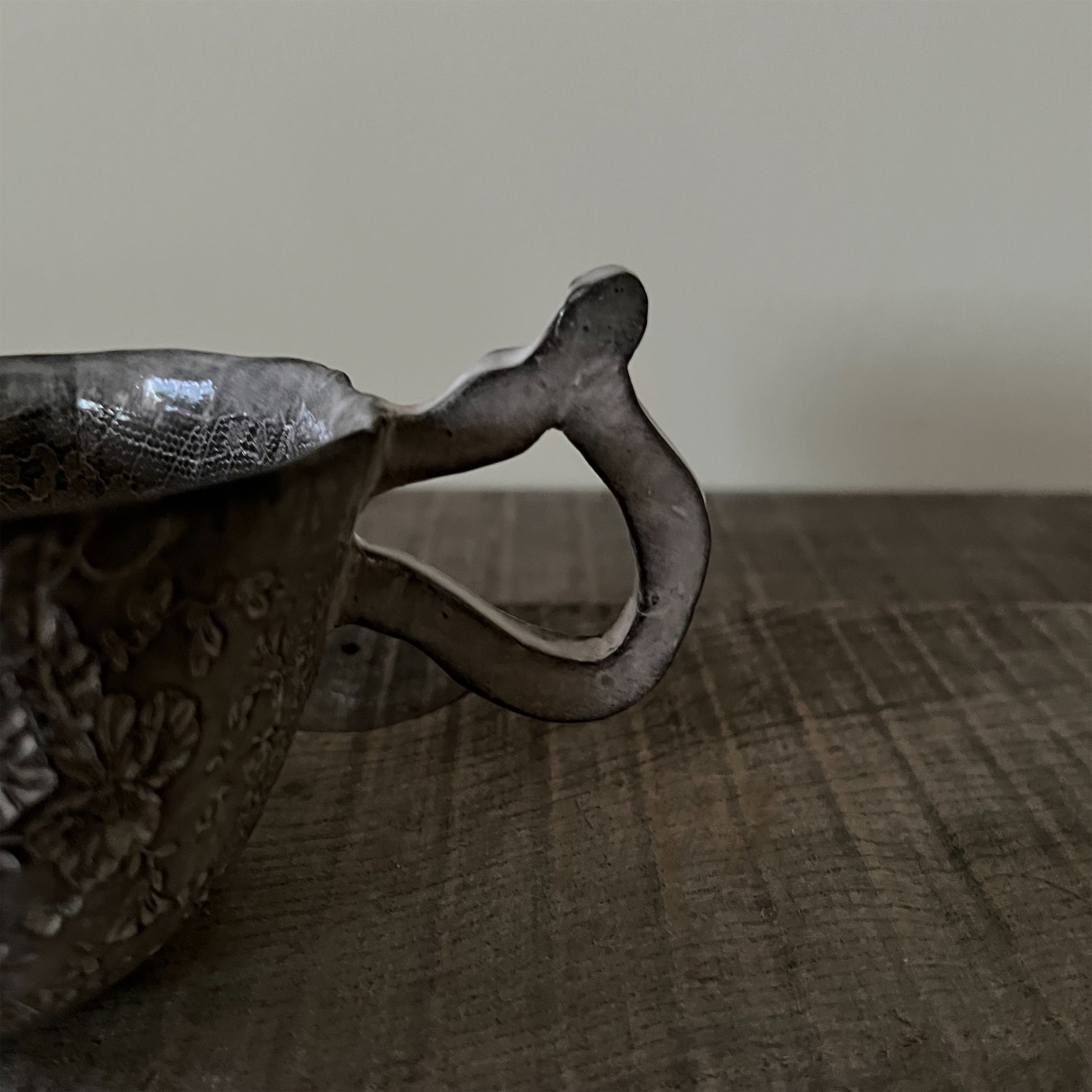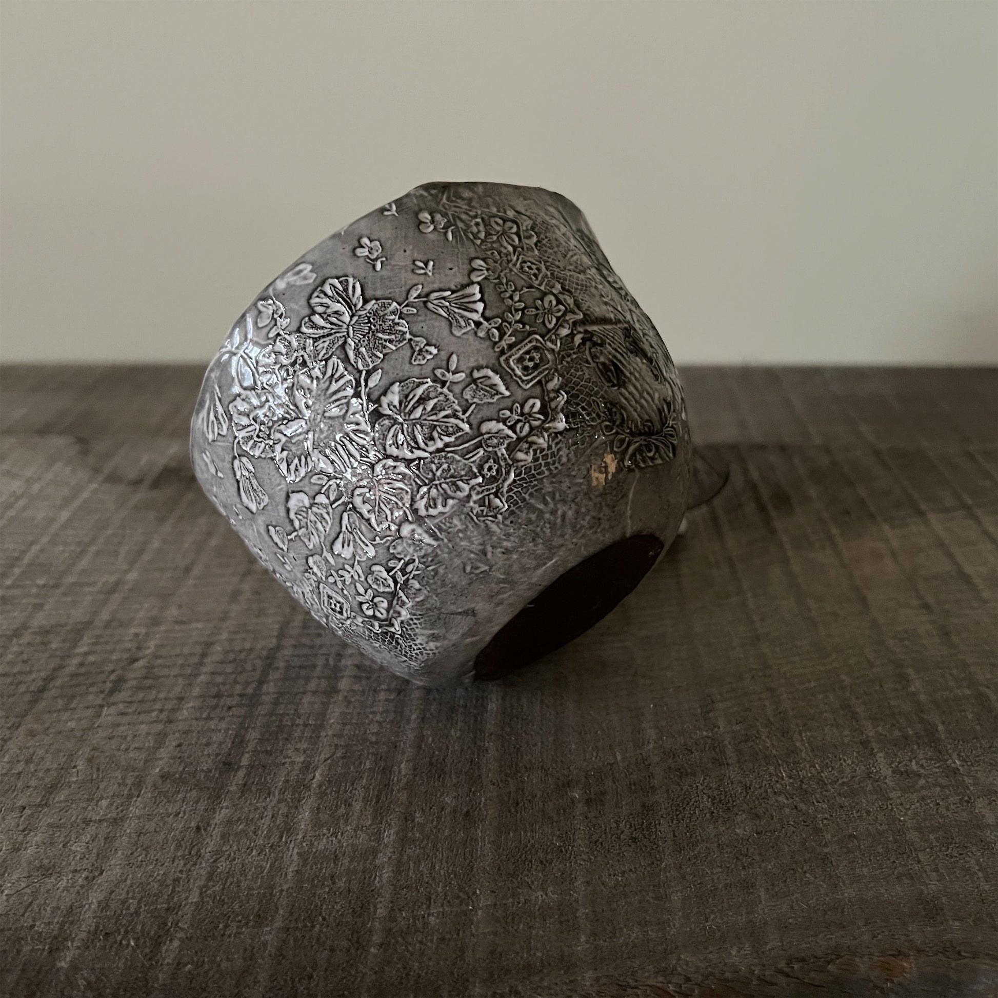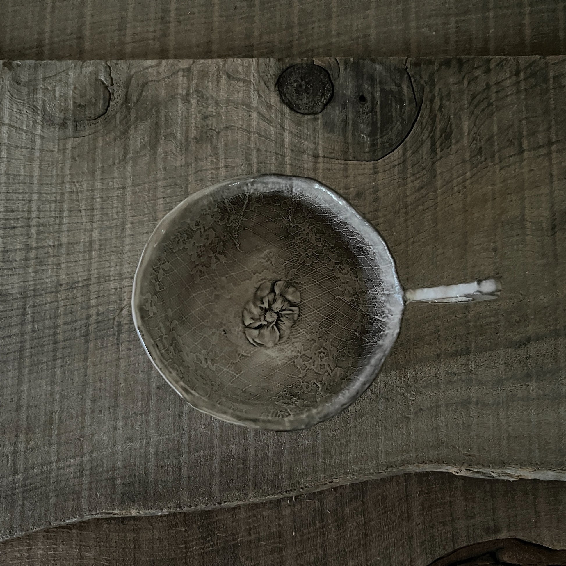 フランス人アーティストのヴァレリー・カサドが独自の手法で制作するセラミック作品。南仏ソルグ島のヴォクリューズに工房を構え、感性の赴くままに手を動かして造形しています。布地のように薄く柔らかなフォルムで、粉砂糖をまとったお菓子のような表情があります。古いものに関心の深い彼女が集めたアンティークのレースやボタンで表現された美しいレリーフが魅力。作家の優しさが伝わってくるような、ひとつとして同じものがない作品です。*手作りのため、形や風合いには個体差があります。