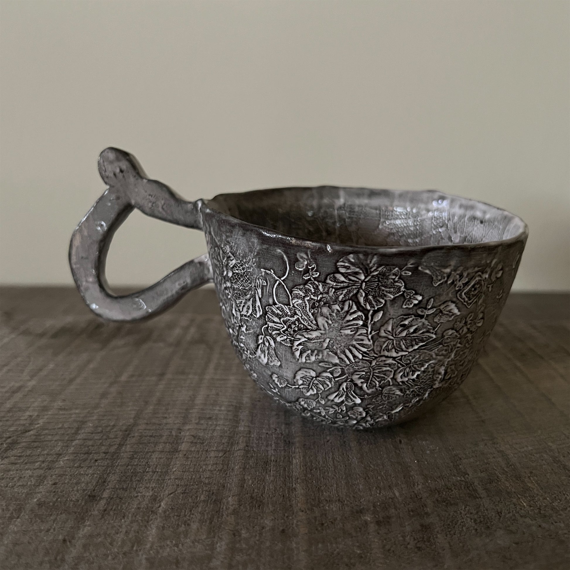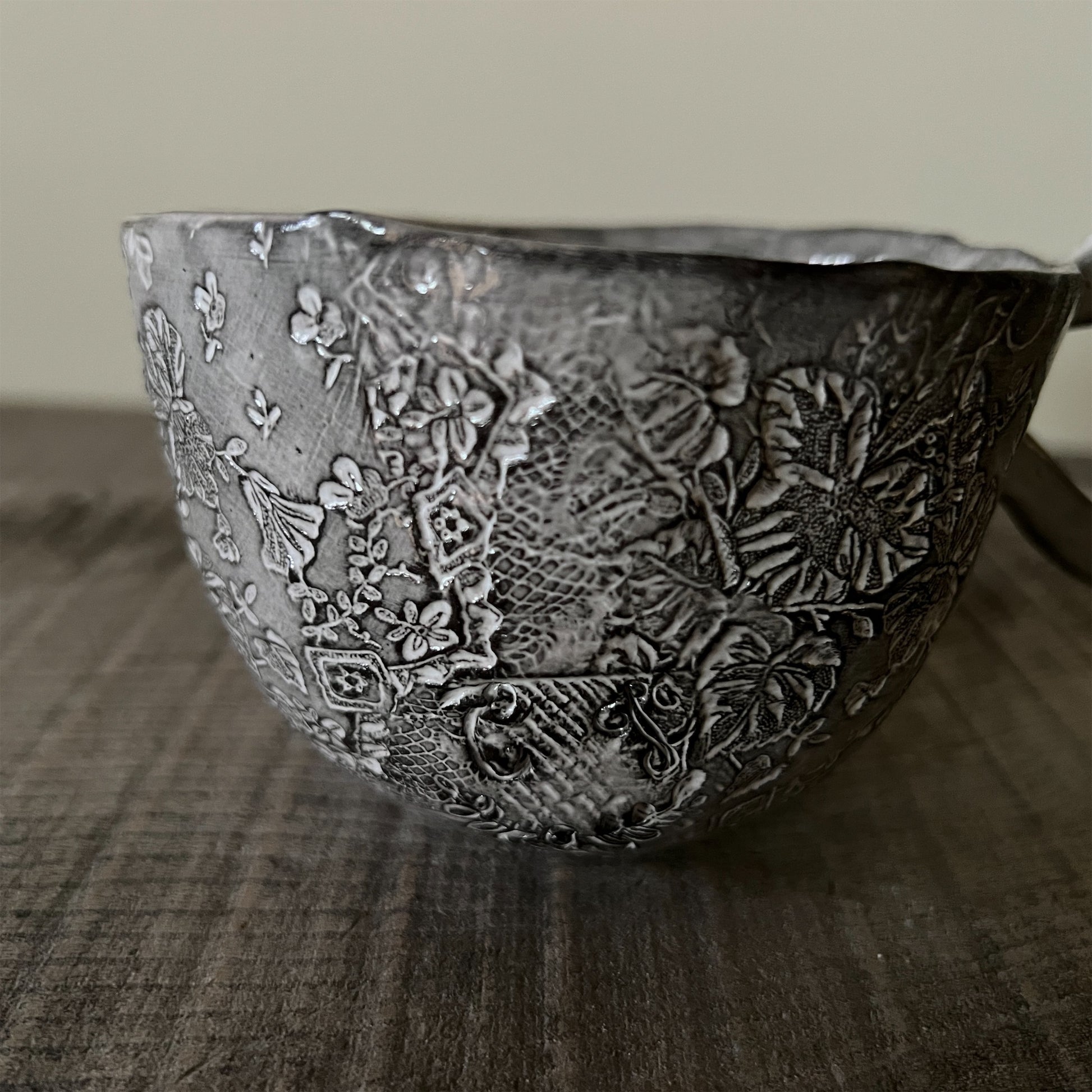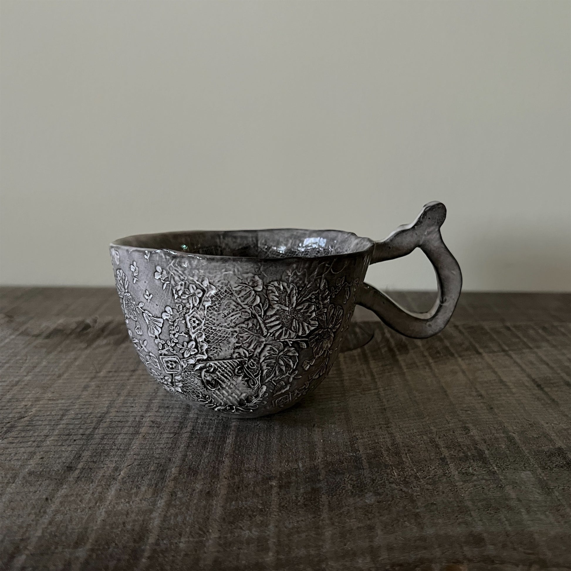 フランス人アーティストのヴァレリー・カサドが独自の手法で制作するセラミック作品。南仏ソルグ島のヴォクリューズに工房を構え、感性の赴くままに手を動かして造形しています。布地のように薄く柔らかなフォルムで、粉砂糖をまとったお菓子のような表情があります。古いものに関心の深い彼女が集めたアンティークのレースやボタンで表現された美しいレリーフが魅力。作家の優しさが伝わってくるような、ひとつとして同じものがない作品です。*手作りのため、形や風合いには個体差があります。