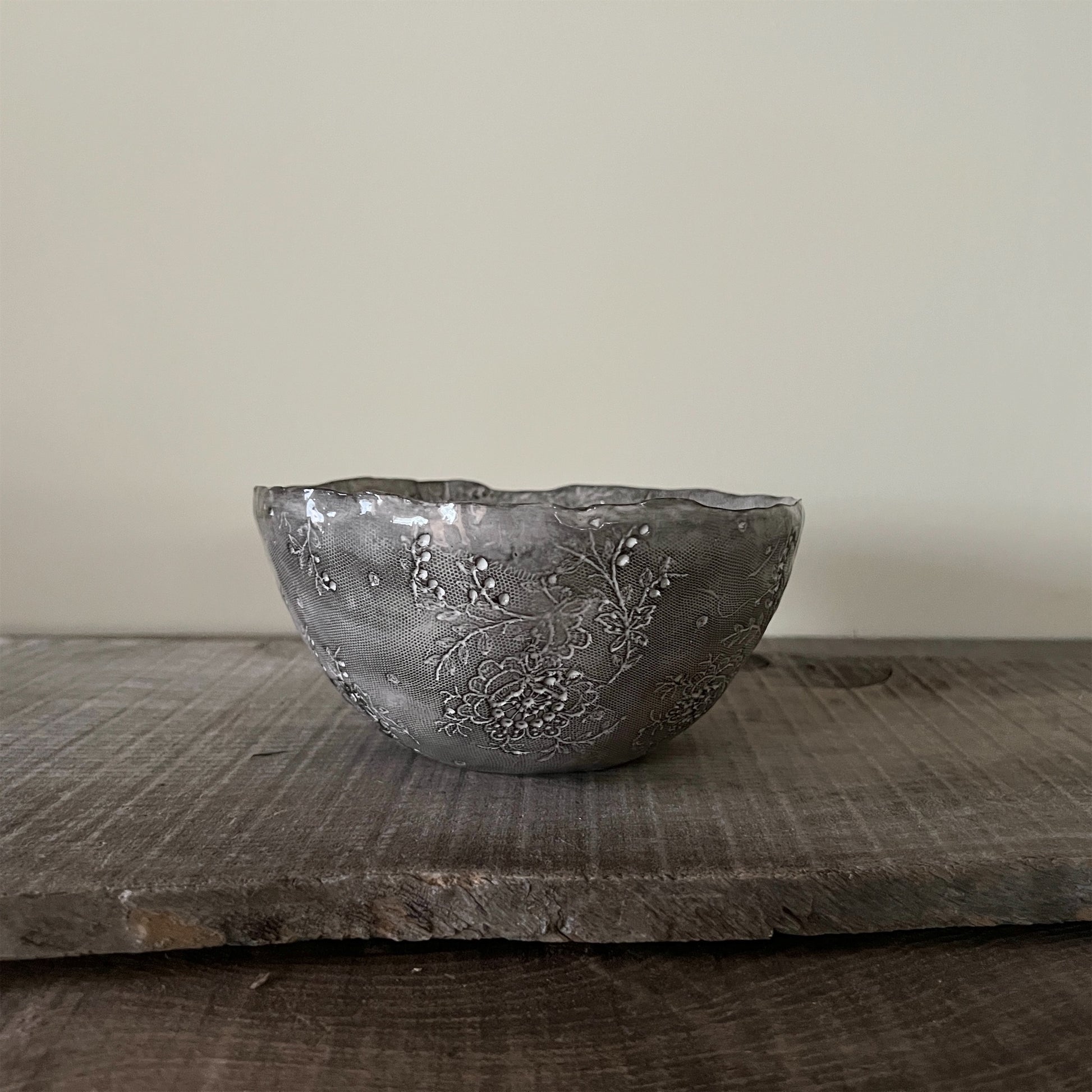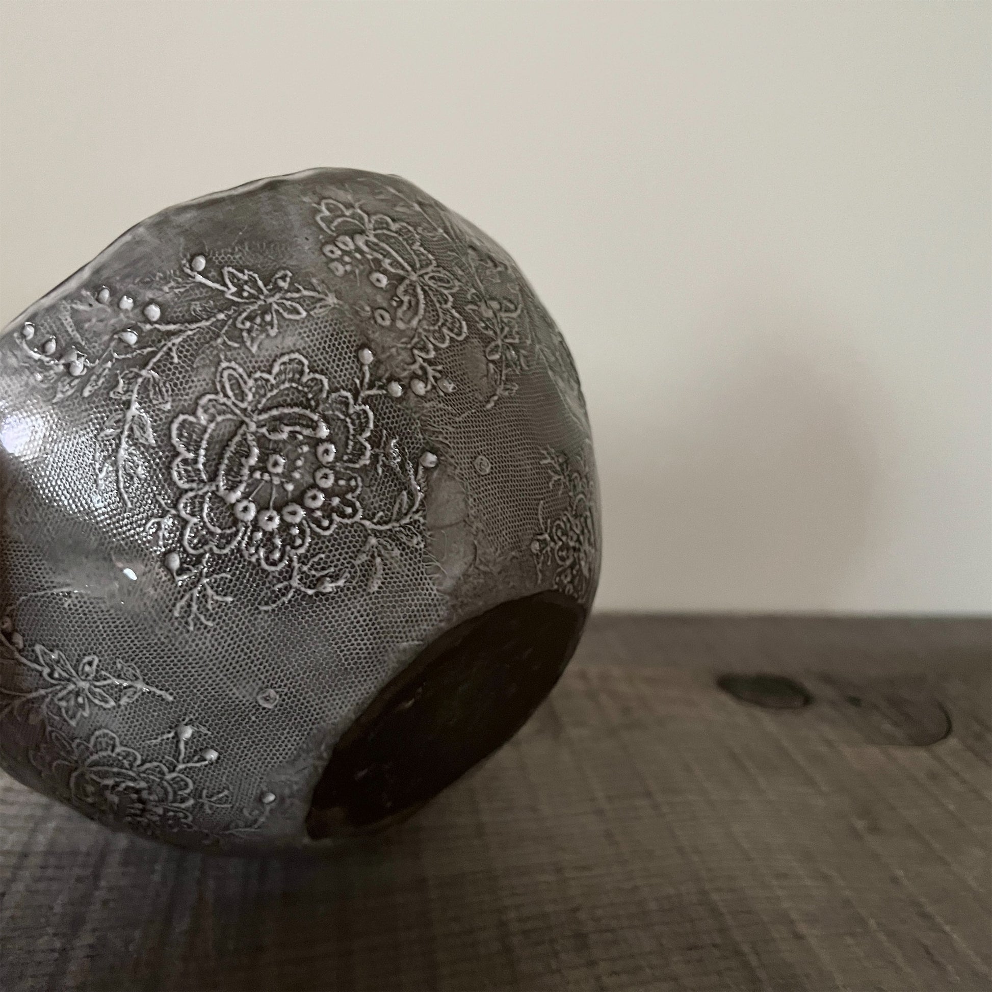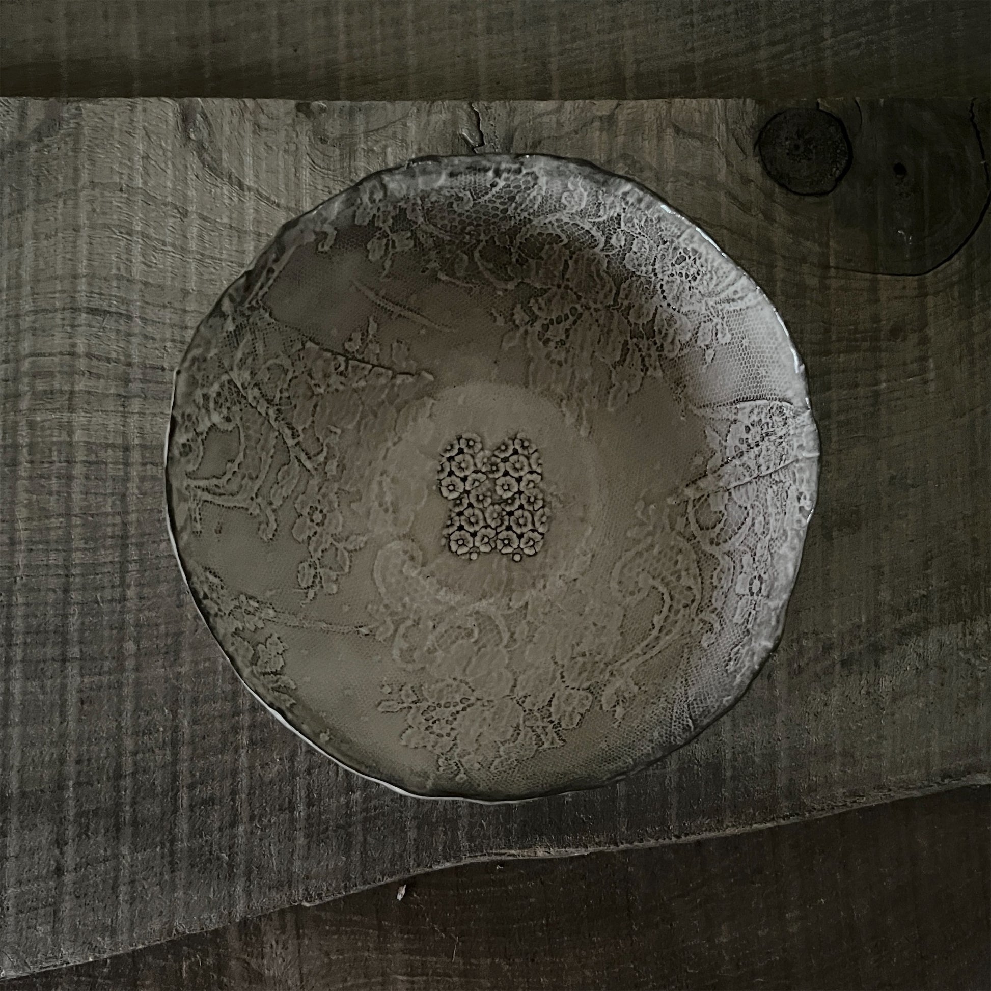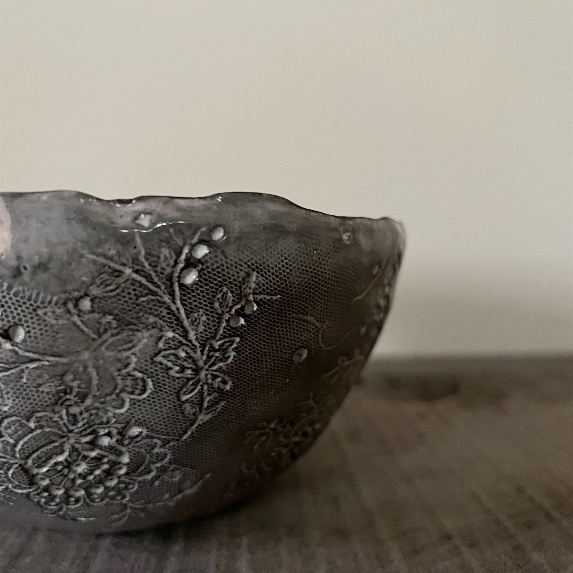 フランス人アーティストのヴァレリー・カサドが独自の手法で制作するセラミック作品。南仏ソルグ島のヴォクリューズに工房を構え、感性の赴くままに手を動かして造形しています。布地のように薄く柔らかなフォルムで、粉砂糖をまとったお菓子のような表情があります。古いものに関心の深い彼女が集めたアンティークのレースやボタンで表現された美しいレリーフが魅力。作家の優しさが伝わってくるような、ひとつとして同じものがない作品です。*手作りのため、形や風合いには個体差があります。