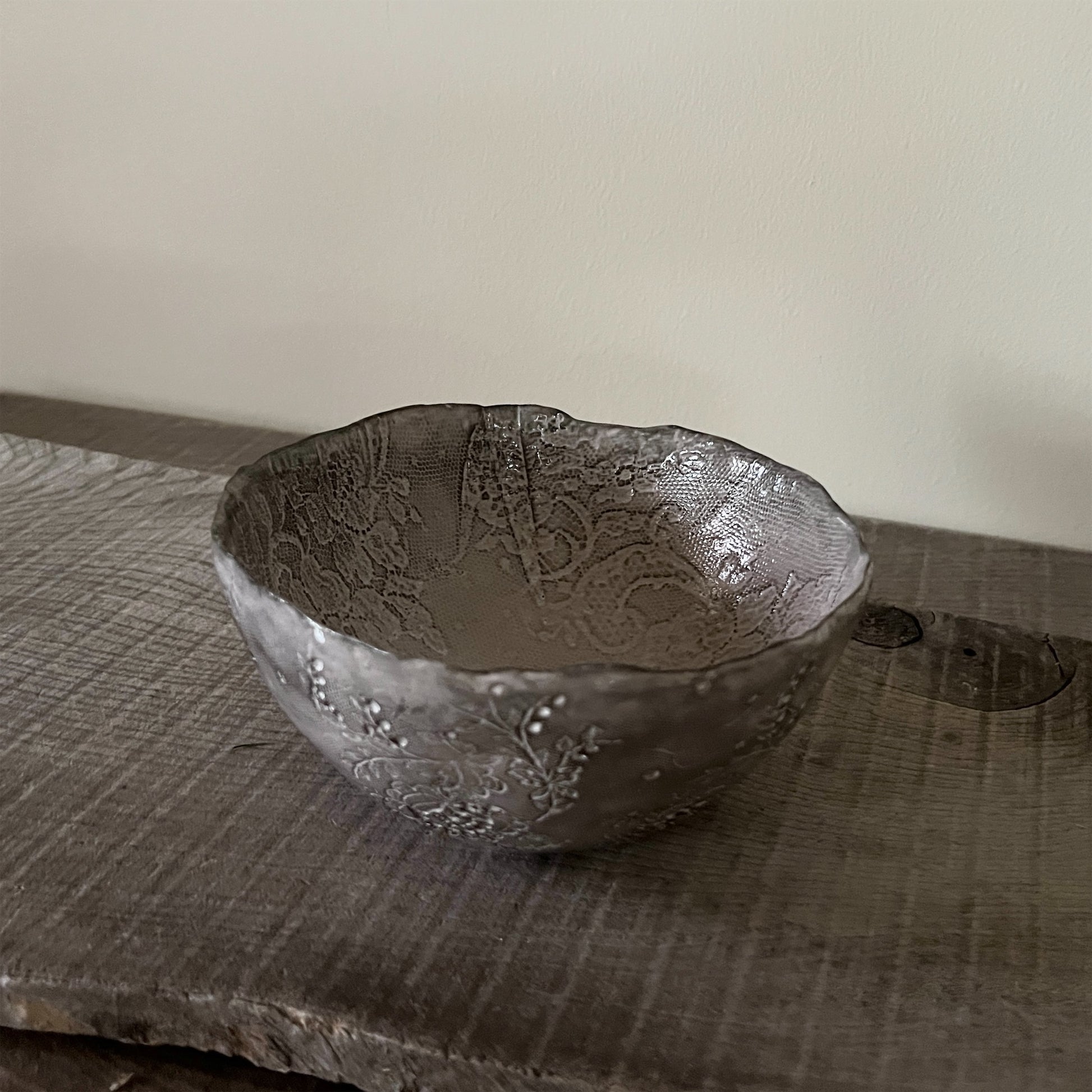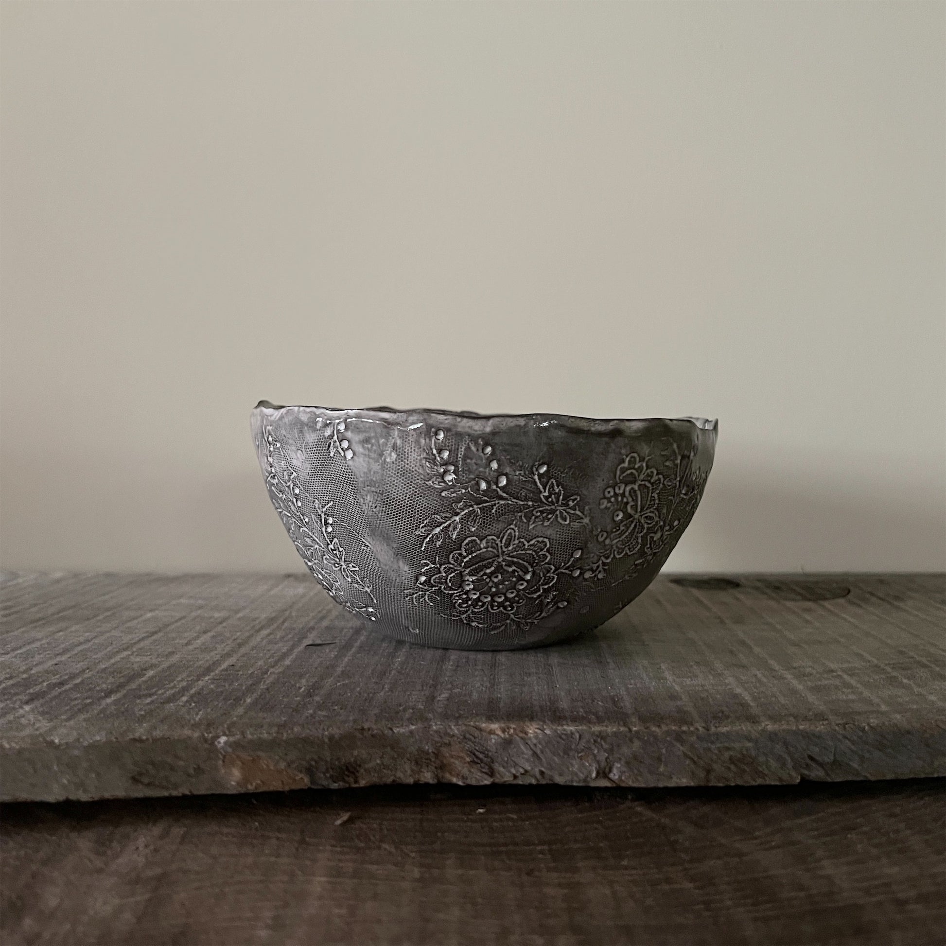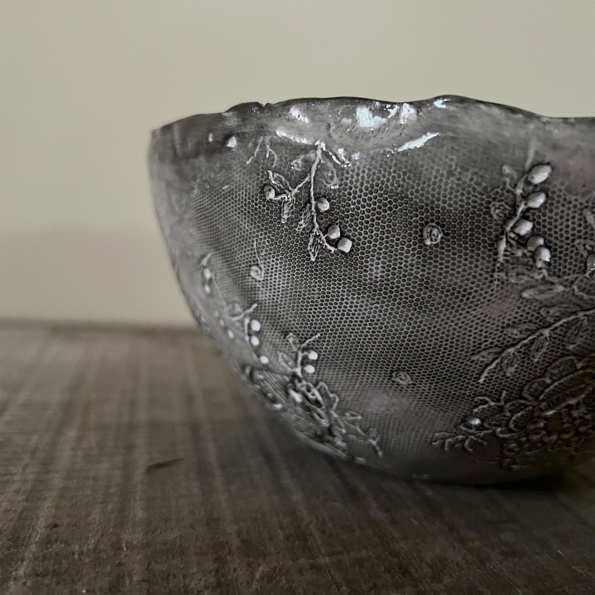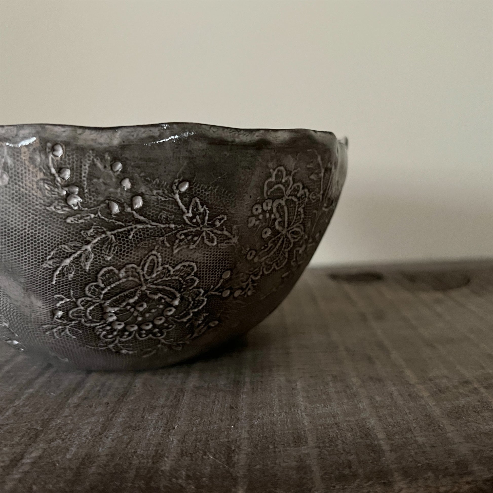 フランス人アーティストのヴァレリー・カサドが独自の手法で制作するセラミック作品。南仏ソルグ島のヴォクリューズに工房を構え、感性の赴くままに手を動かして造形しています。布地のように薄く柔らかなフォルムで、粉砂糖をまとったお菓子のような表情があります。古いものに関心の深い彼女が集めたアンティークのレースやボタンで表現された美しいレリーフが魅力。作家の優しさが伝わってくるような、ひとつとして同じものがない作品です。*手作りのため、形や風合いには個体差があります。