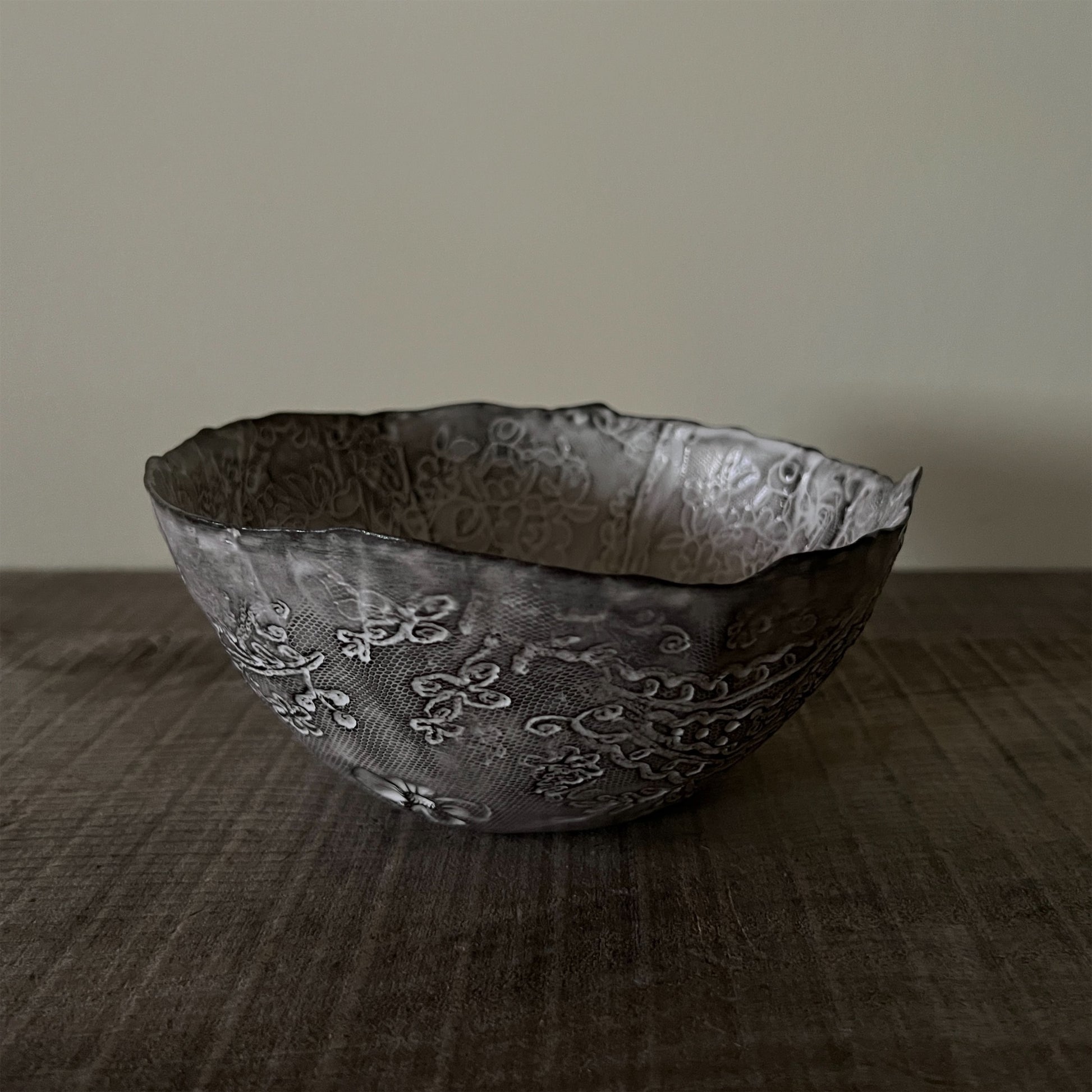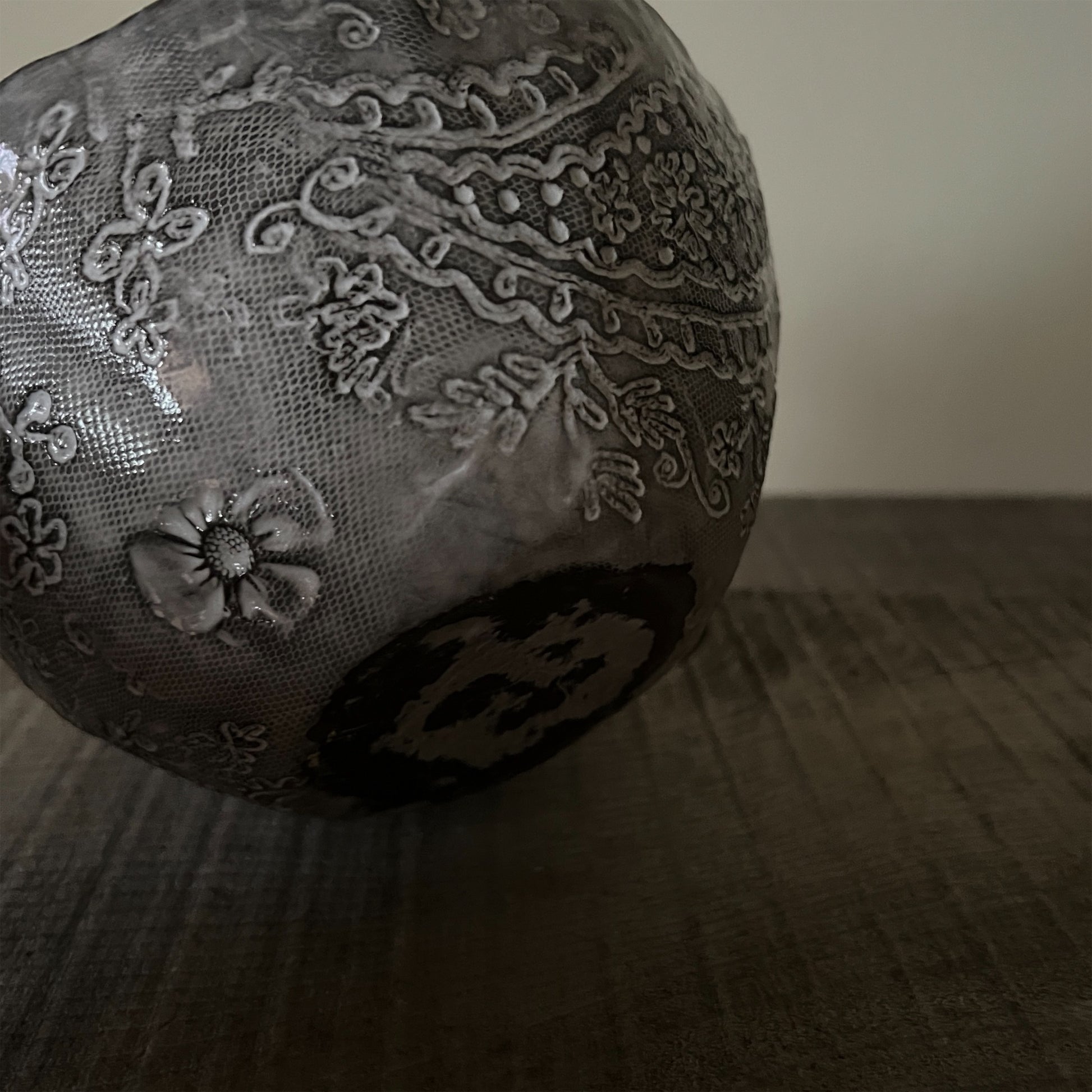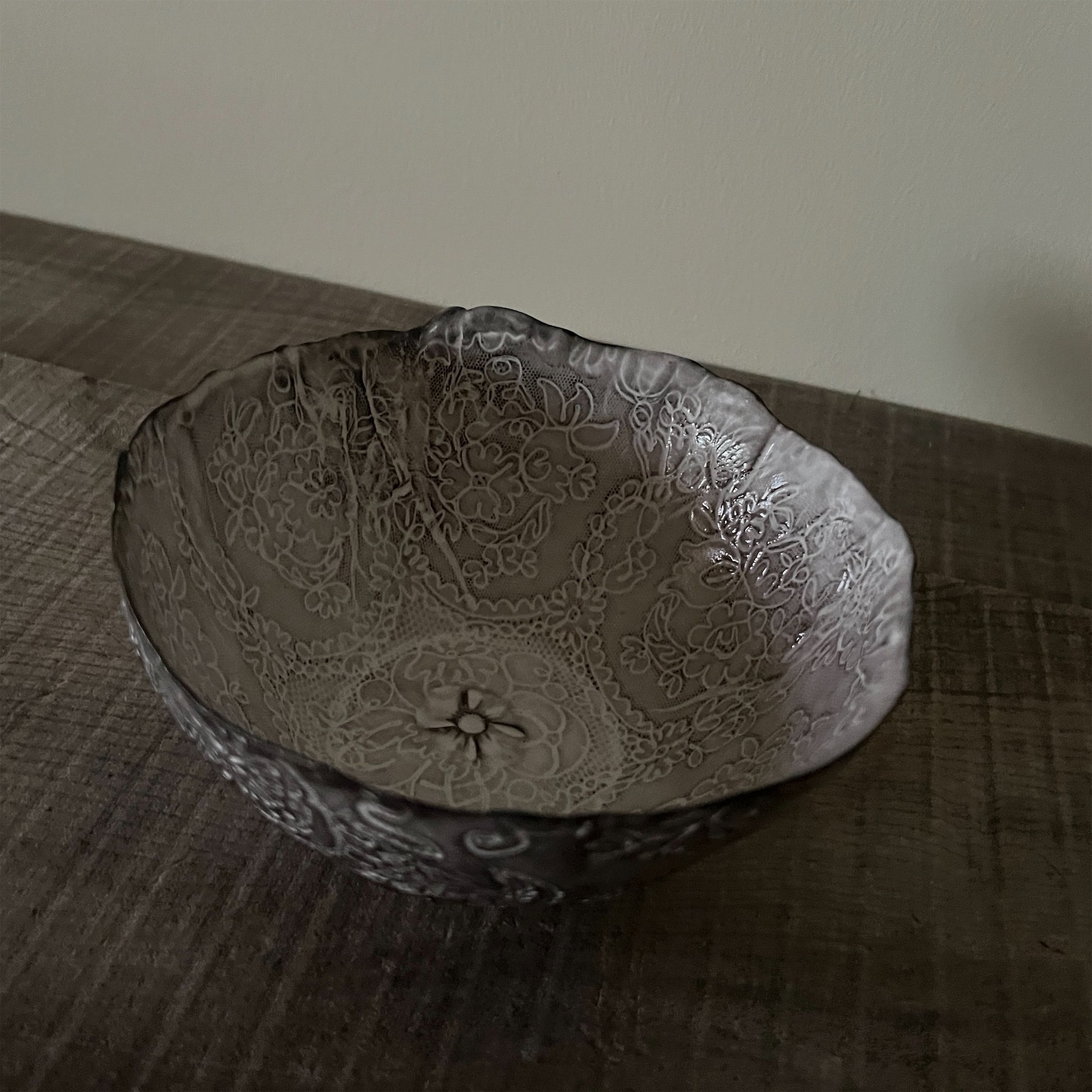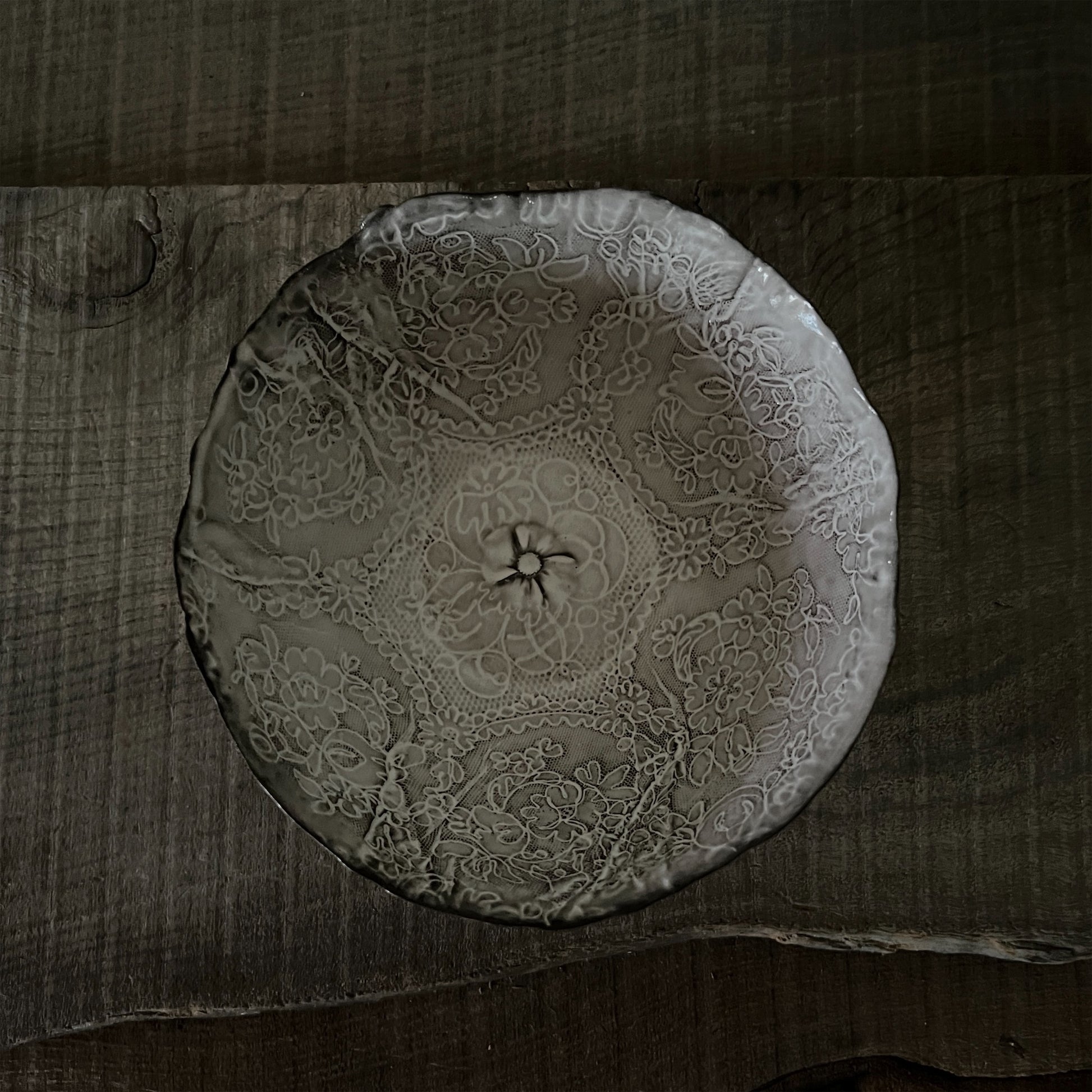 フランス人アーティストのヴァレリー・カサドが独自の手法で制作するセラミック作品。南仏ソルグ島のヴォクリューズに工房を構え、感性の赴くままに手を動かして造形しています。布地のように薄く柔らかなフォルムで、粉砂糖をまとったお菓子のような表情があります。古いものに関心の深い彼女が集めたアンティークのレースやボタンで表現された美しいレリーフが魅力。作家の優しさが伝わってくるような、ひとつとして同じものがない作品です。*手作りのため、形や風合いには個体差があります。