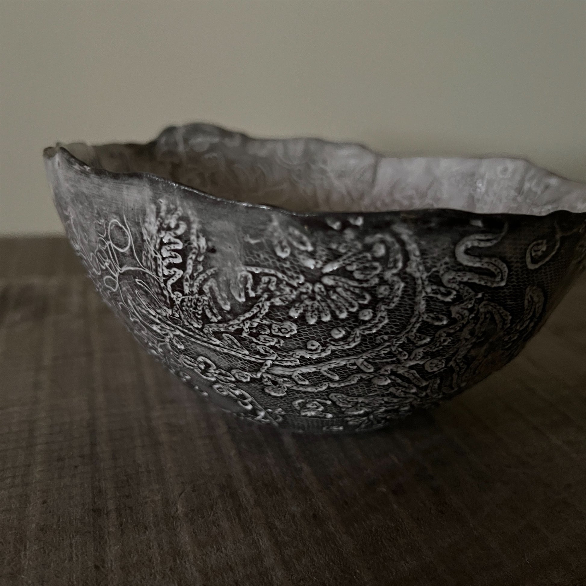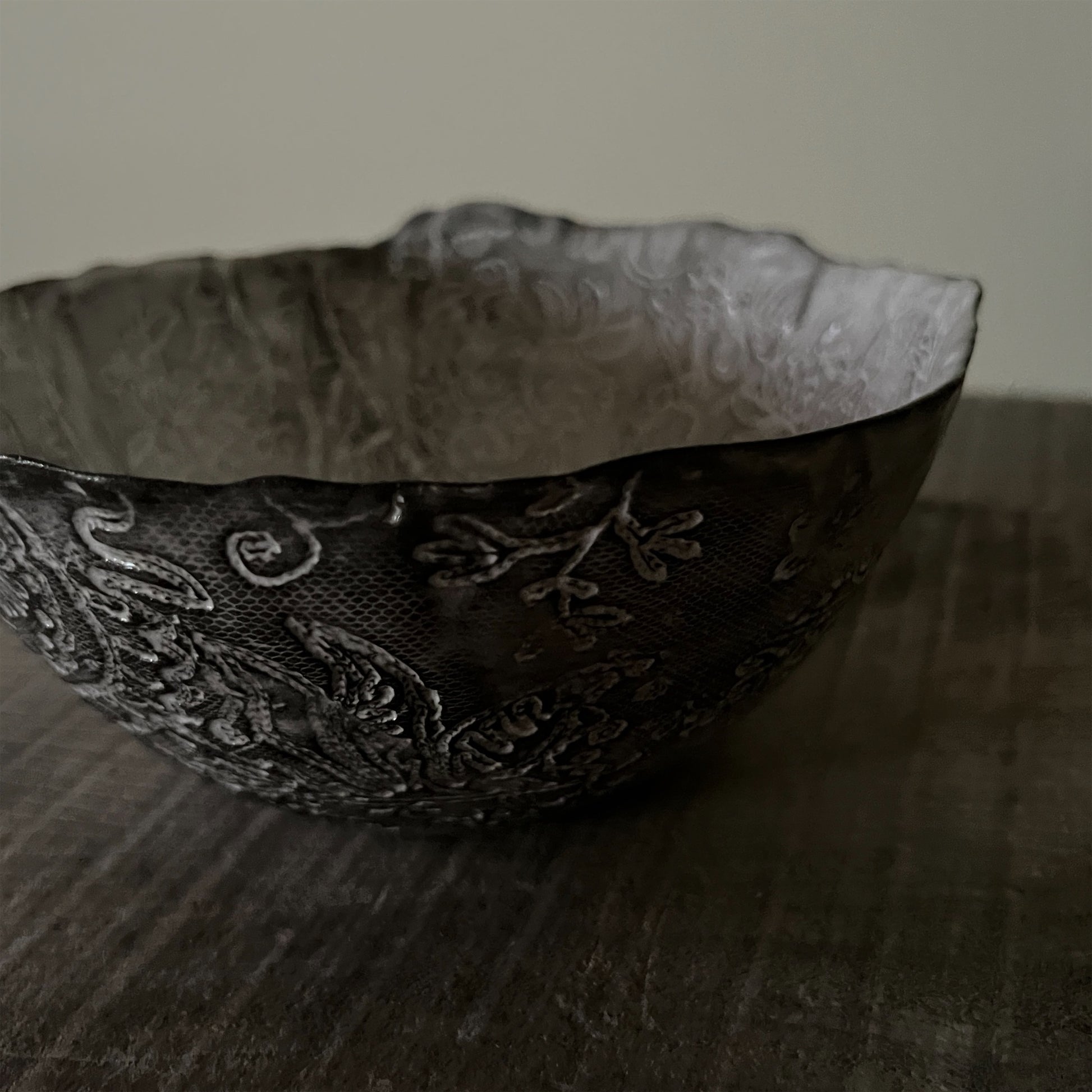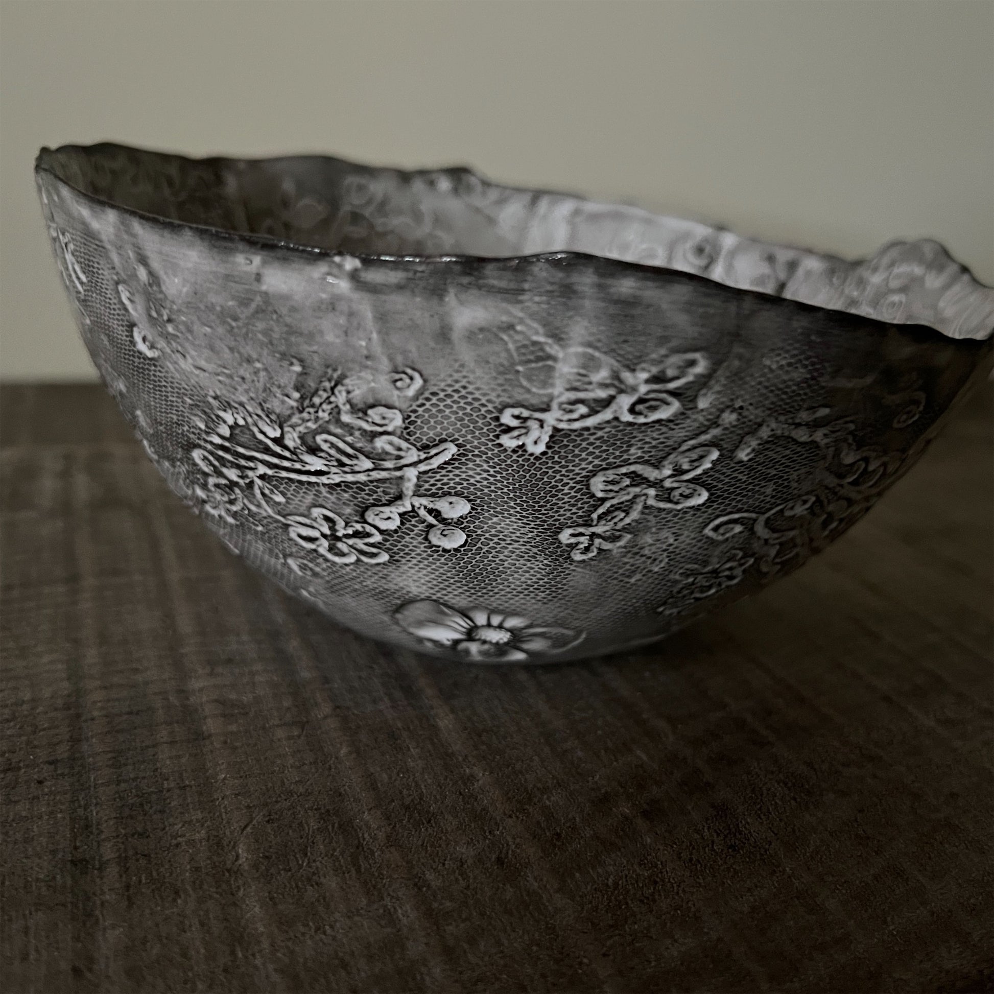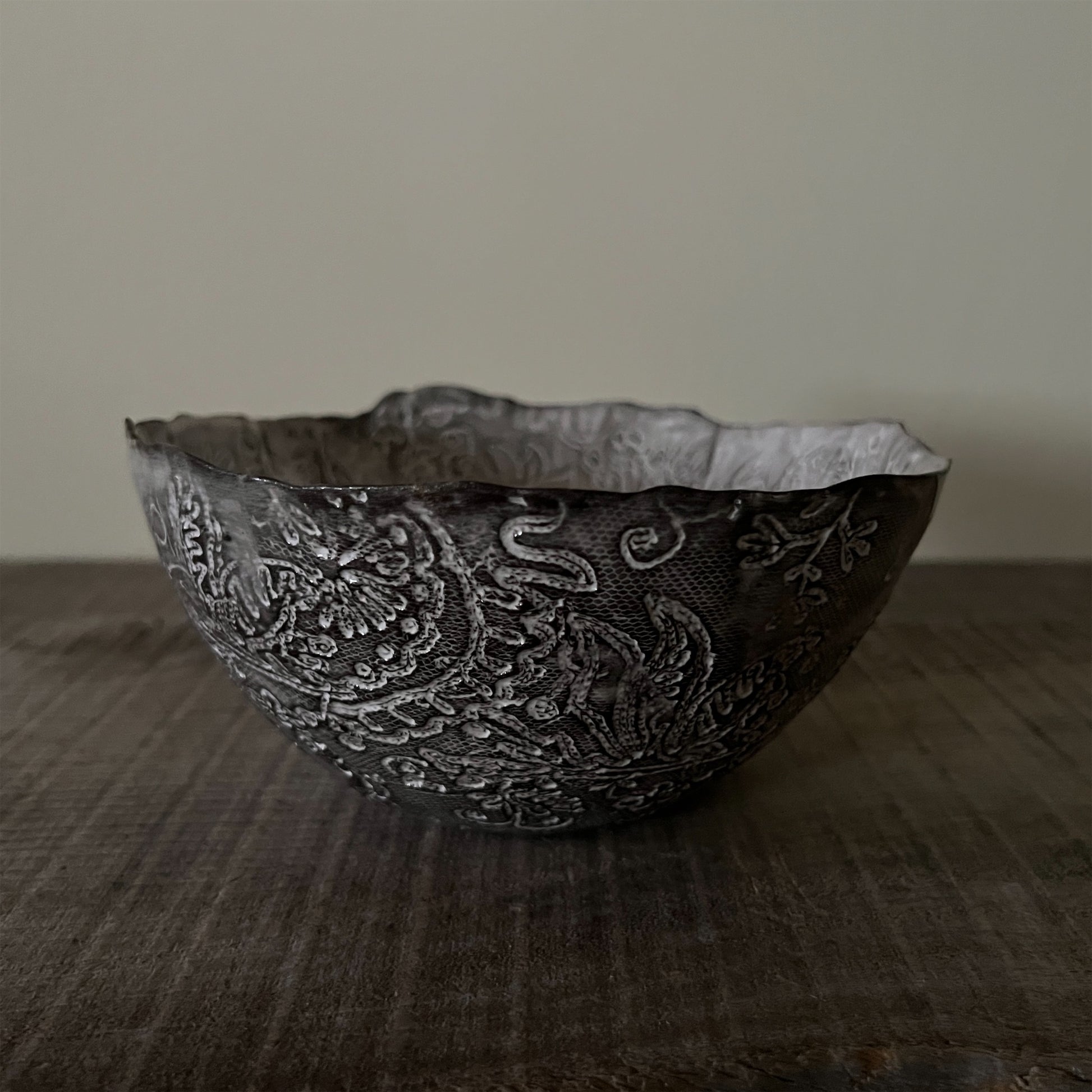 フランス人アーティストのヴァレリー・カサドが独自の手法で制作するセラミック作品。南仏ソルグ島のヴォクリューズに工房を構え、感性の赴くままに手を動かして造形しています。布地のように薄く柔らかなフォルムで、粉砂糖をまとったお菓子のような表情があります。古いものに関心の深い彼女が集めたアンティークのレースやボタンで表現された美しいレリーフが魅力。作家の優しさが伝わってくるような、ひとつとして同じものがない作品です。*手作りのため、形や風合いには個体差があります。