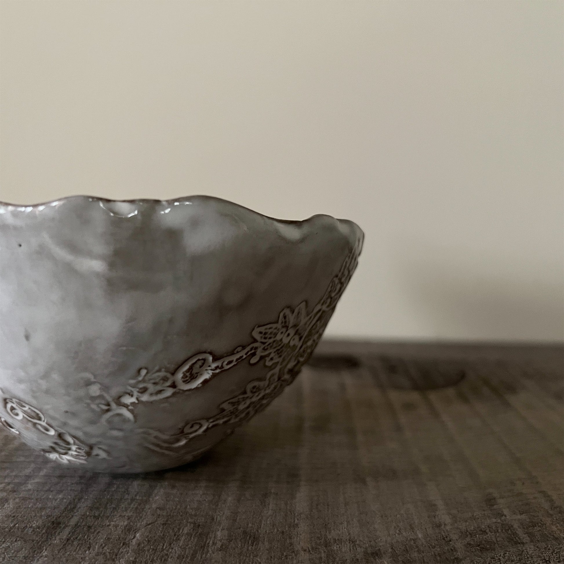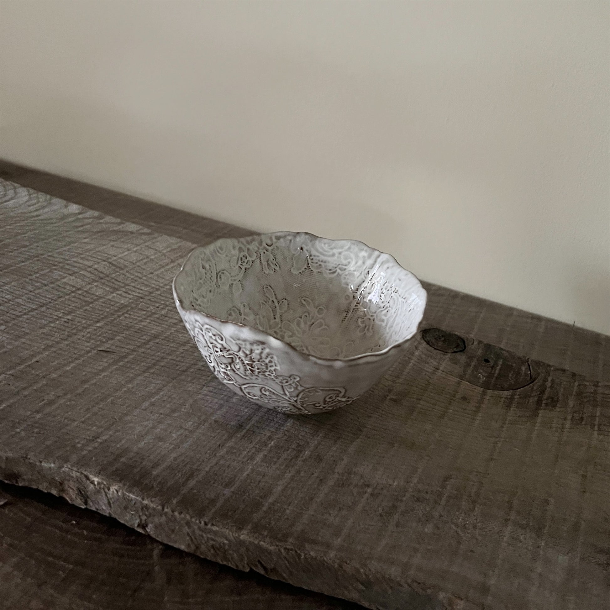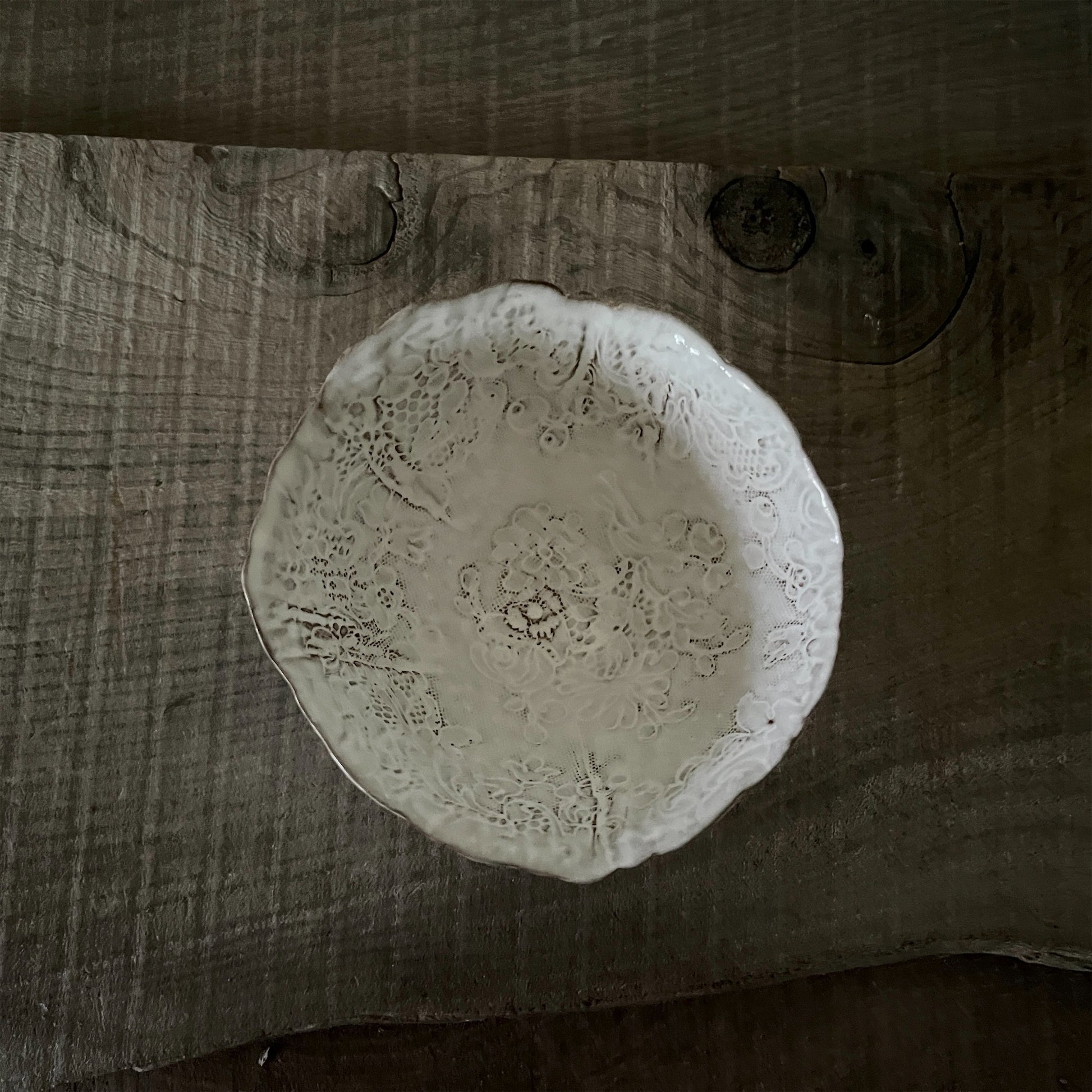 フランス人アーティストのヴァレリー・カサドが独自の手法で制作するセラミック作品。南仏ソルグ島のヴォクリューズに工房を構え、感性の赴くままに手を動かして造形しています。布地のように薄く柔らかなフォルムで、粉砂糖をまとったお菓子のような表情があります。古いものに関心の深い彼女が集めたアンティークのレースやボタンで表現された美しいレリーフが魅力。作家の優しさが伝わってくるような、ひとつとして同じものがない作品です。*手作りのため、形や風合いには個体差があります。