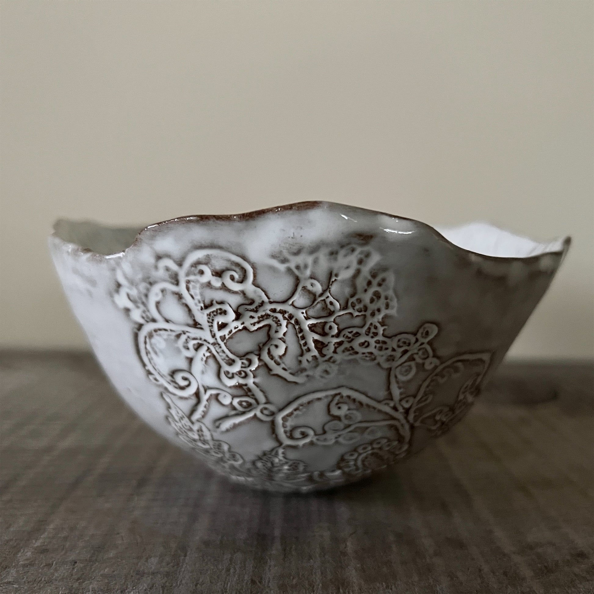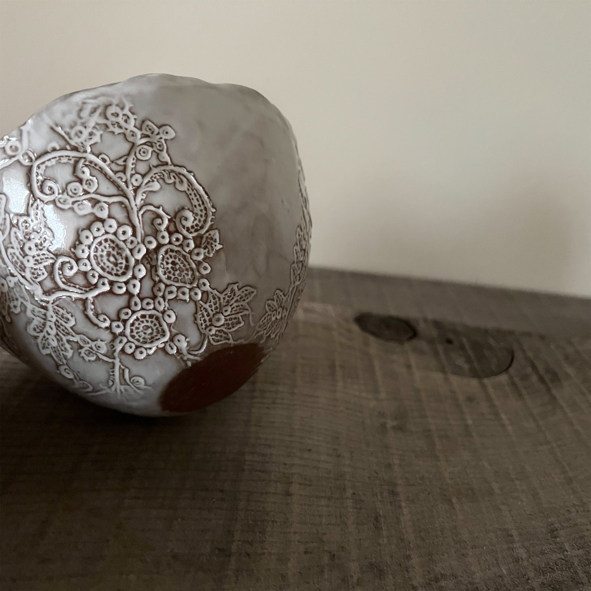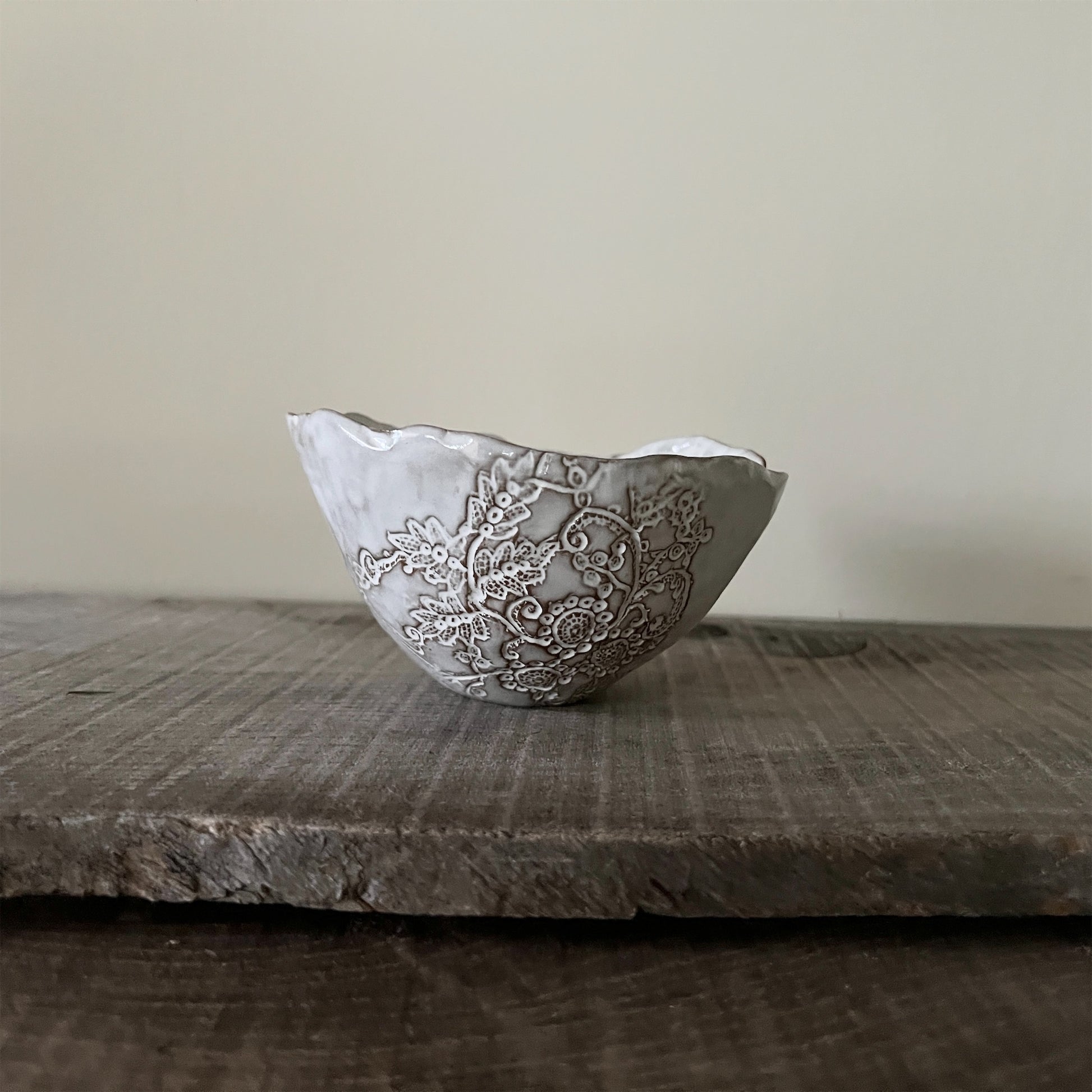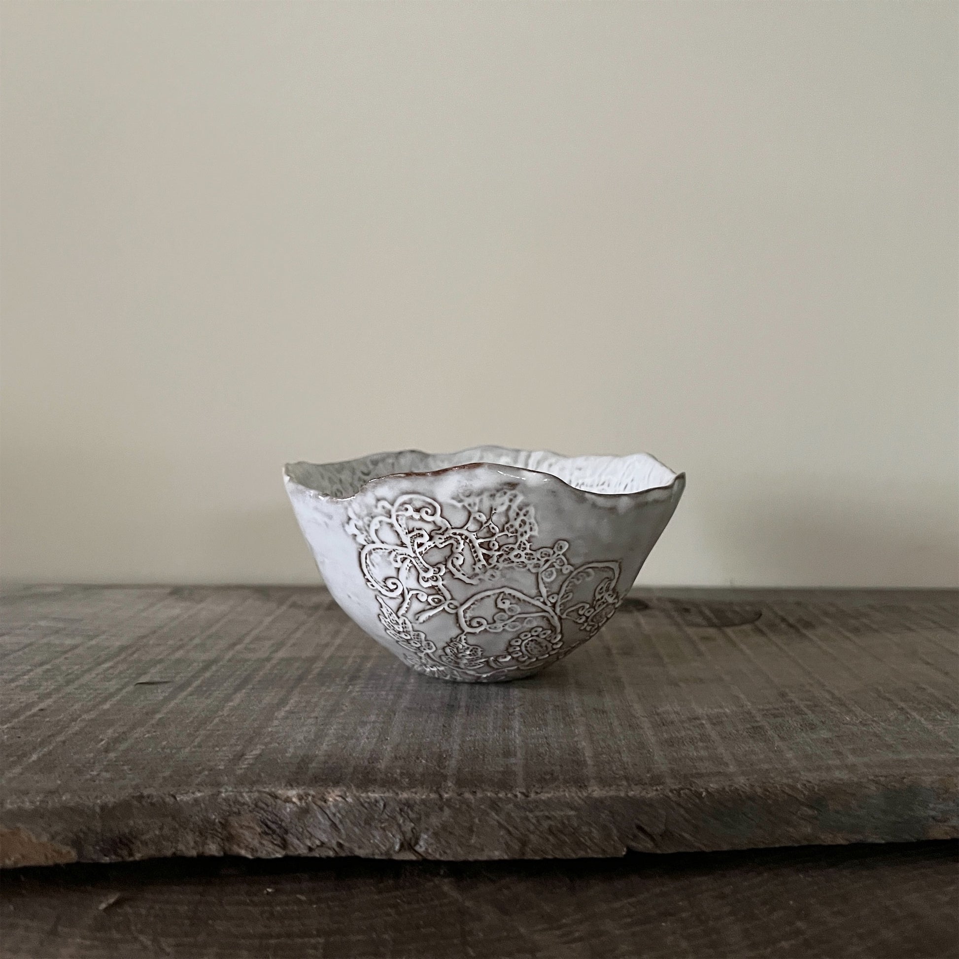 フランス人アーティストのヴァレリー・カサドが独自の手法で制作するセラミック作品。南仏ソルグ島のヴォクリューズに工房を構え、感性の赴くままに手を動かして造形しています。布地のように薄く柔らかなフォルムで、粉砂糖をまとったお菓子のような表情があります。古いものに関心の深い彼女が集めたアンティークのレースやボタンで表現された美しいレリーフが魅力。作家の優しさが伝わってくるような、ひとつとして同じものがない作品です。*手作りのため、形や風合いには個体差があります。