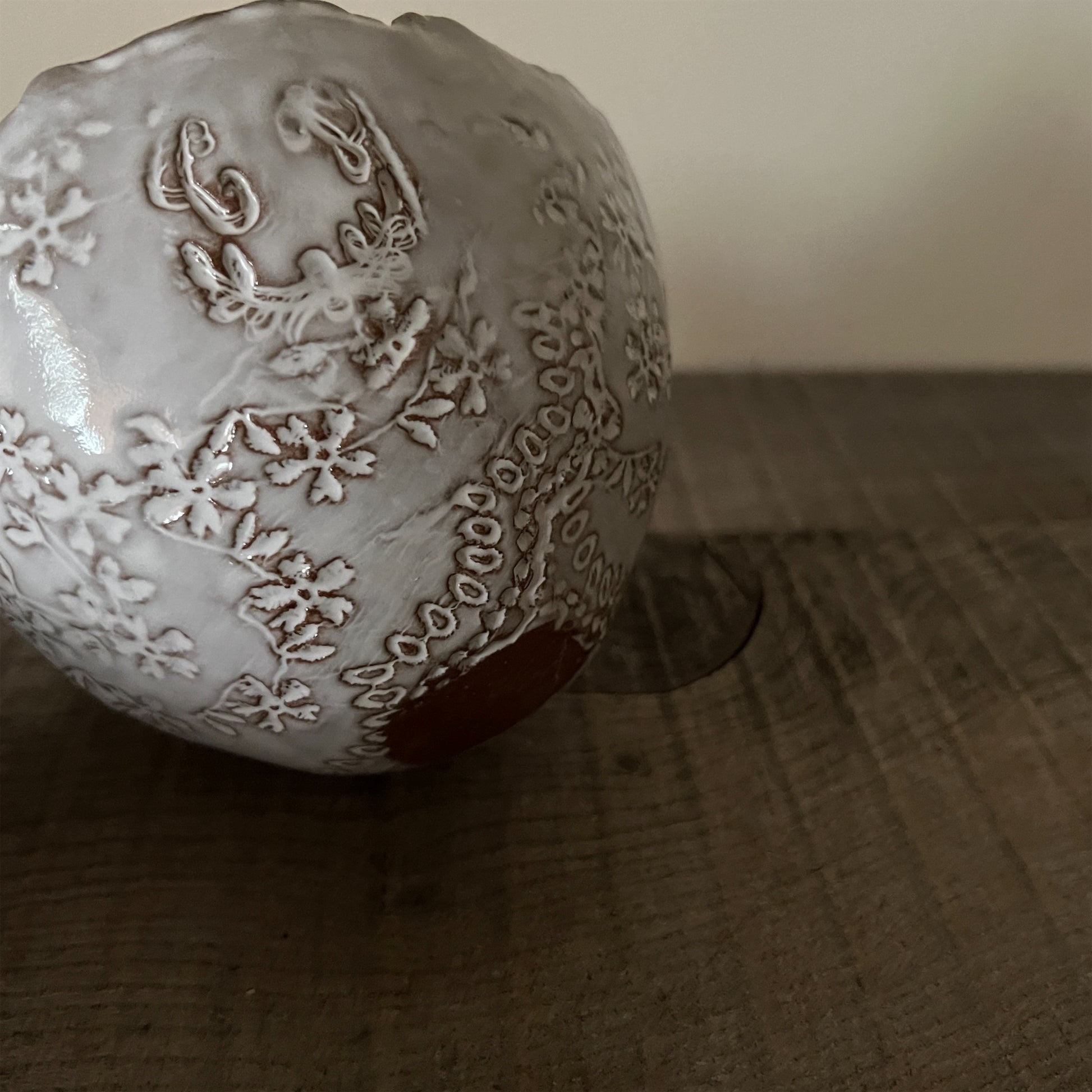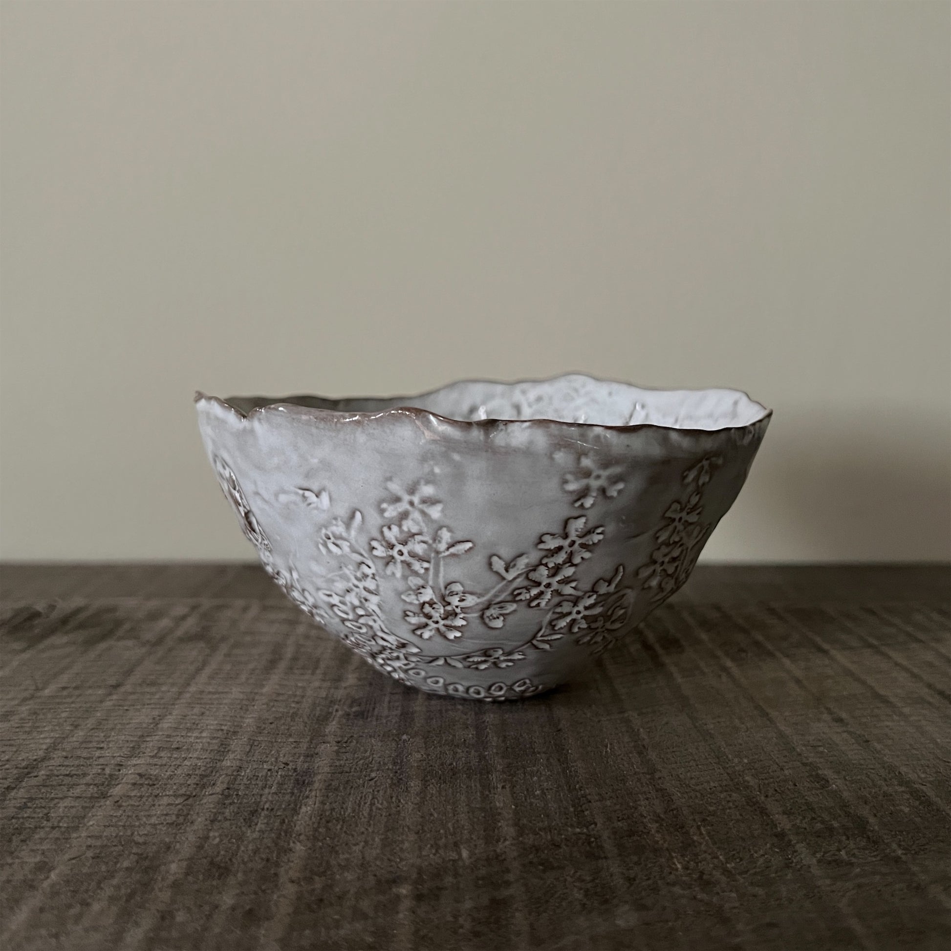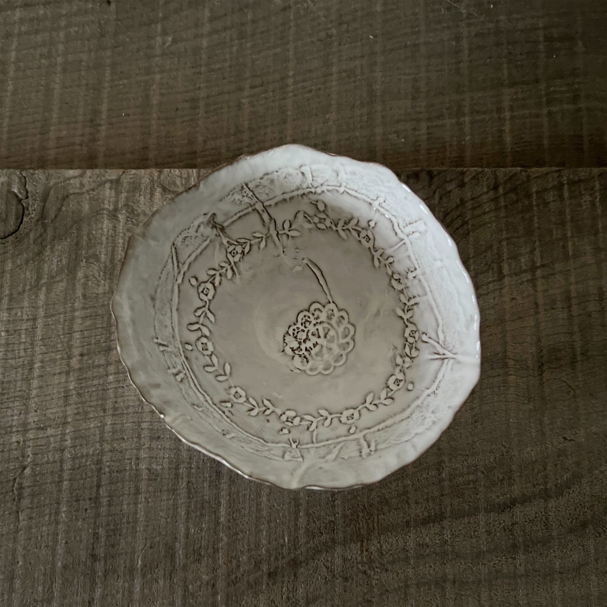 フランス人アーティストのヴァレリー・カサドが独自の手法で制作するセラミック作品。南仏ソルグ島のヴォクリューズに工房を構え、感性の赴くままに手を動かして造形しています。布地のように薄く柔らかなフォルムで、粉砂糖をまとったお菓子のような表情があります。古いものに関心の深い彼女が集めたアンティークのレースやボタンで表現された美しいレリーフが魅力。作家の優しさが伝わってくるような、ひとつとして同じものがない作品です。*手作りのため、形や風合いには個体差があります。