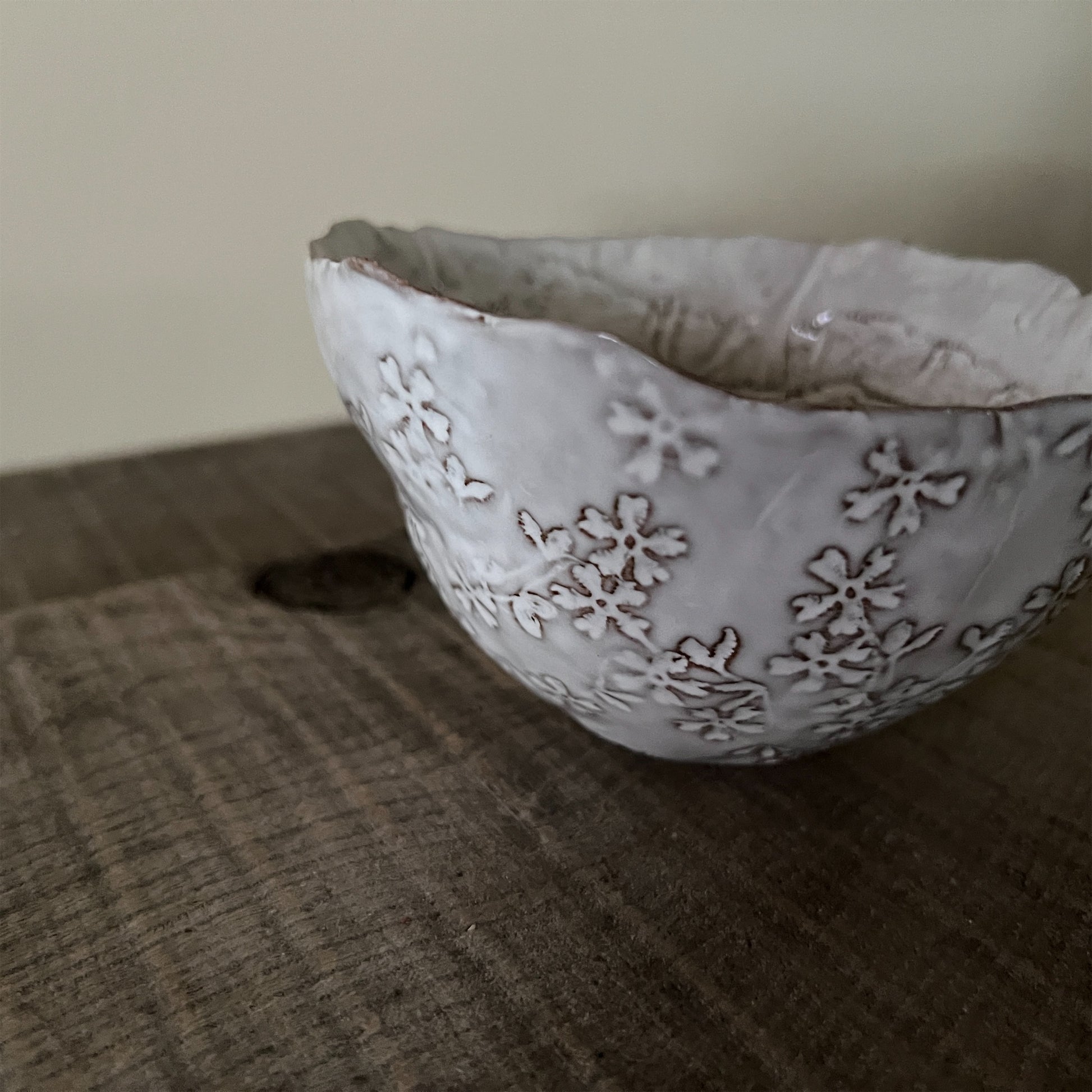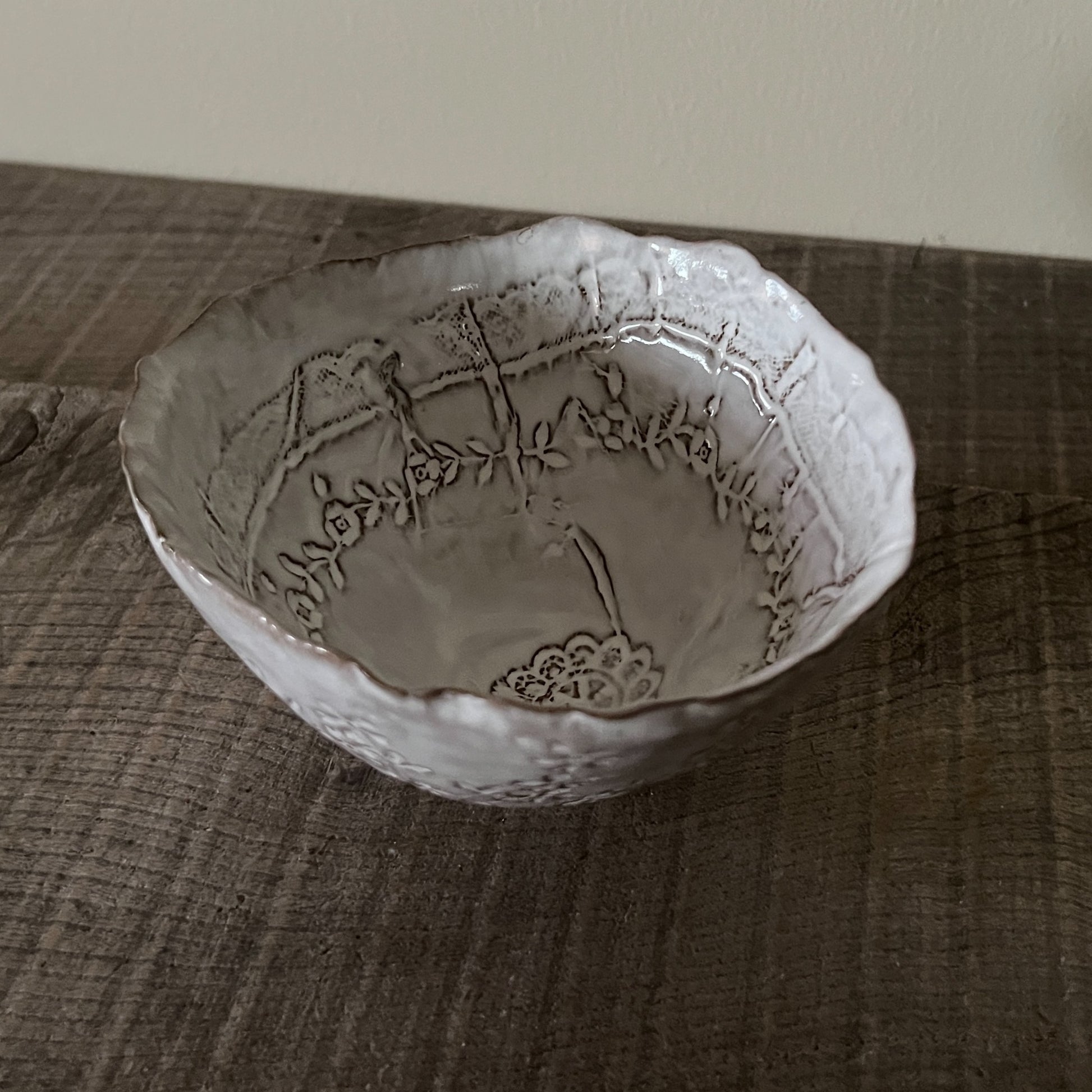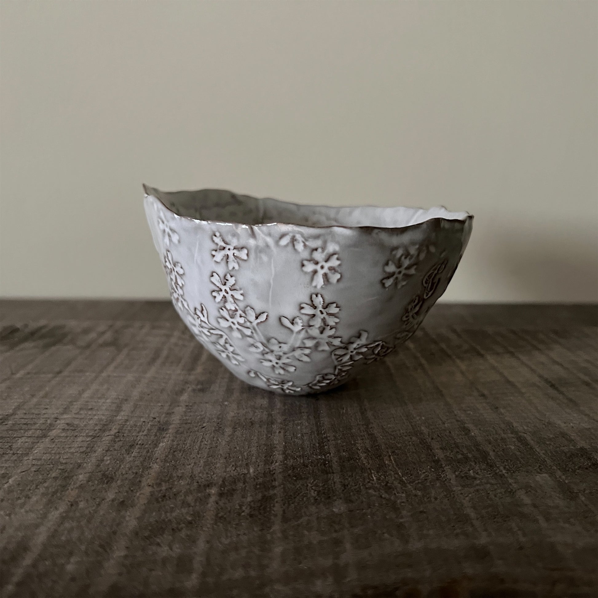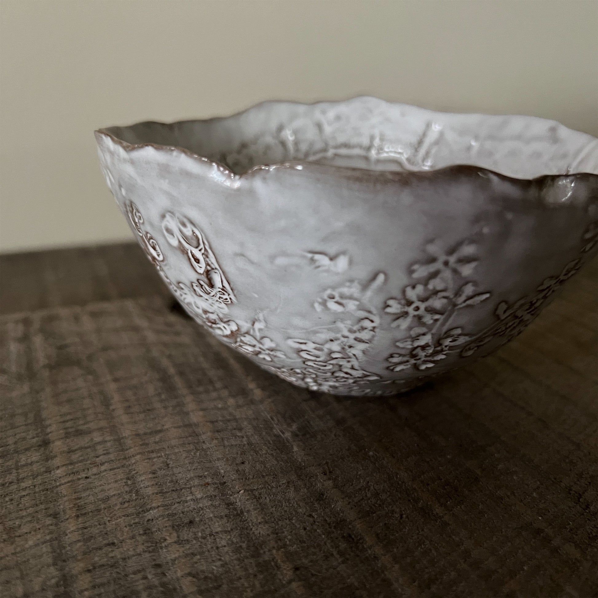 フランス人アーティストのヴァレリー・カサドが独自の手法で制作するセラミック作品。南仏ソルグ島のヴォクリューズに工房を構え、感性の赴くままに手を動かして造形しています。布地のように薄く柔らかなフォルムで、粉砂糖をまとったお菓子のような表情があります。古いものに関心の深い彼女が集めたアンティークのレースやボタンで表現された美しいレリーフが魅力。作家の優しさが伝わってくるような、ひとつとして同じものがない作品です。*手作りのため、形や風合いには個体差があります。