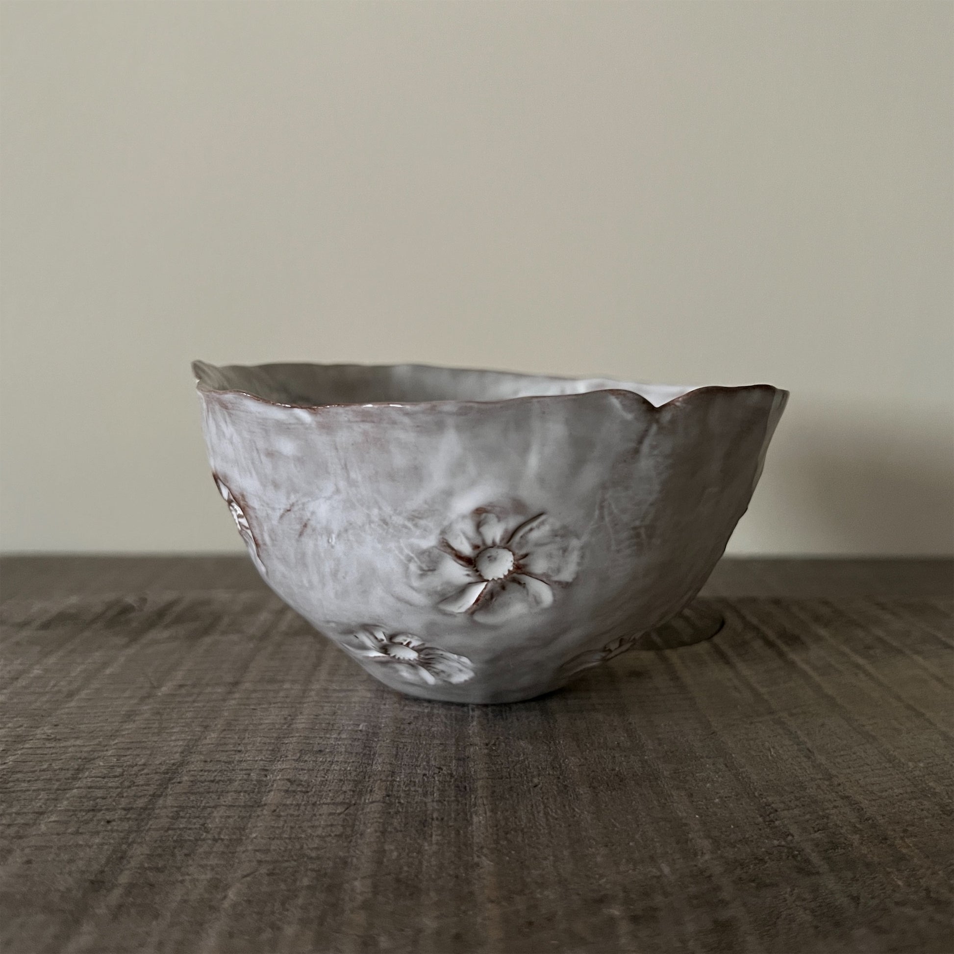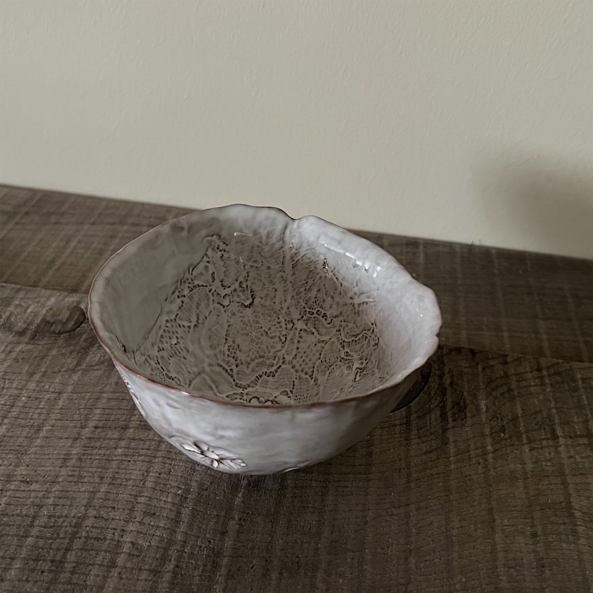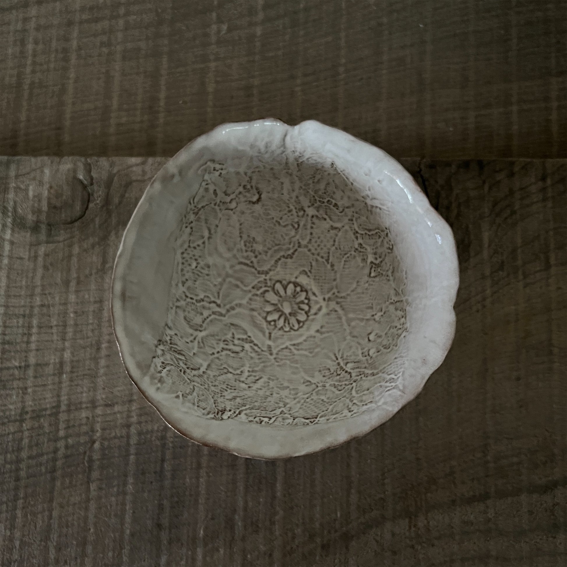 フランス人アーティストのヴァレリー・カサドが独自の手法で制作するセラミック作品。南仏ソルグ島のヴォクリューズに工房を構え、感性の赴くままに手を動かして造形しています。布地のように薄く柔らかなフォルムで、粉砂糖をまとったお菓子のような表情があります。古いものに関心の深い彼女が集めたアンティークのレースやボタンで表現された美しいレリーフが魅力。作家の優しさが伝わってくるような、ひとつとして同じものがない作品です。*手作りのため、形や風合いには個体差があります。
