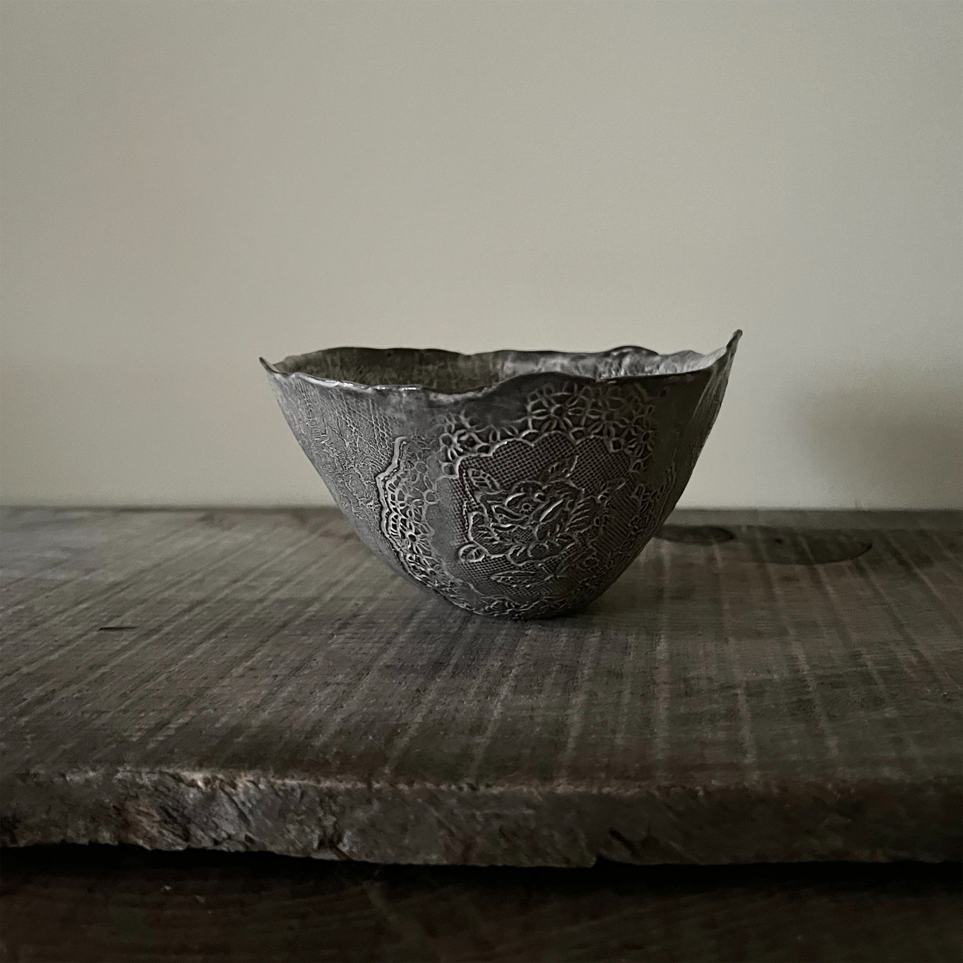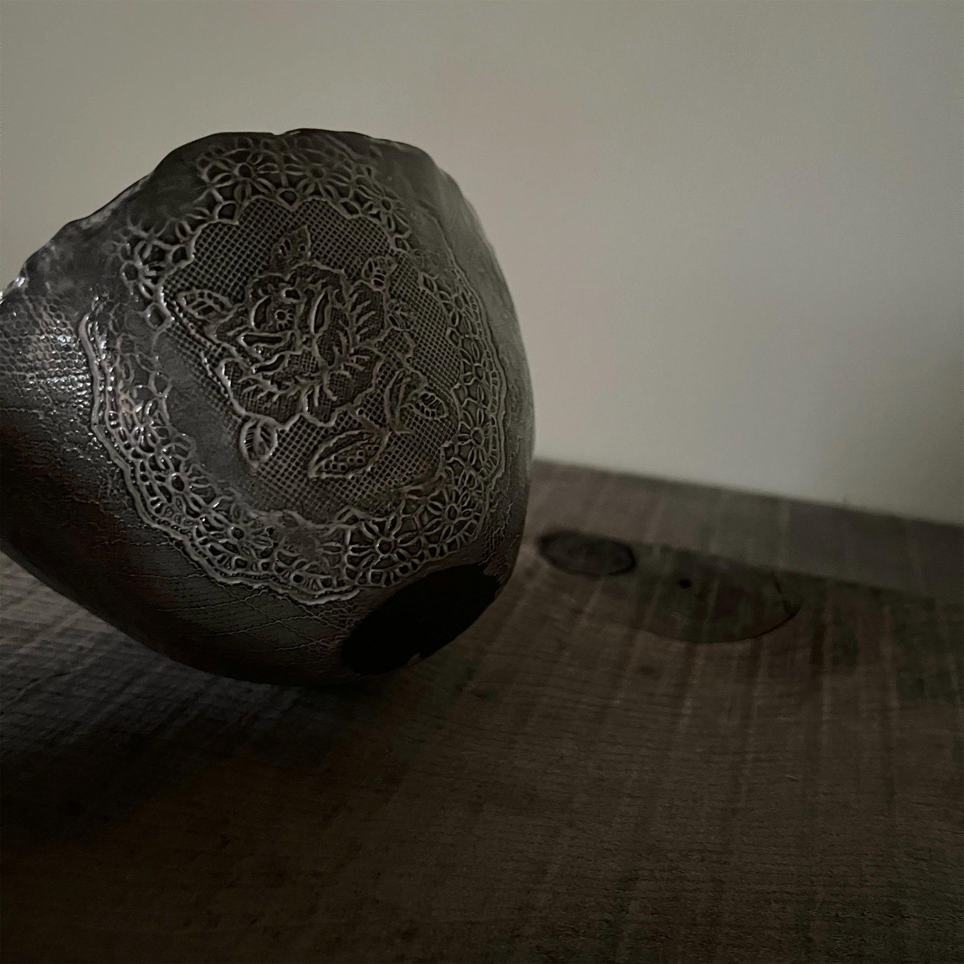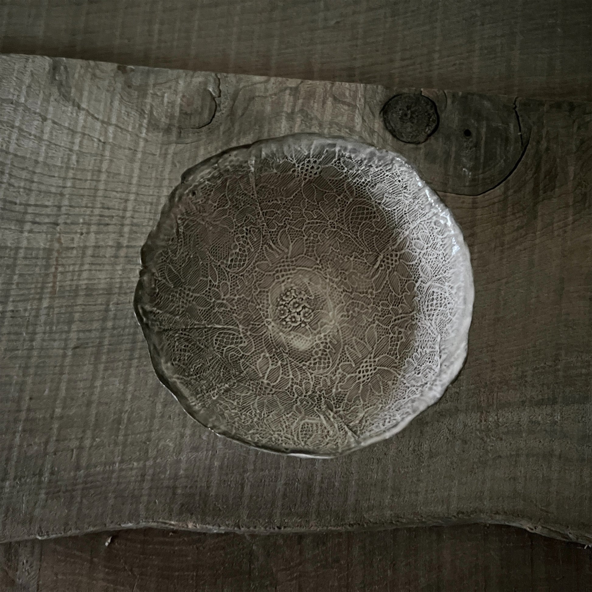 フランス人アーティストのヴァレリー・カサドが独自の手法で制作するセラミック作品。南仏ソルグ島のヴォクリューズに工房を構え、感性の赴くままに手を動かして造形しています。布地のように薄く柔らかなフォルムで、粉砂糖をまとったお菓子のような表情があります。古いものに関心の深い彼女が集めたアンティークのレースやボタンで表現された美しいレリーフが魅力。作家の優しさが伝わってくるような、ひとつとして同じものがない作品です。*手作りのため、形や風合いには個体差があります。