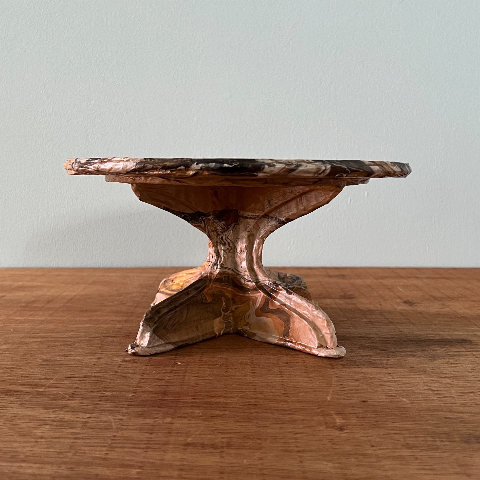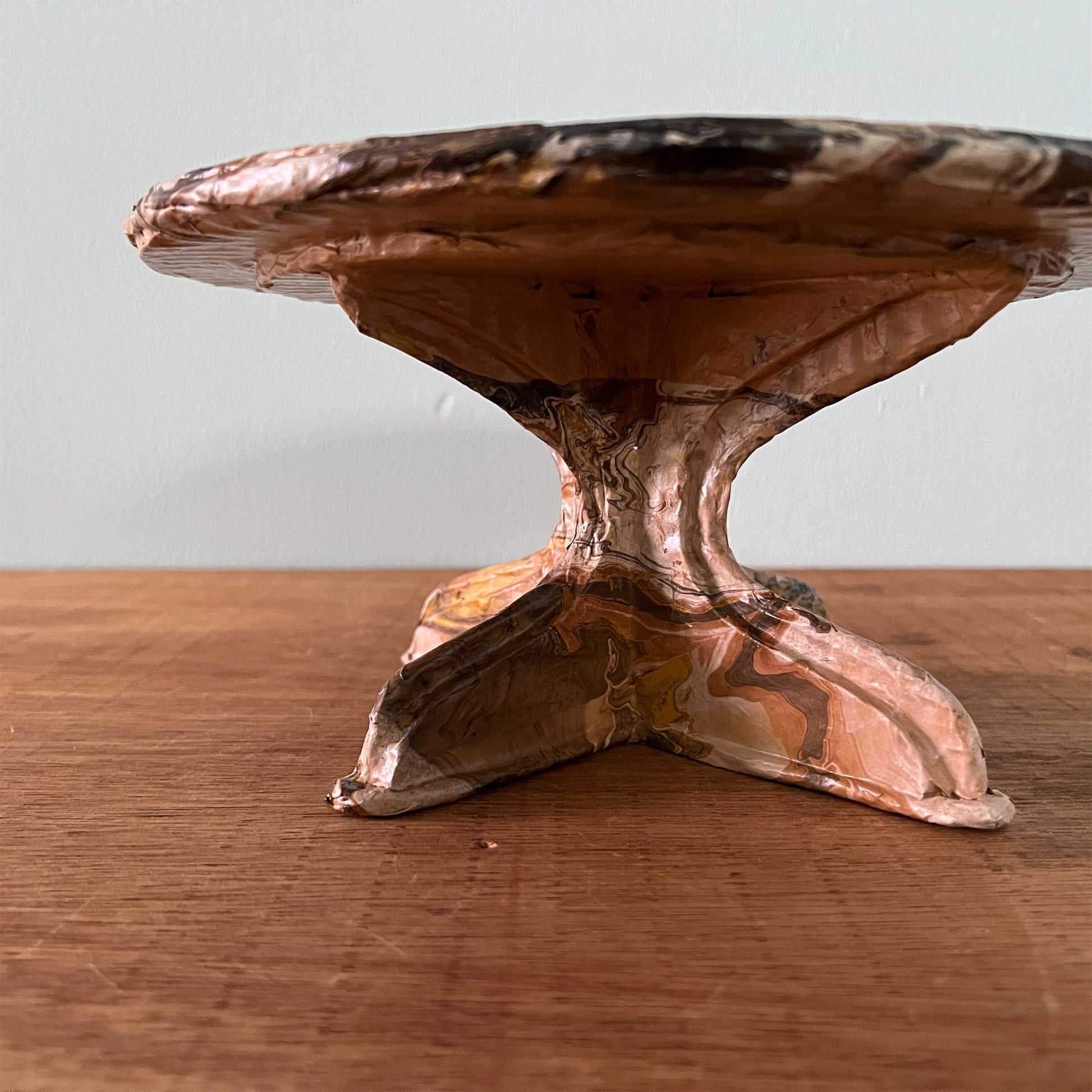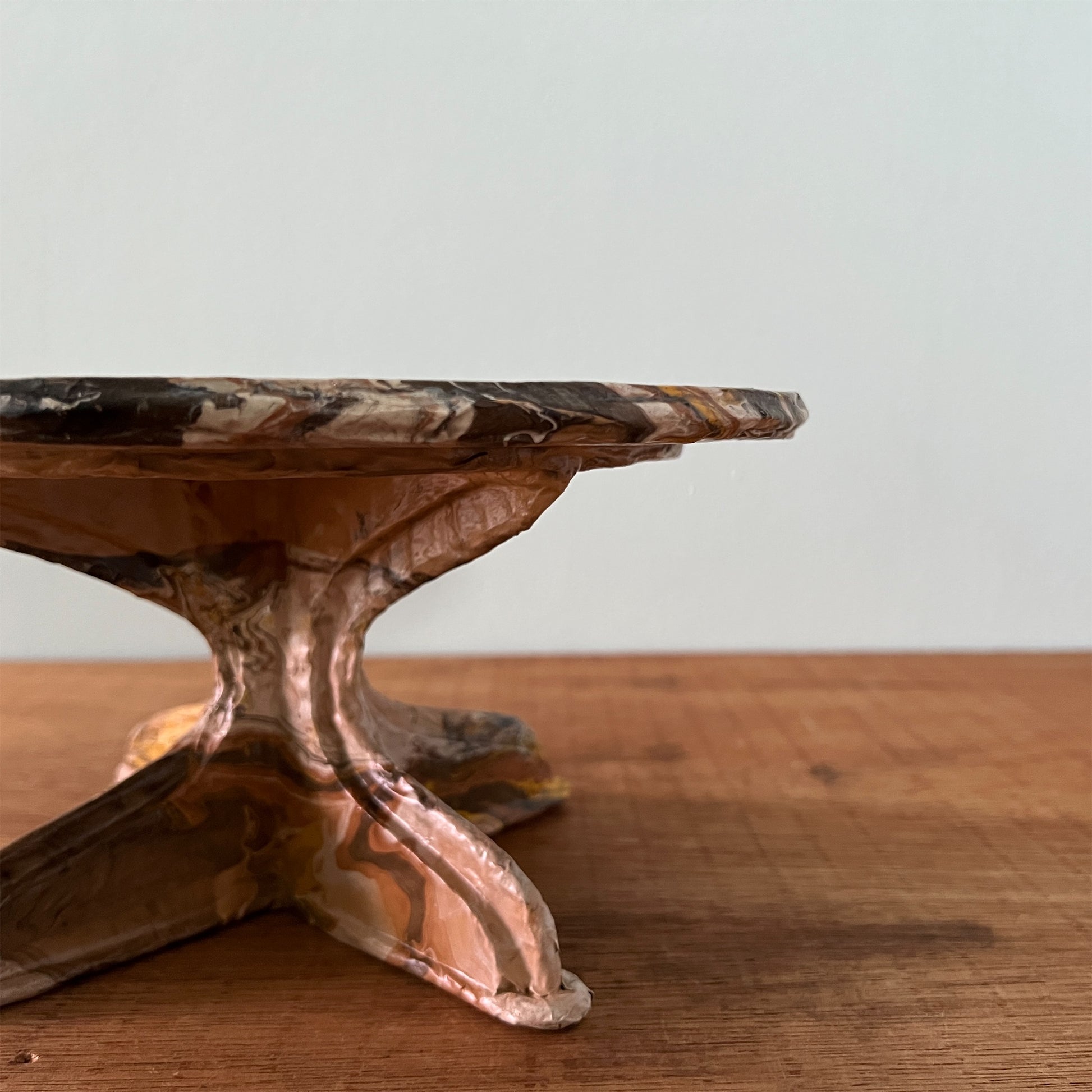 段ボール、新聞紙、木材でつくったコンポート。表面は撥水作用のあるコーティング剤で仕上げています。ちょっとしたオブジェや鉢植え、一輪挿し、本などお好きなものを置いて楽しむことができます。軽量なので釘で壁に設置できます。【美しい窓辺】【お取り扱い上のご注意 】表面が濡れても問題ありませんが、本品全体を水に長時間浸すと、性質上ふやけてしまいますのでご注意ください。ふやけてしまった場合は、風通しの良いところで乾かしてください。汚れた場合は、固く絞った布で拭いてください。【ウォールデコ 使用上のご注意】壁に掛ける際は付属の画鋲を使用し、ガタつき・ぐらつきがないよう しっかりと取り付けてください。 ウオールデコが外れて物が落ち、 破損やケガの原因となります。割れ物等を置かれる際は細心のご注意をお願いいたします。 こちらの商品は装飾棚になります。 構造上、 棚に乗せる物の荷重は 300gを目安とし、左右均等に乗せてください。こちらの商品は実店舗でも取り扱っております。オンラインショップ上でご注文いただいても、現品が実店舗にて「売約済」となっておりご希望に添えない場合もございます。その際はメールにてご連絡いたしますので、予めご了承ください。