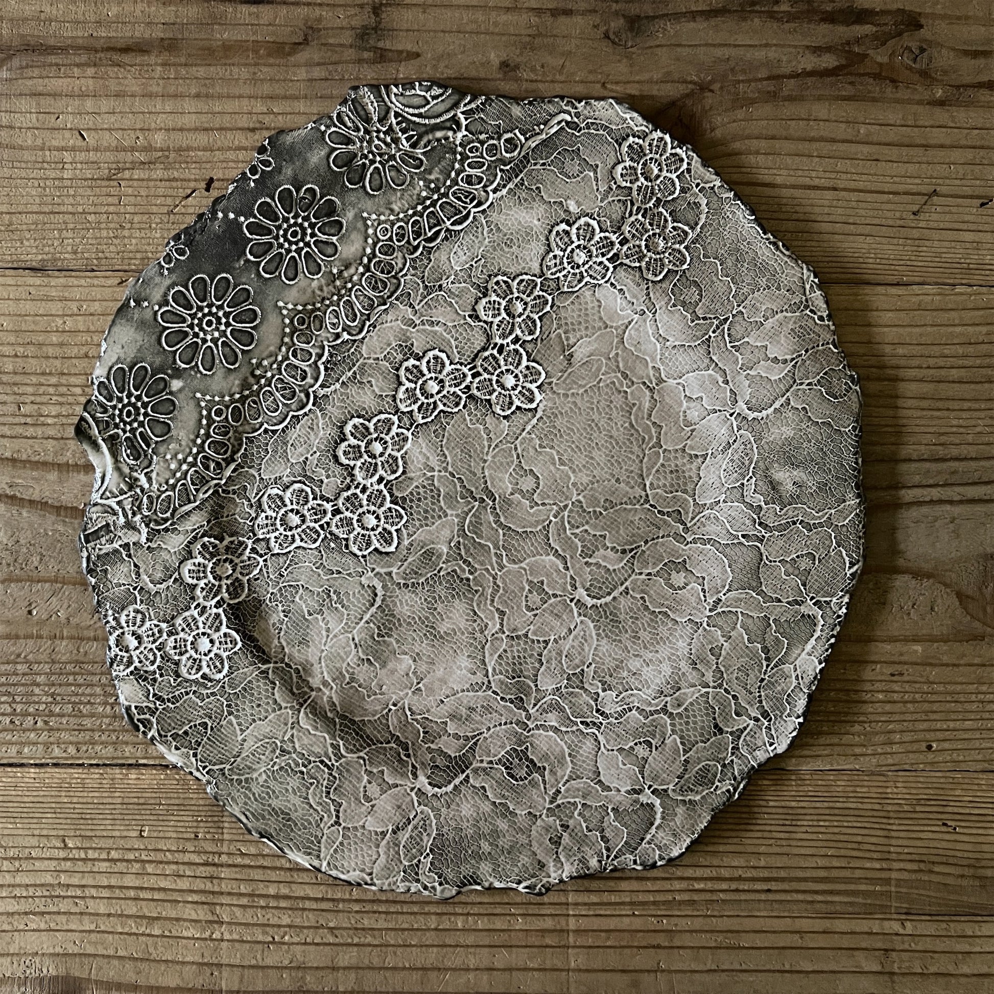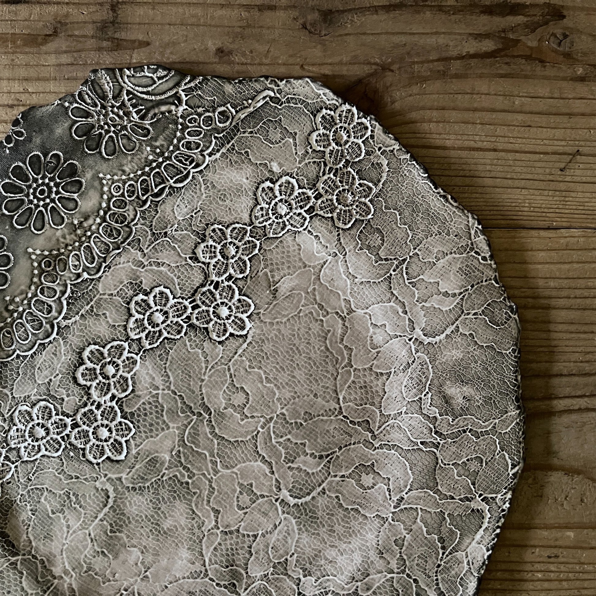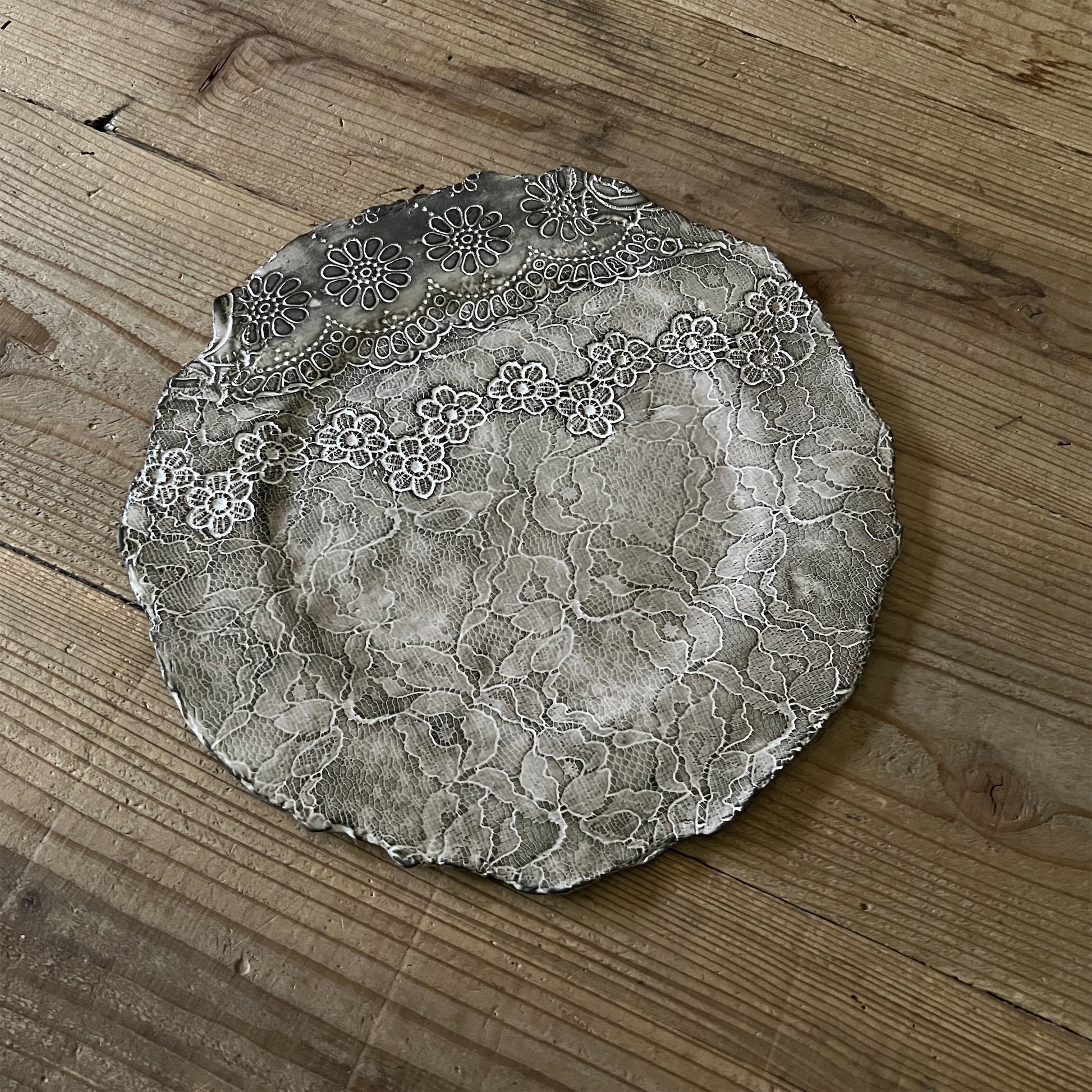 フランス人アーティストのヴァレリー・カサドが独自の手法で制作するセラミック作品。南仏ソルグ島のヴォクリューズに工房を構え、感性の赴くままに手を動かして造形しています。布地のように薄く柔らかなフォルムで、粉砂糖をまとったお菓子のような表情があります。古いものに関心の深い彼女が集めたアンティークのレースやボタンで表現された美しいレリーフが魅力。作家の優しさが伝わってくるような、ひとつとして同じものがない作品です。*手作りのため、形や風合いには個体差があります。
