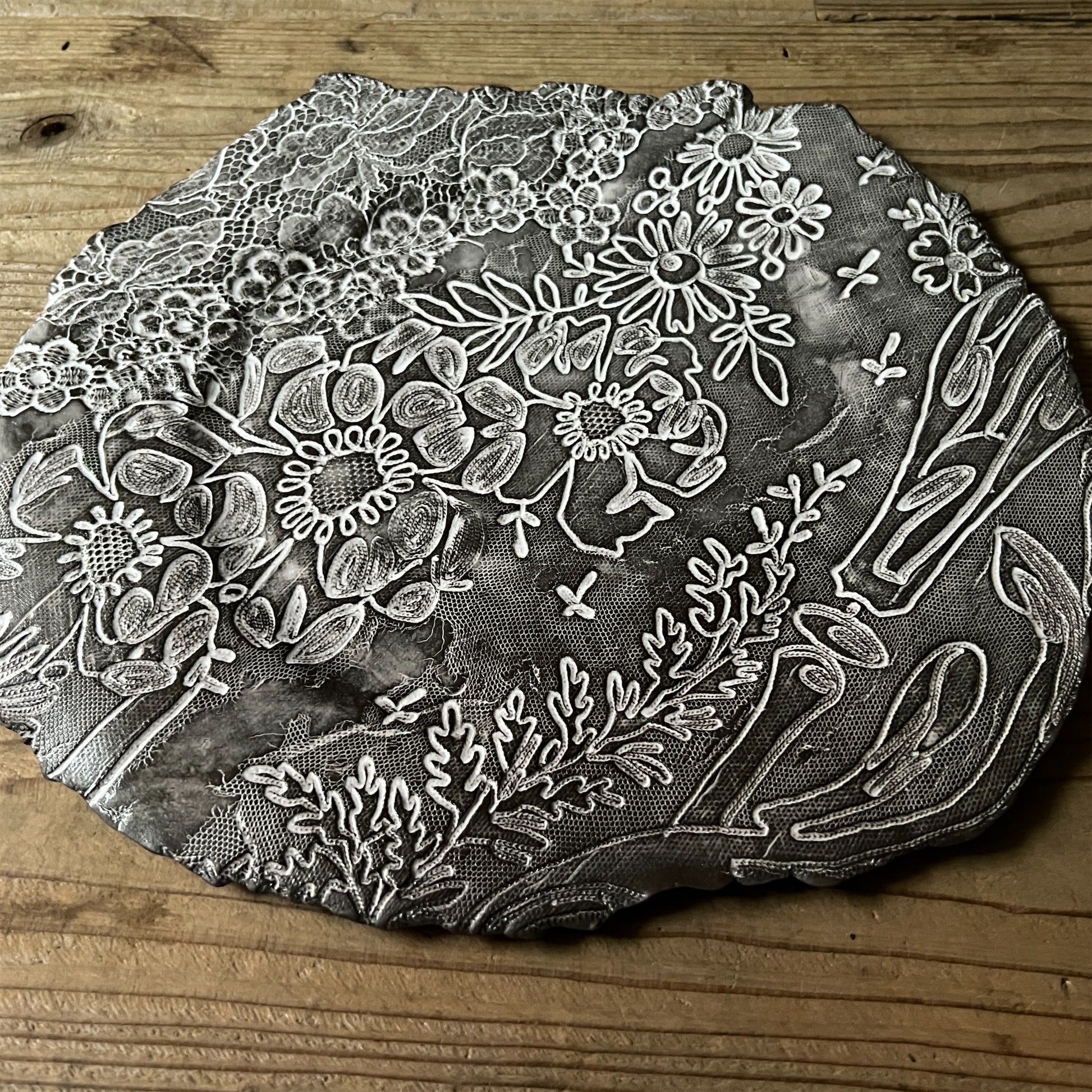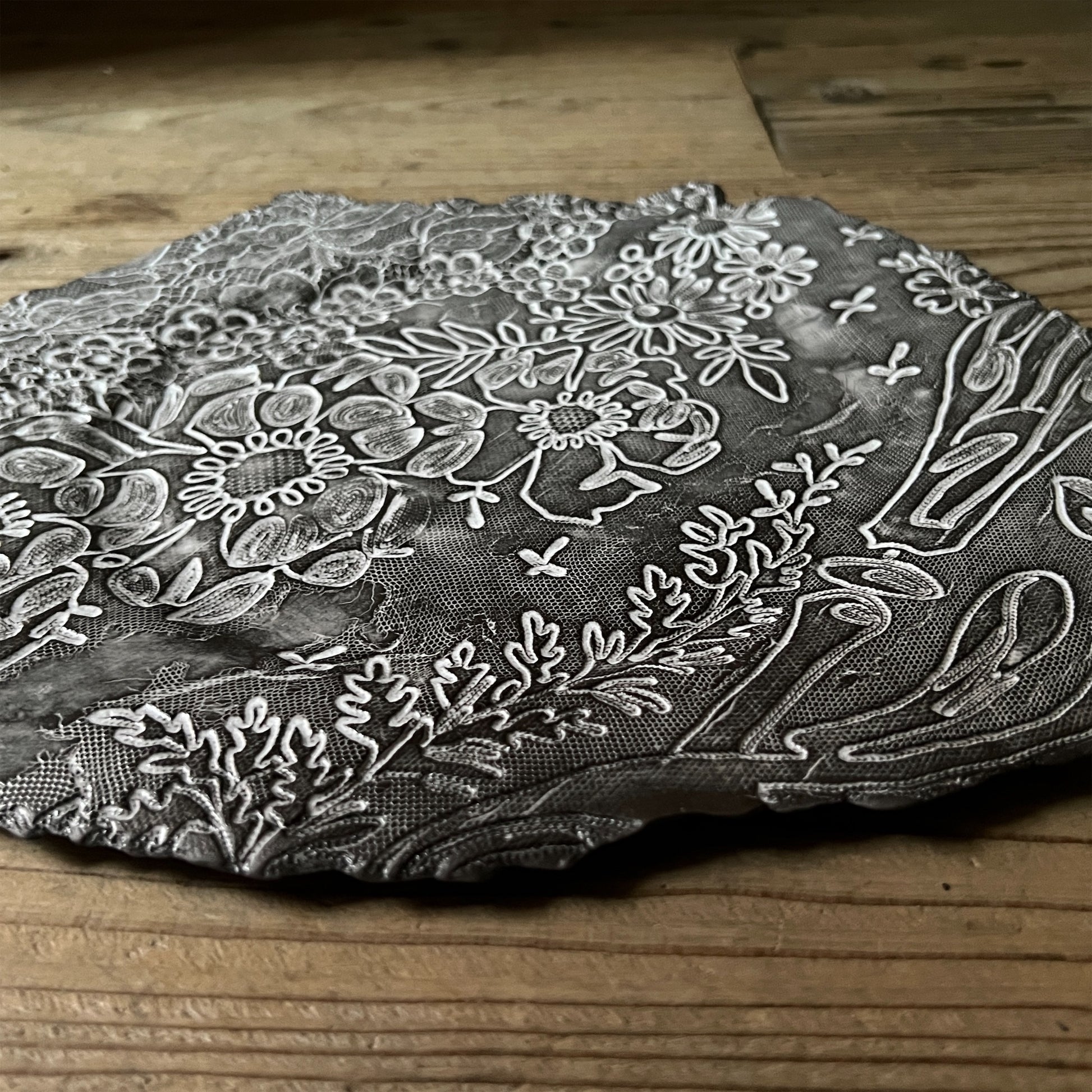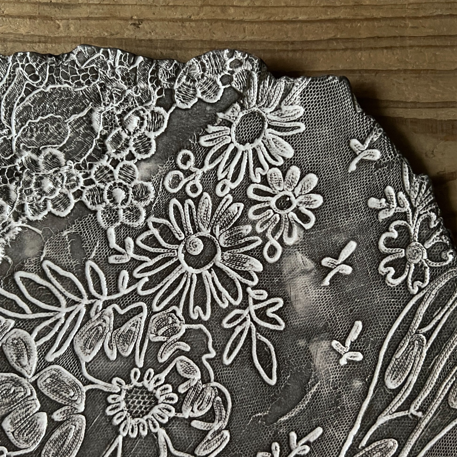 フランス人アーティストのヴァレリー・カサドが独自の手法で制作するセラミック作品。南仏ソルグ島のヴォクリューズに工房を構え、感性の赴くままに手を動かして造形しています。布地のように薄く柔らかなフォルムで、粉砂糖をまとったお菓子のような表情があります。古いものに関心の深い彼女が集めたアンティークのレースやボタンで表現された美しいレリーフが魅力。作家の優しさが伝わってくるような、ひとつとして同じものがない作品です。*手作りのため、形や風合いには個体差があります。
