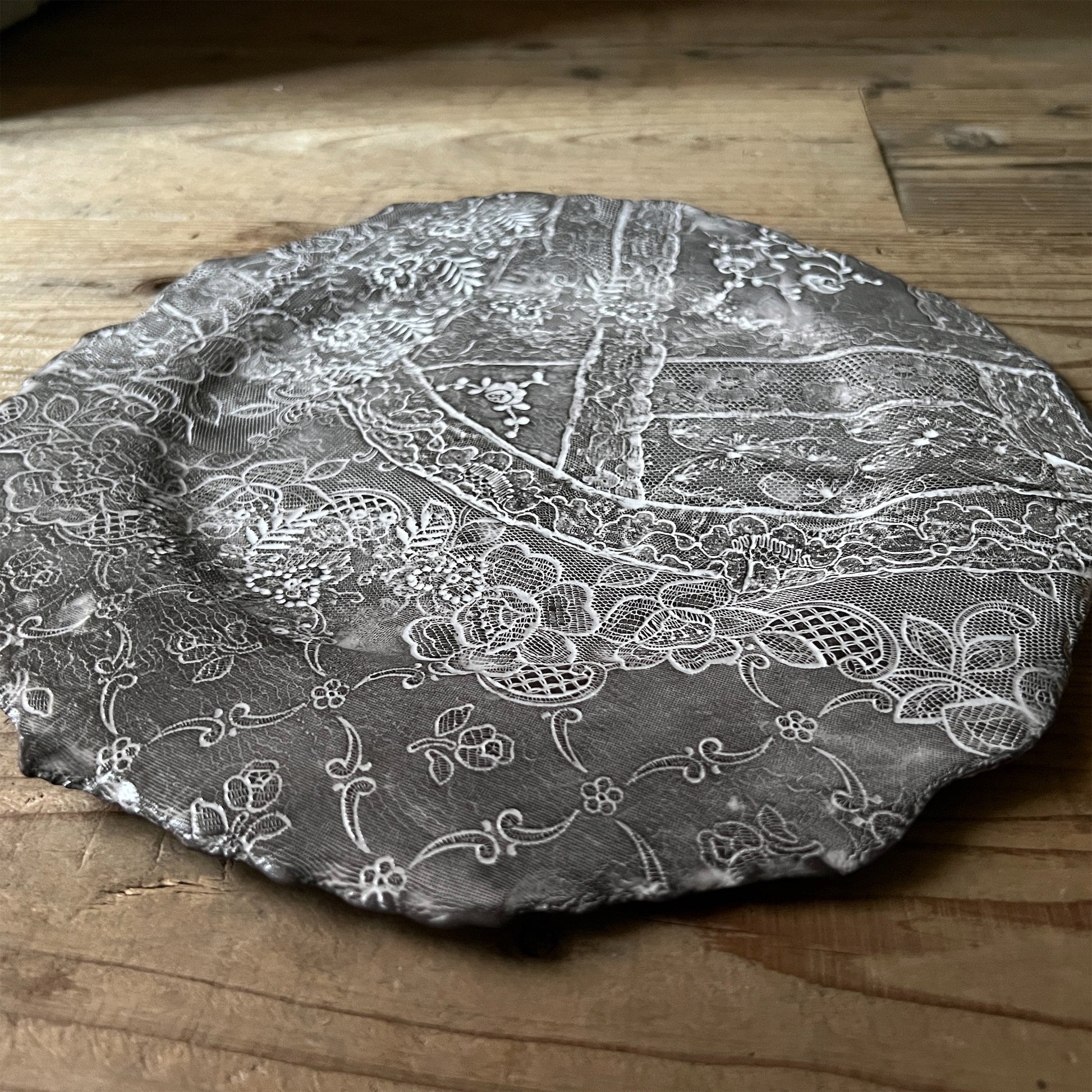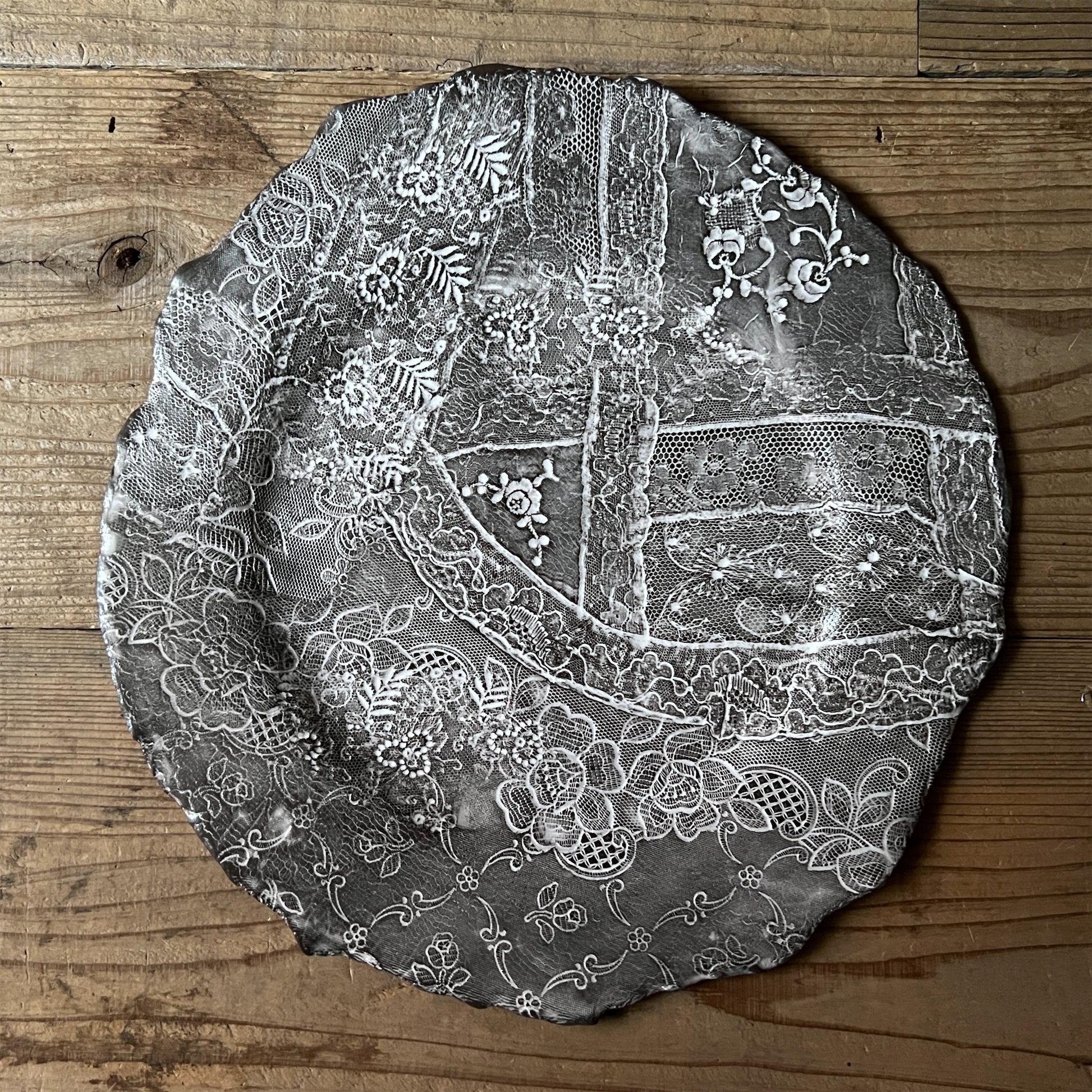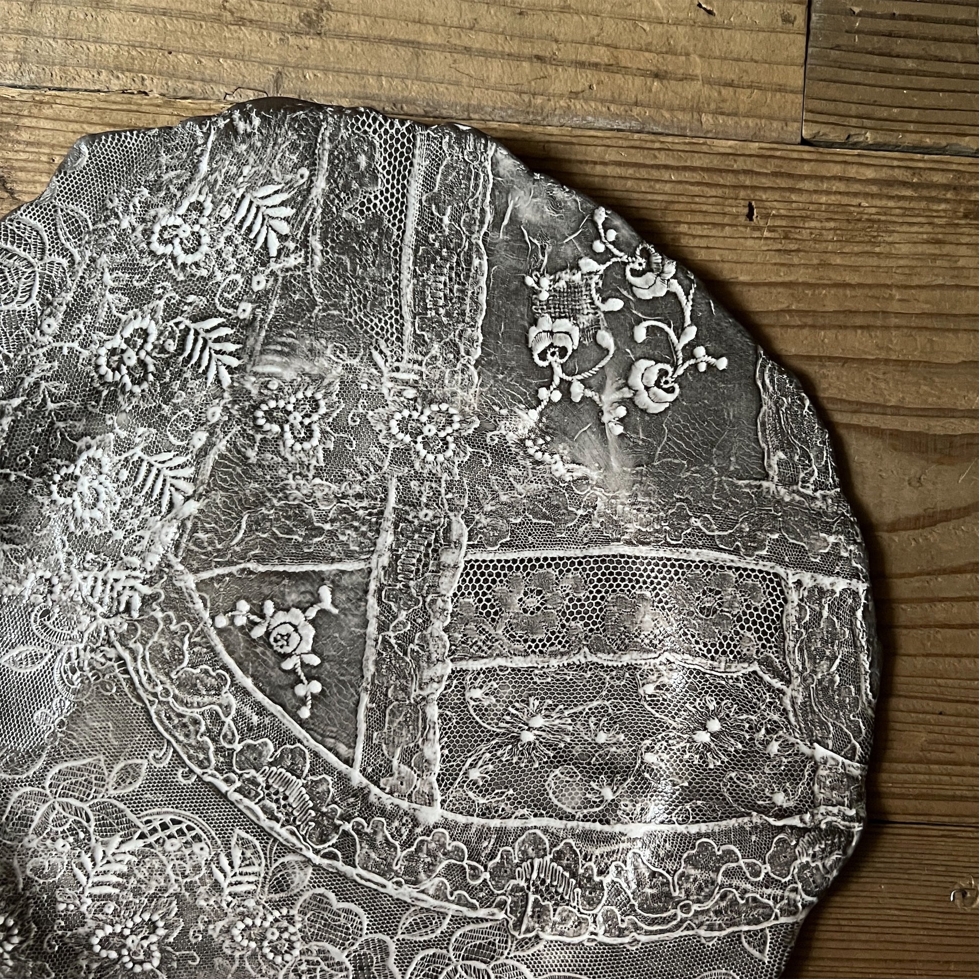フランス人アーティストのヴァレリー・カサドが独自の手法で制作するセラミック作品。南仏ソルグ島のヴォクリューズに工房を構え、感性の赴くままに手を動かして造形しています。布地のように薄く柔らかなフォルムで、粉砂糖をまとったお菓子のような表情があります。古いものに関心の深い彼女が集めたアンティークのレースやボタンで表現された美しいレリーフが魅力。作家の優しさが伝わってくるような、ひとつとして同じものがない作品です。*手作りのため、形や風合いには個体差があります。