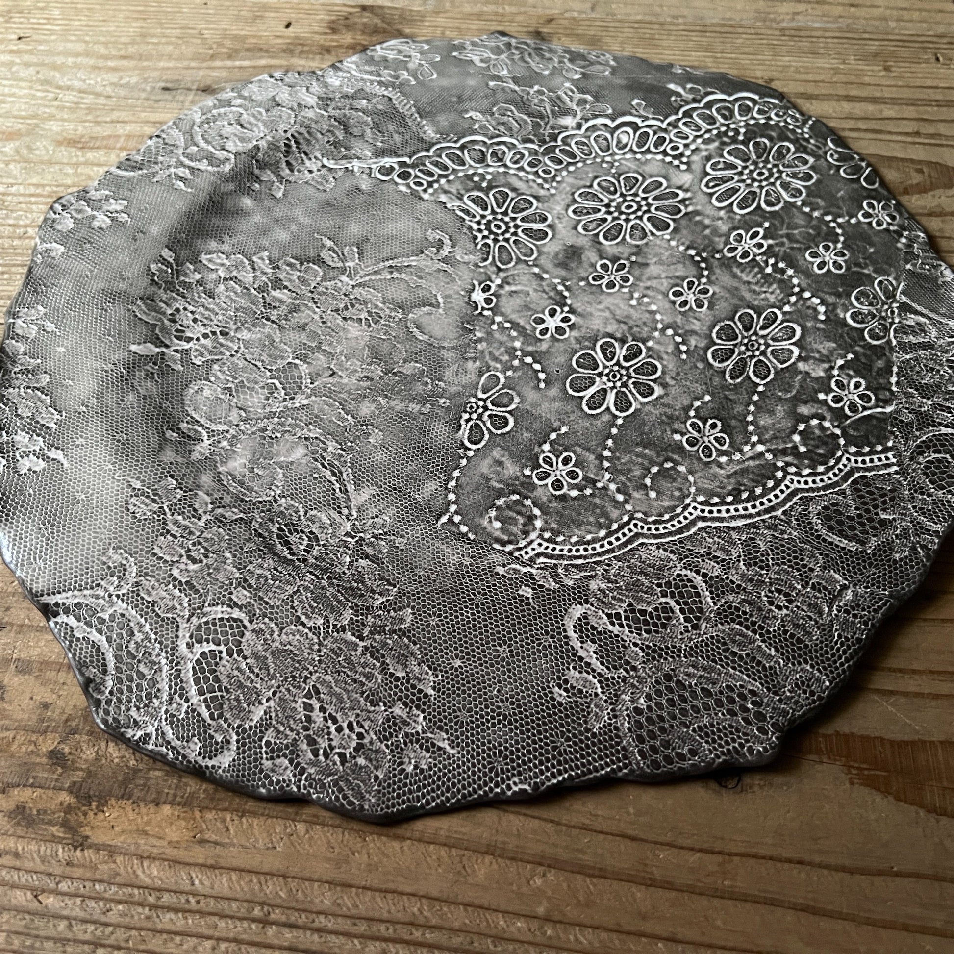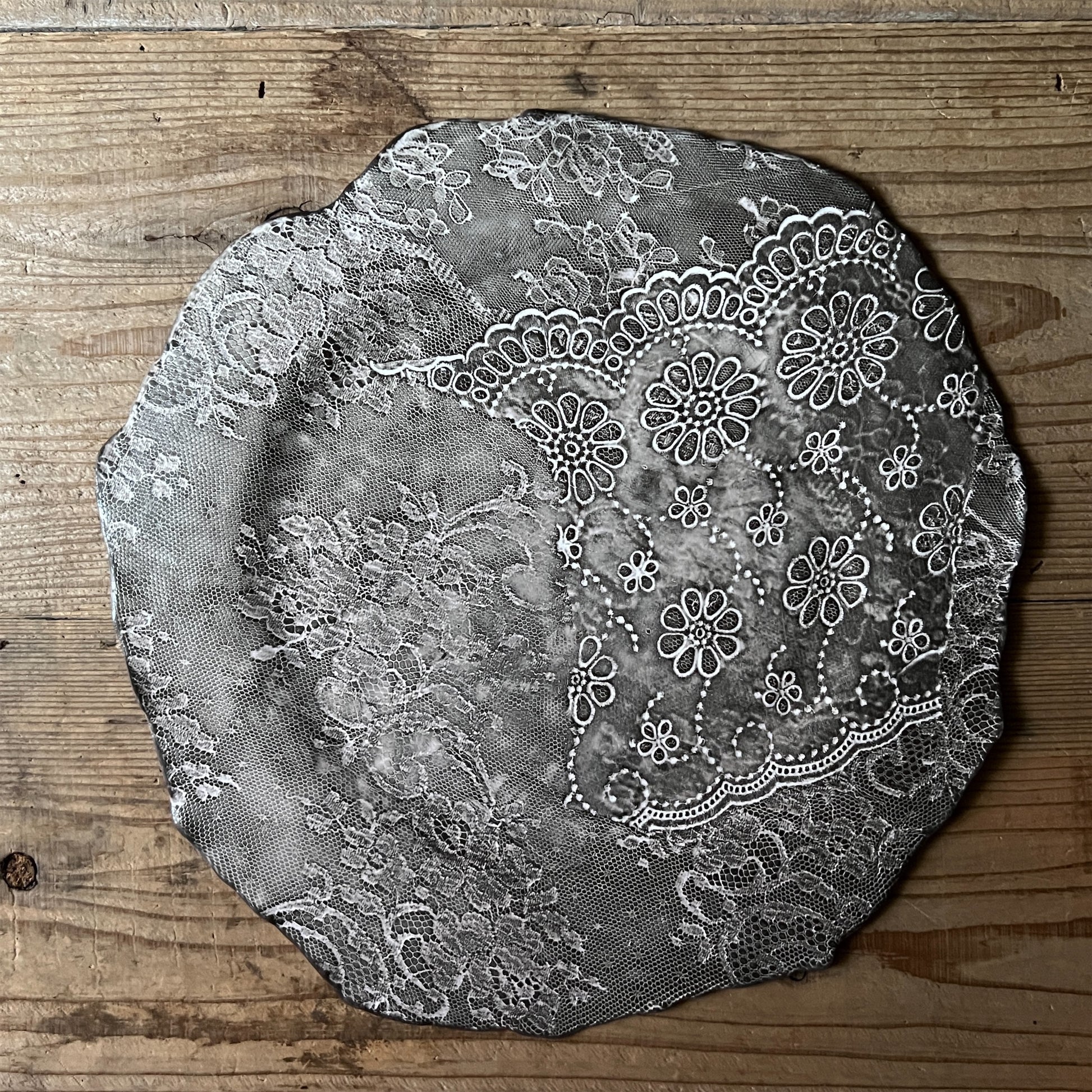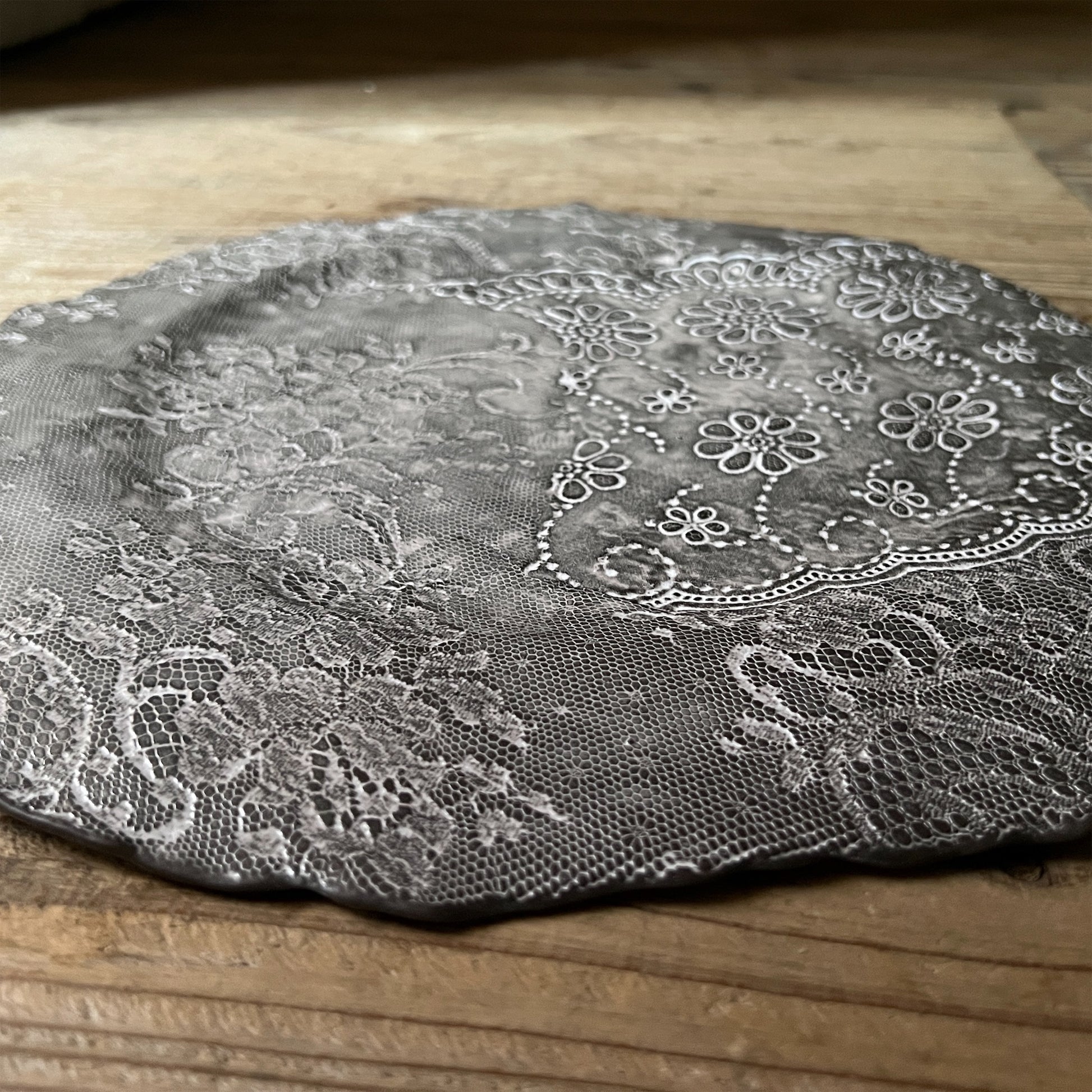フランス人アーティストのヴァレリー・カサドが独自の手法で制作するセラミック作品。南仏ソルグ島のヴォクリューズに工房を構え、感性の赴くままに手を動かして造形しています。布地のように薄く柔らかなフォルムで、粉砂糖をまとったお菓子のような表情があります。古いものに関心の深い彼女が集めたアンティークのレースやボタンで表現された美しいレリーフが魅力。作家の優しさが伝わってくるような、ひとつとして同じものがない作品です。*手作りのため、形や風合いには個体差があります。