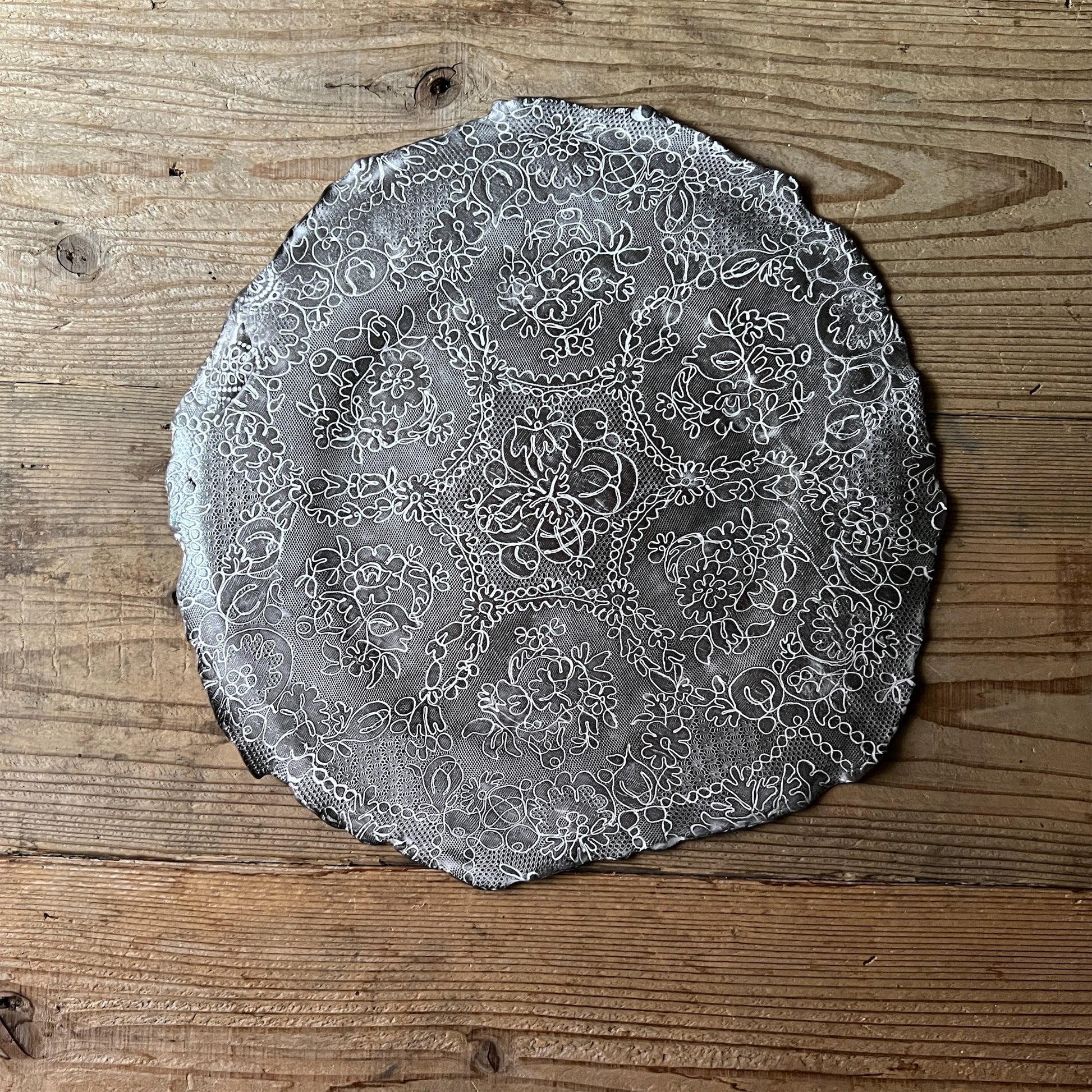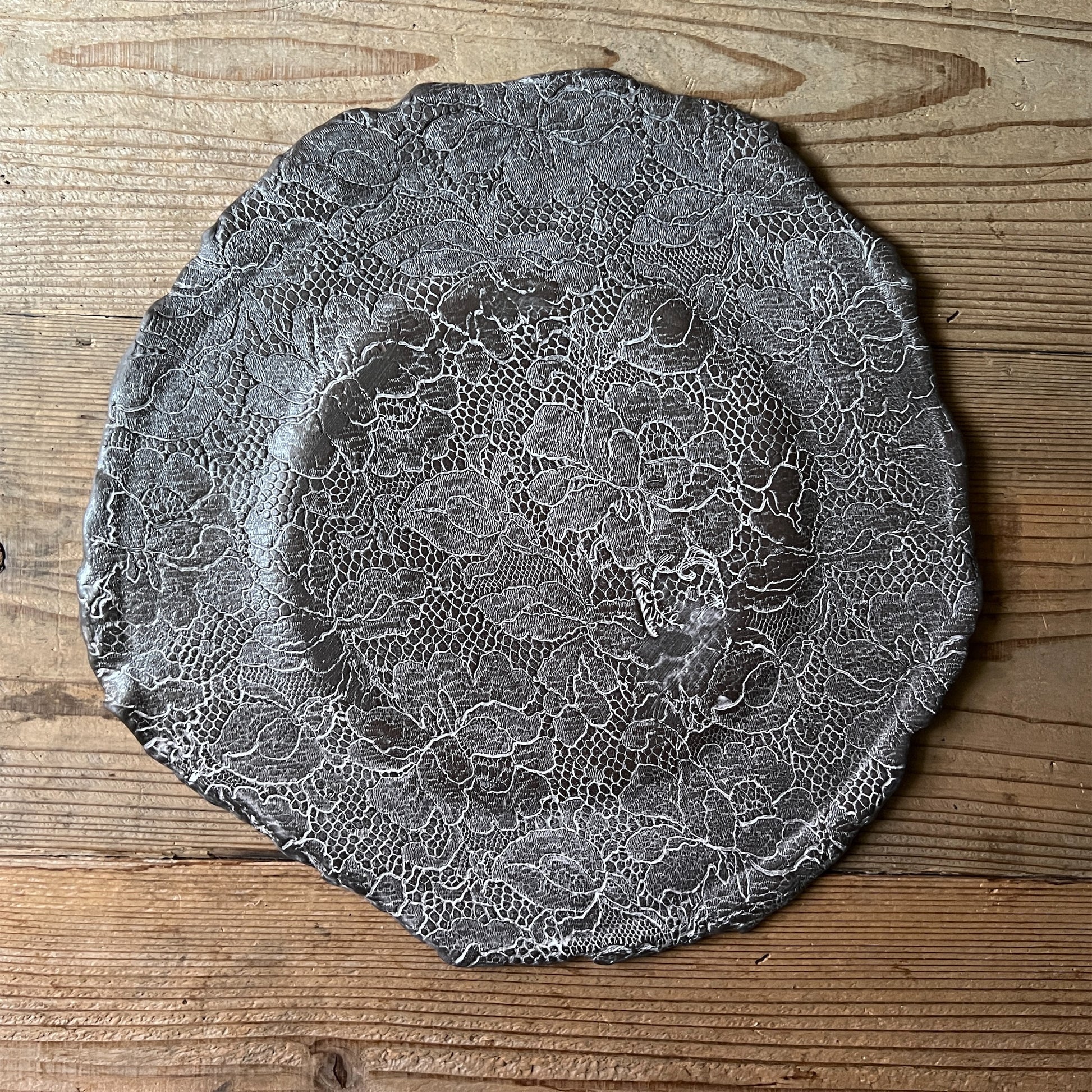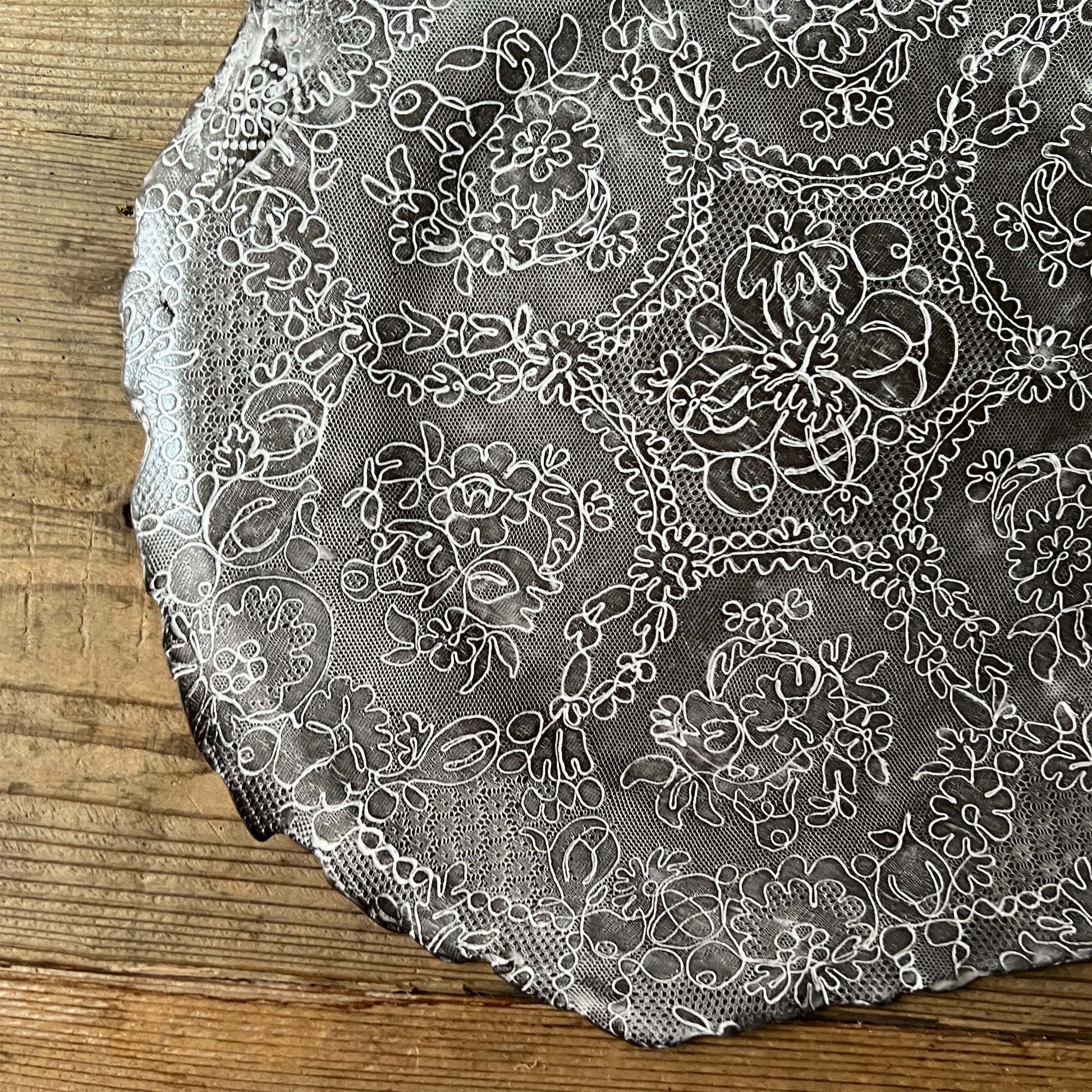 フランス人アーティストのヴァレリー・カサドが独自の手法で制作するセラミック作品。南仏ソルグ島のヴォクリューズに工房を構え、感性の赴くままに手を動かして造形しています。布地のように薄く柔らかなフォルムで、粉砂糖をまとったお菓子のような表情があります。古いものに関心の深い彼女が集めたアンティークのレースやボタンで表現された美しいレリーフが魅力。作家の優しさが伝わってくるような、ひとつとして同じものがない作品です。*手作りのため、形や風合いには個体差があります。