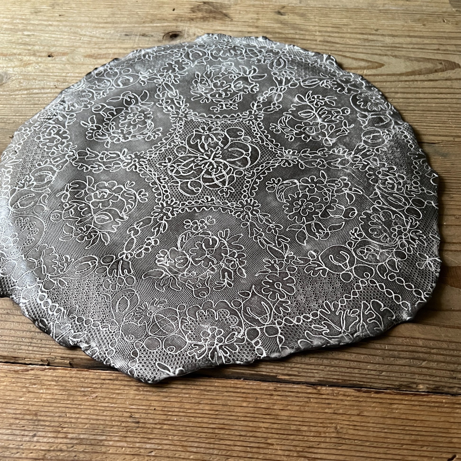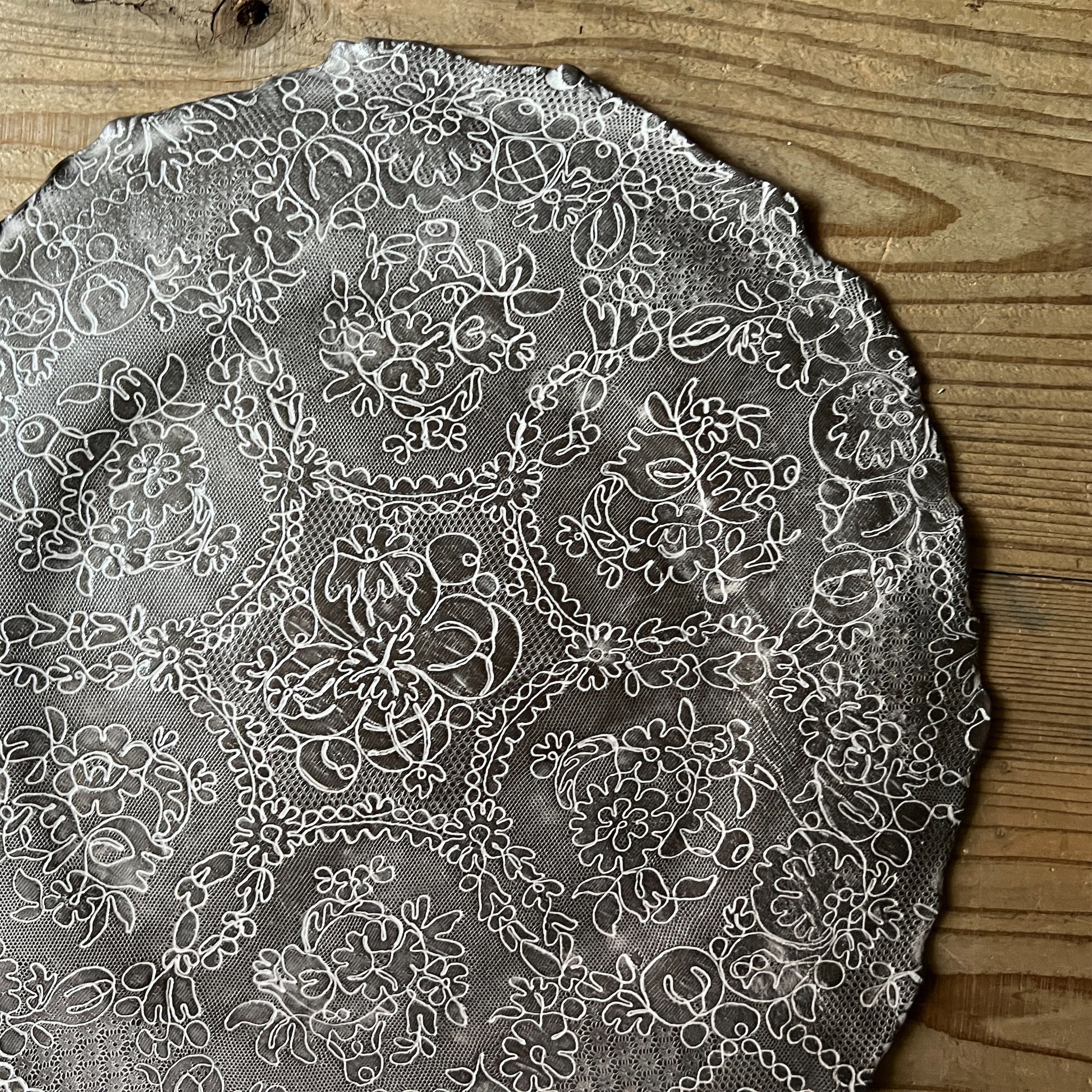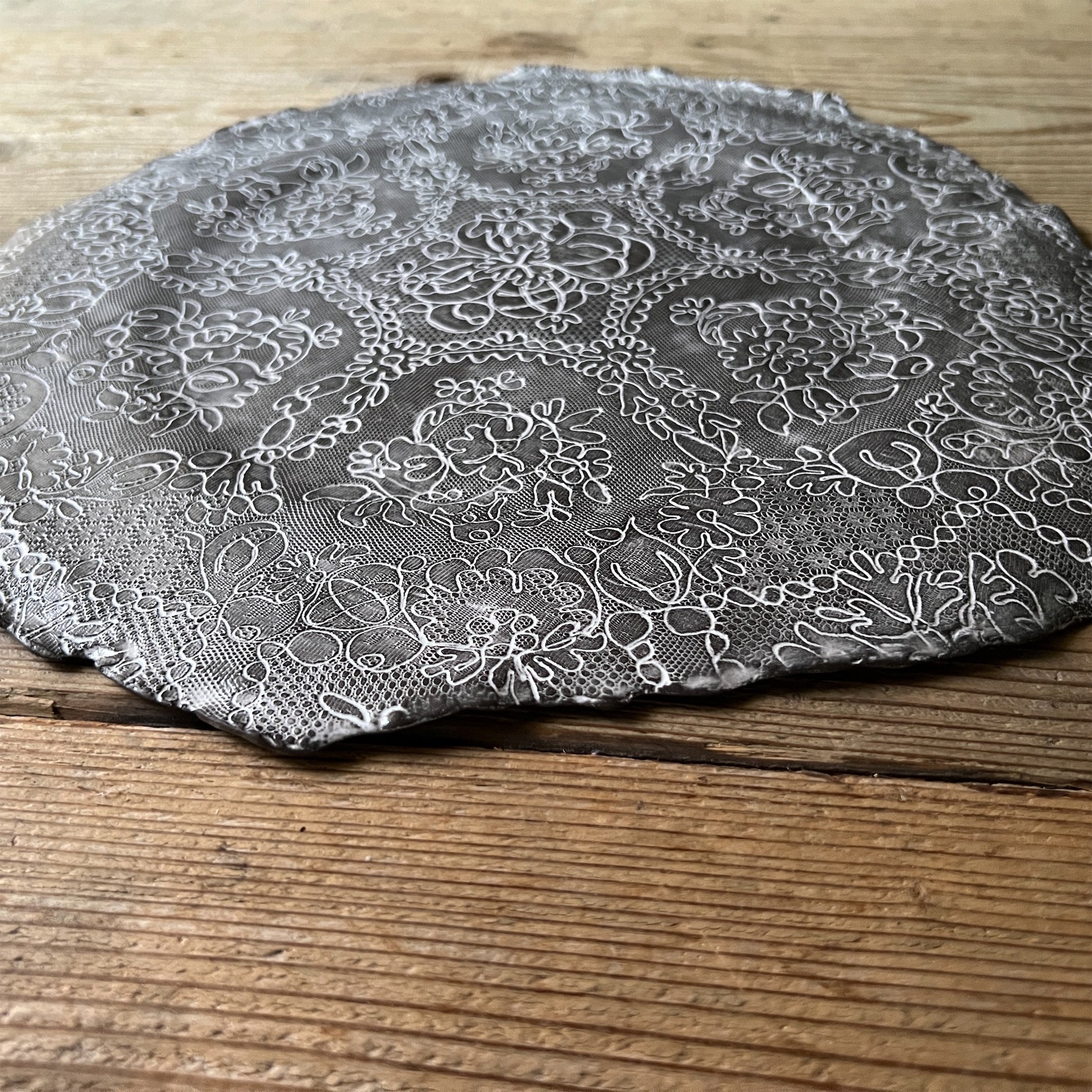 フランス人アーティストのヴァレリー・カサドが独自の手法で制作するセラミック作品。南仏ソルグ島のヴォクリューズに工房を構え、感性の赴くままに手を動かして造形しています。布地のように薄く柔らかなフォルムで、粉砂糖をまとったお菓子のような表情があります。古いものに関心の深い彼女が集めたアンティークのレースやボタンで表現された美しいレリーフが魅力。作家の優しさが伝わってくるような、ひとつとして同じものがない作品です。*手作りのため、形や風合いには個体差があります。
