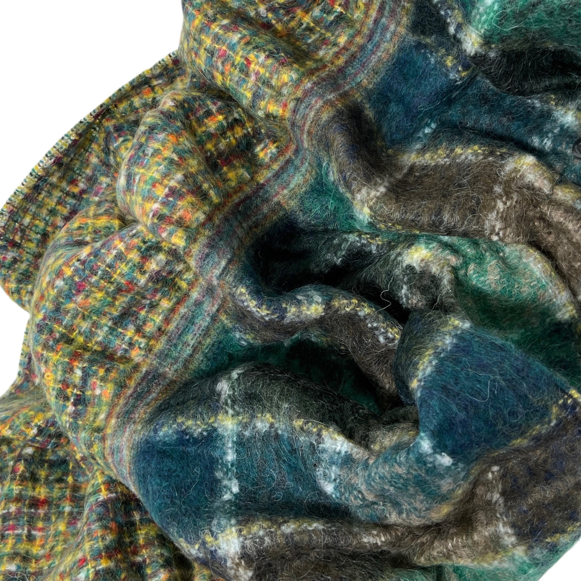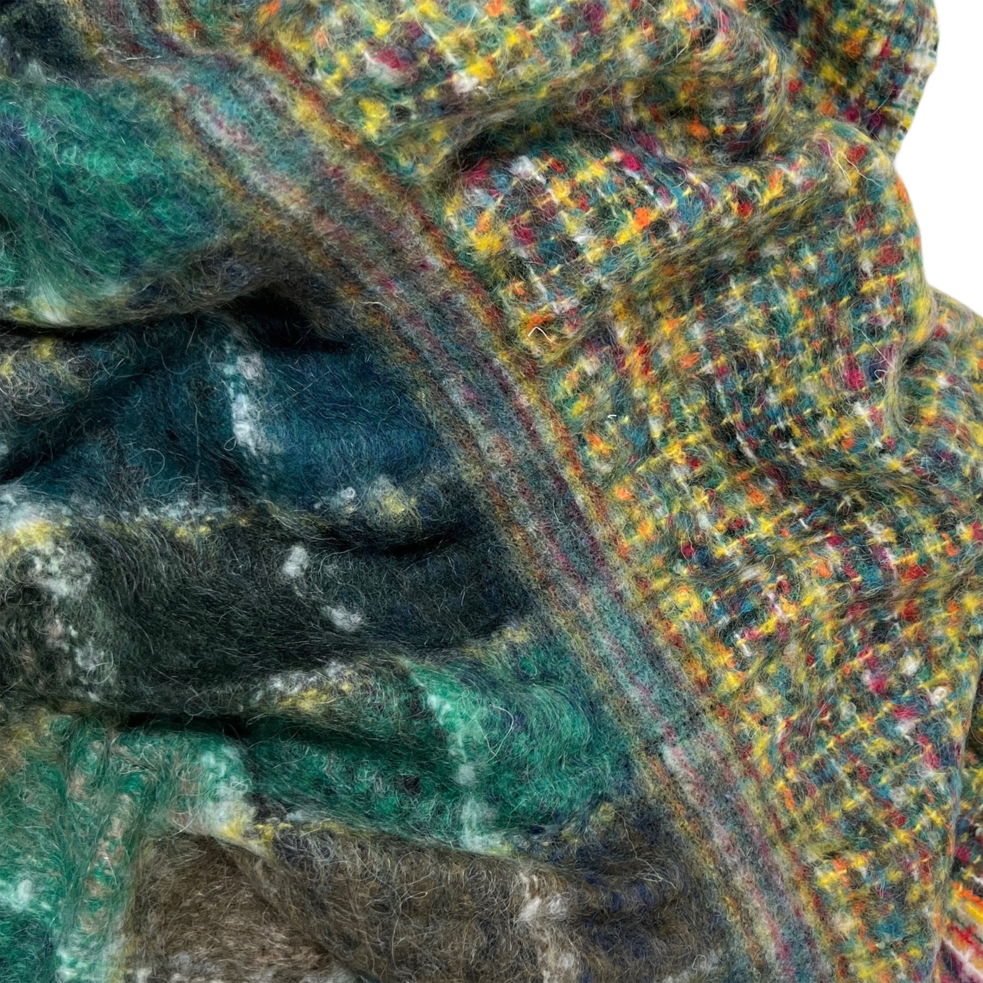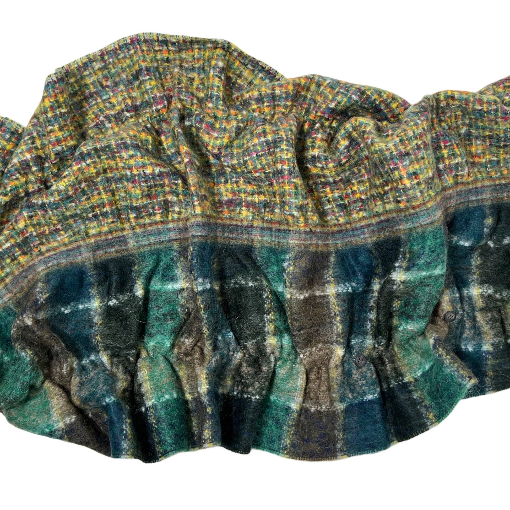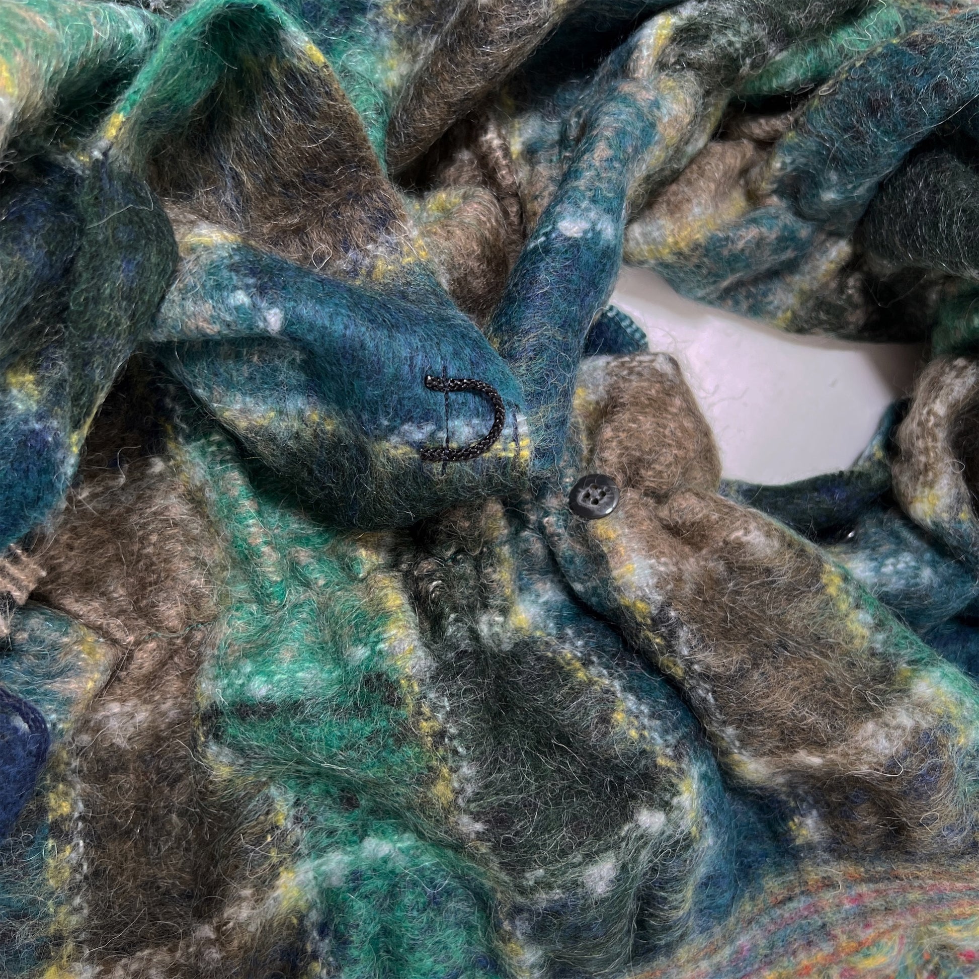 フランスの織物をパッチワークして作られた、ストールにもなるケープ風羽織です。シャーリング加工により立体感があり、ボタンが2つついていて自由にスタイリングできます。モヘヤを使用した三者混の生地は軽量ながら空気を含んで暖かいです。【Sayoko.M】ファブリックに拘り、相反する要素を一つの作品に込める事を意識しています。独特の光沢きしみ感はこの繊維の特徴です。使用を繰り返す事により毛羽立ちが生じたり風合いが徐々に変化します。着用の際は引っかかりに注意下さい。雨は水に濡れた場合は早めにふき取り、通期の良い所で形を整えて陰干しして下さい。こちらの商品は実店舗でも取り扱っております。オンラインショップ上でご注文いただいても、現品が実店舗にて「売約済」となっておりご希望に添えない場合もございます。その際はメールにてご連絡いたしますので、予めご了承ください。