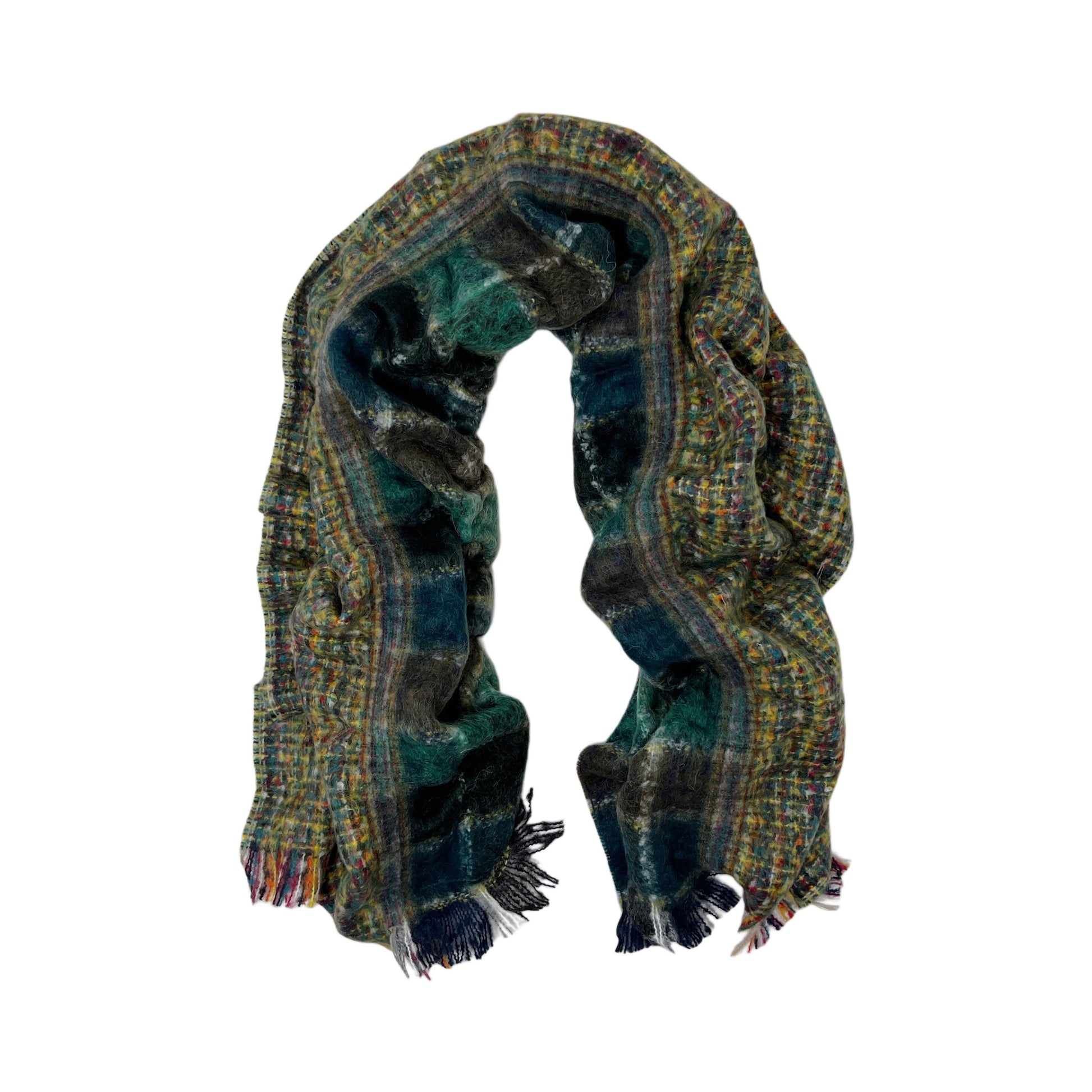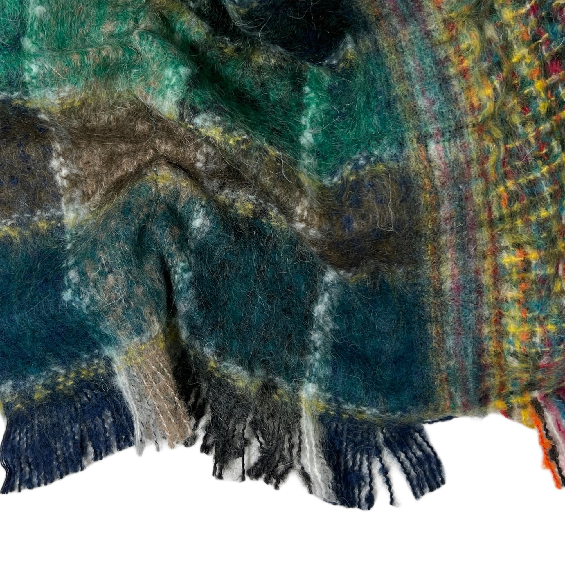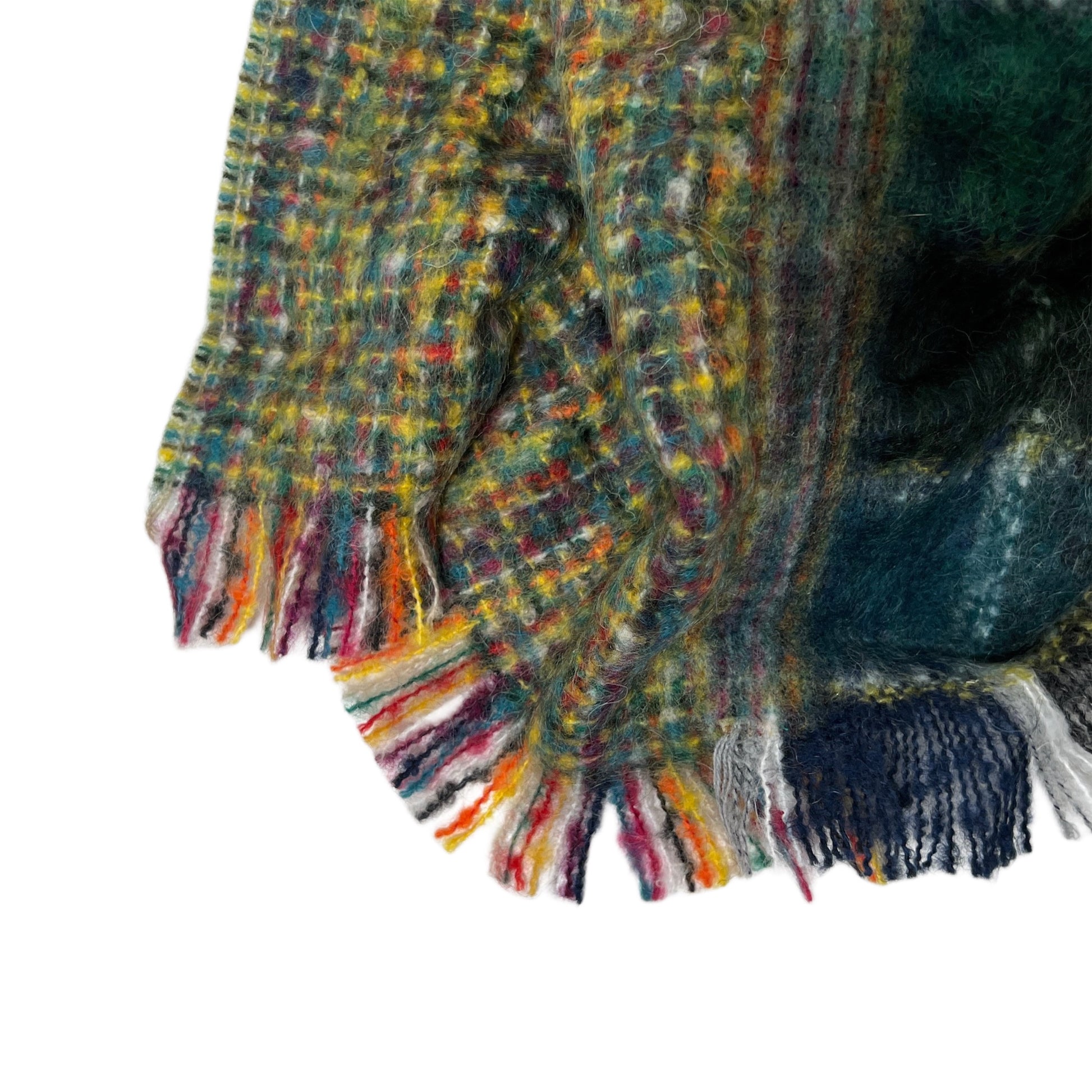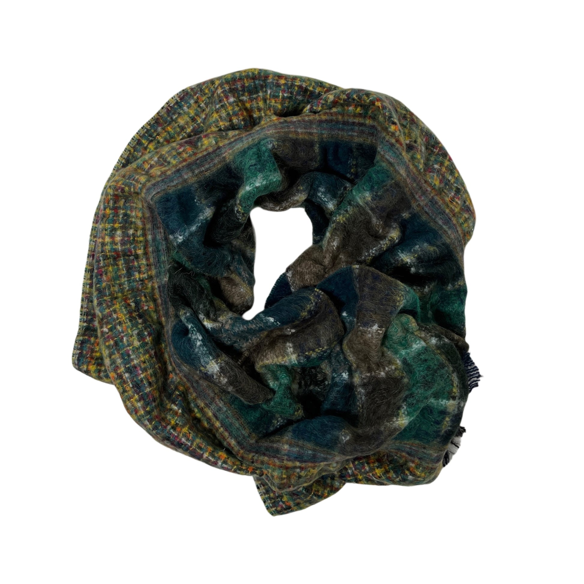 フランスの織物をパッチワークして作られた、ストールにもなるケープ風羽織です。シャーリング加工により立体感があり、ボタンが2つついていて自由にスタイリングできます。モヘヤを使用した三者混の生地は軽量ながら空気を含んで暖かいです。【Sayoko.M】ファブリックに拘り、相反する要素を一つの作品に込める事を意識しています。独特の光沢きしみ感はこの繊維の特徴です。使用を繰り返す事により毛羽立ちが生じたり風合いが徐々に変化します。着用の際は引っかかりに注意下さい。雨は水に濡れた場合は早めにふき取り、通期の良い所で形を整えて陰干しして下さい。こちらの商品は実店舗でも取り扱っております。オンラインショップ上でご注文いただいても、現品が実店舗にて「売約済」となっておりご希望に添えない場合もございます。その際はメールにてご連絡いたしますので、予めご了承ください。