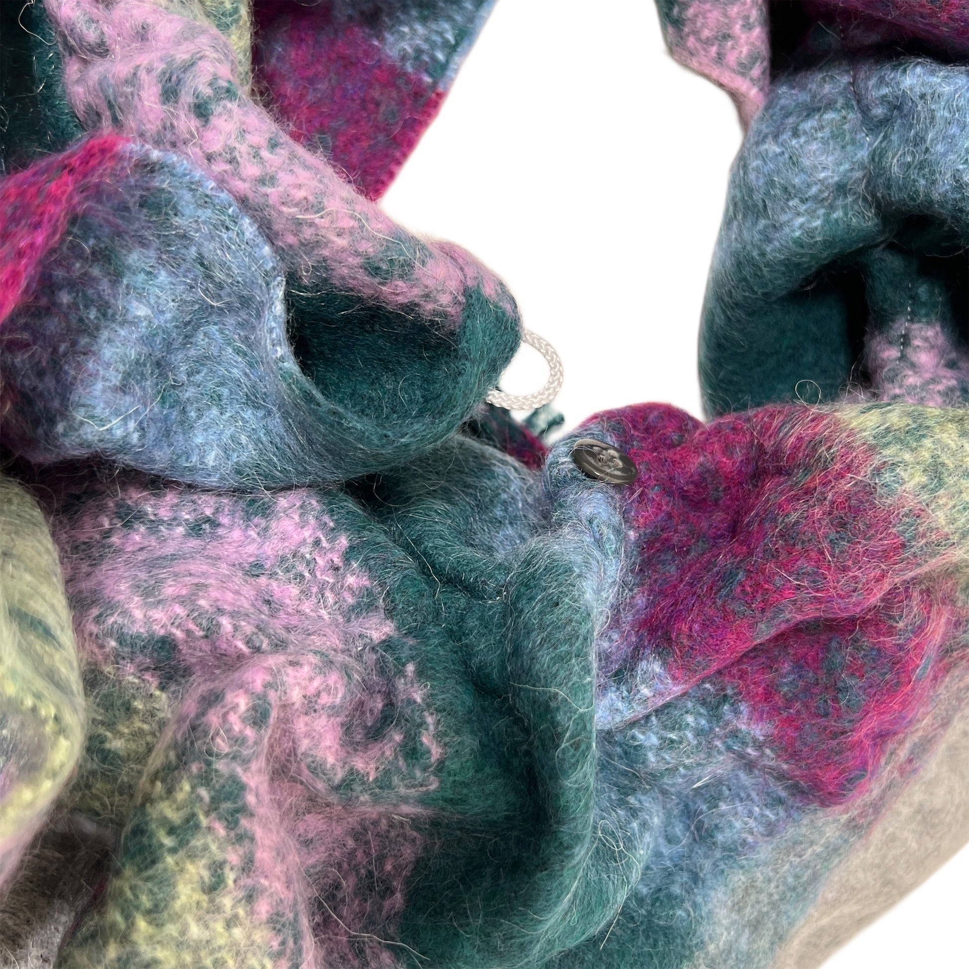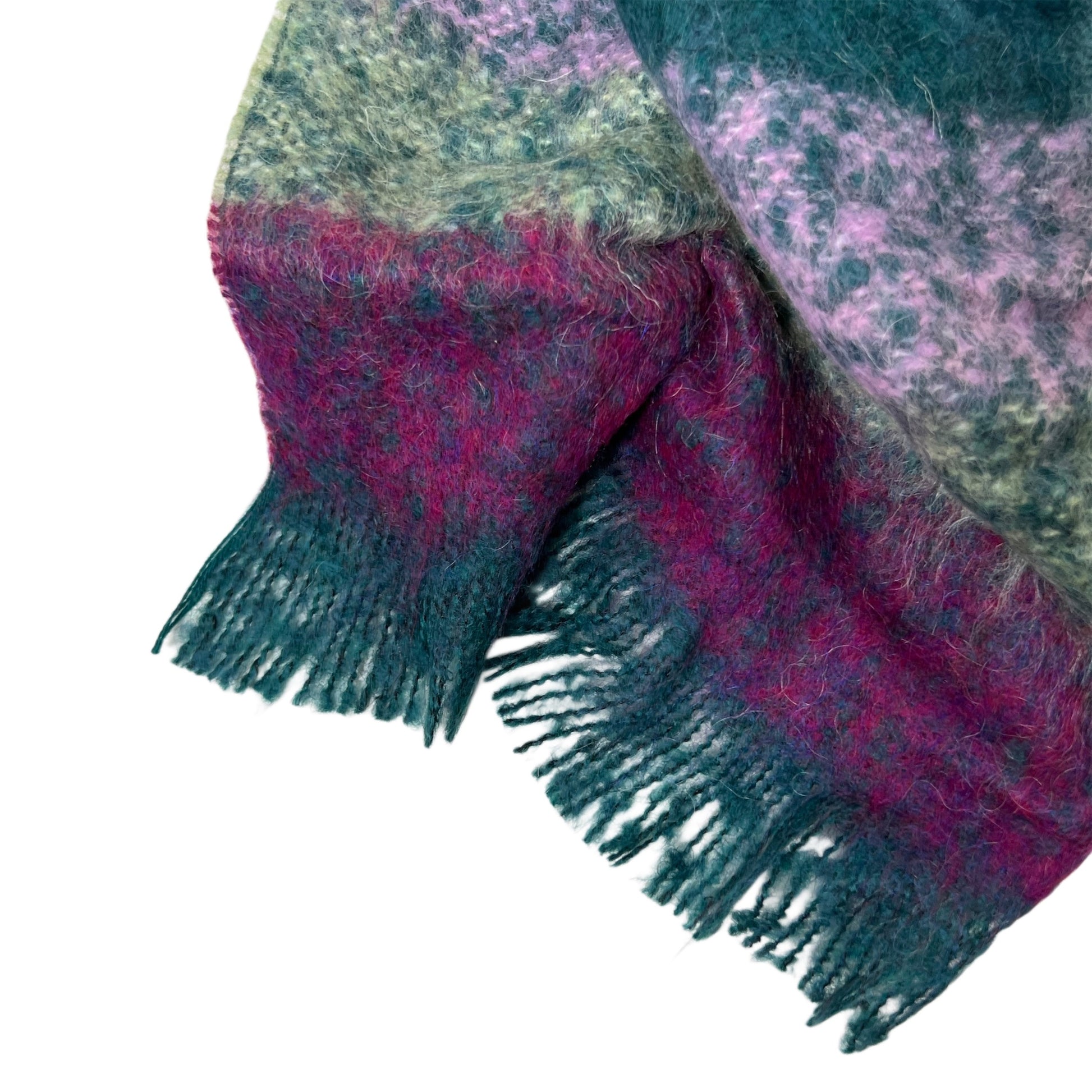 フランスの織物をパッチワークして作られた、ストールにもなるケープ風羽織です。シャーリング加工により立体感があり、ボタンが2つついていて自由にスタイリングできます。モヘヤを使用した三者混の生地は軽量ながら空気を含んで暖かいです。【Sayoko.M】ファブリックに拘り、相反する要素を一つの作品に込める事を意識しています。独特の光沢きしみ感はこの繊維の特徴です。使用を繰り返す事により毛羽立ちが生じたり風合いが徐々に変化します。着用の際は引っかかりに注意下さい。雨は水に濡れた場合は早めにふき取り、通期の良い所で形を整えて陰干しして下さい。こちらの商品は実店舗でも取り扱っております。オンラインショップ上でご注文いただいても、現品が実店舗にて「売約済」となっておりご希望に添えない場合もございます。その際はメールにてご連絡いたしますので、予めご了承ください。