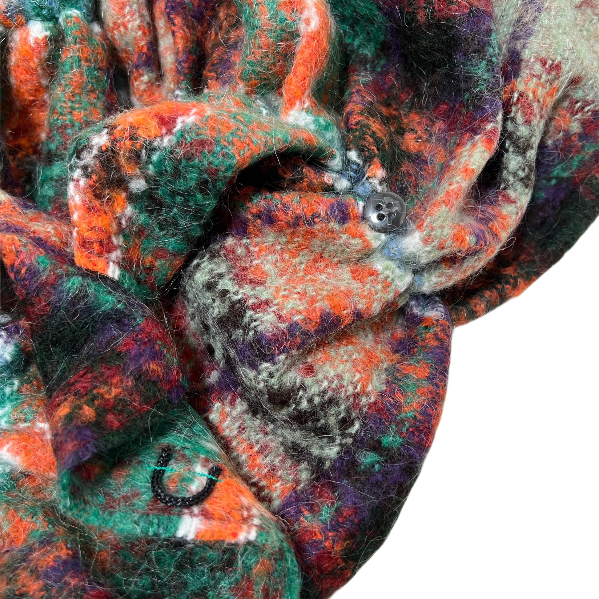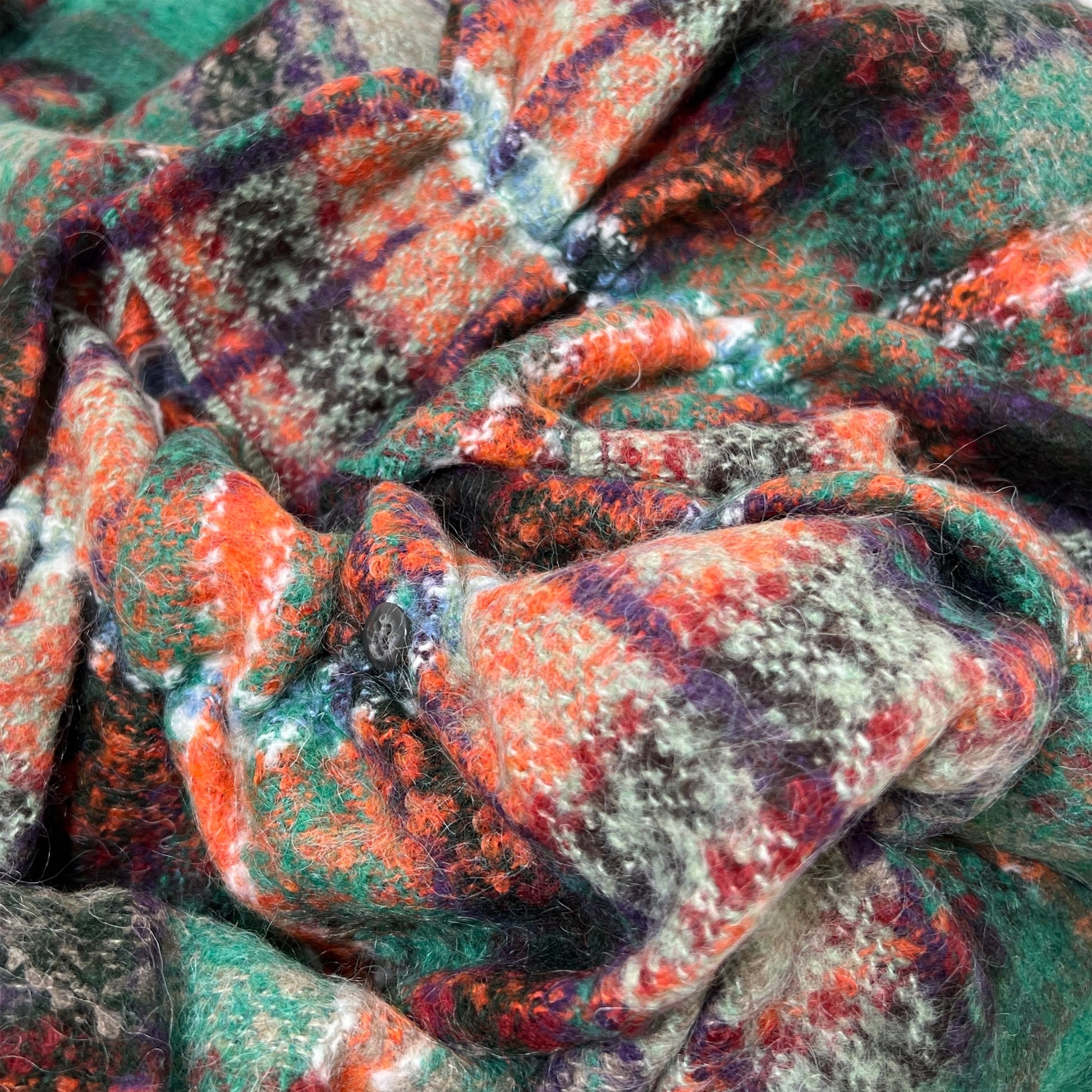 フランスの織物をパッチワークして作られた、ストールにもなるケープ風羽織です。シャーリング加工により立体感があり、ボタンが2つついていて自由にスタイリングできます。モヘヤを使用した三者混の生地は軽量ながら空気を含んで暖かいです。【Sayoko.M】ファブリックに拘り、相反する要素を一つの作品に込める事を意識しています。独特の光沢きしみ感はこの繊維の特徴です。使用を繰り返す事により毛羽立ちが生じたり風合いが徐々に変化します。着用の際は引っかかりに注意下さい。雨は水に濡れた場合は早めにふき取り、通期の良い所で形を整えて陰干しして下さい。こちらの商品は実店舗でも取り扱っております。オンラインショップ上でご注文いただいても、現品が実店舗にて「売約済」となっておりご希望に添えない場合もございます。その際はメールにてご連絡いたしますので、予めご了承ください。