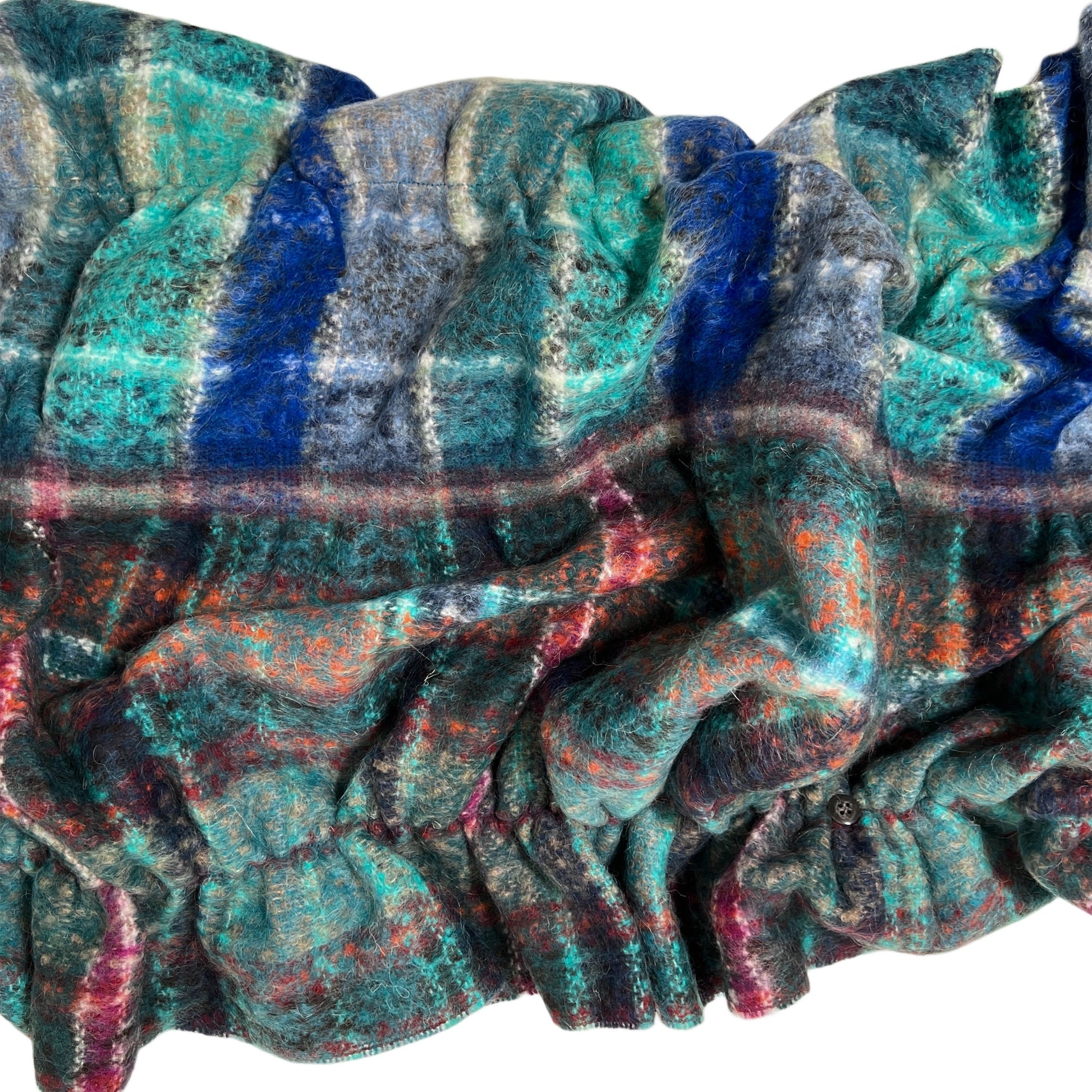 フランスの織物をパッチワークして作られた、ストールにもなるケープ風羽織です。シャーリング加工により立体感があり、ボタンが2つついていて自由にスタイリングできます。モヘヤを使用した三者混の生地は軽量ながら空気を含んで暖かいです。【Sayoko.M】ファブリックに拘り、相反する要素を一つの作品に込める事を意識しています。独特の光沢きしみ感はこの繊維の特徴です。使用を繰り返す事により毛羽立ちが生じたり風合いが徐々に変化します。着用の際は引っかかりに注意下さい。雨は水に濡れた場合は早めにふき取り、通期の良い所で形を整えて陰干しして下さい。こちらの商品は実店舗でも取り扱っております。オンラインショップ上でご注文いただいても、現品が実店舗にて「売約済」となっておりご希望に添えない場合もございます。その際はメールにてご連絡いたしますので、予めご了承ください。