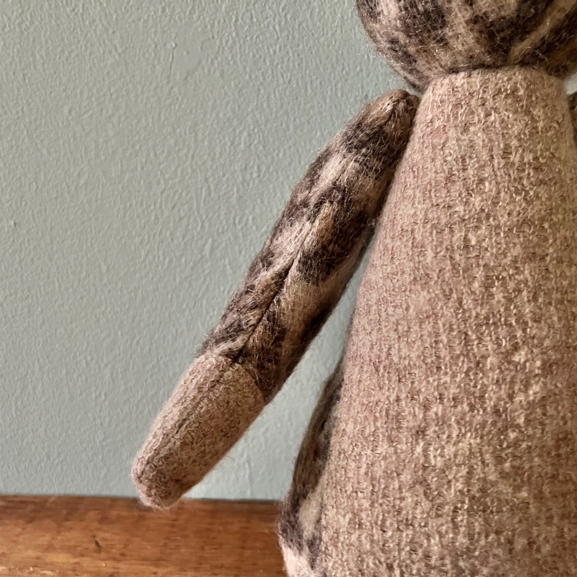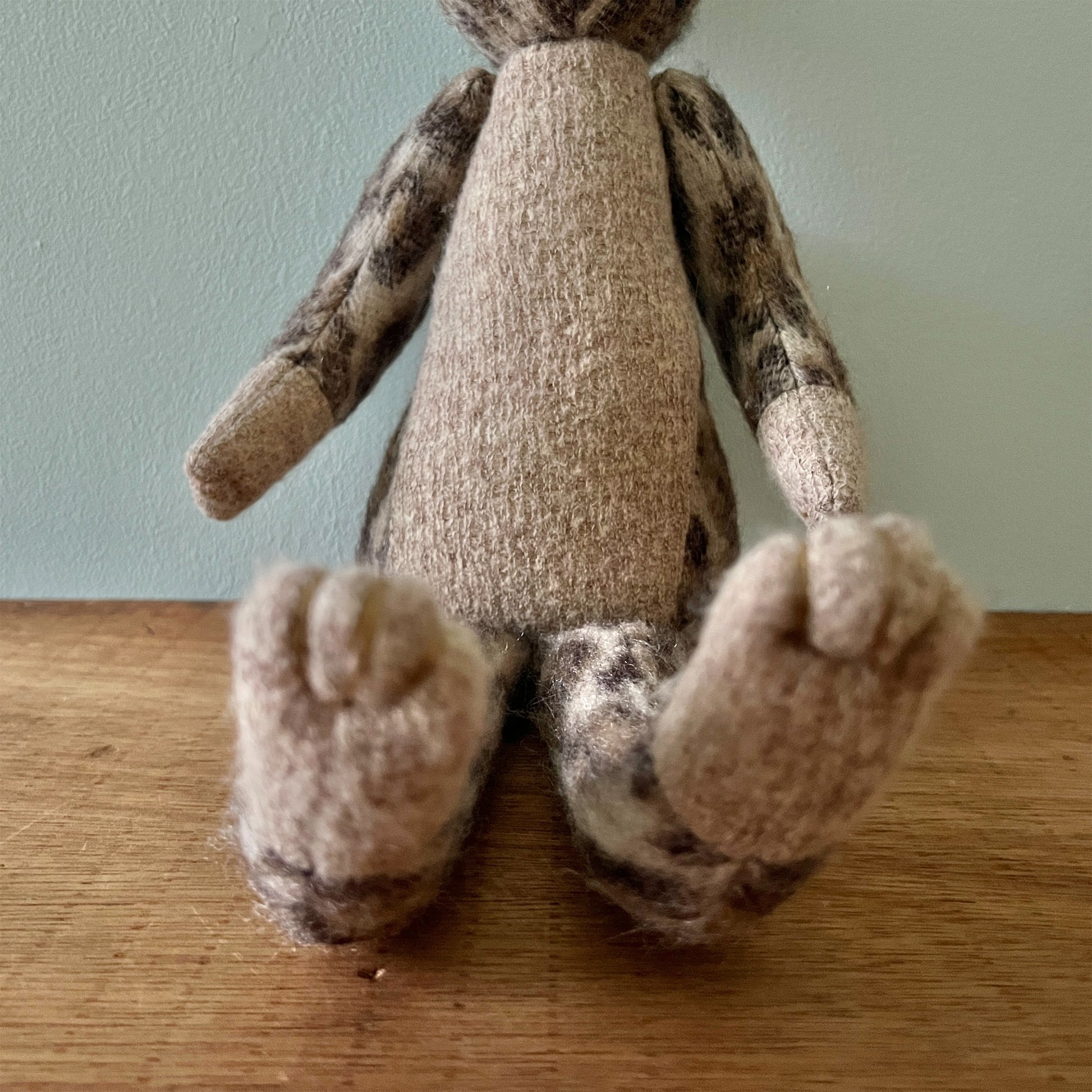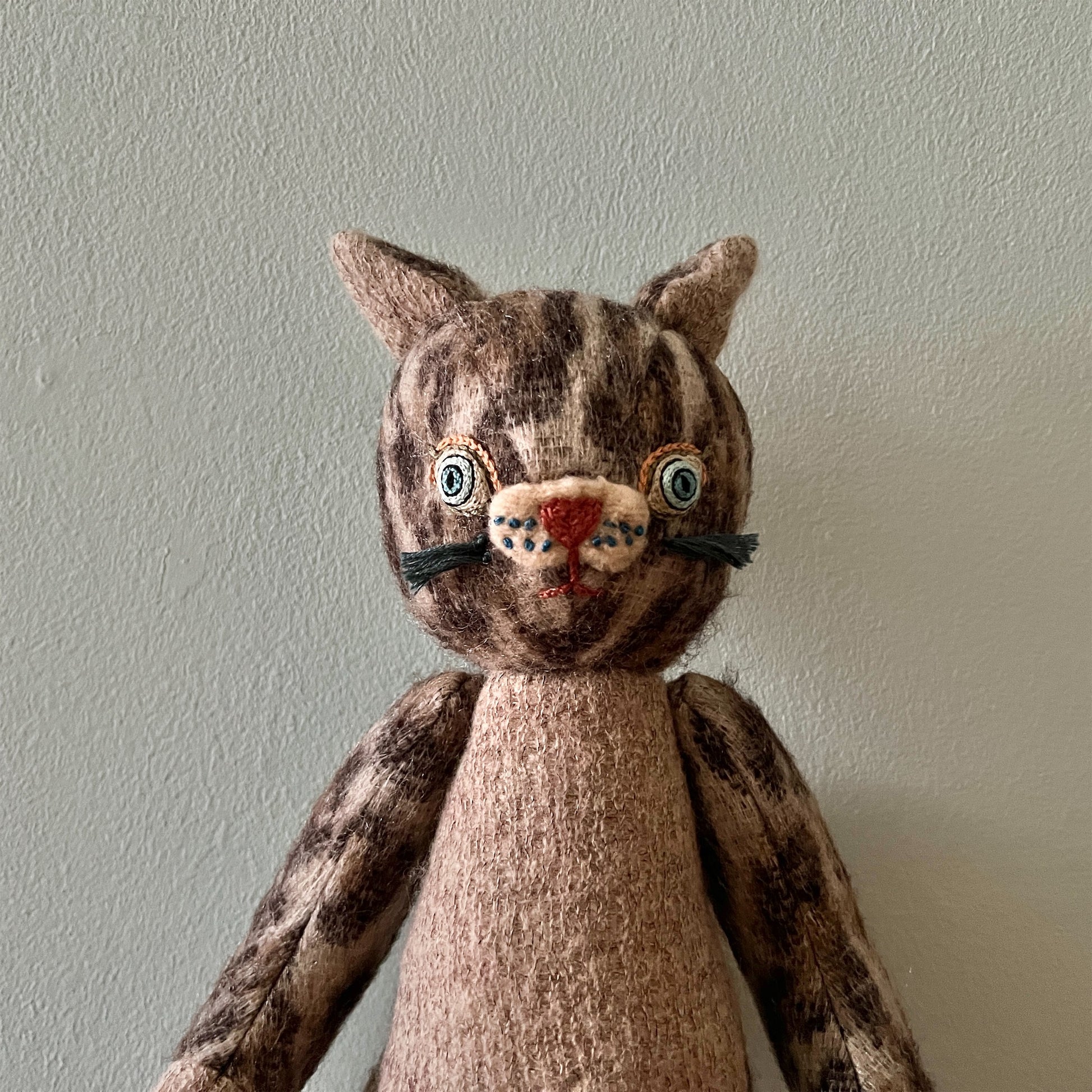全て一点ものです。ヴィンテージの布地なども用いています。布地の組み合わせを考え、ぬいぐるみのボディを製作後、一つ一つ刺繍糸の配色にこだわって製作しております。