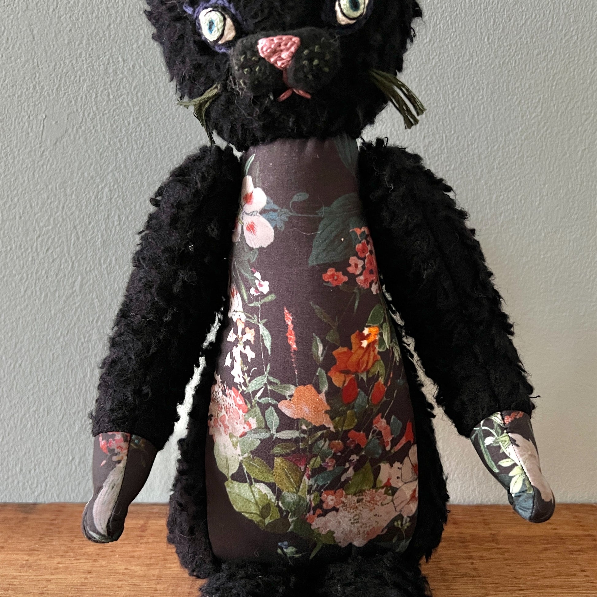 全て一点ものです。ヴィンテージの布地なども用いています。布地の組み合わせを考え、ぬいぐるみのボディを製作後、一つ一つ刺繍糸の配色にこだわって製作しております。