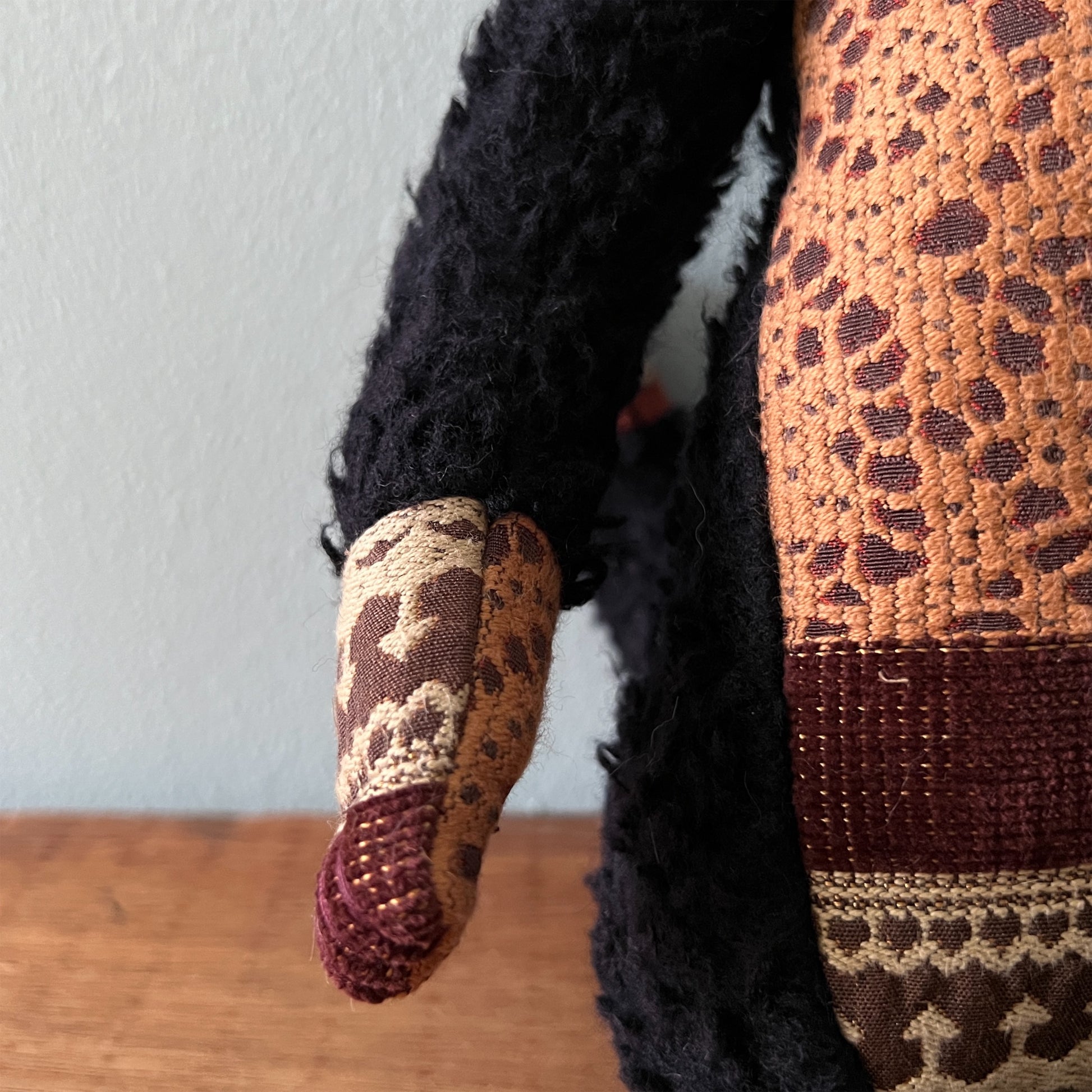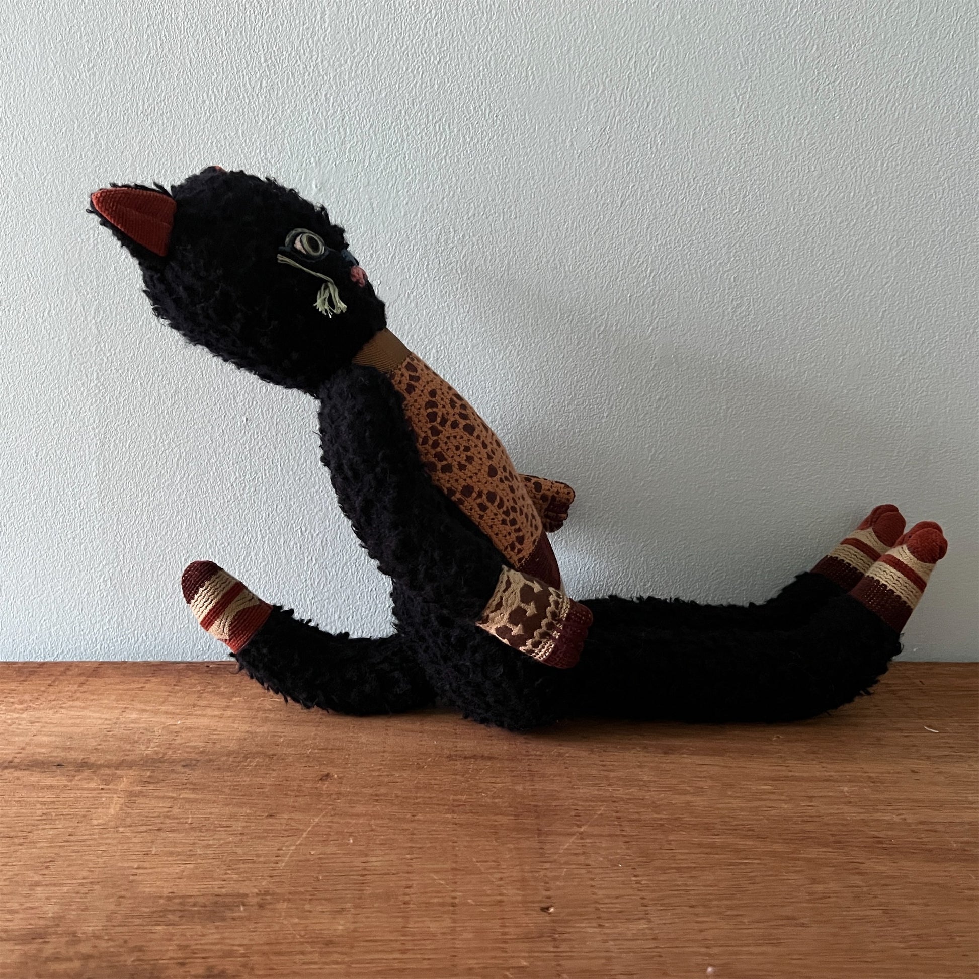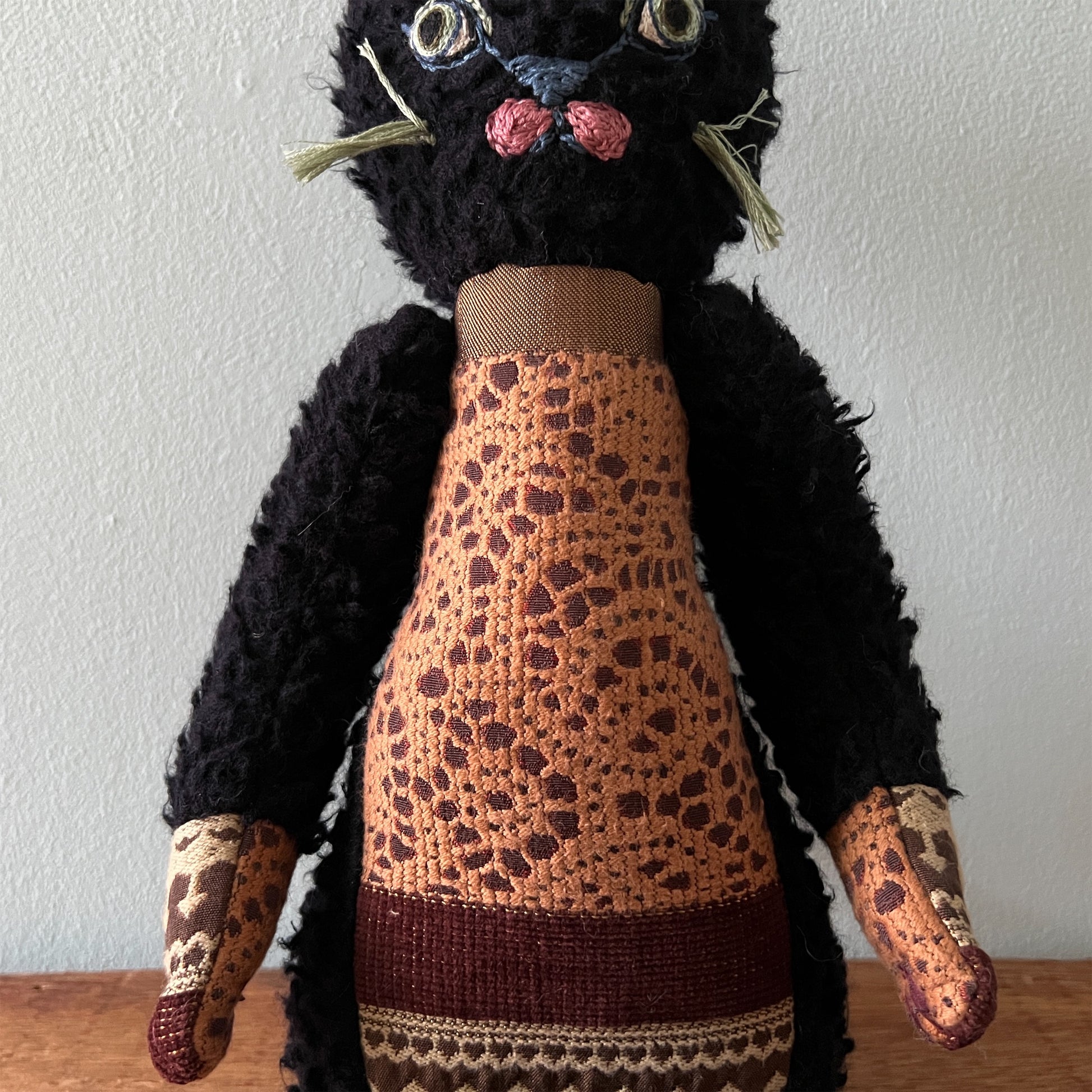 全て一点ものです。ヴィンテージの布地なども用いています。布地の組み合わせを考え、ぬいぐるみのボディを製作後、一つ一つ刺繍糸の配色にこだわって製作しております。