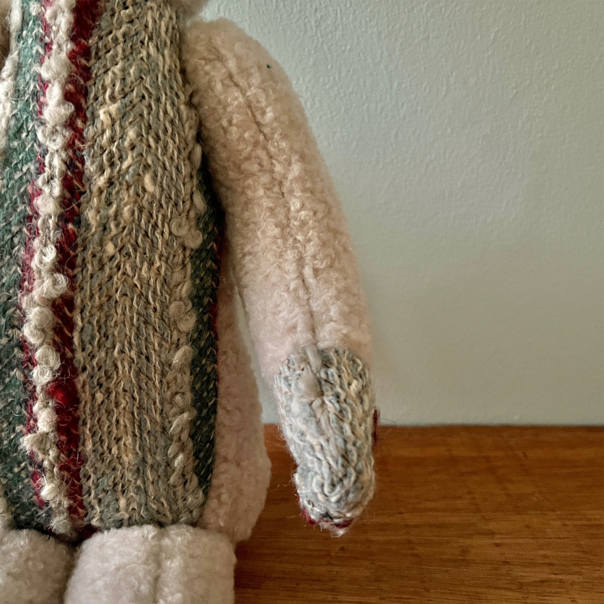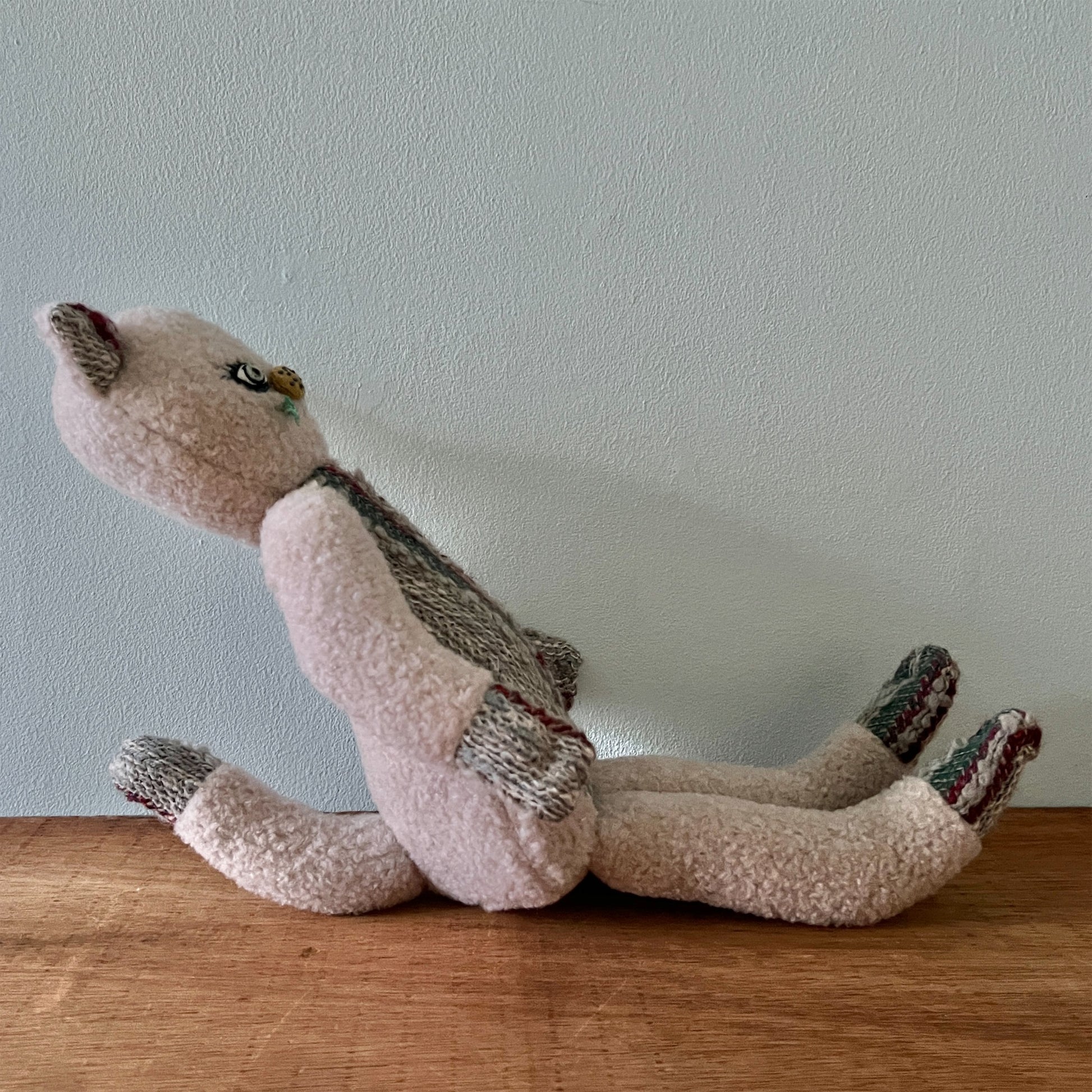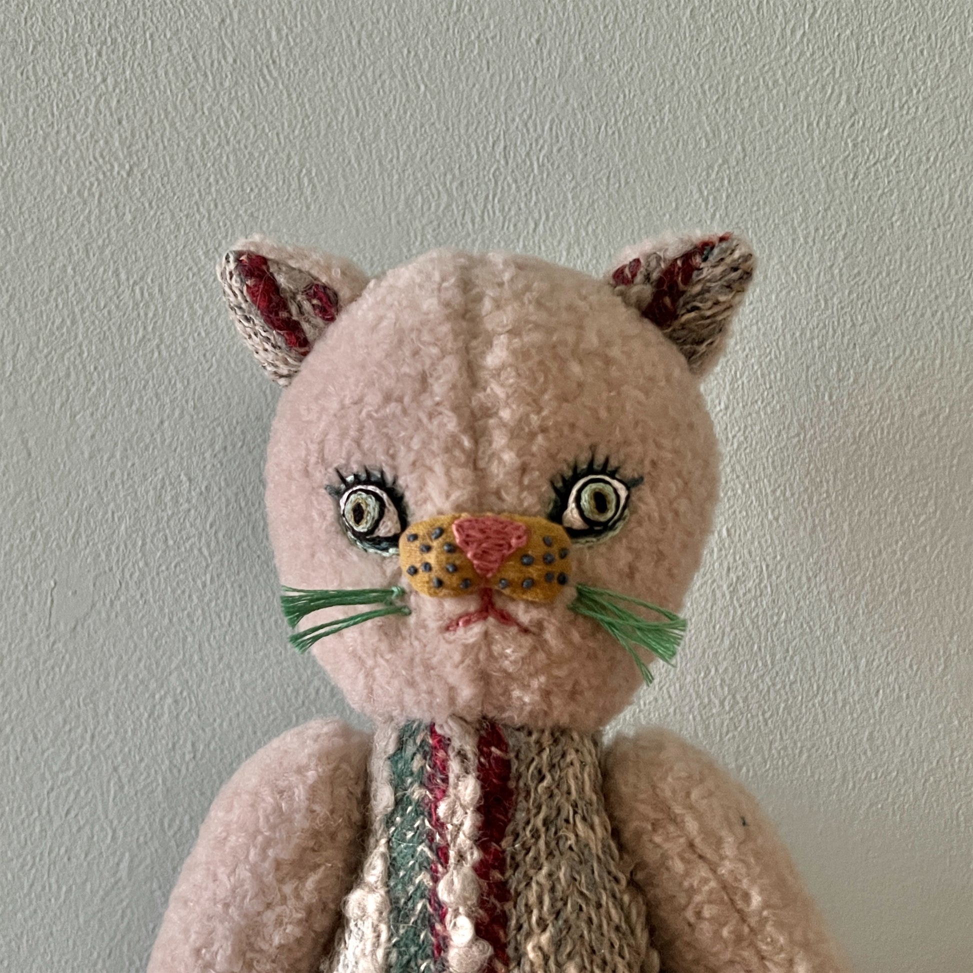 全て一点ものです。ヴィンテージの布地なども用いています。布地の組み合わせを考え、ぬいぐるみのボディを製作後、一つ一つ刺繍糸の配色にこだわって製作しております。