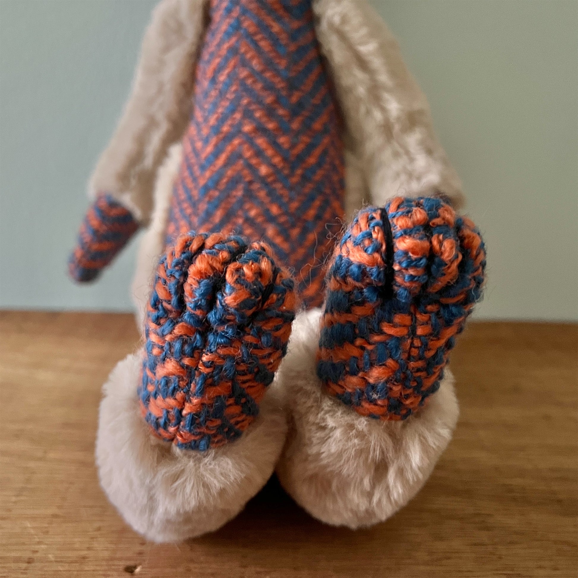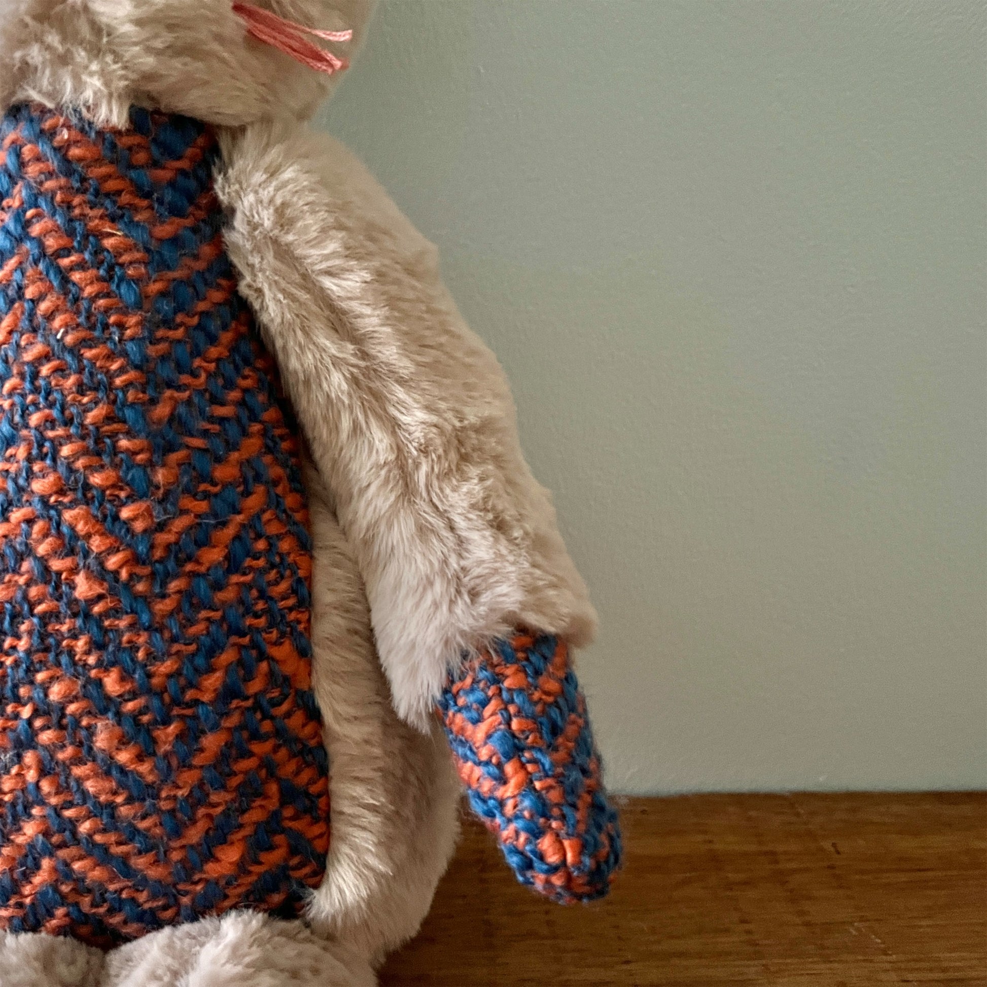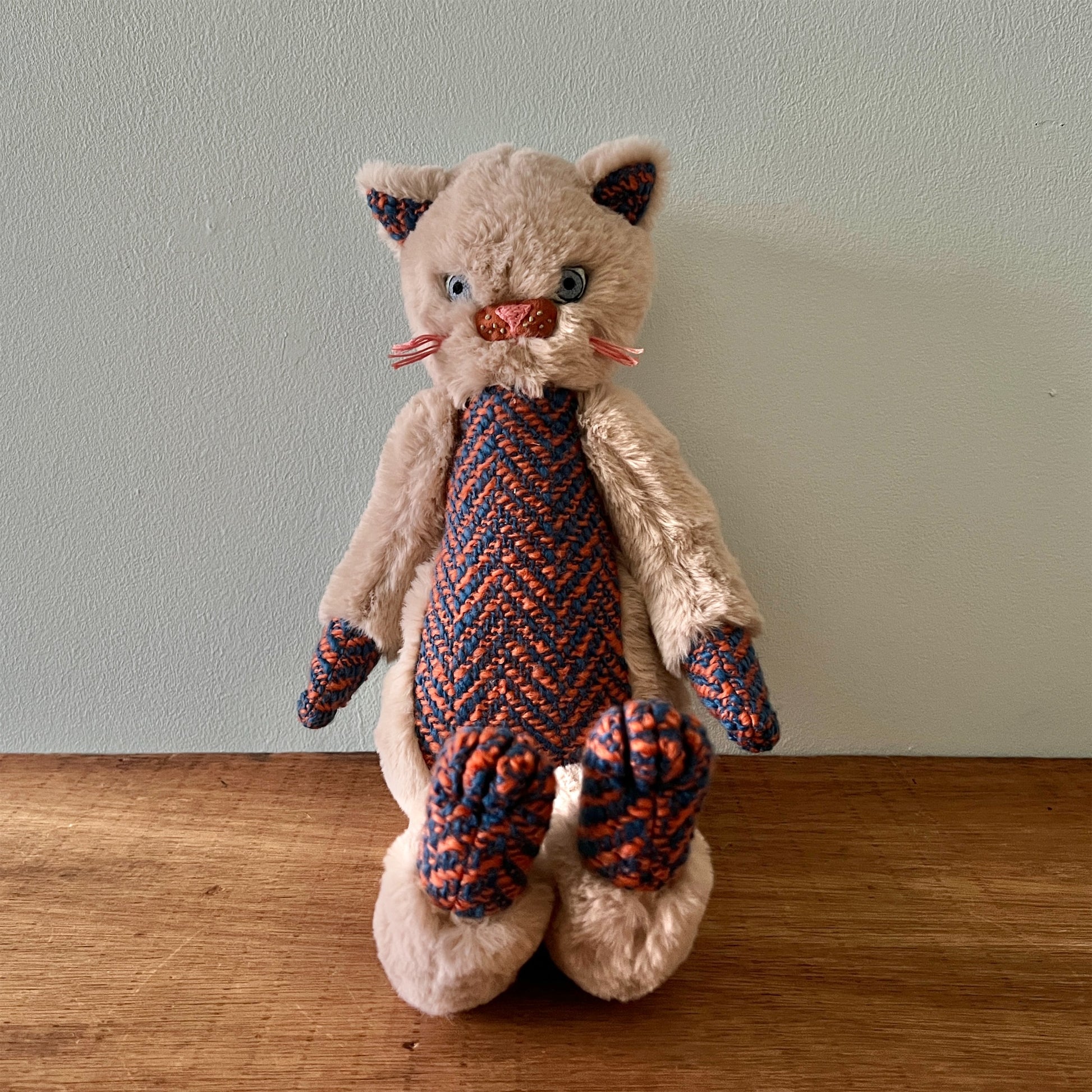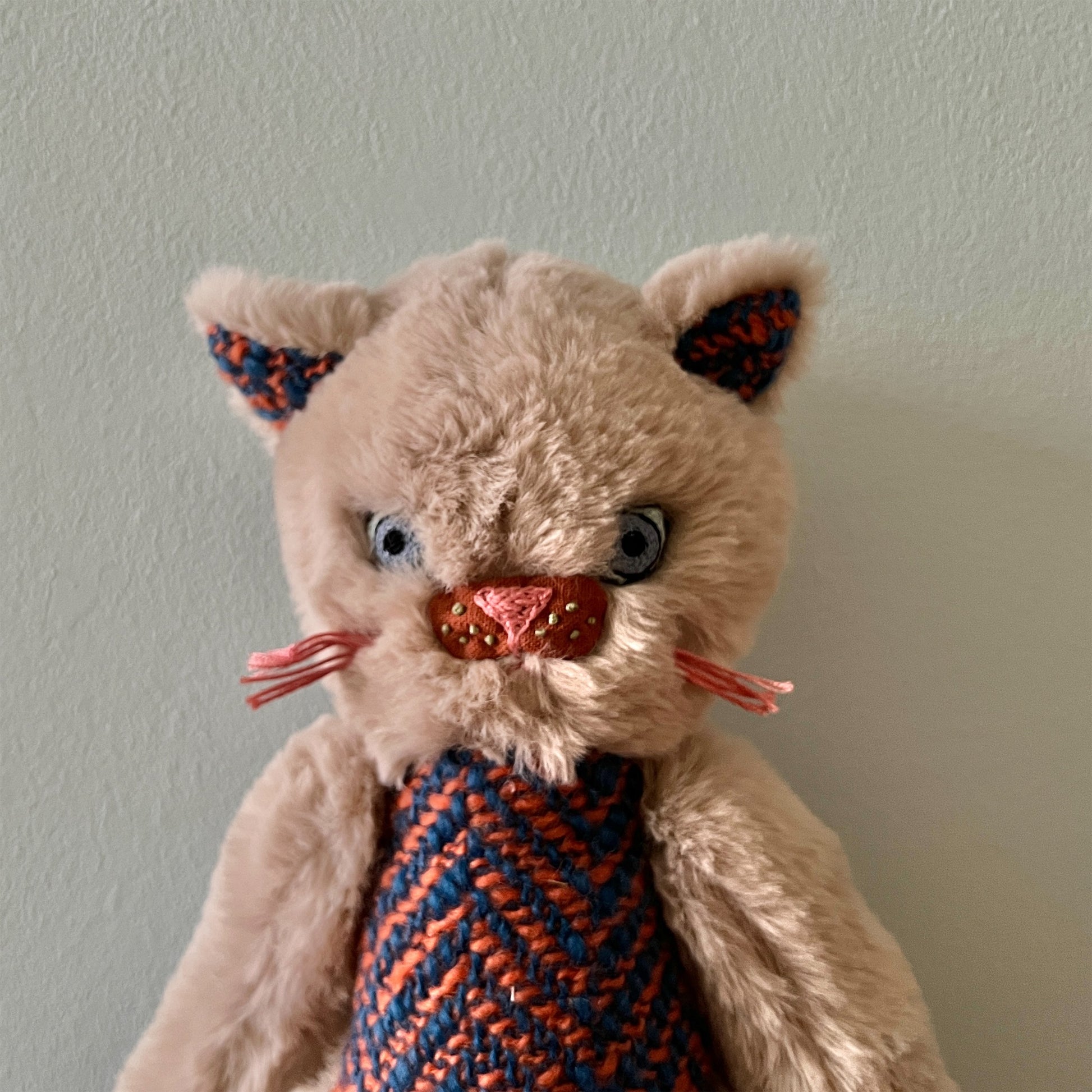 全て一点ものです。ヴィンテージの布地なども用いています。布地の組み合わせを考え、ぬいぐるみのボディを製作後、一つ一つ刺繍糸の配色にこだわって製作しております。
