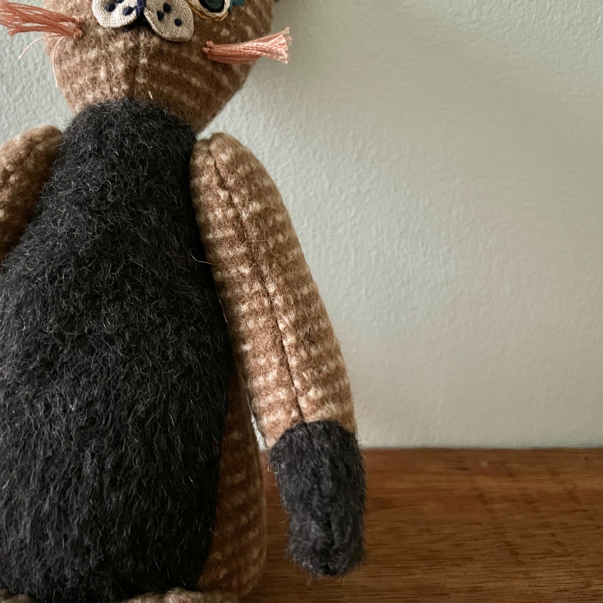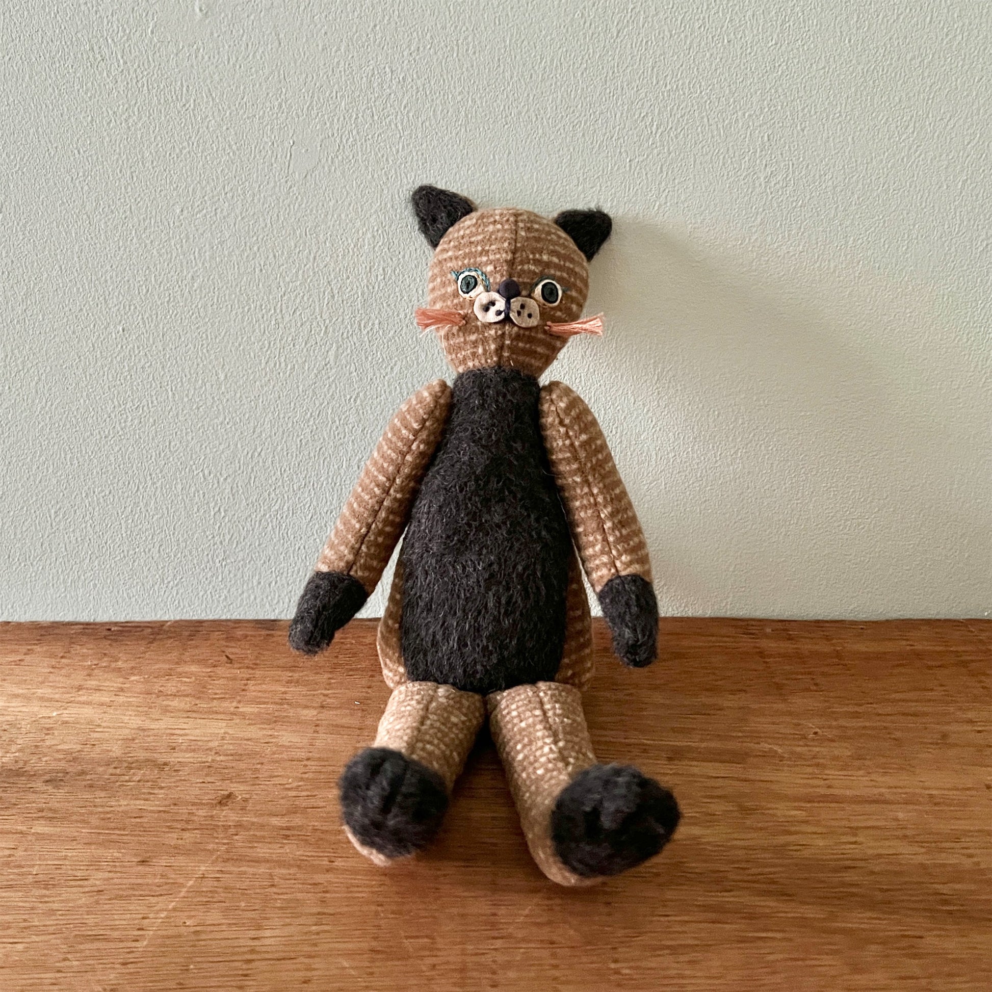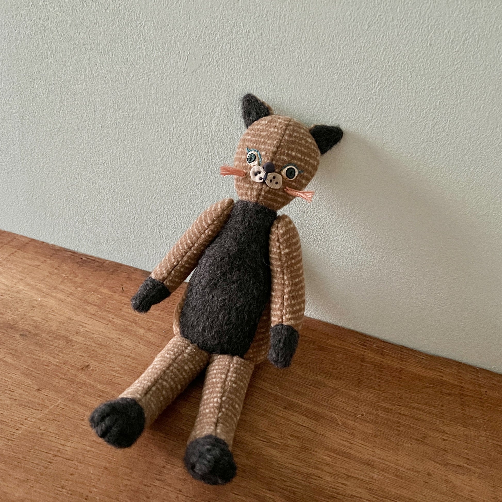 全て一点ものです。ヴィンテージの布地なども用いています。布地の組み合わせを考え、ぬいぐるみのボディを製作後、一つ一つ刺繍糸の配色にこだわって製作しております。
