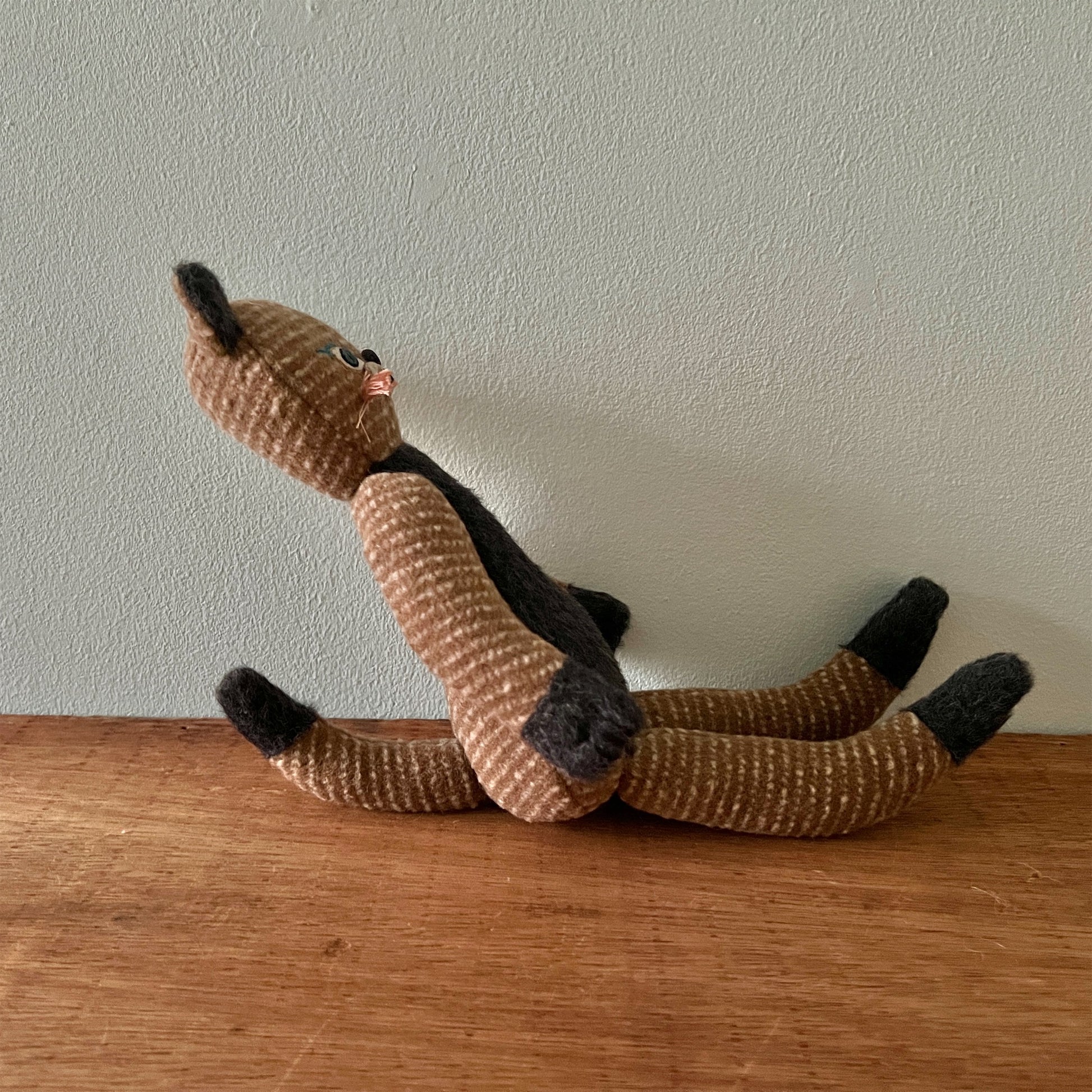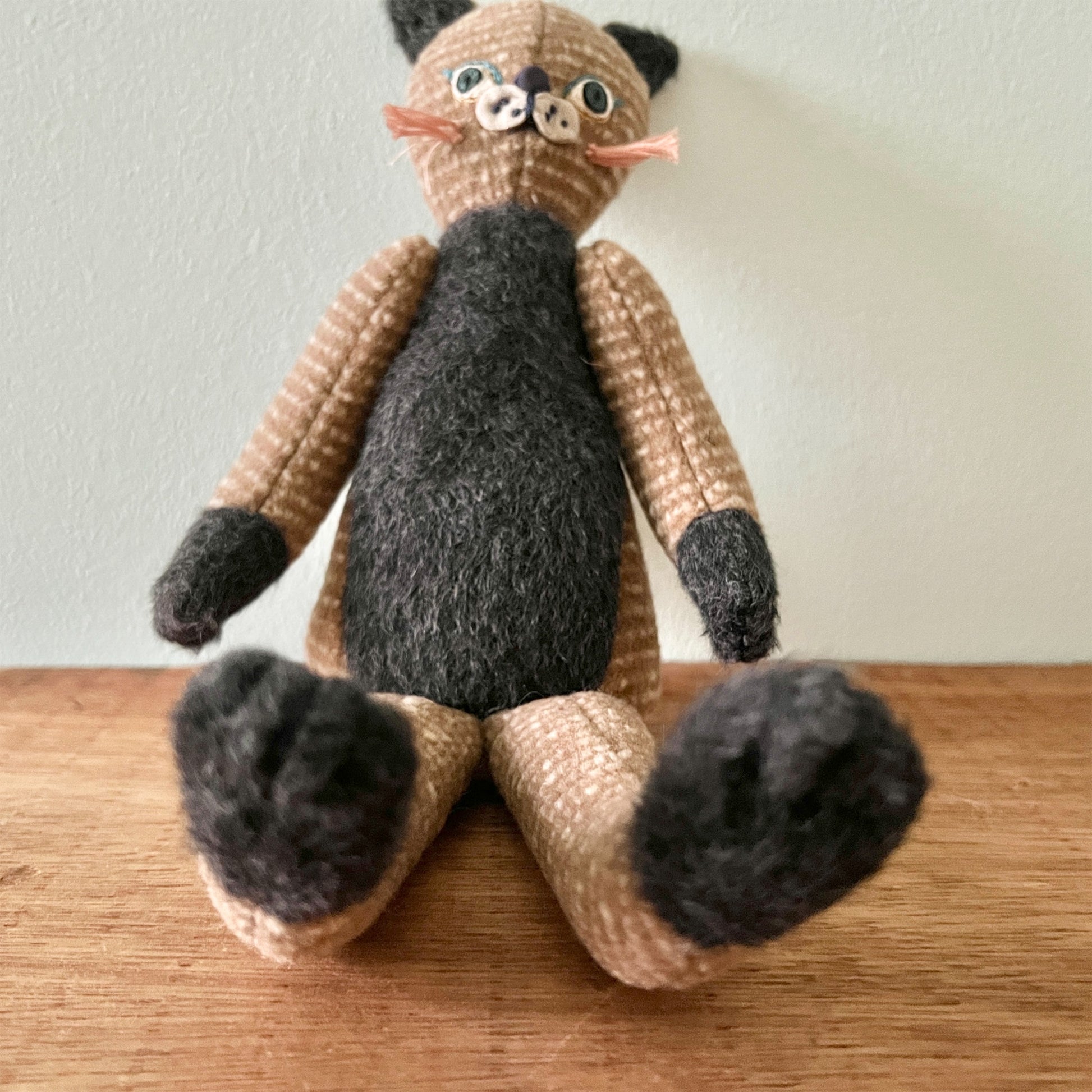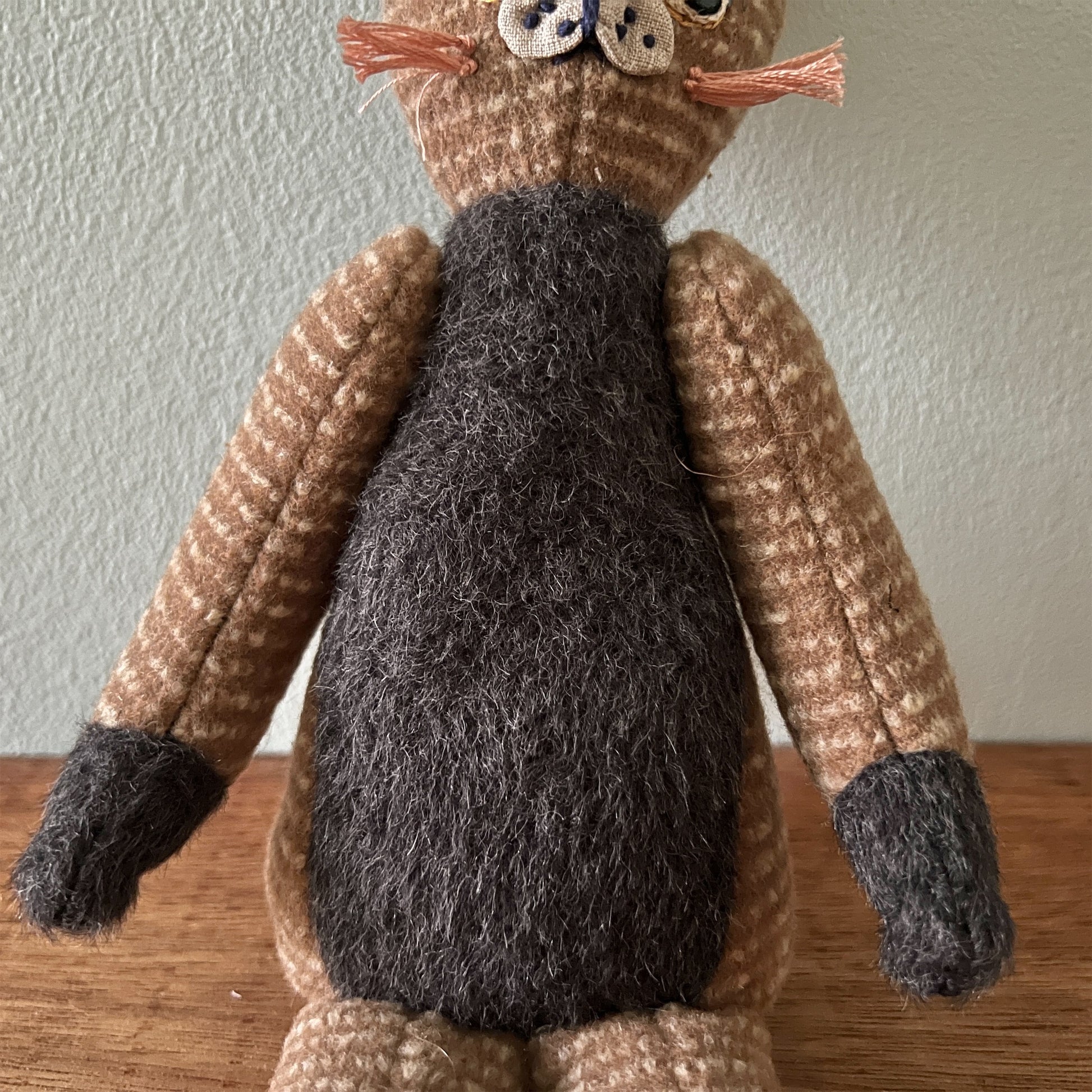 全て一点ものです。ヴィンテージの布地なども用いています。布地の組み合わせを考え、ぬいぐるみのボディを製作後、一つ一つ刺繍糸の配色にこだわって製作しております。