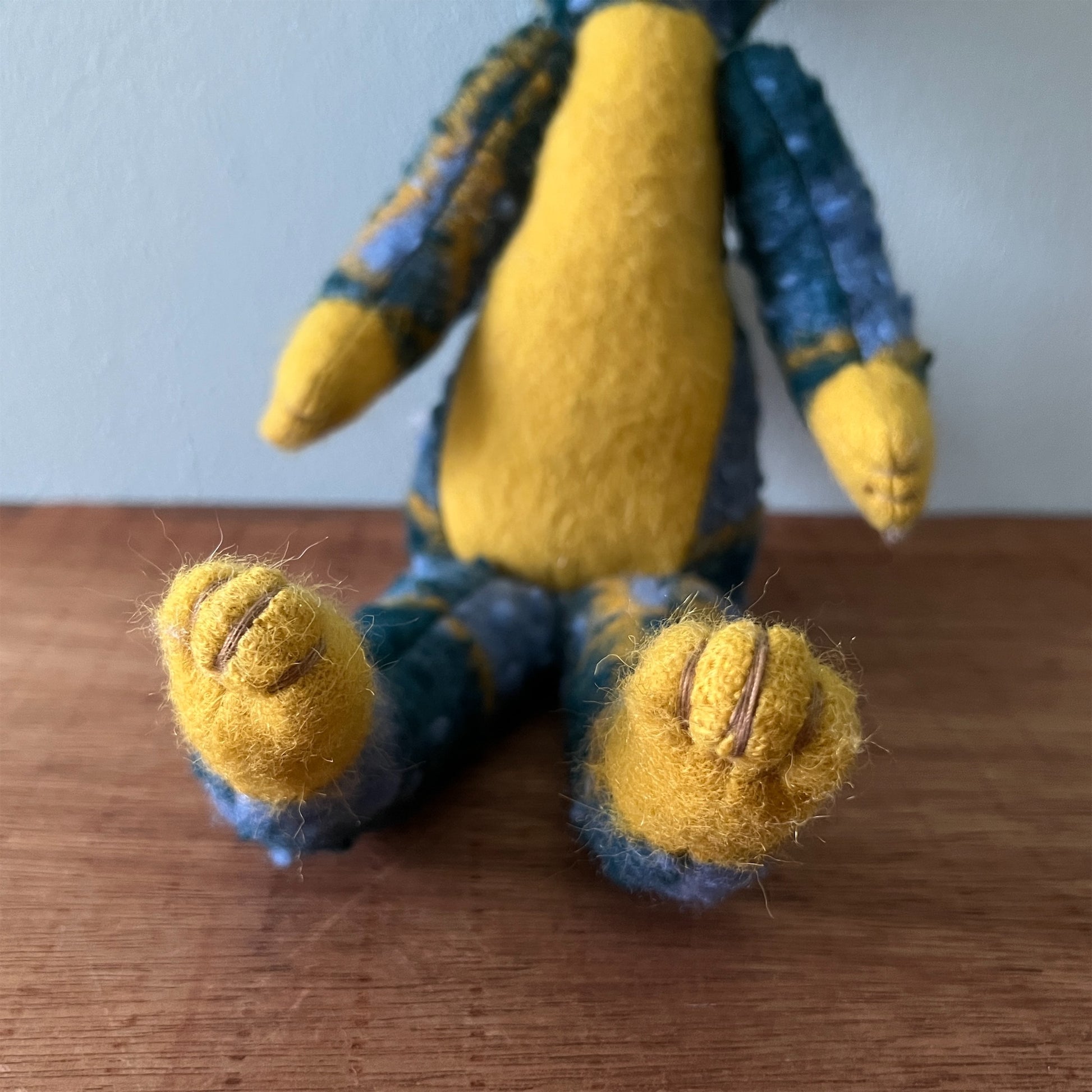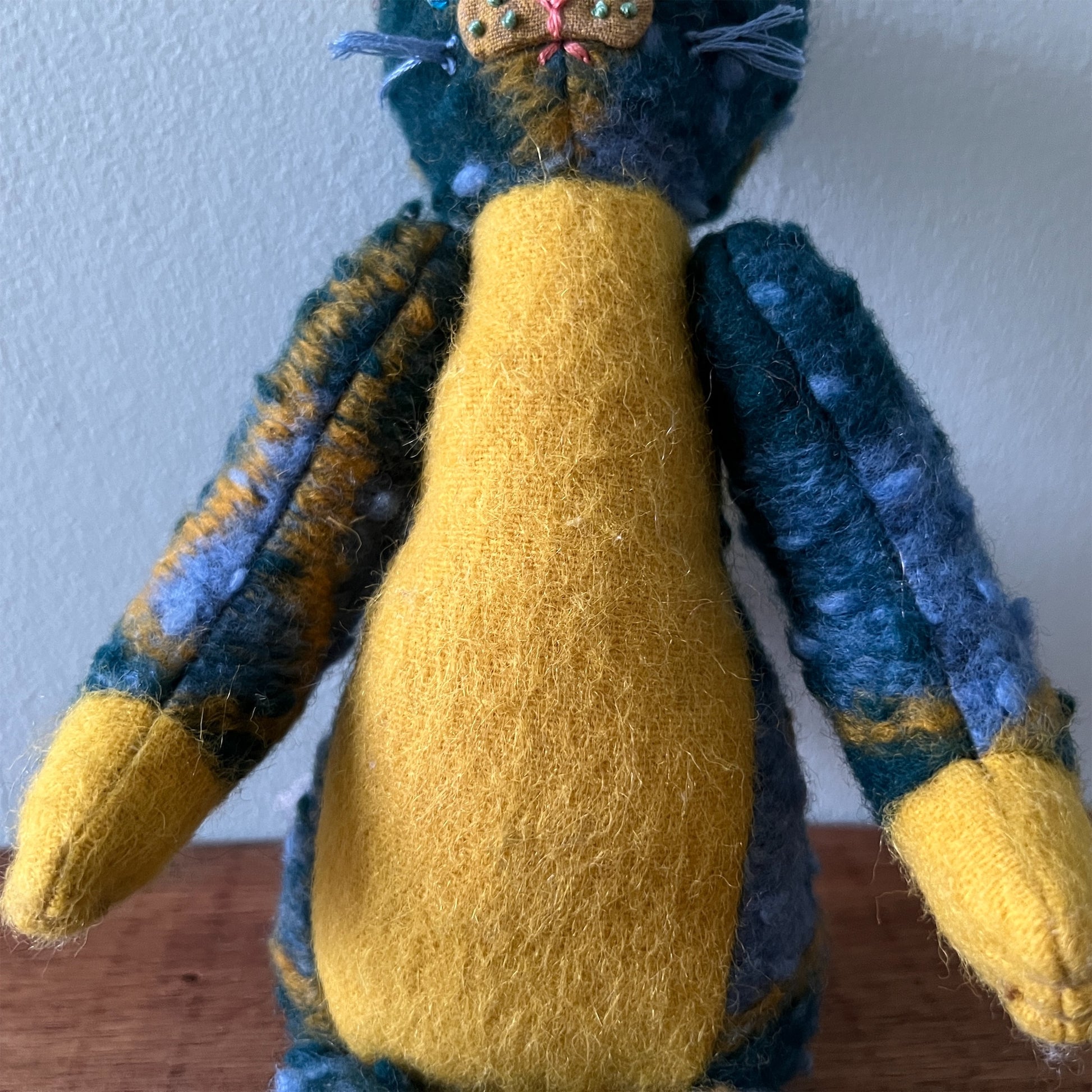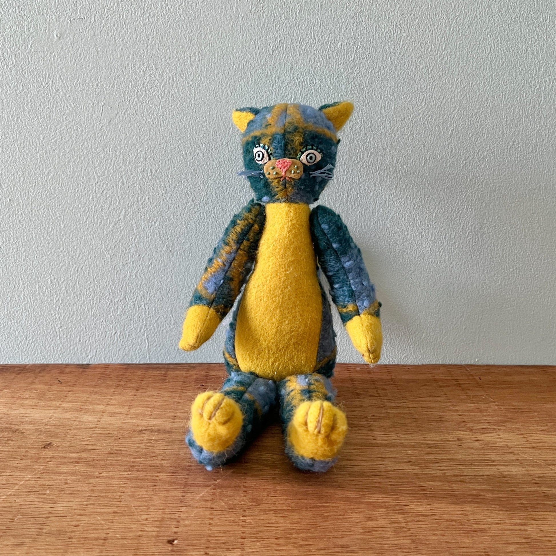 全て一点ものです。ヴィンテージの布地なども用いています。布地の組み合わせを考え、ぬいぐるみのボディを製作後、一つ一つ刺繍糸の配色にこだわって製作しております。