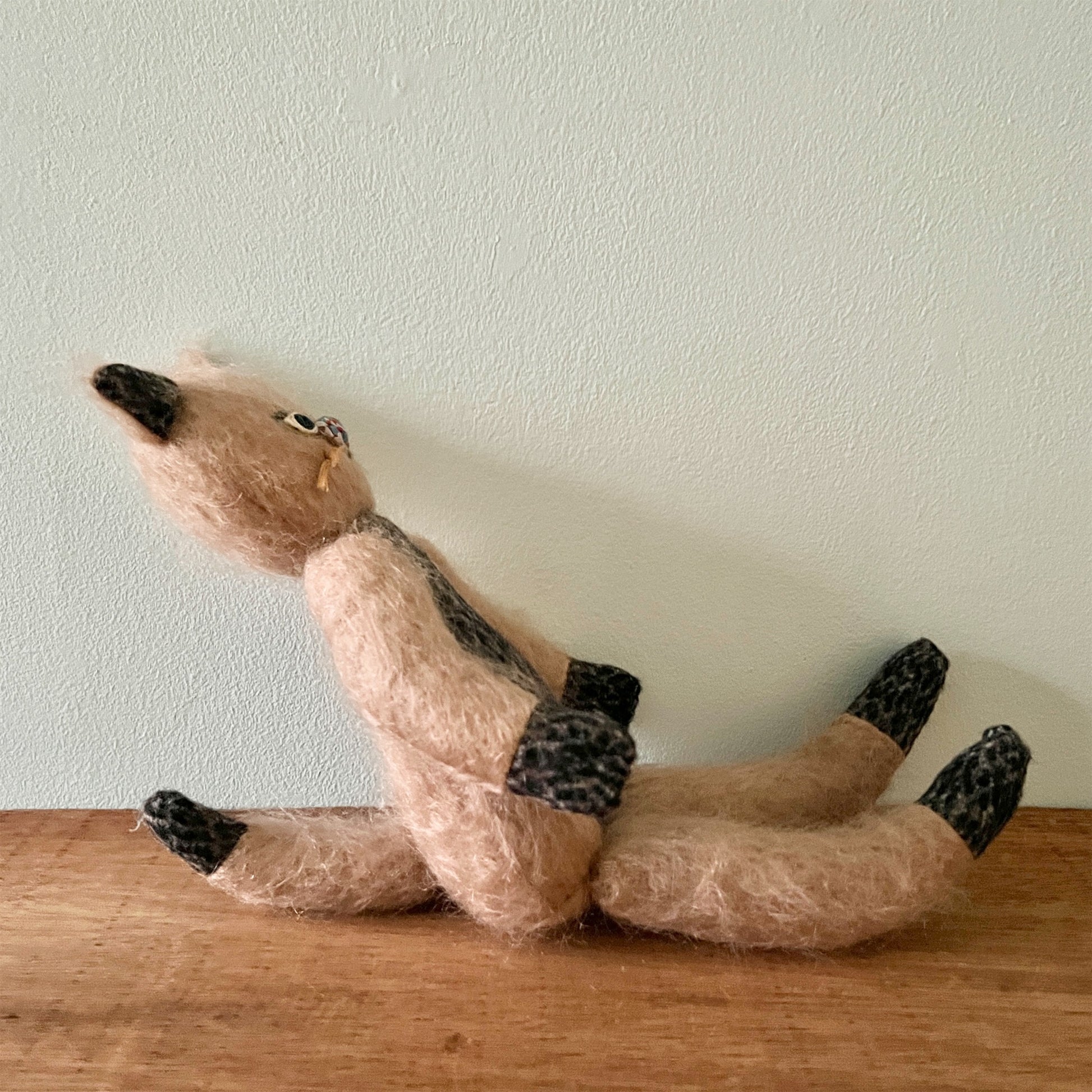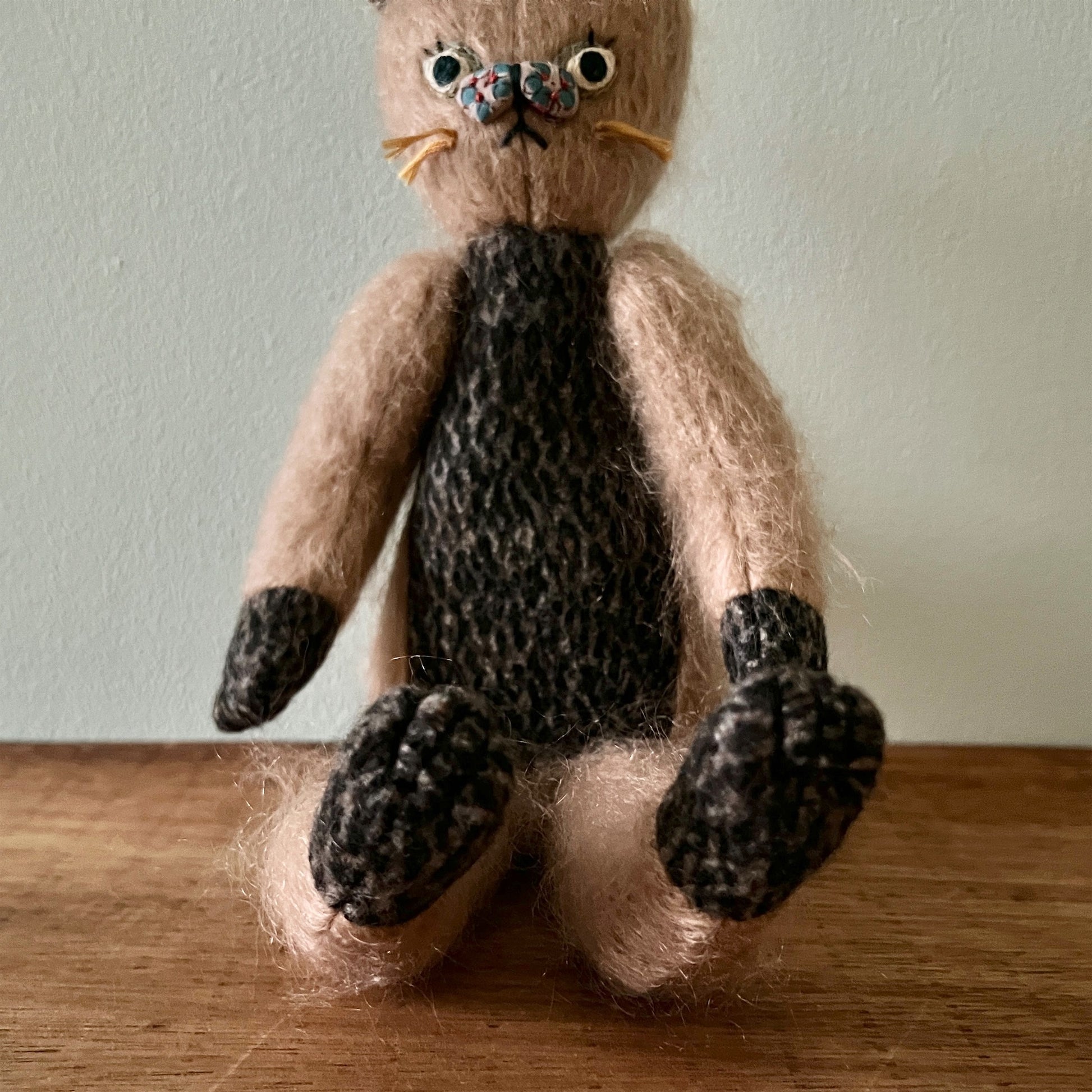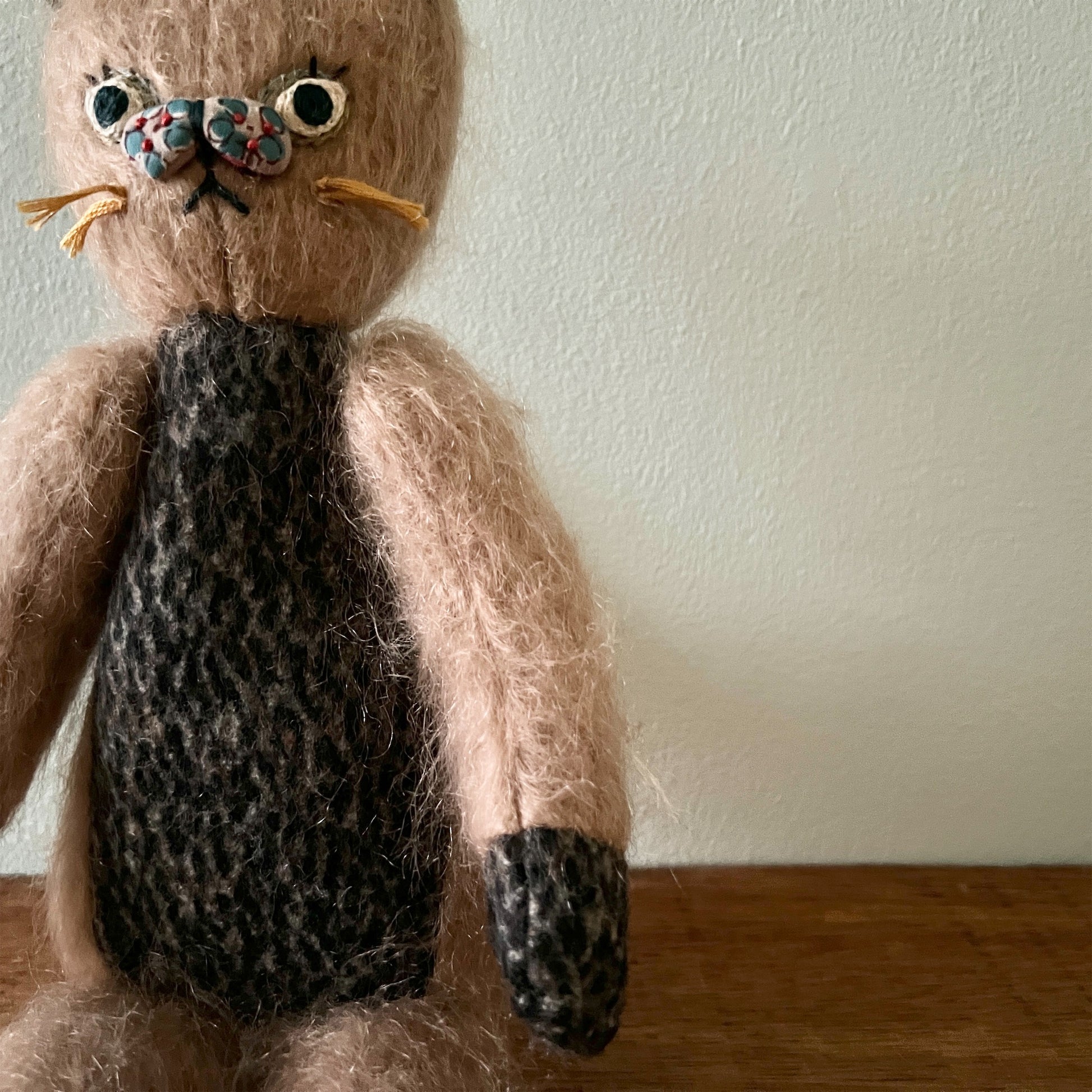 全て一点ものです。ヴィンテージの布地なども用いています。布地の組み合わせを考え、ぬいぐるみのボディを製作後、一つ一つ刺繍糸の配色にこだわって製作しております。